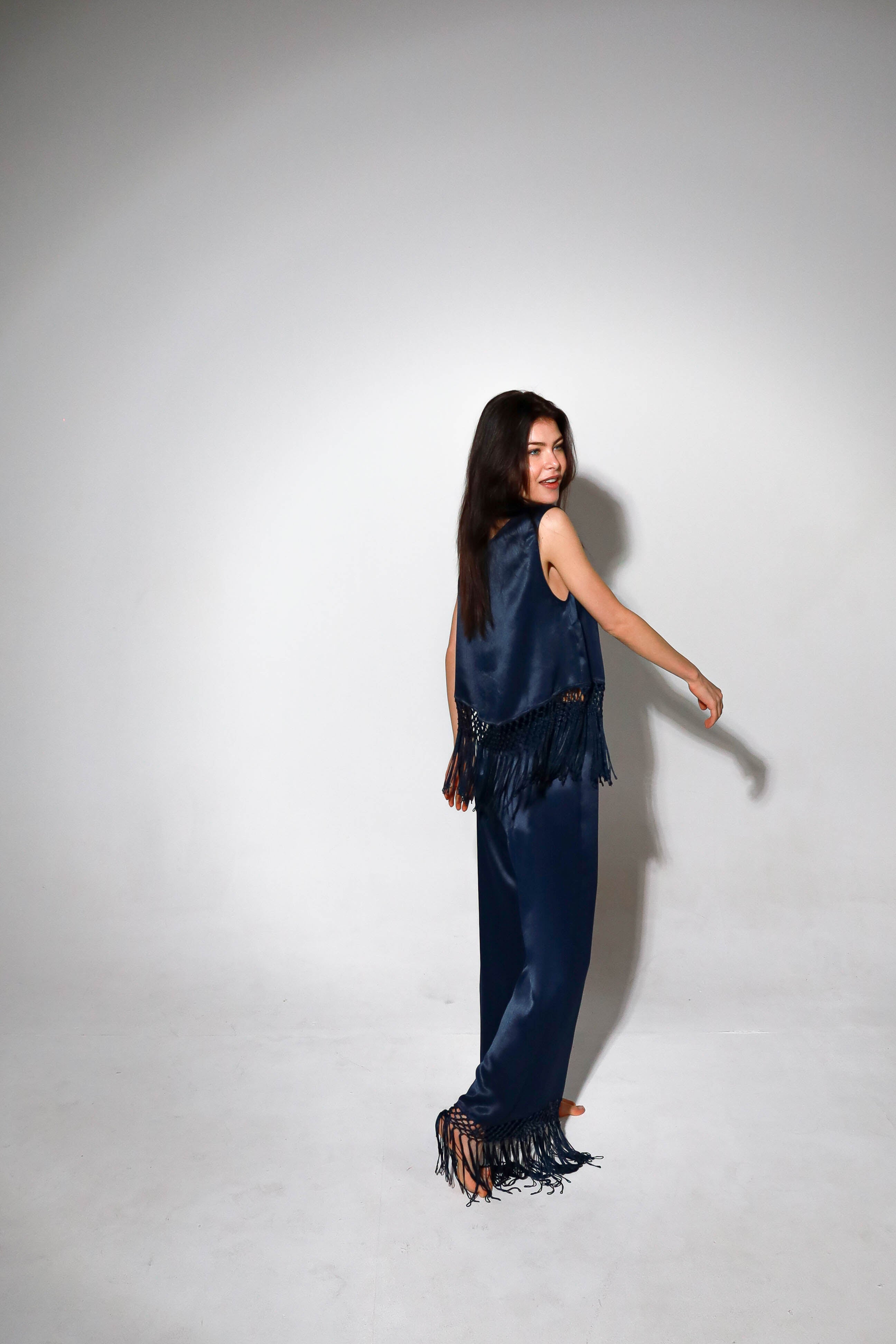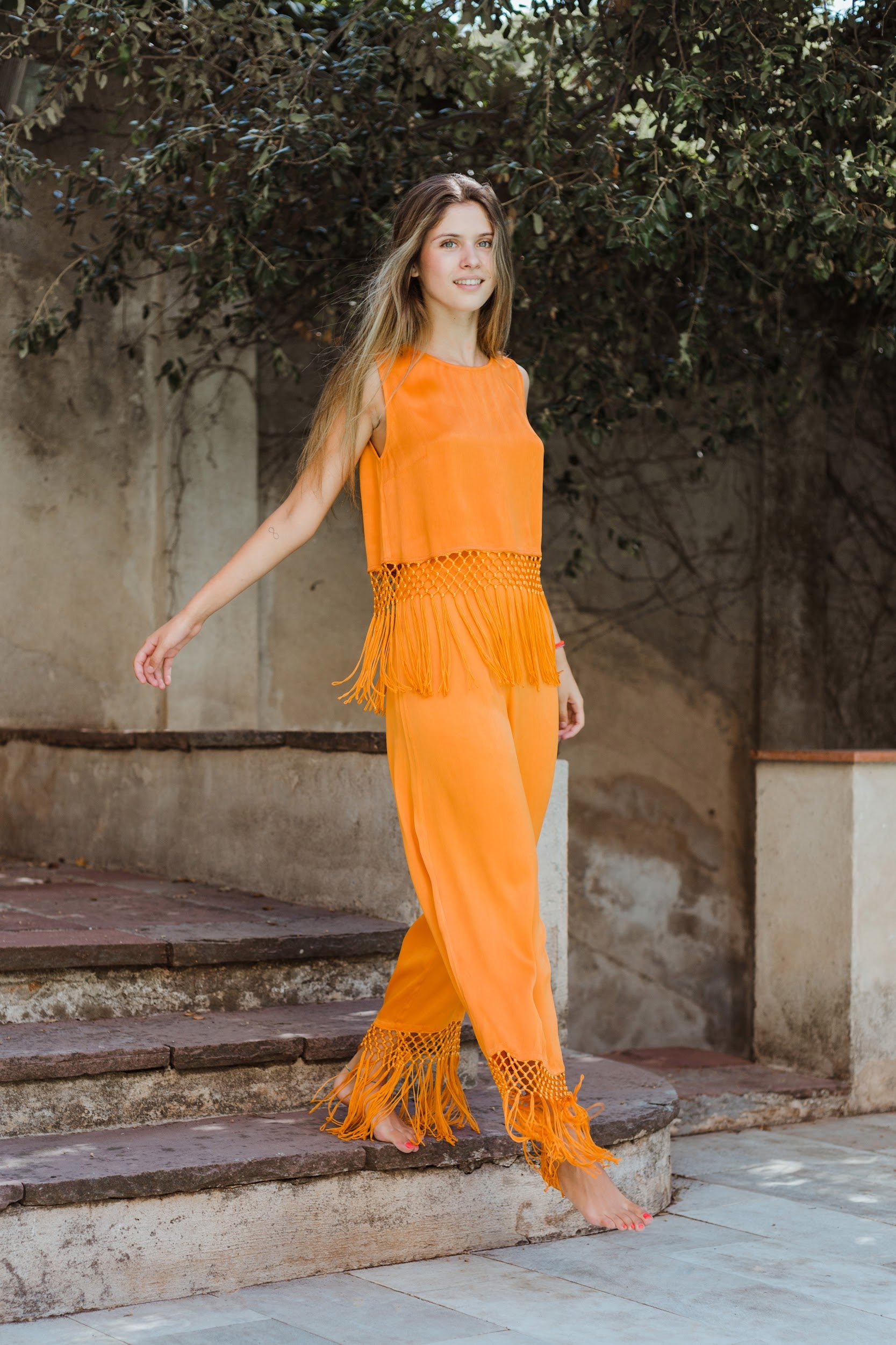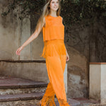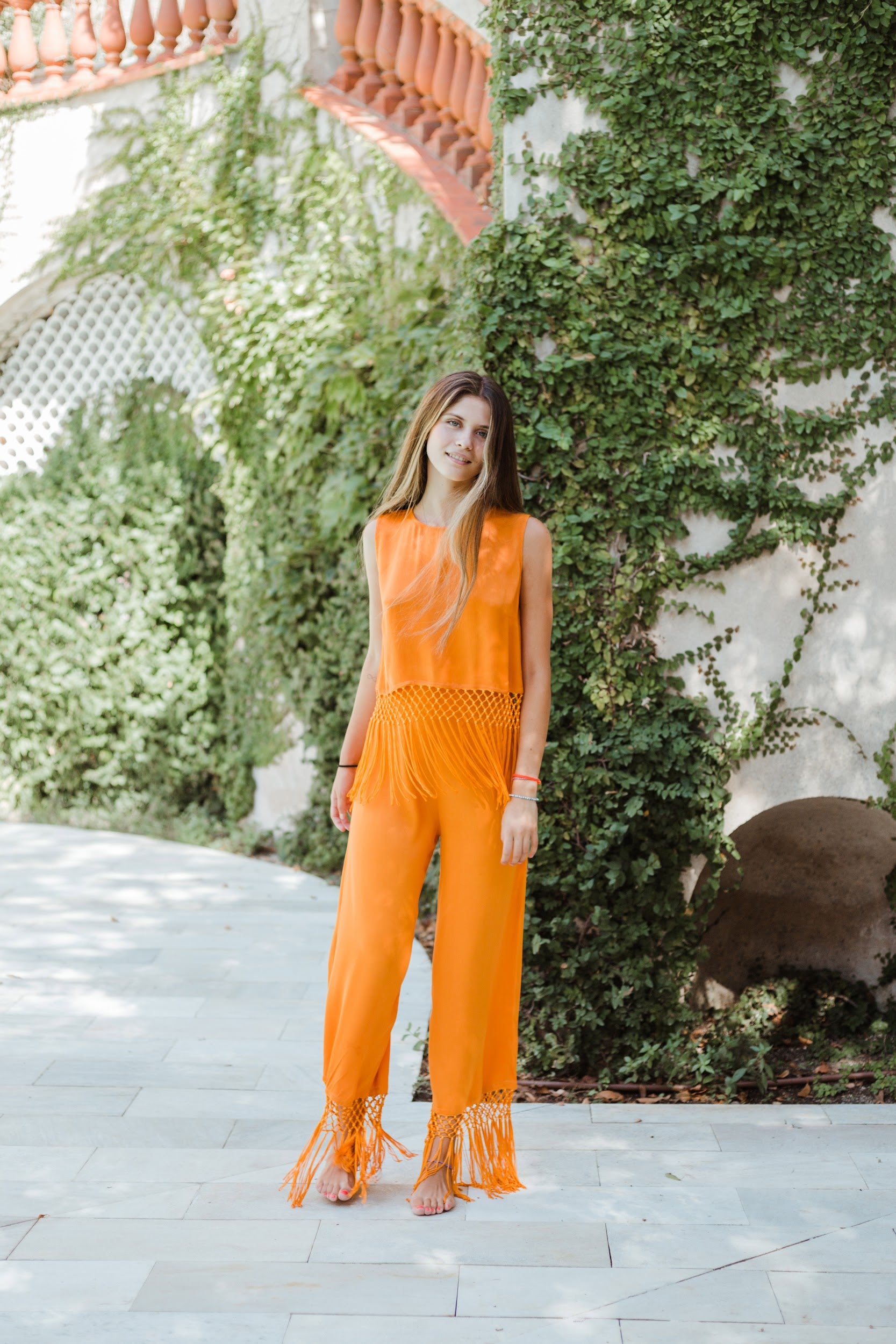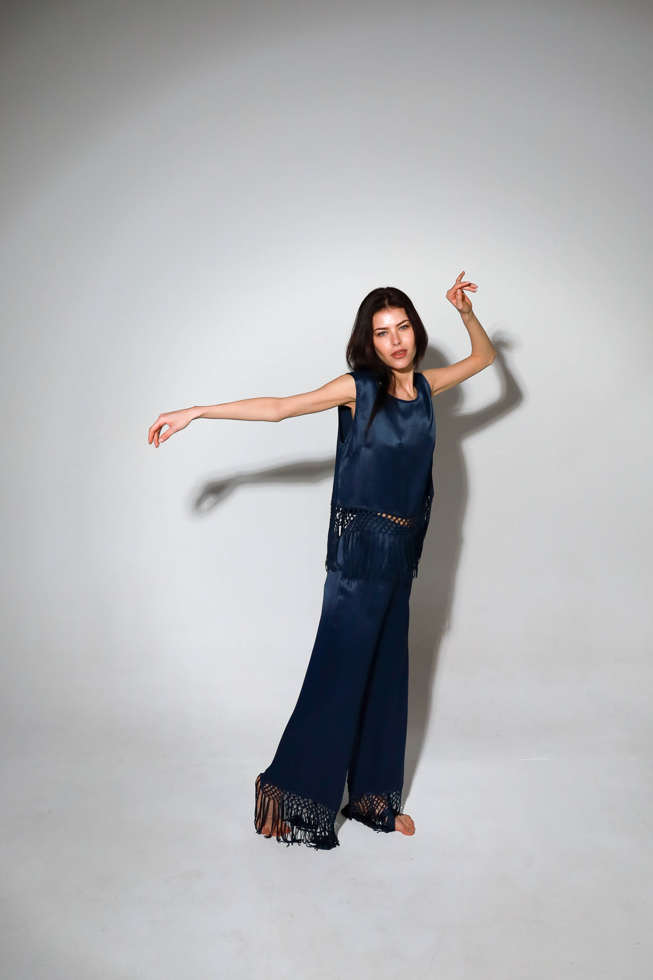Pantalón palazzo con cremallera invisible trasera y flecos en el bajo.