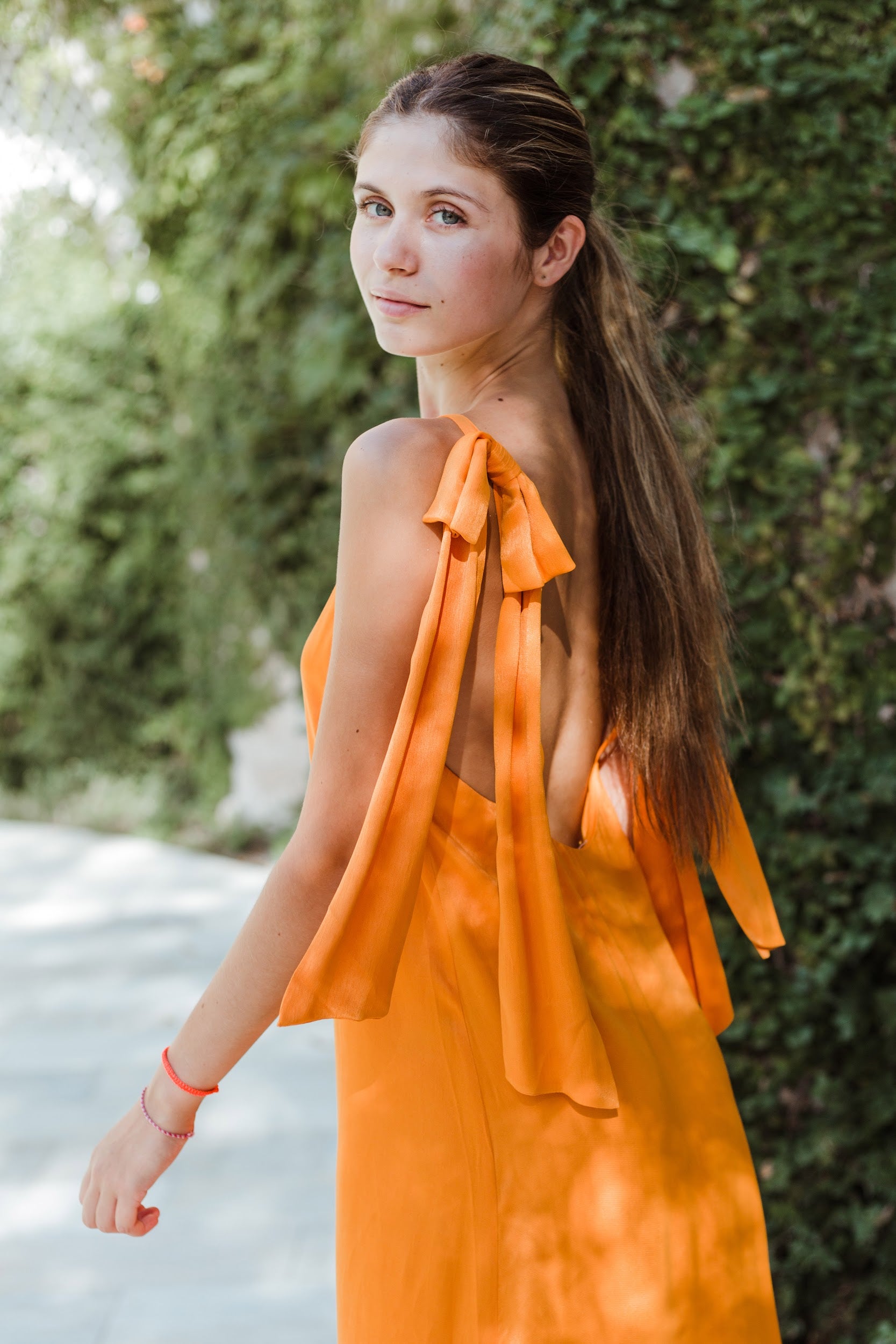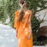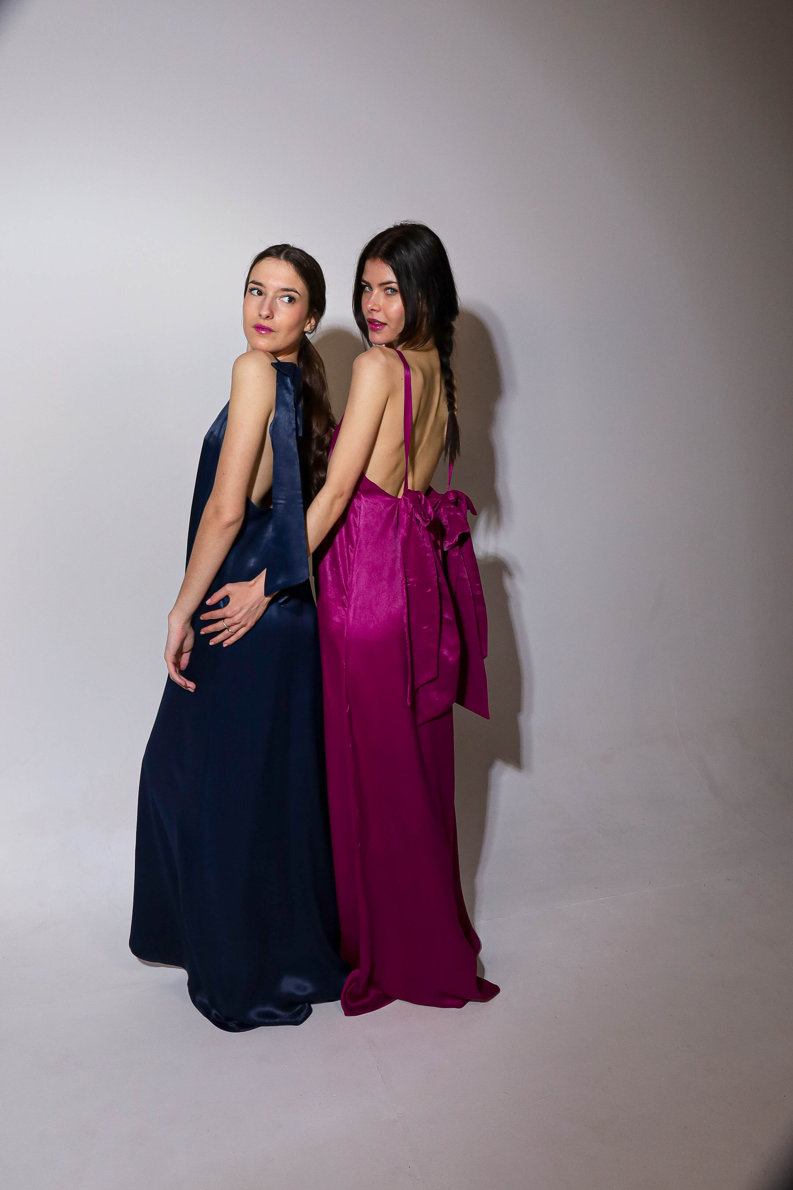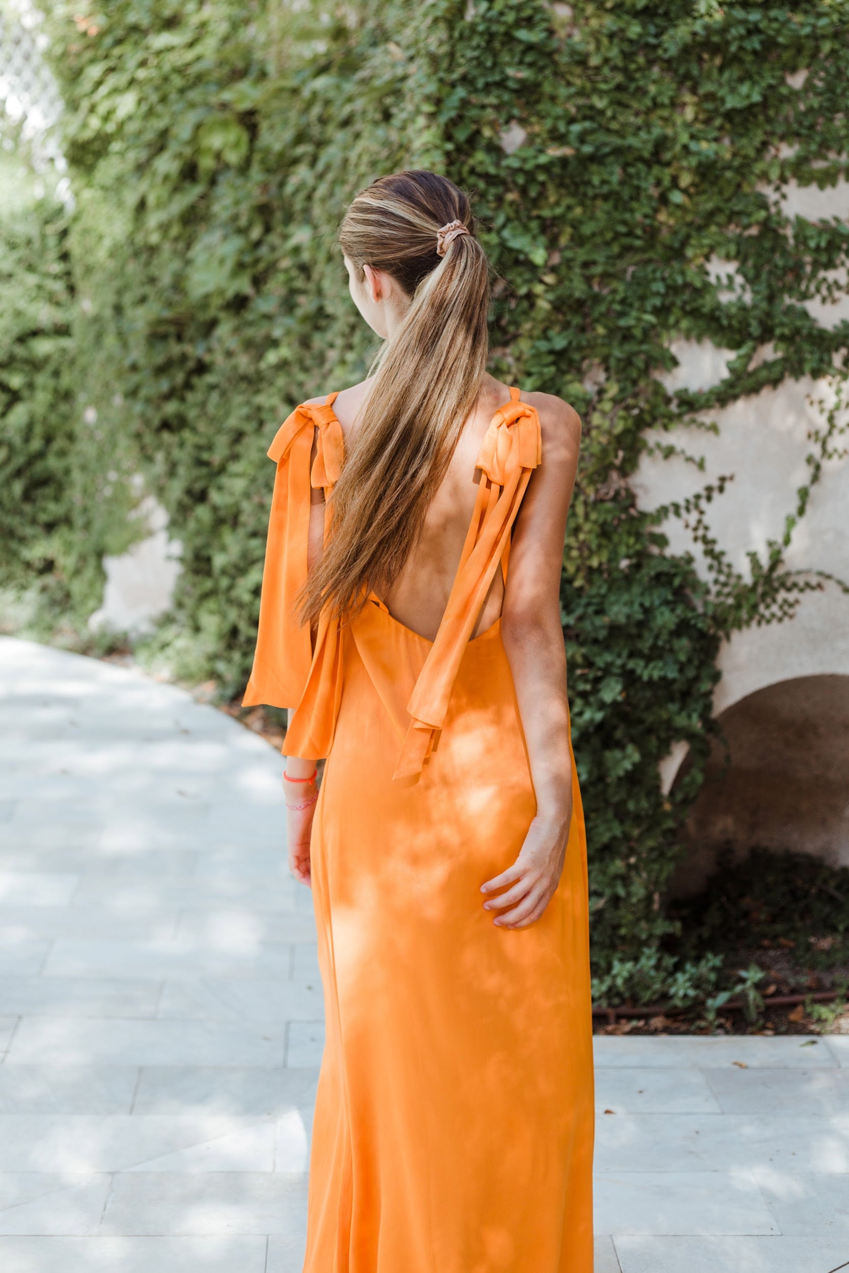 Vestido lencero largo con detalle de lazo en los hombros y espalda escotada. Cuerpo semi-evasé.