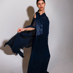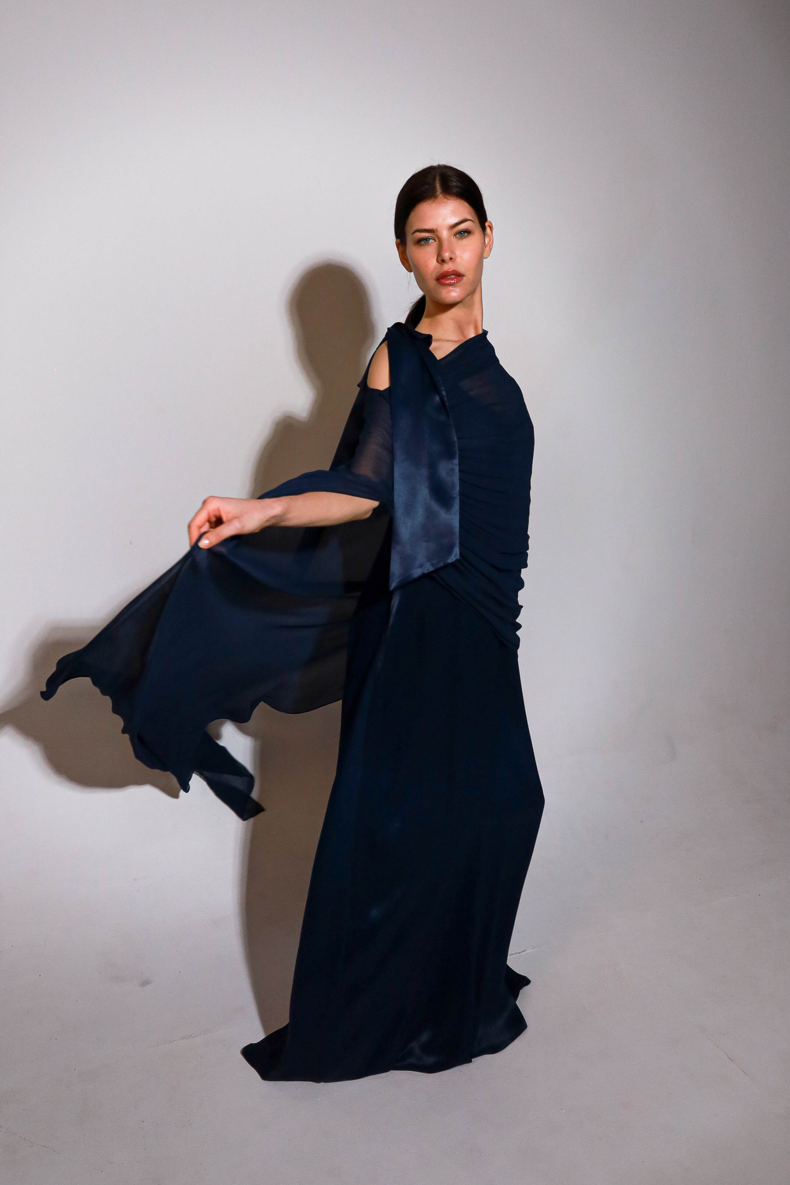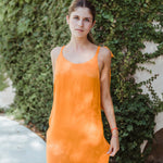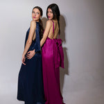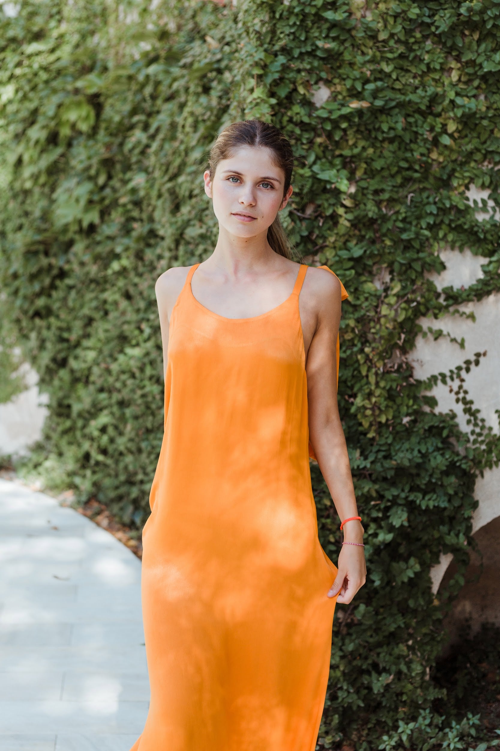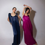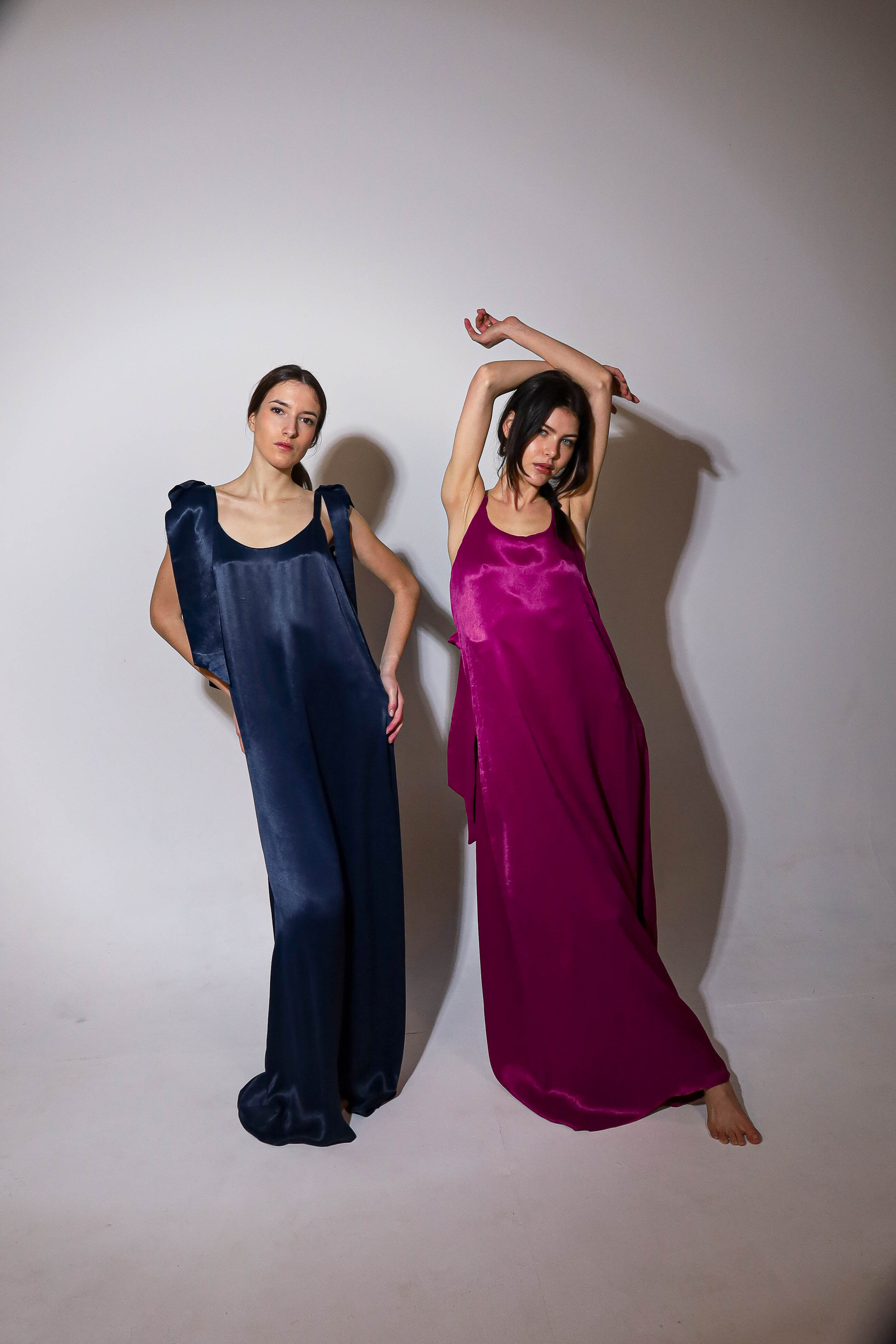 Vestido lencero largo con detalle de lazo en los hombros y espalda escotada. Cuerpo semi-evasé.
