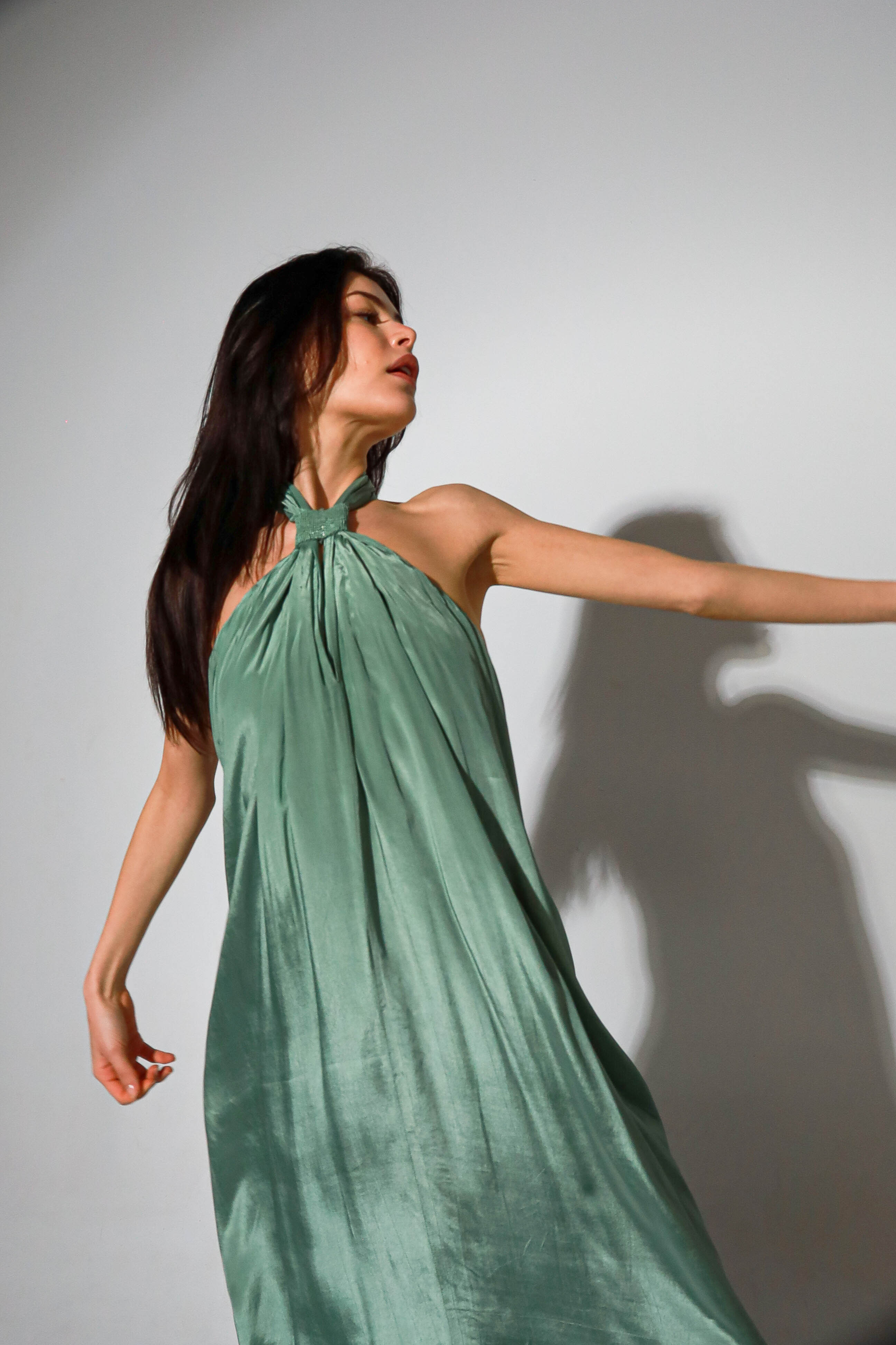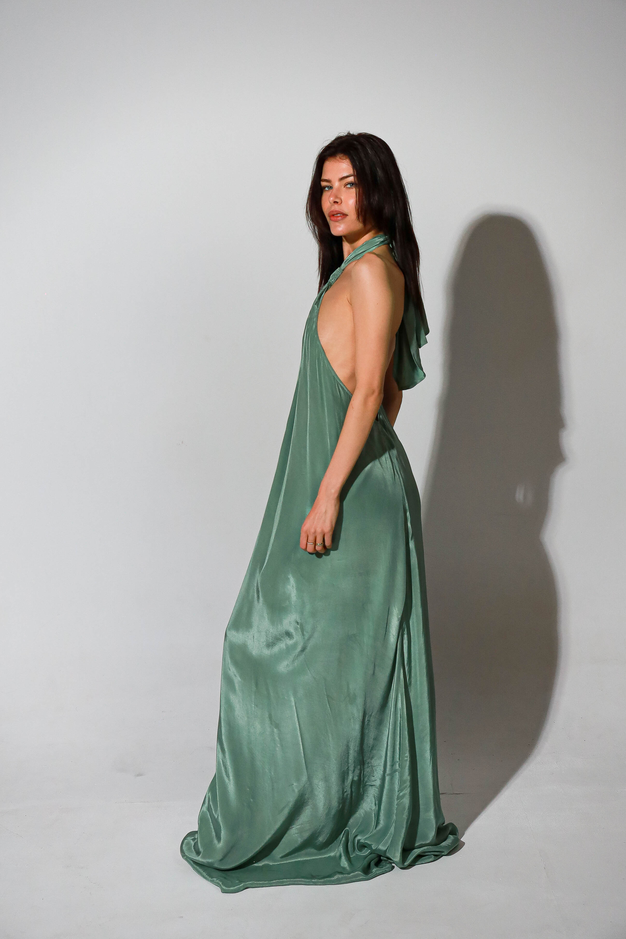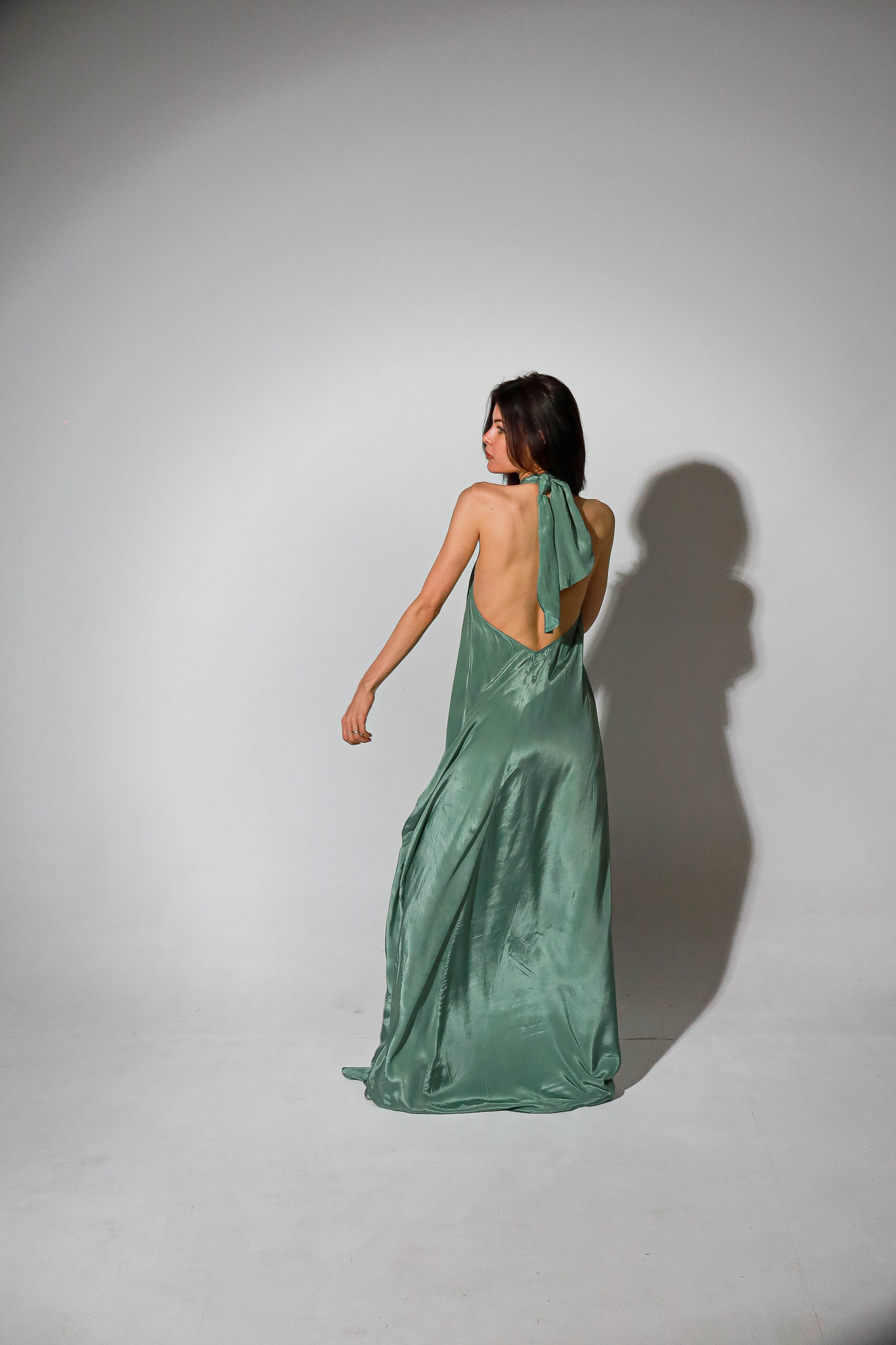 Vestido largo halter con detalle de pedrería como ajuste del vestido. Abertura delantera. Talla única: abarca desde una 34 hasta la talla 42.