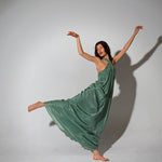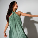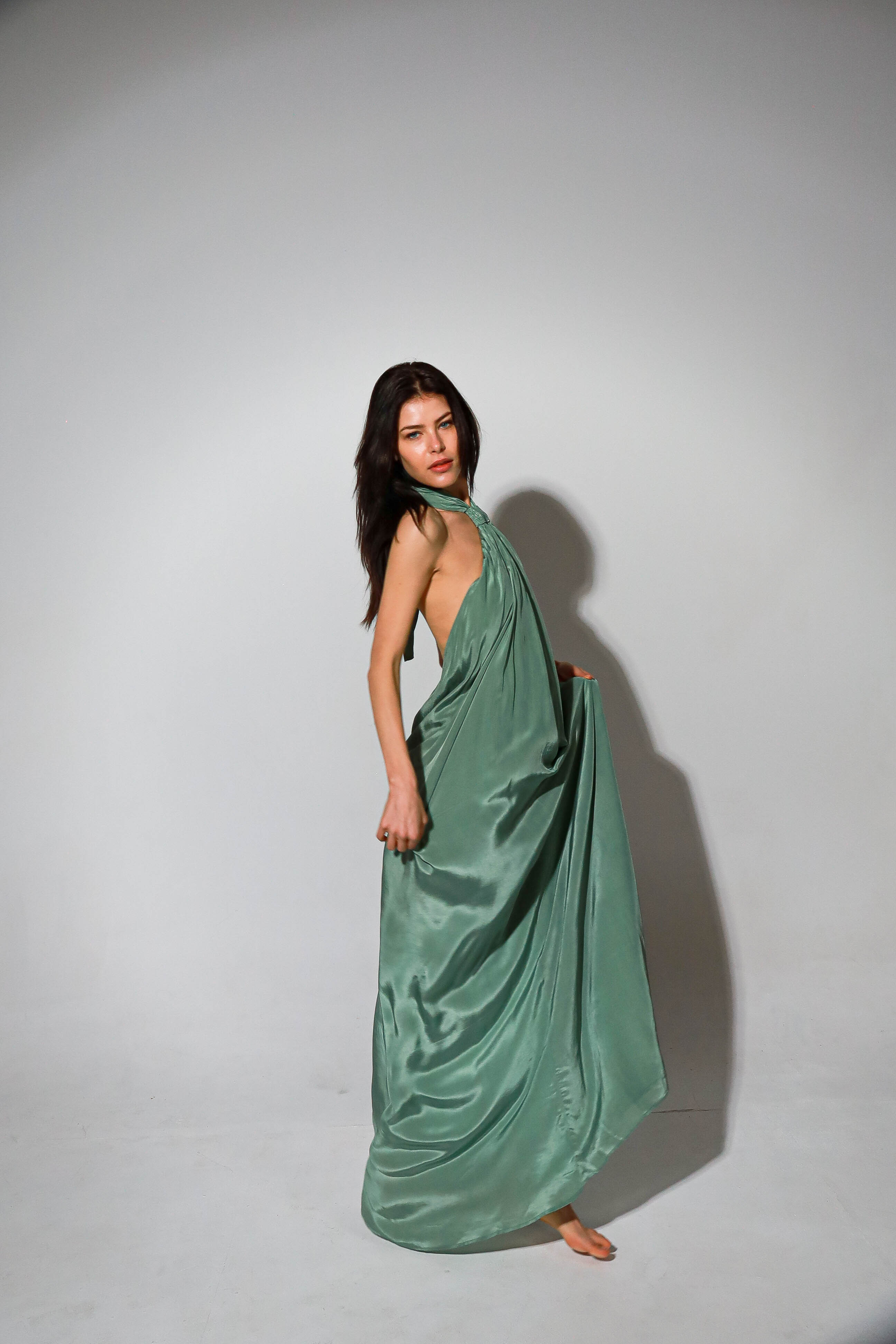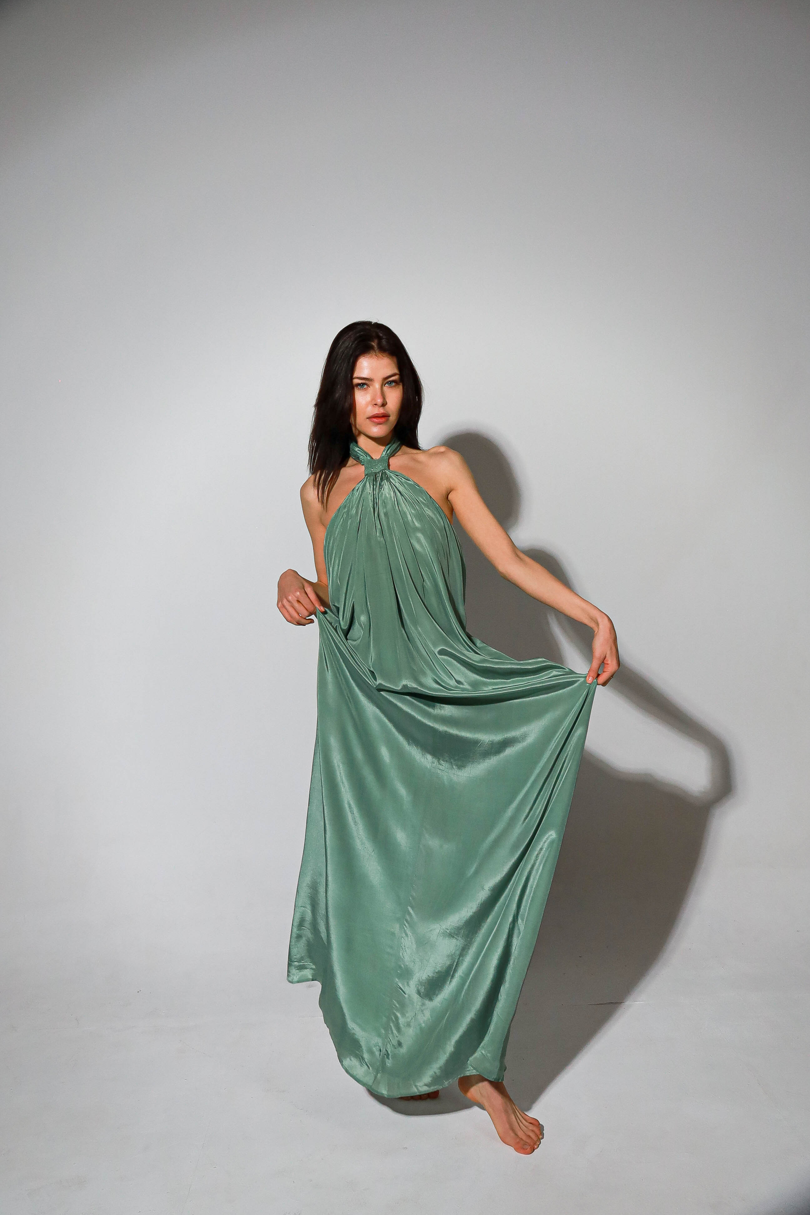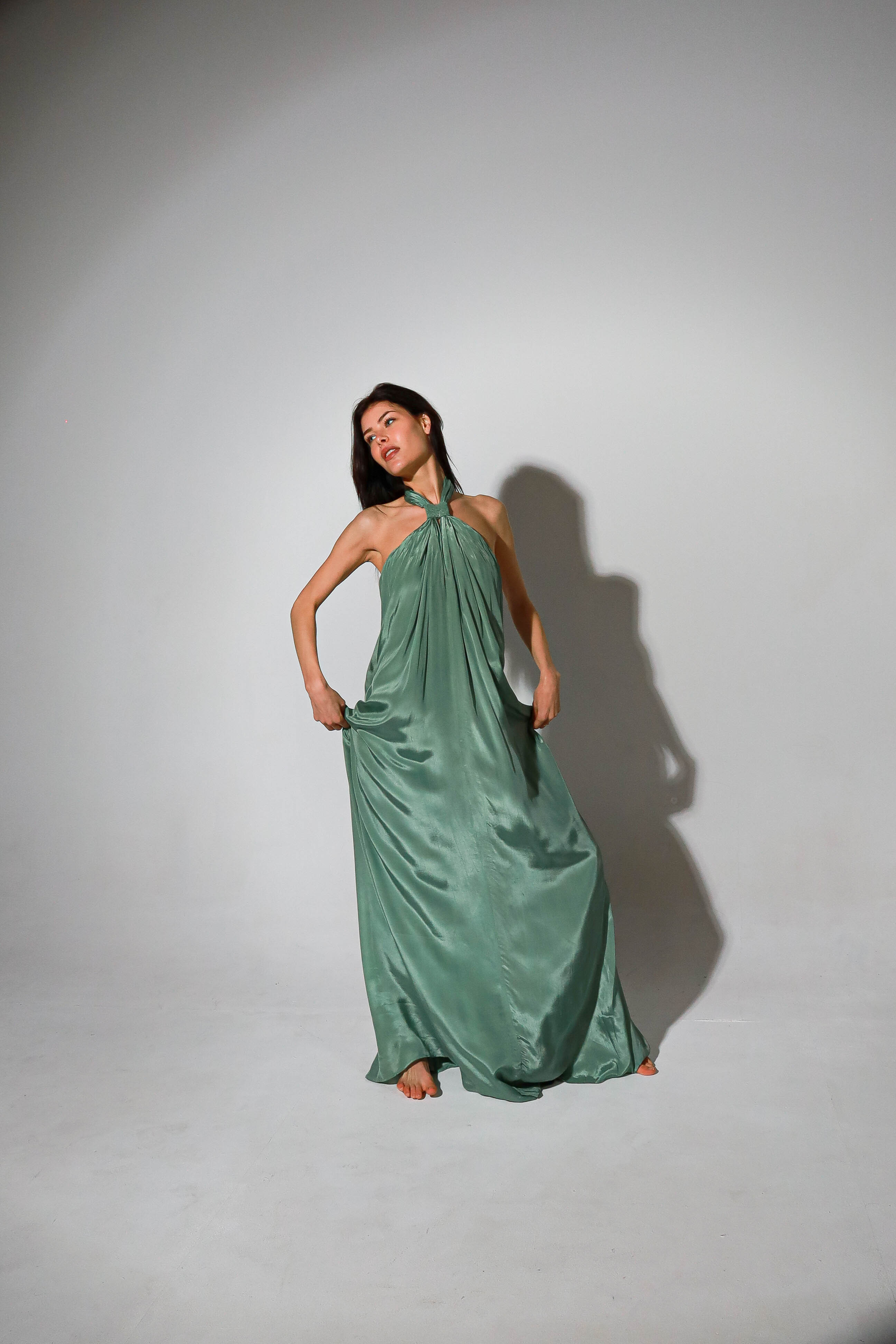 Vestido largo halter con detalle de pedrería como ajuste del vestido. Abertura delantera. Talla única: abarca desde una 34 hasta la talla 42.