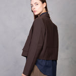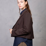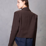 Americana corta de silueta cruzada con doble botonadura. Diseño de cuello solapa y manga larga acabada en puño abotonado. Estructura recta con detalle tipo bolsillos frontales.