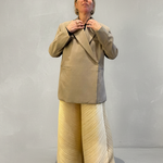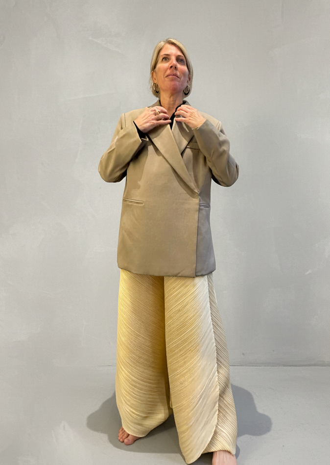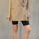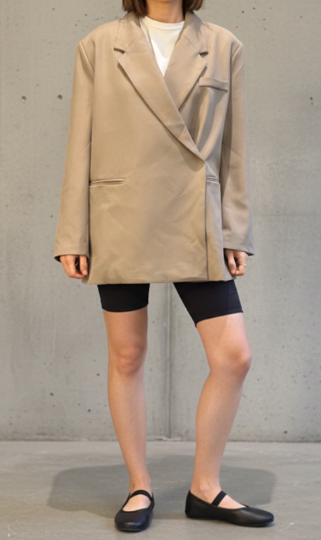 Americana de silueta oversize con diseño cruzado. Cuello con solapas anchas, hombro de corte estructurado, bolsillos de vivo y caída elegante.