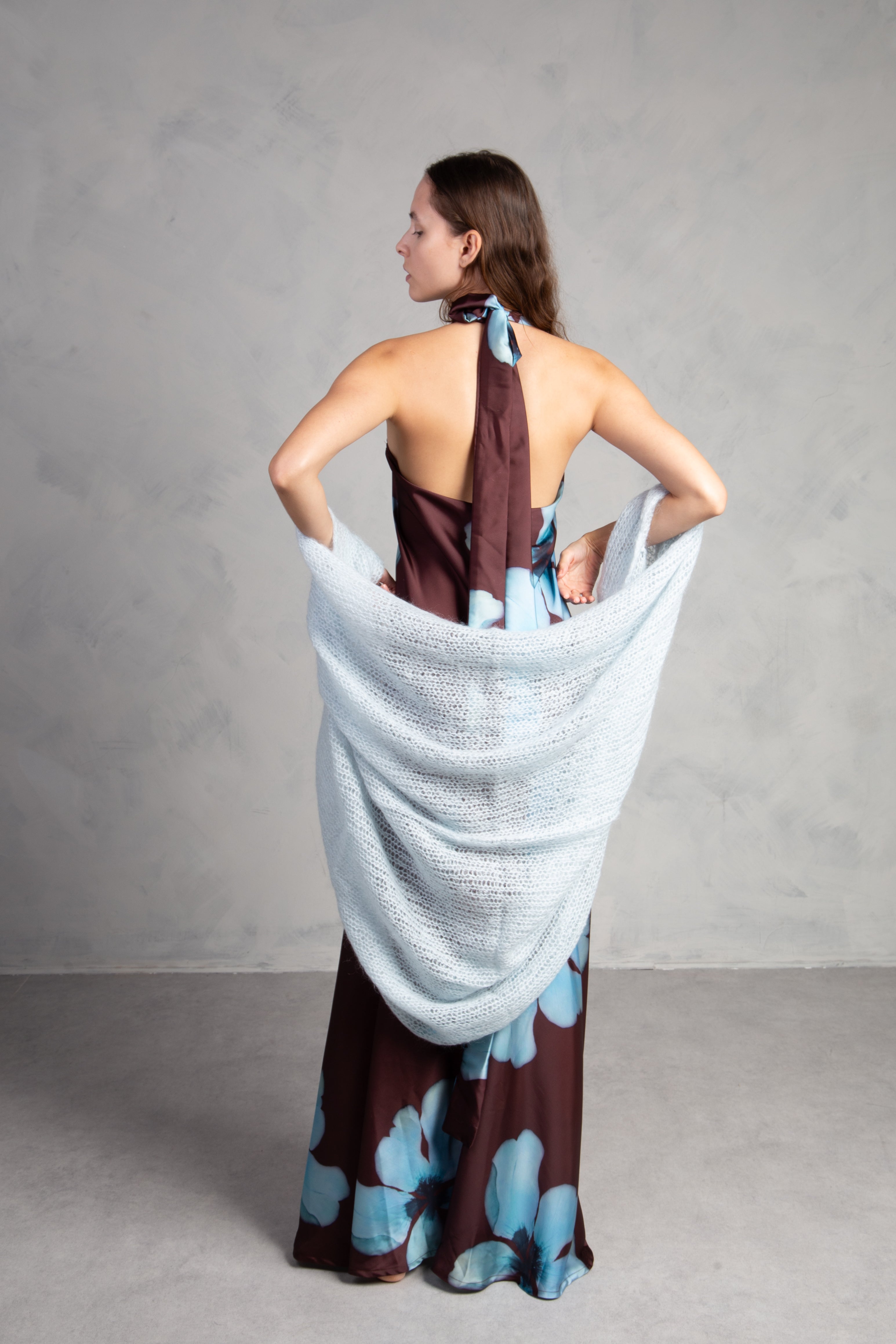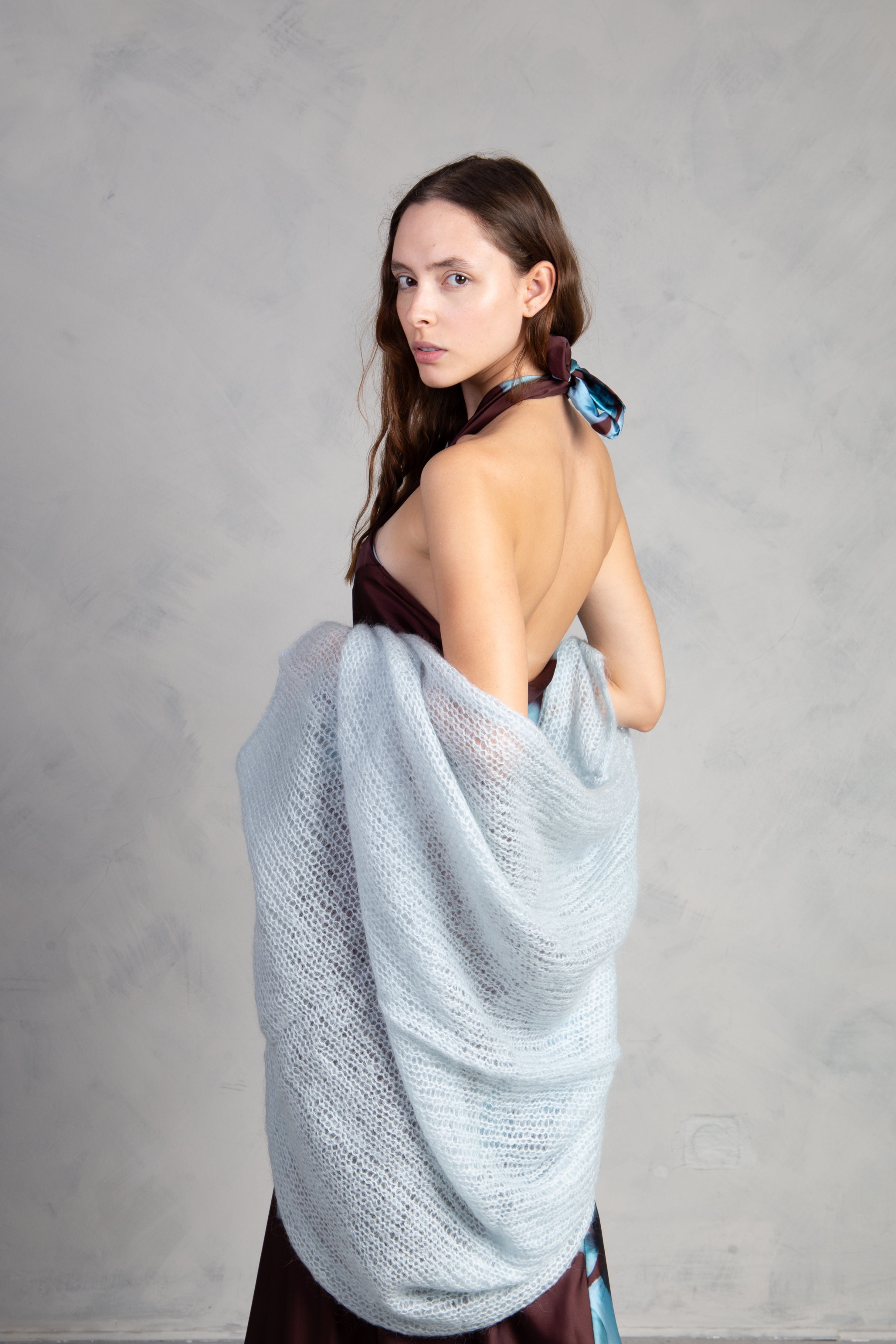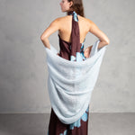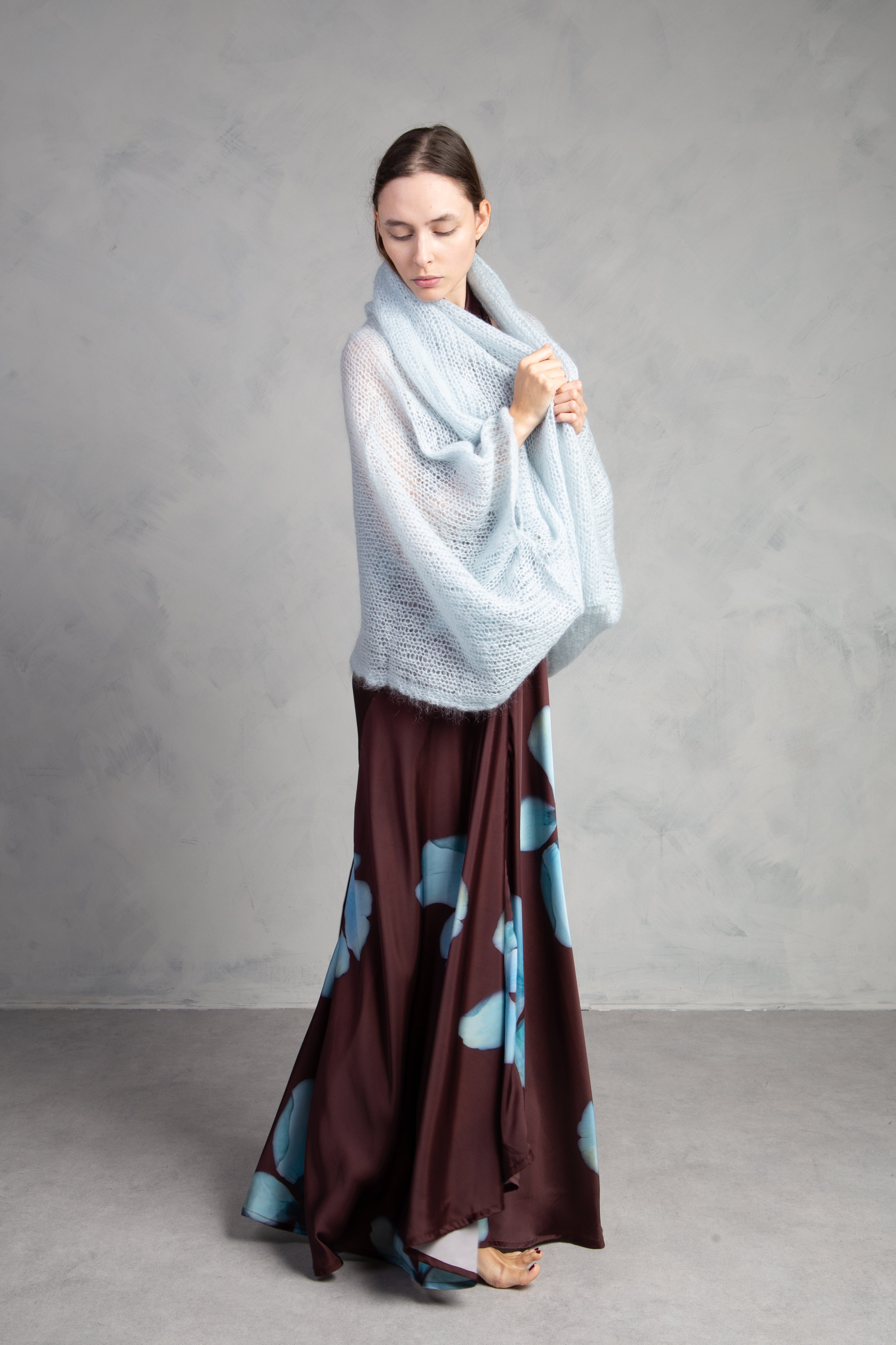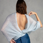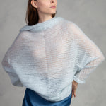 Chal de silueta amplia y envolvente con cuello chal. Diseño abierto con manga ancha tipo kimono, confeccionado en un delicado y ultraligero Cashmere.