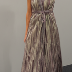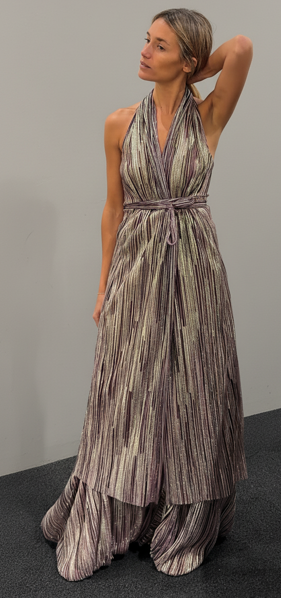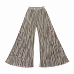 Pantalón fluido de punto con lúrex. De talle alto, cintura elástica y pernera ancha. Con trama de rayas verticales multicolor que crea un efecto visual que se realza con el movimiento.
