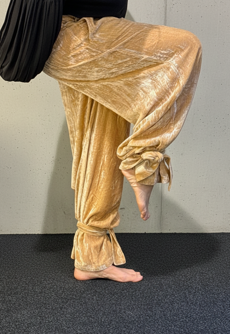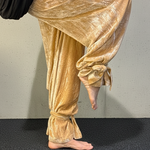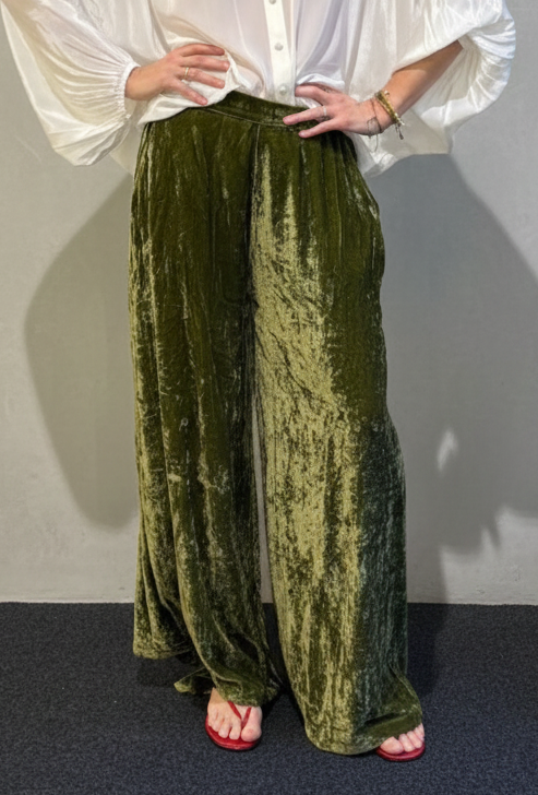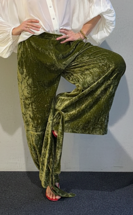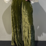 Pantalón de terciopelo con cintura elástica, bolsillos laterales, corte de pierna ancho y cinta removible con botonadura para crear efecto bombacho.
