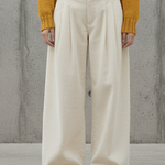 Pantalón en pana de talle alto y pernera ancha. Diseño sastre con pinzas en la parte delantera que aportan volumen y estructura a la silueta.
