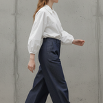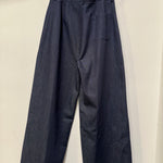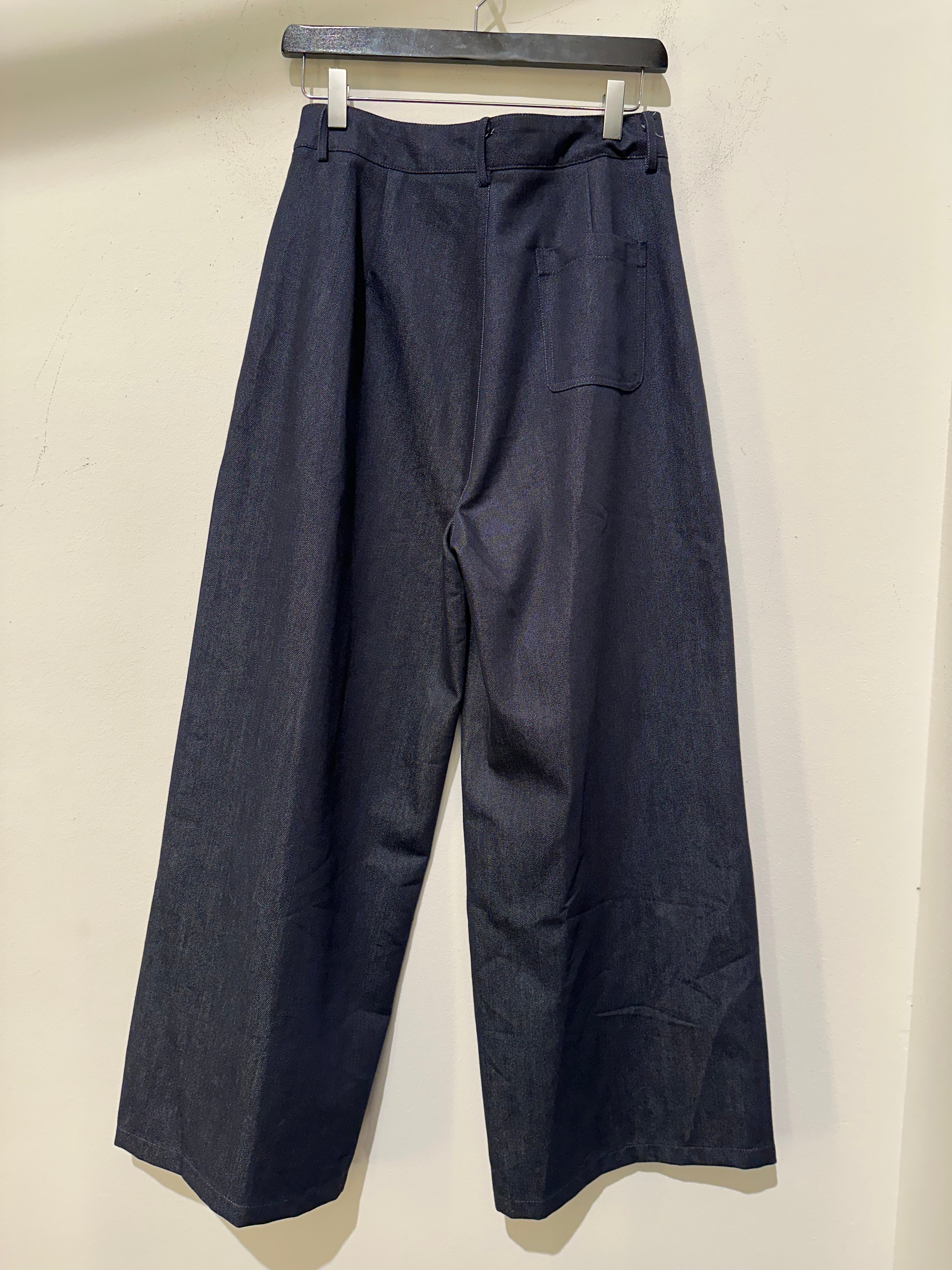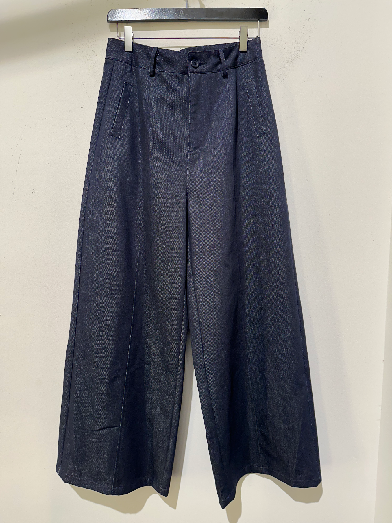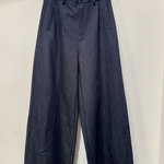 Pantalón de denim oscuro, talle alto y pernera ancha con largo cropped. Diseño con pinzas frontales que aportan volumen, bolsillos de vivo y un bolsillo en la parte trasera.