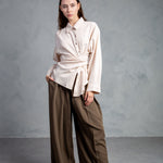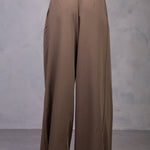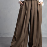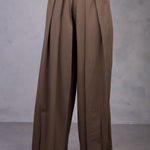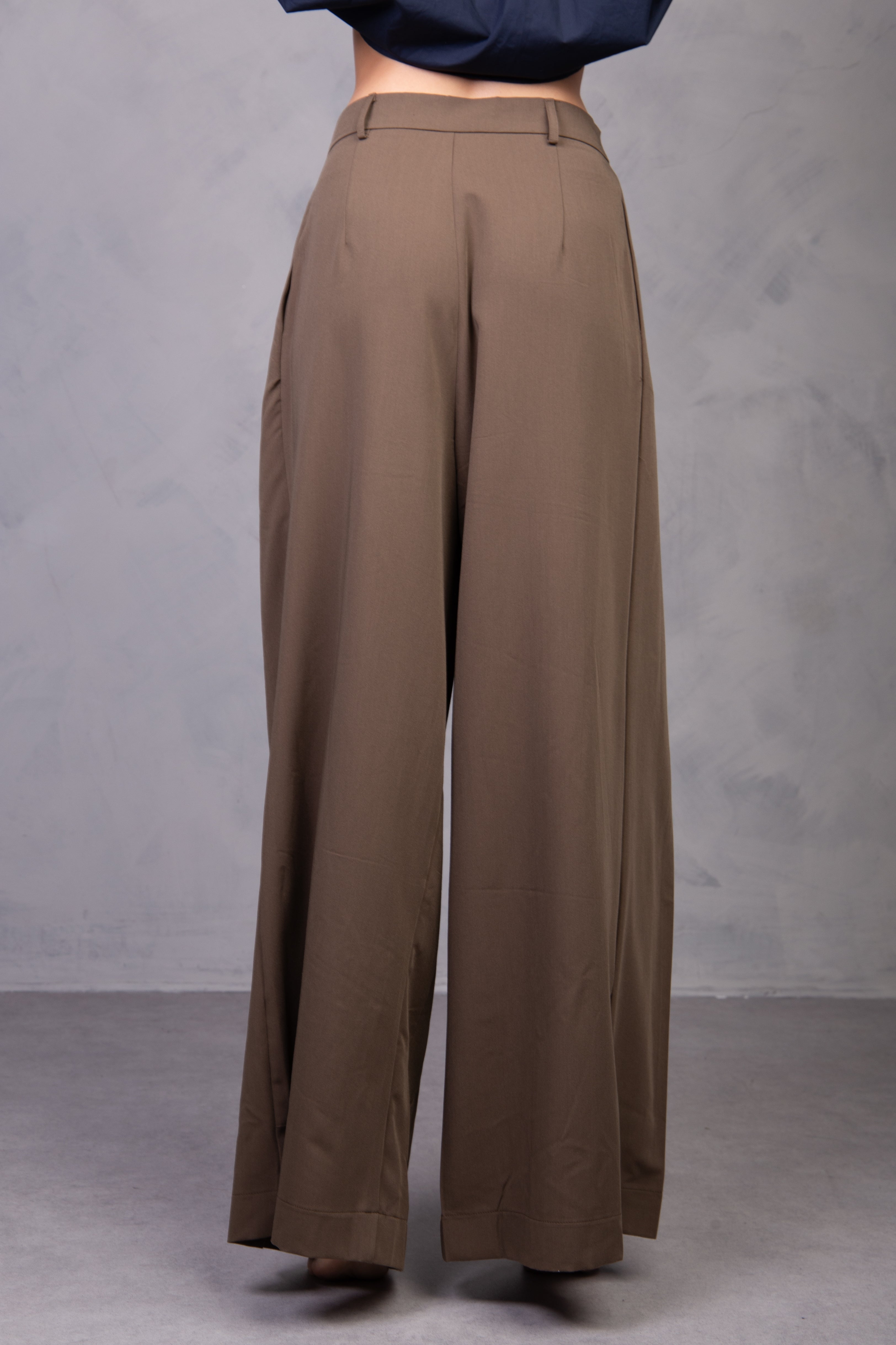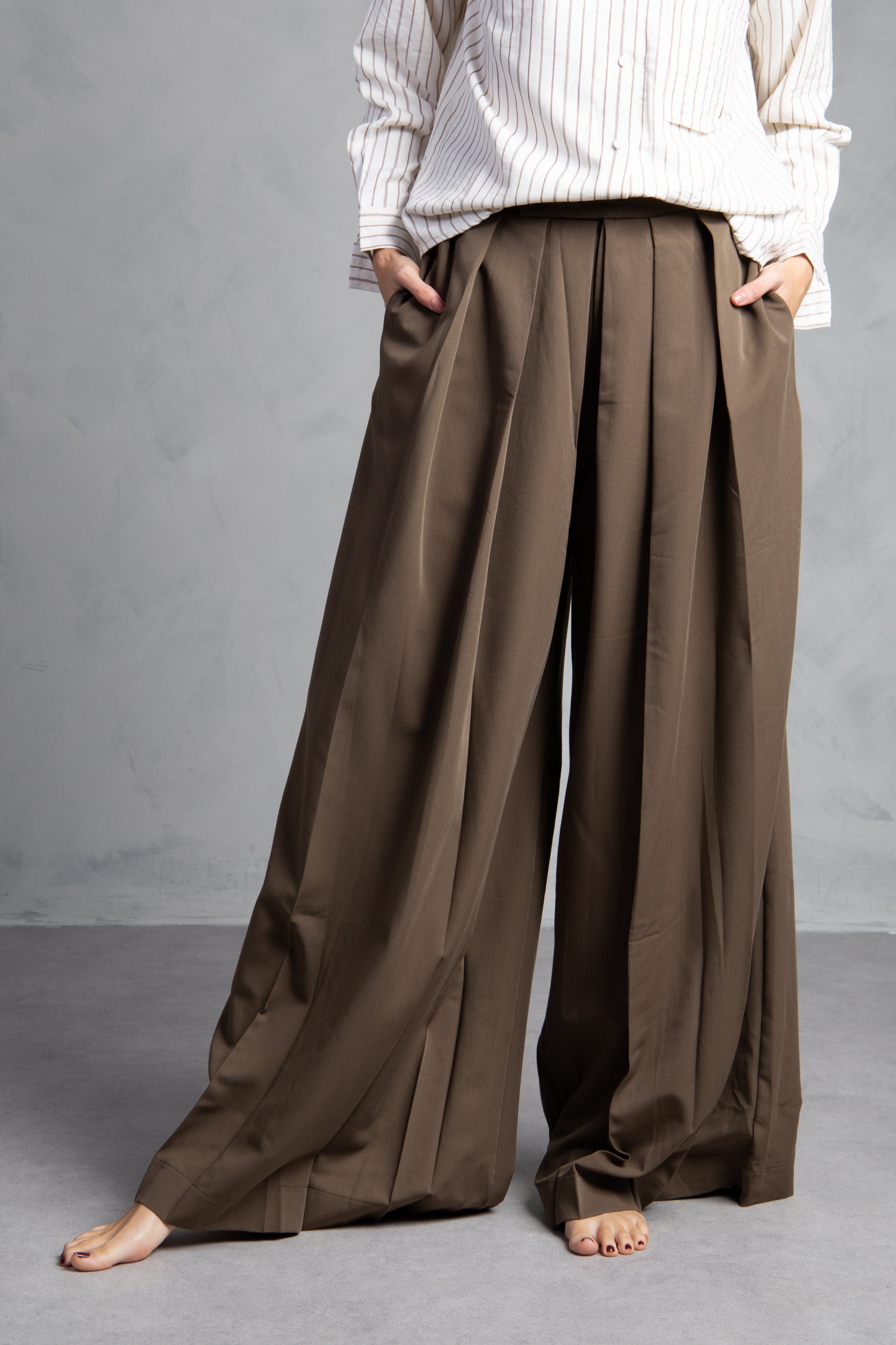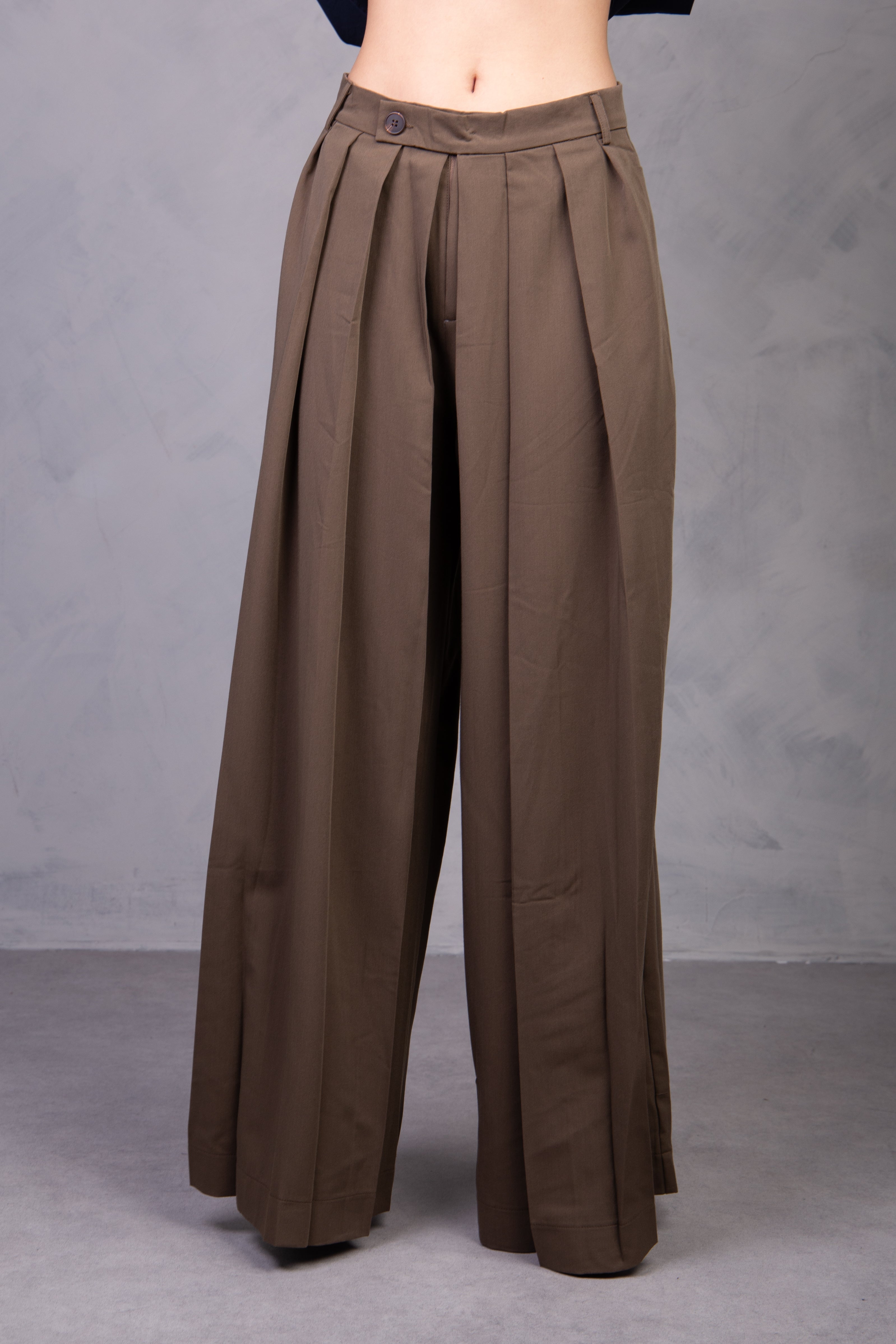 Pantalón ancho de talle alto. Diseño con pliegues frontales que crean una silueta fluida, con volumen.