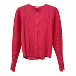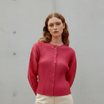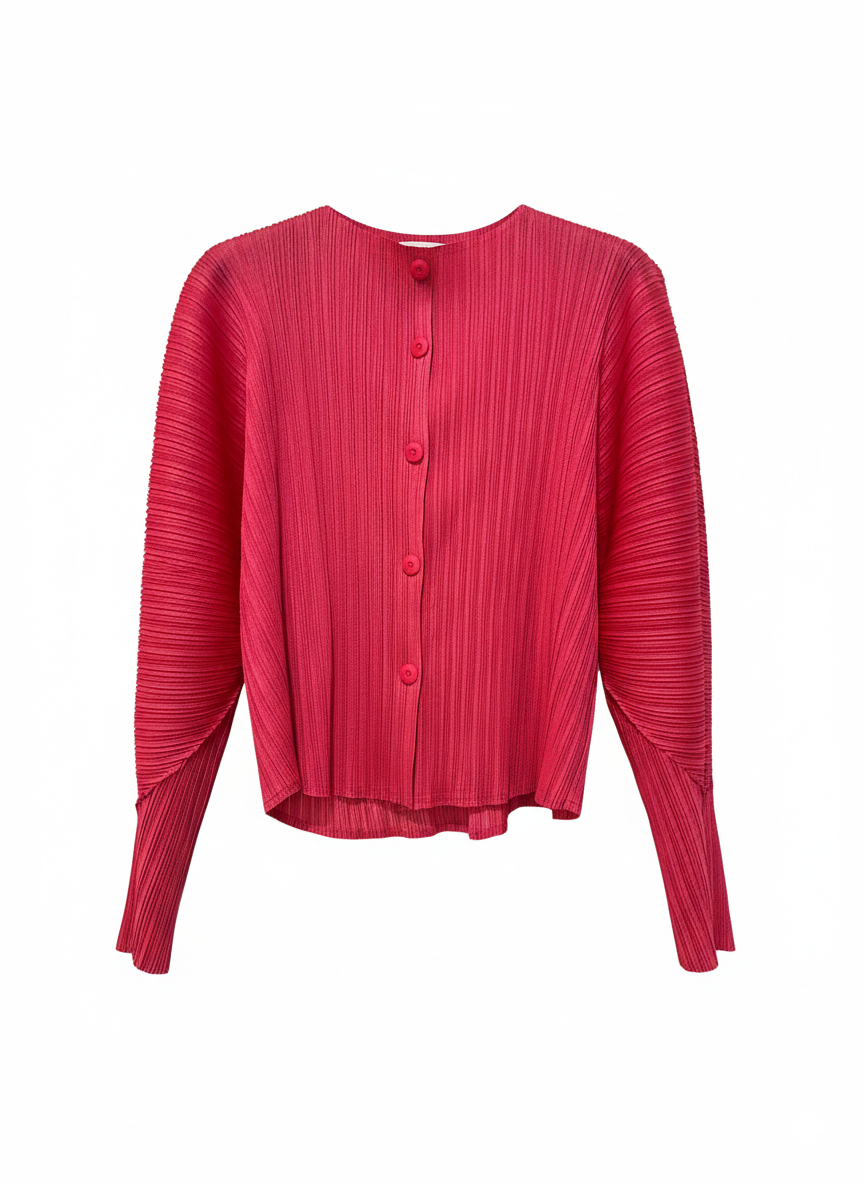 Top plisado de cuello redondo y manga larga. Diseño con cierre de botonadura frontal revestida a tono y silueta arquitectónica con corte en la manga que aporta movimiento.