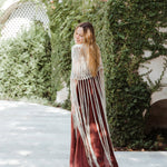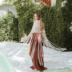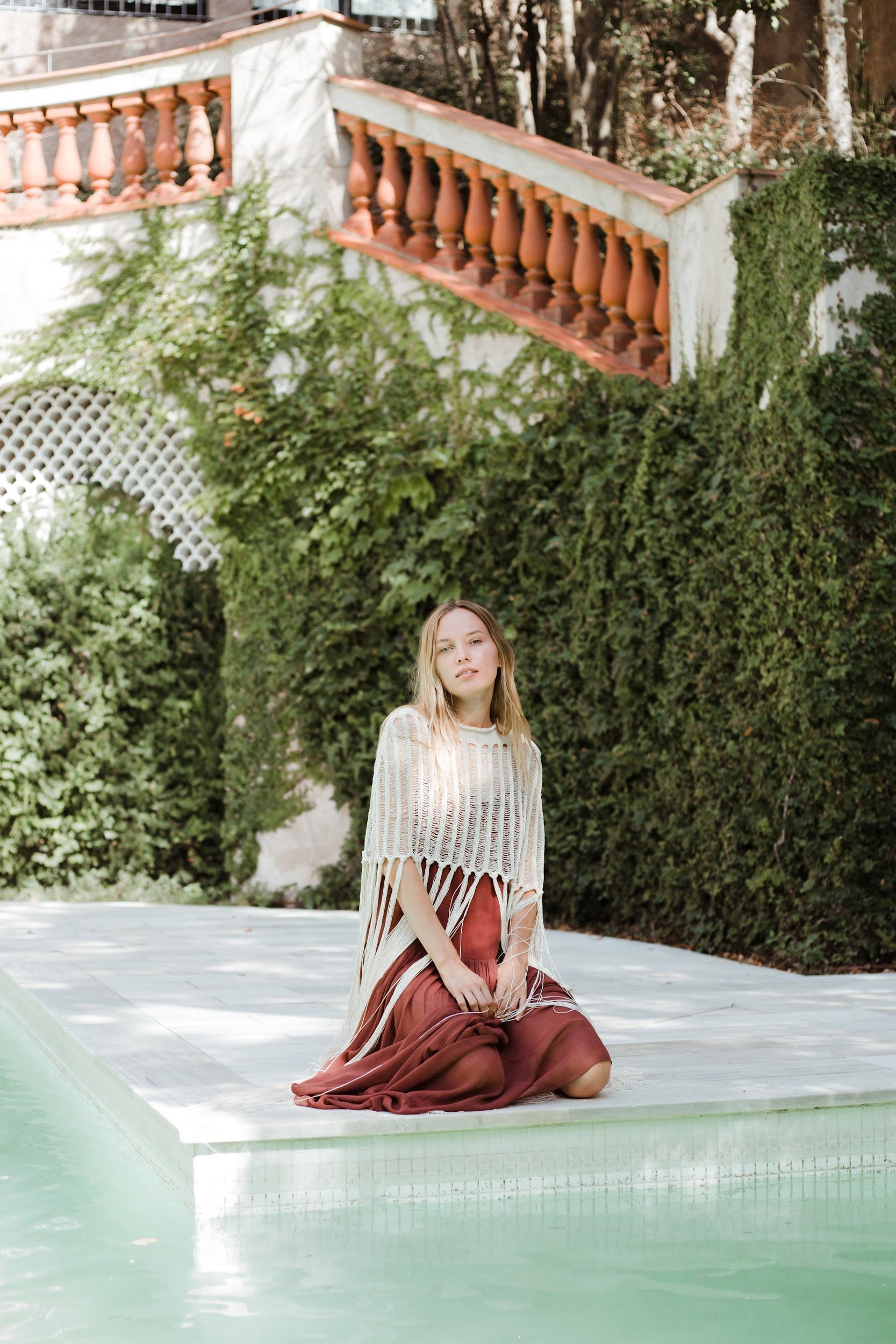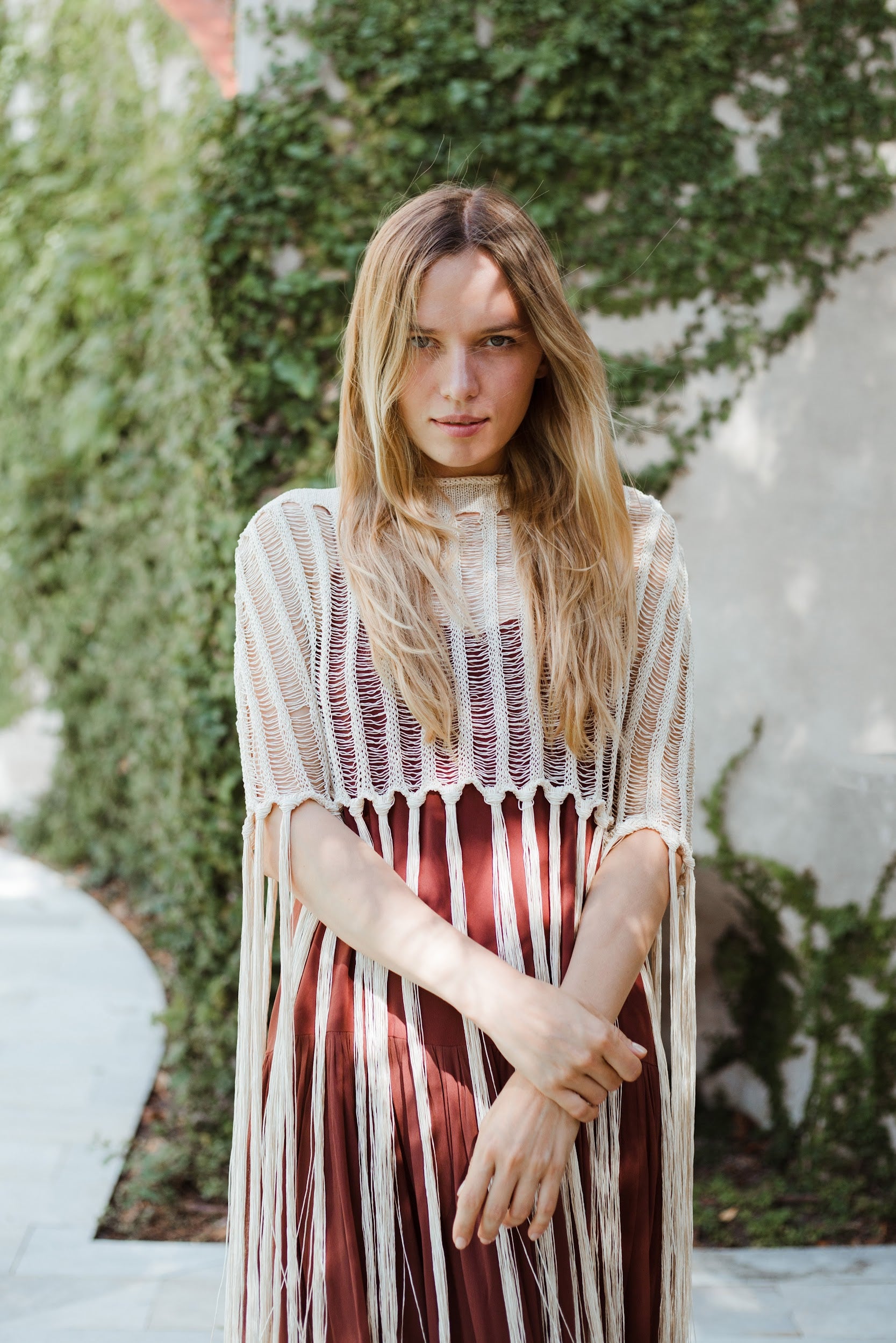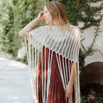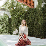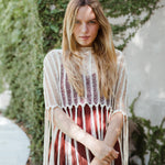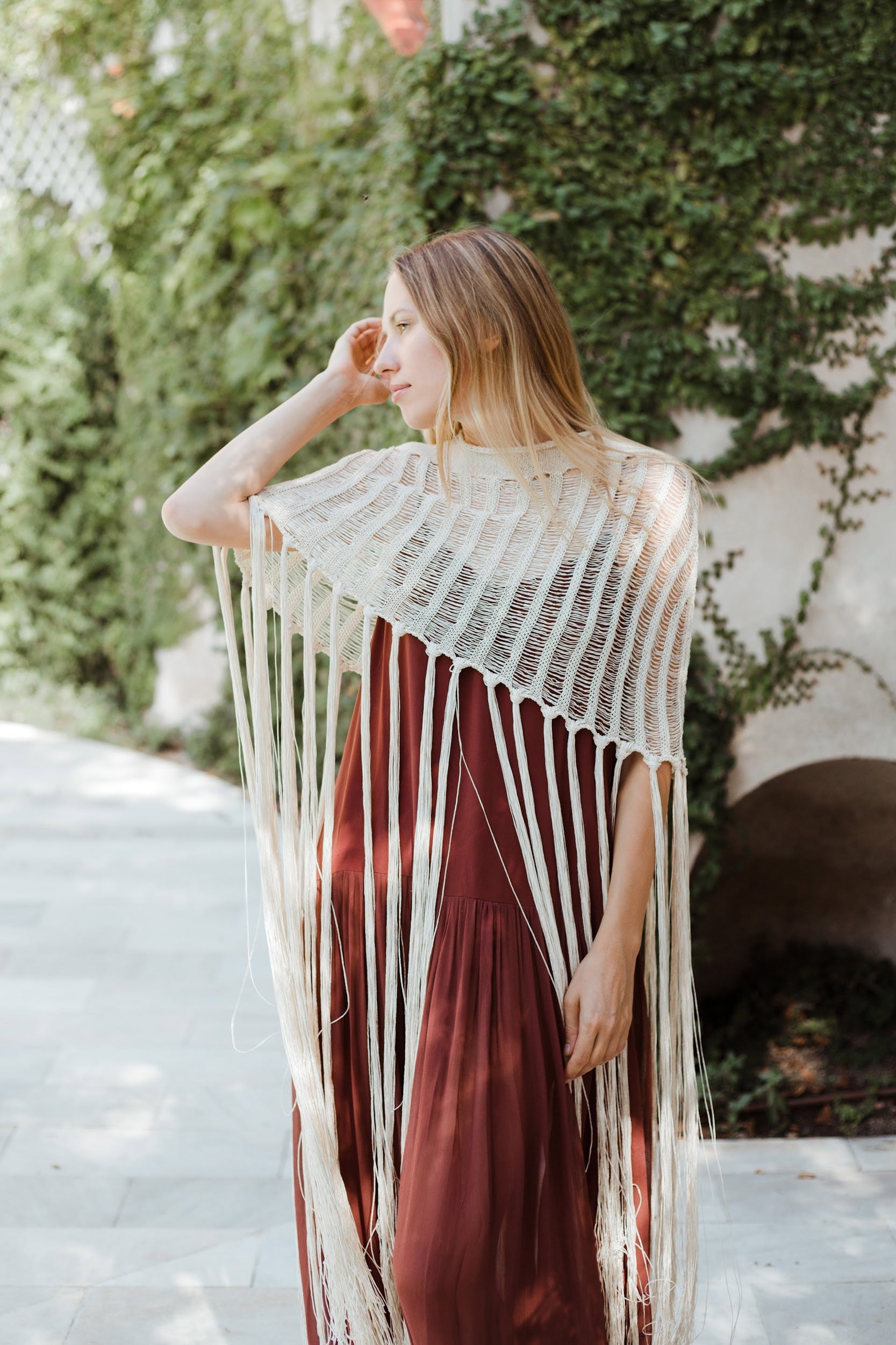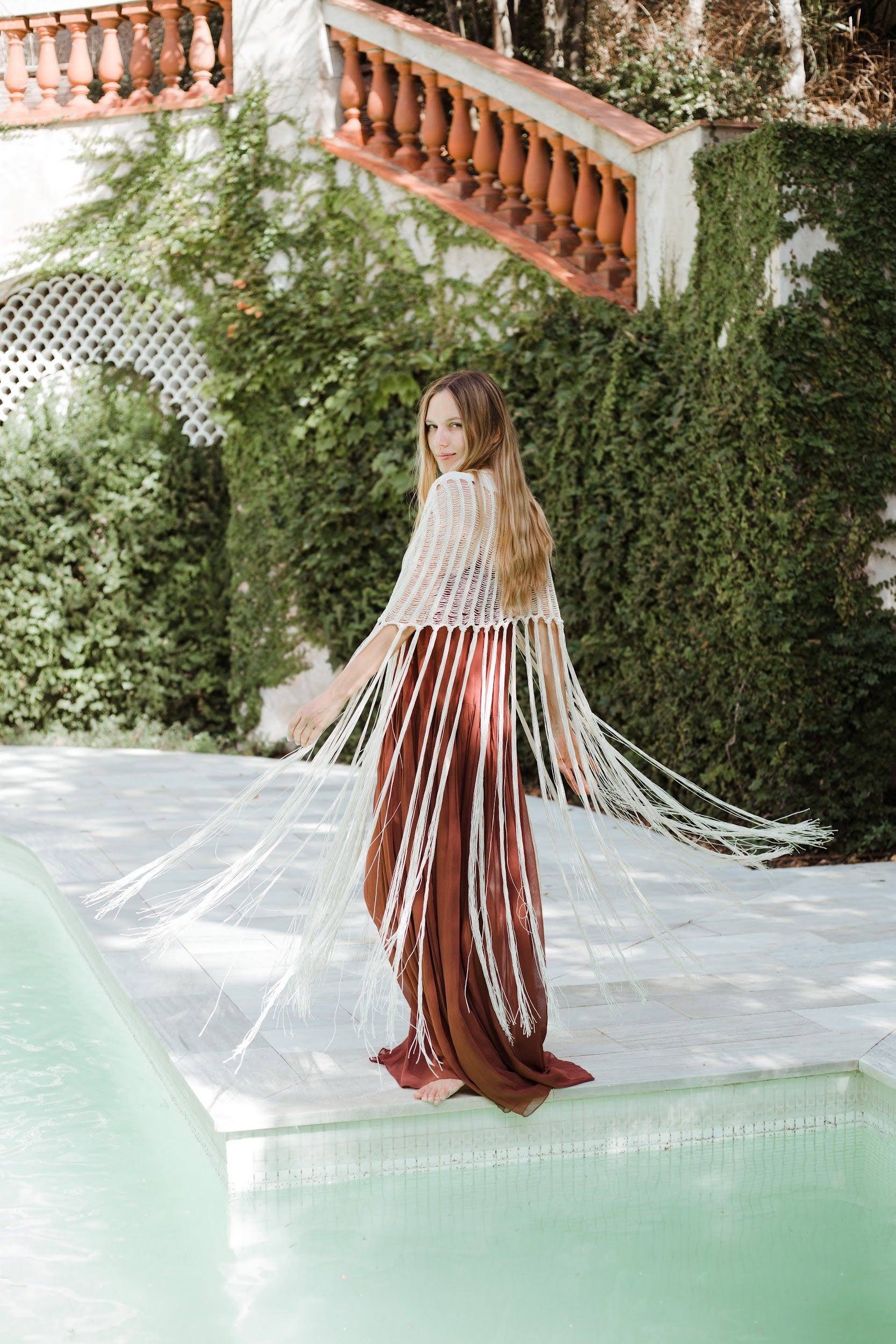 Capa de hilo satinado con flecos largos hasta el tobillo. La capa tiene el cuello redondo y tapa hasta el codo.