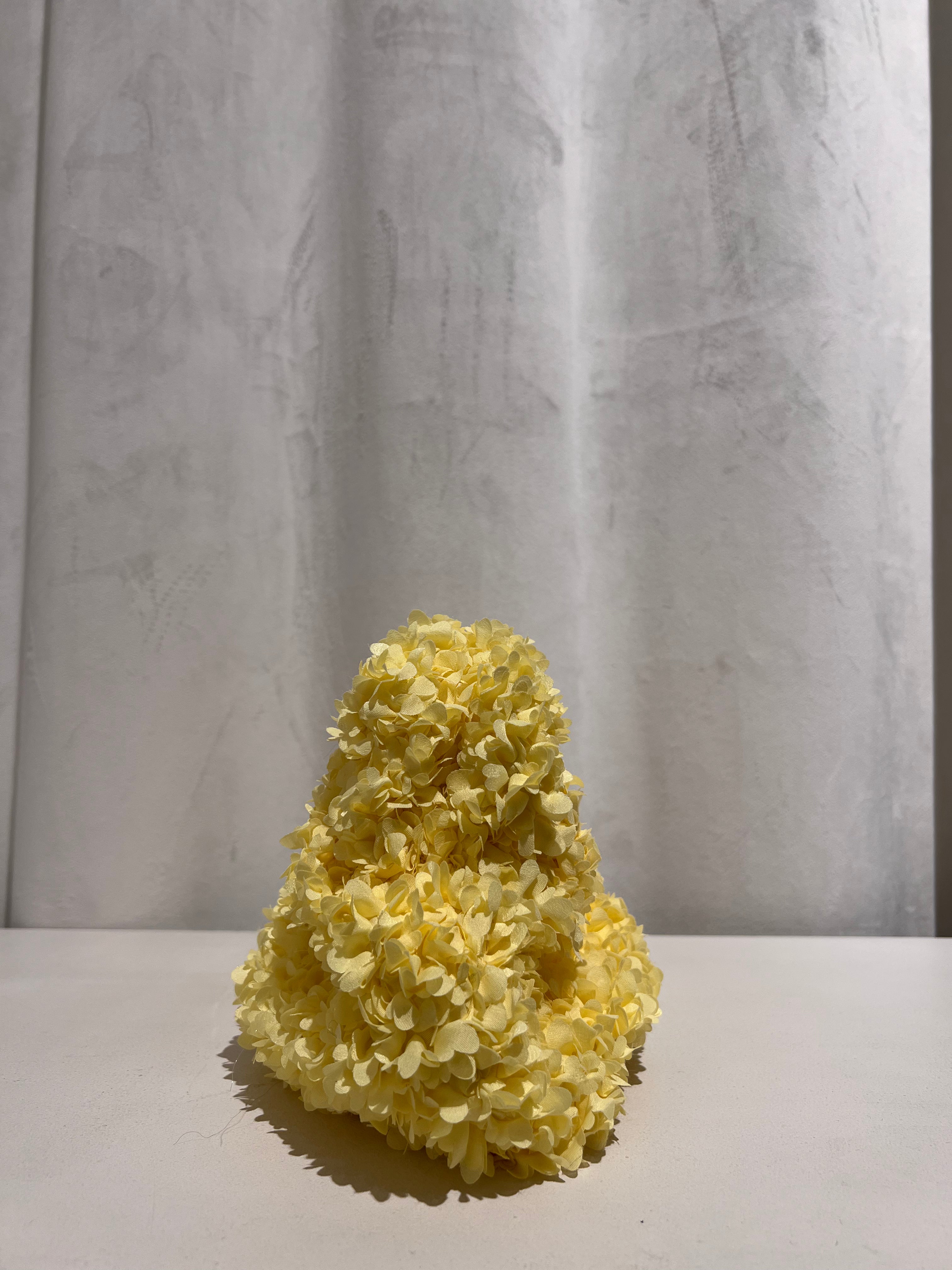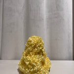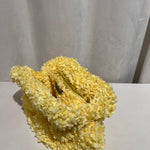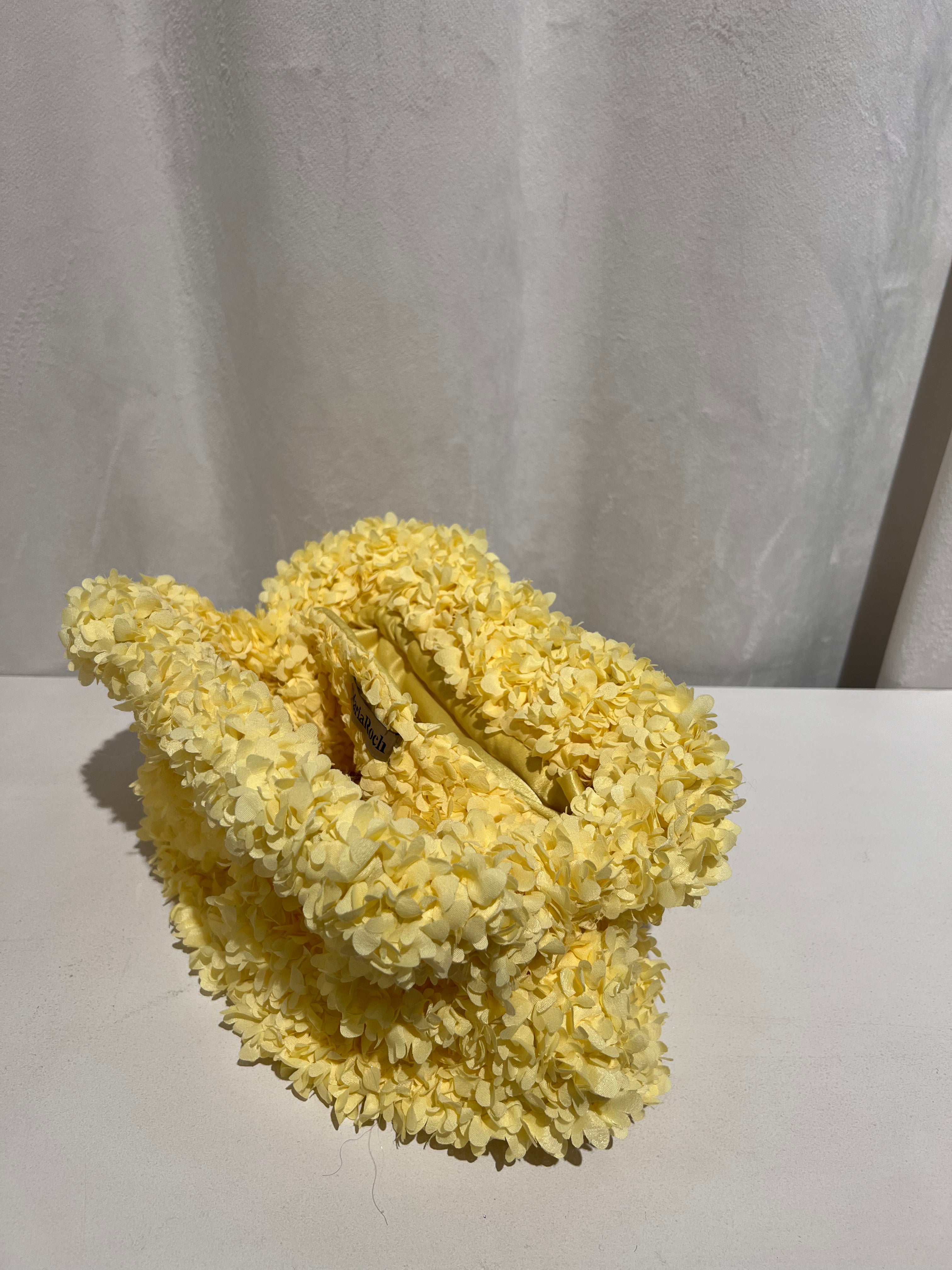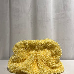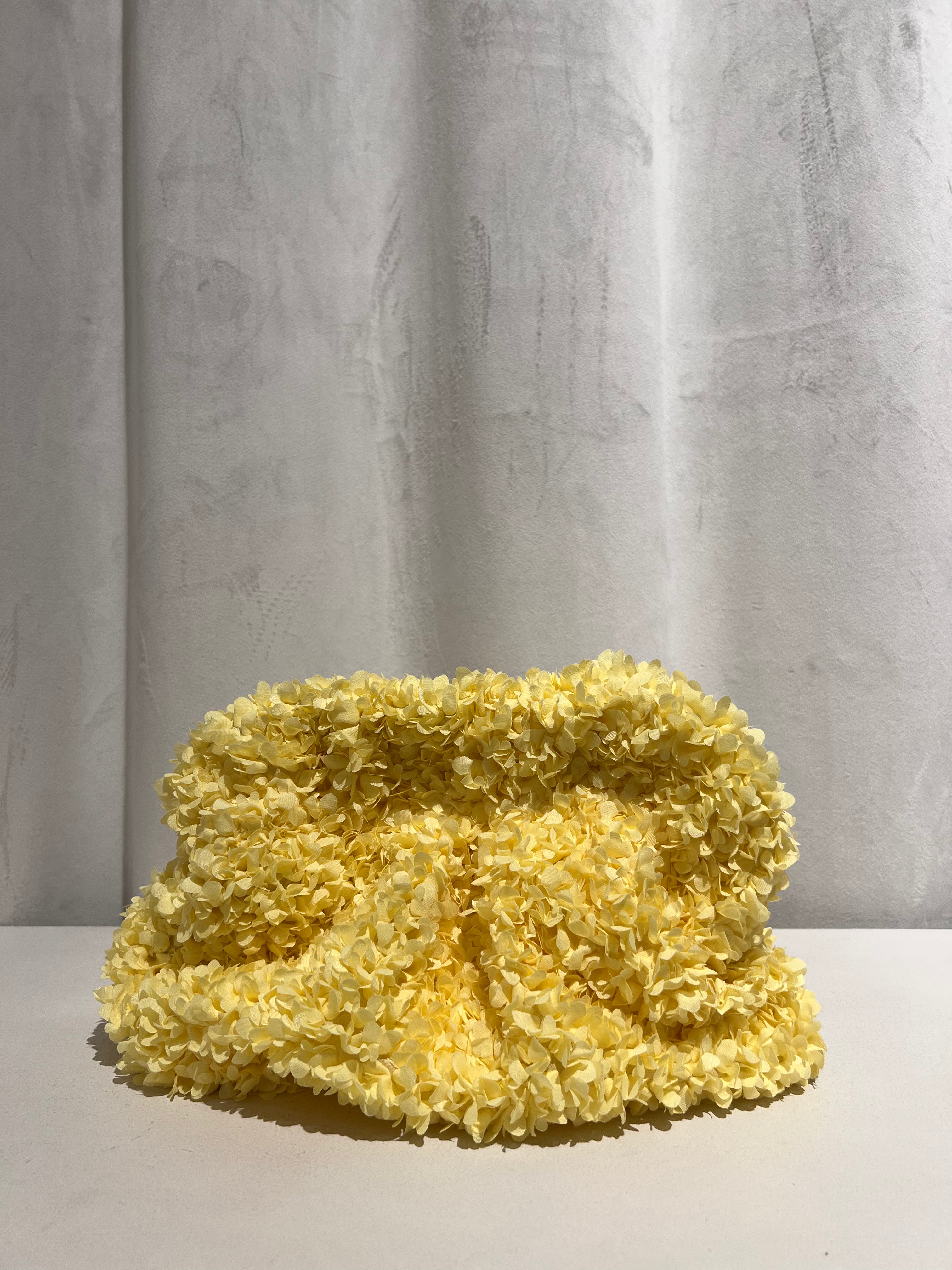 Clutch diseño MariaRoch con tejido de pétalos amarillo, bolsillo interior y asas para colgar cadena.