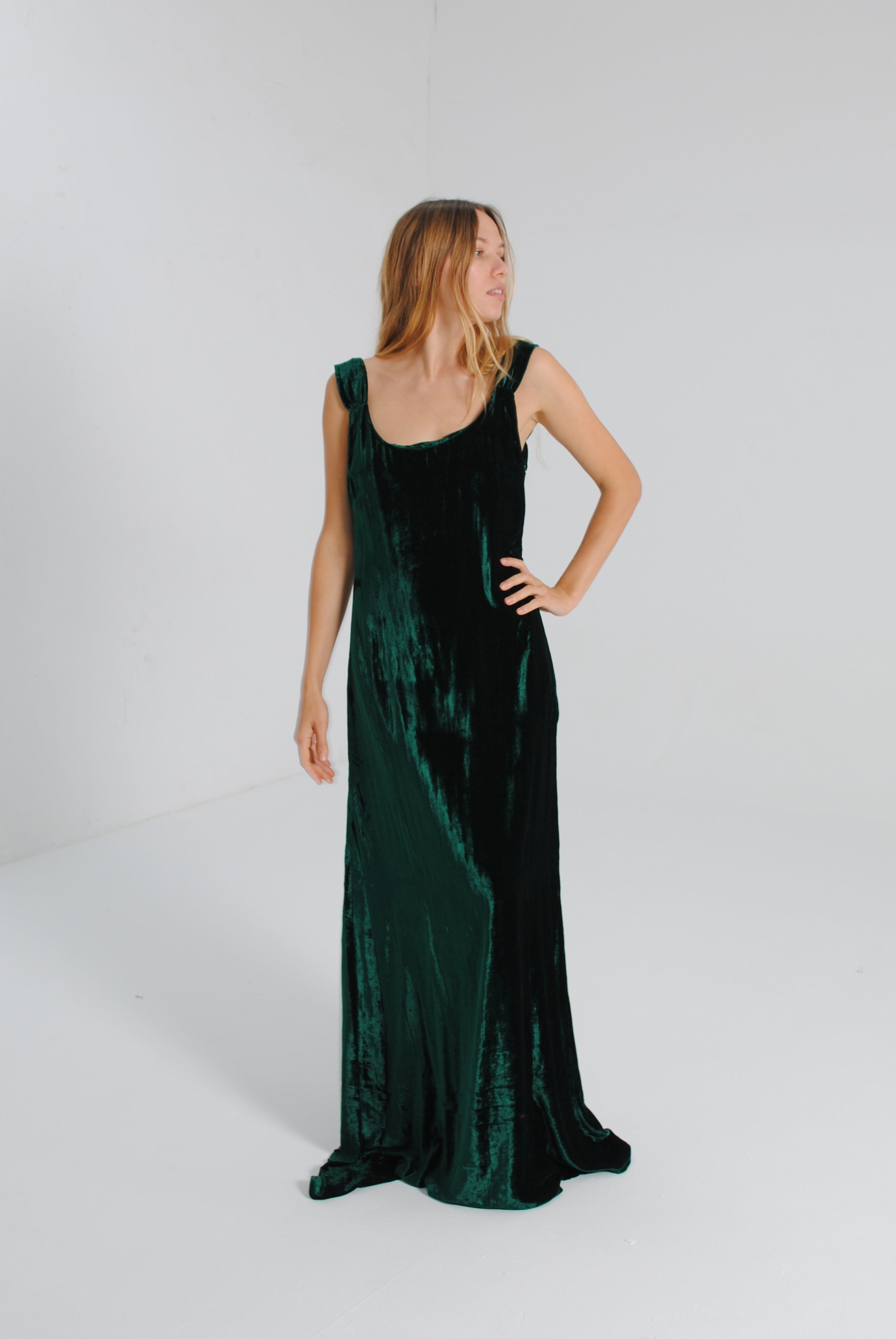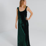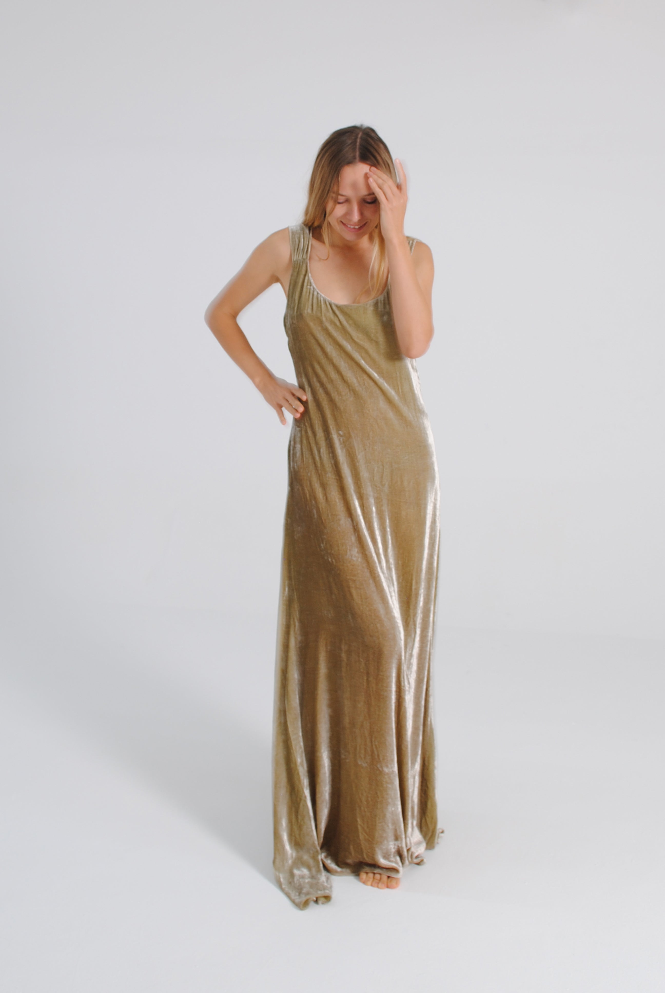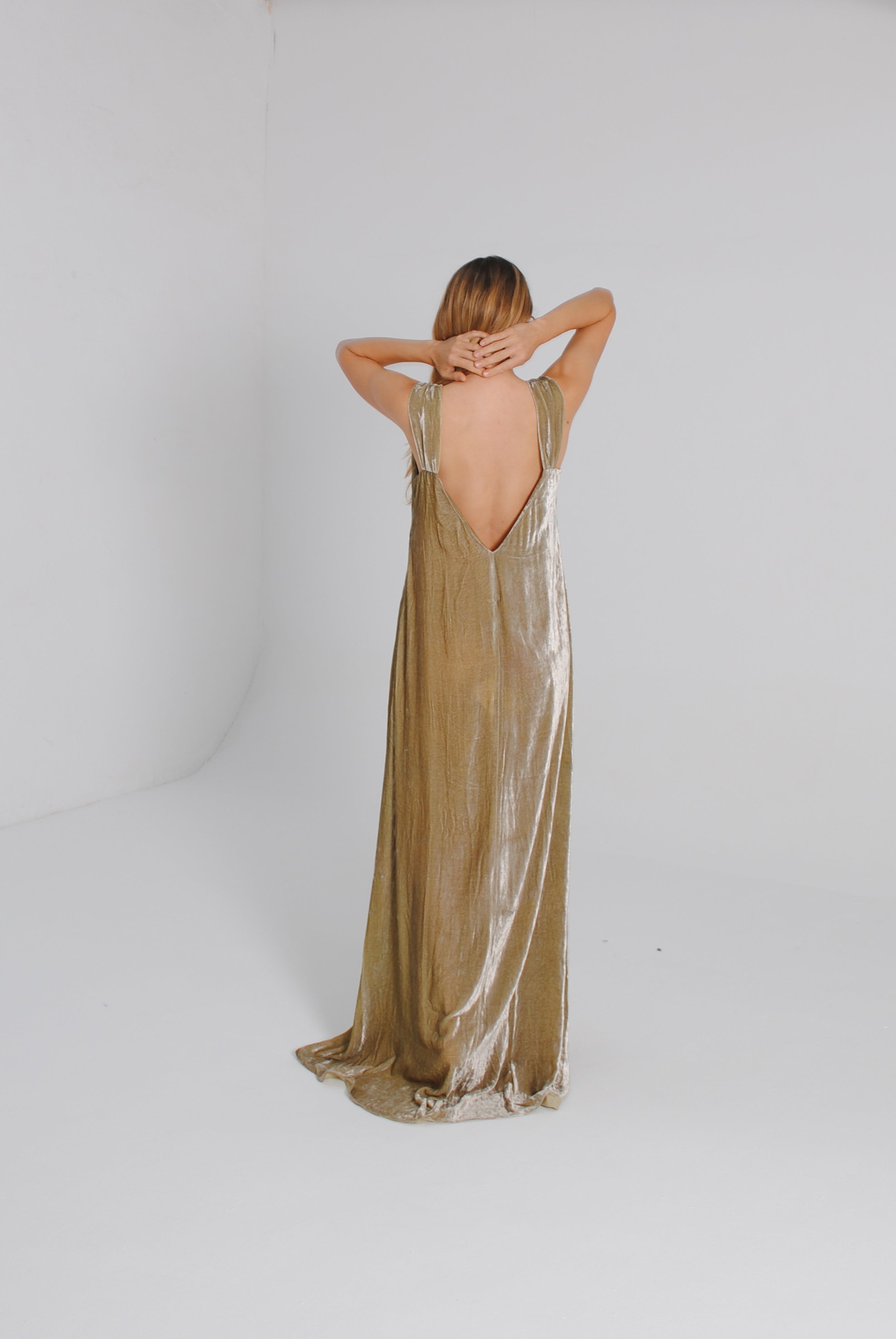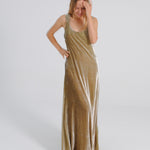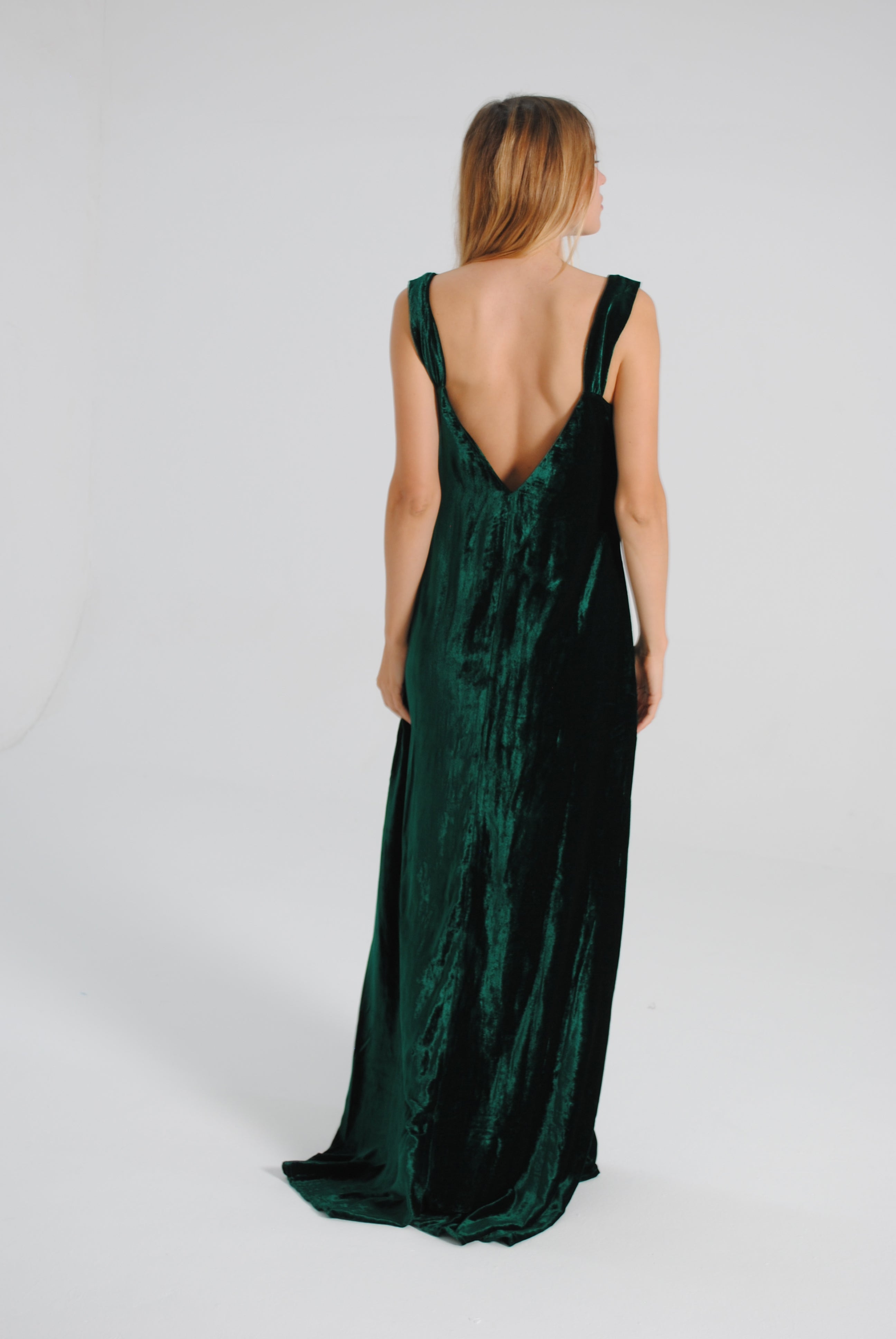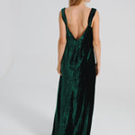 Vestido largo de terciopelo con tirantes anchos y detalle fruncido. Escote pronunciado en la espalda en forma de uve.
