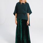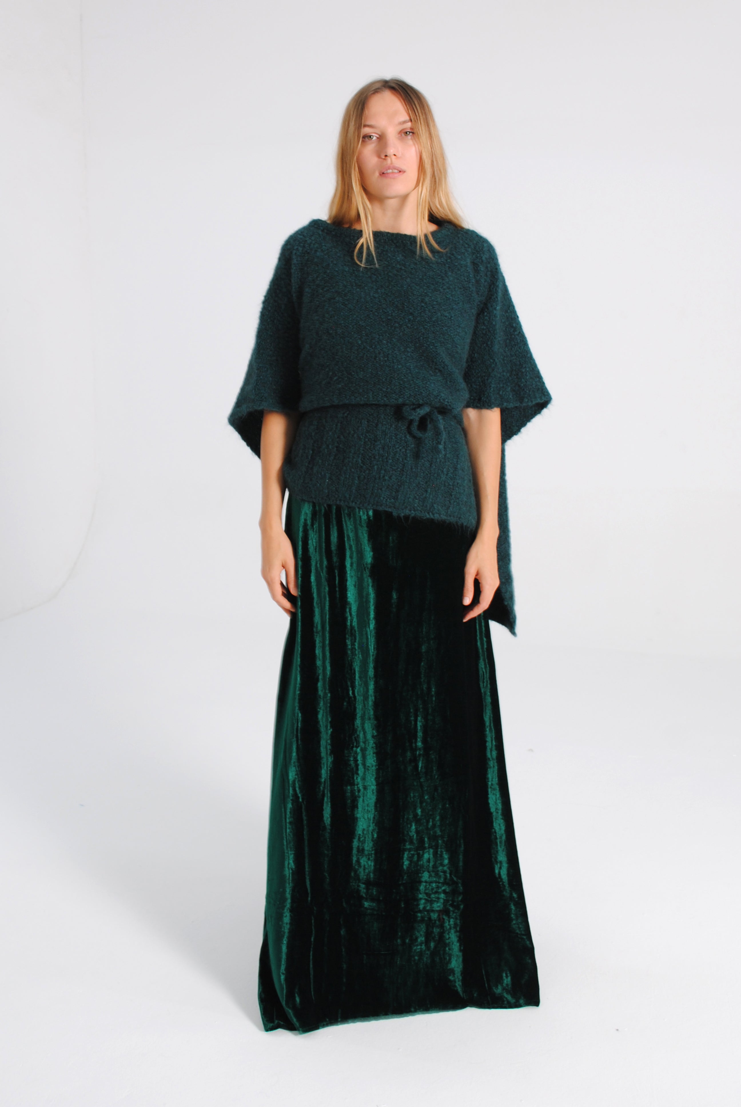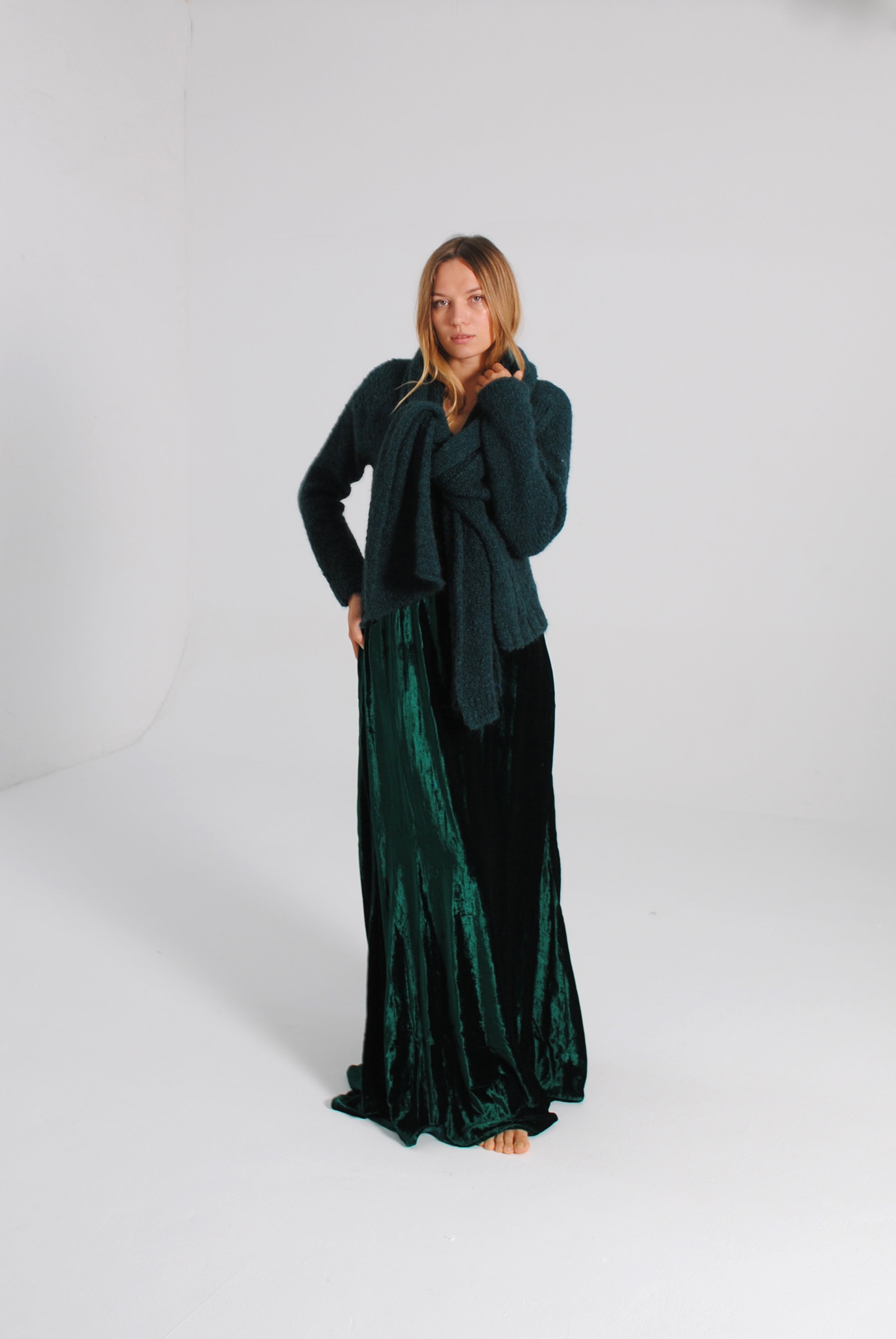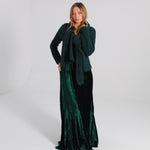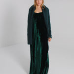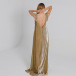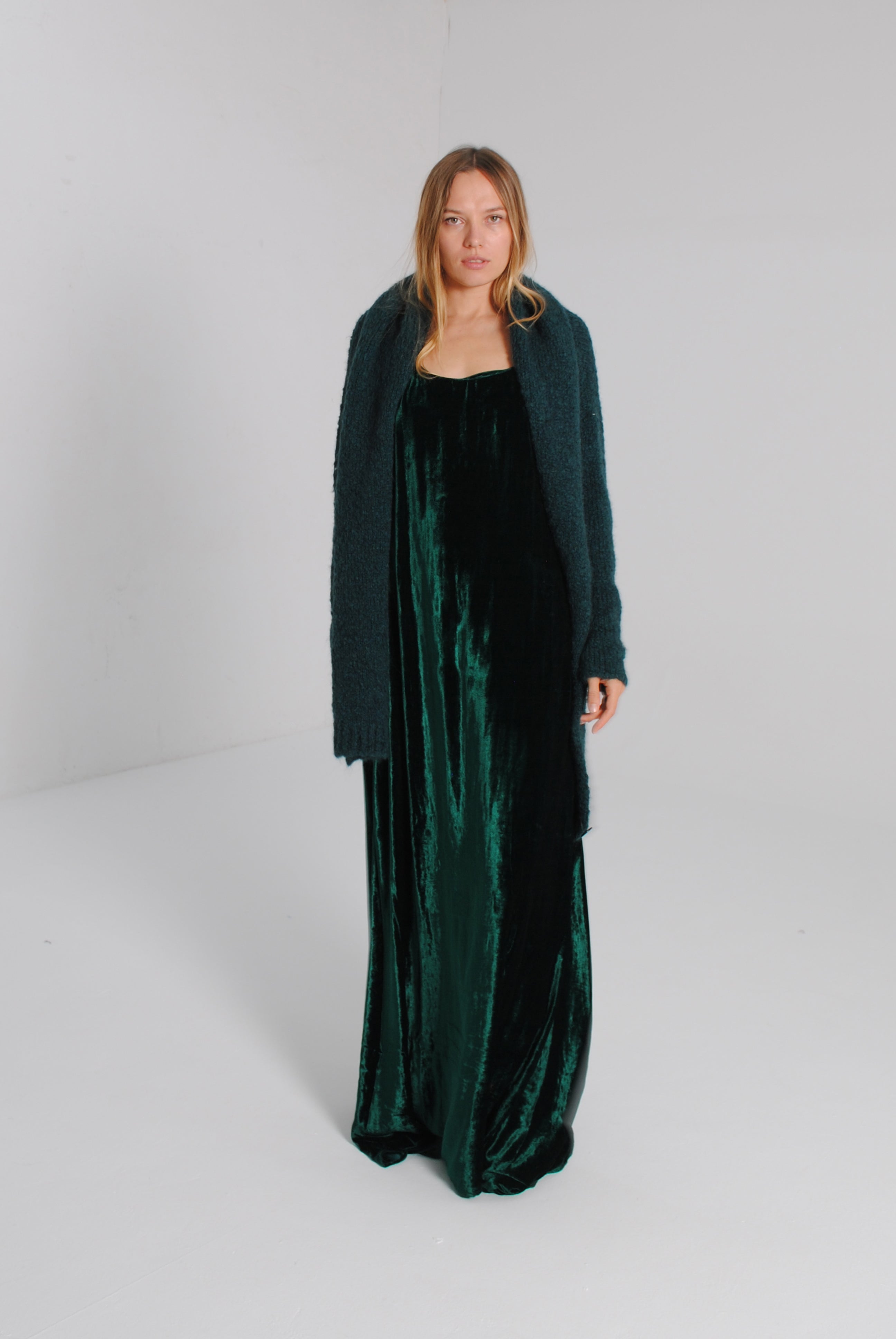 Vestido largo de terciopelo con tirantes anchos y detalle fruncido. Escote pronunciado en la espalda en forma de uve.