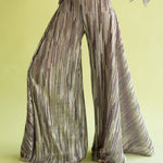 Pantalón de talle alto y pernera ancha, tipo palazzo. Confeccionado en punto plisado con lúrex, un tejido que además de ser comodísimo, tiene caída fluida y brillo. La cintura elástica hace que sea súper cómodo, y el corte estiliza un montón.