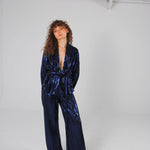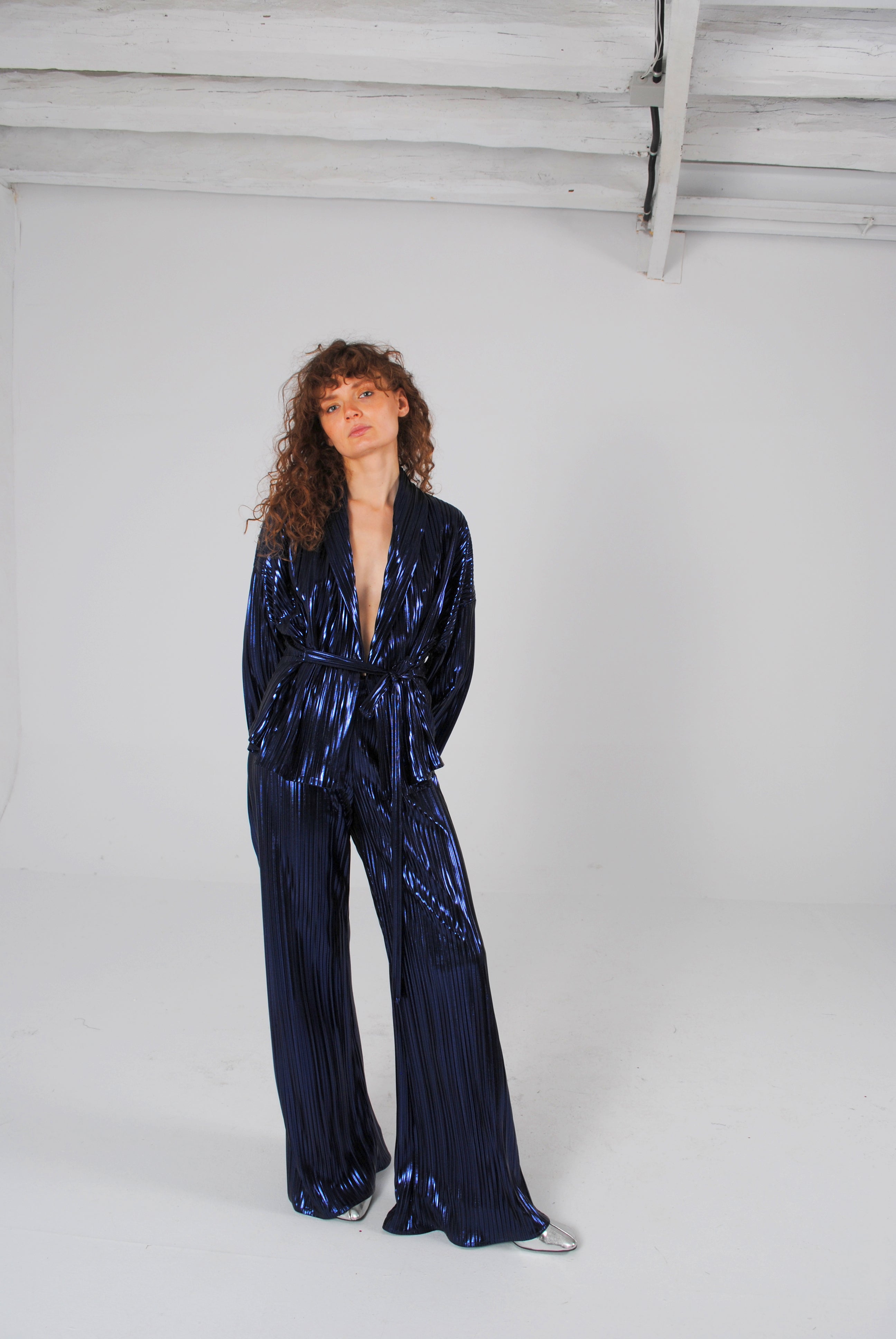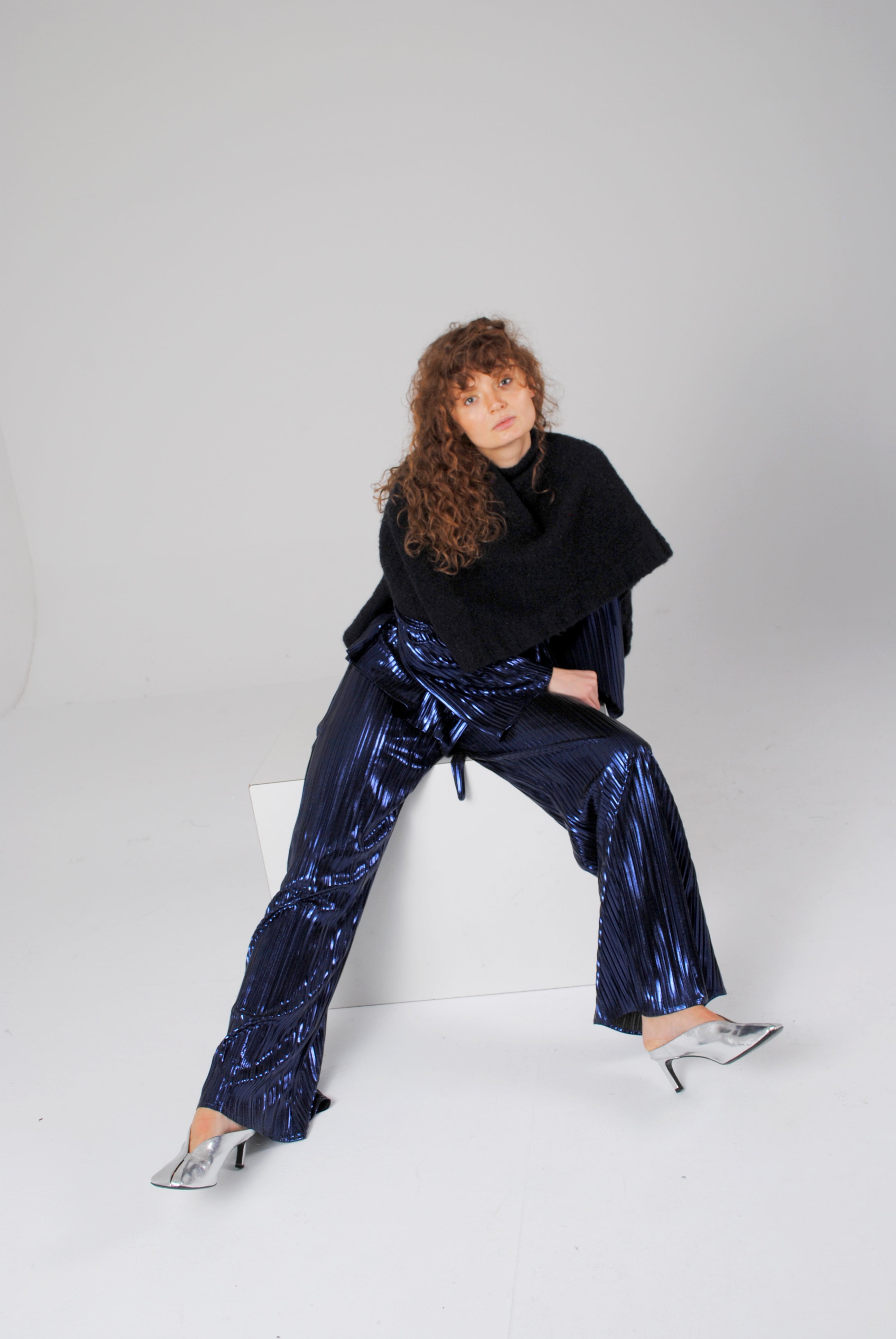 Pantalón palazzo de tejido brillante y plisado. Cierre con cremallera.