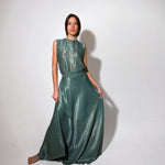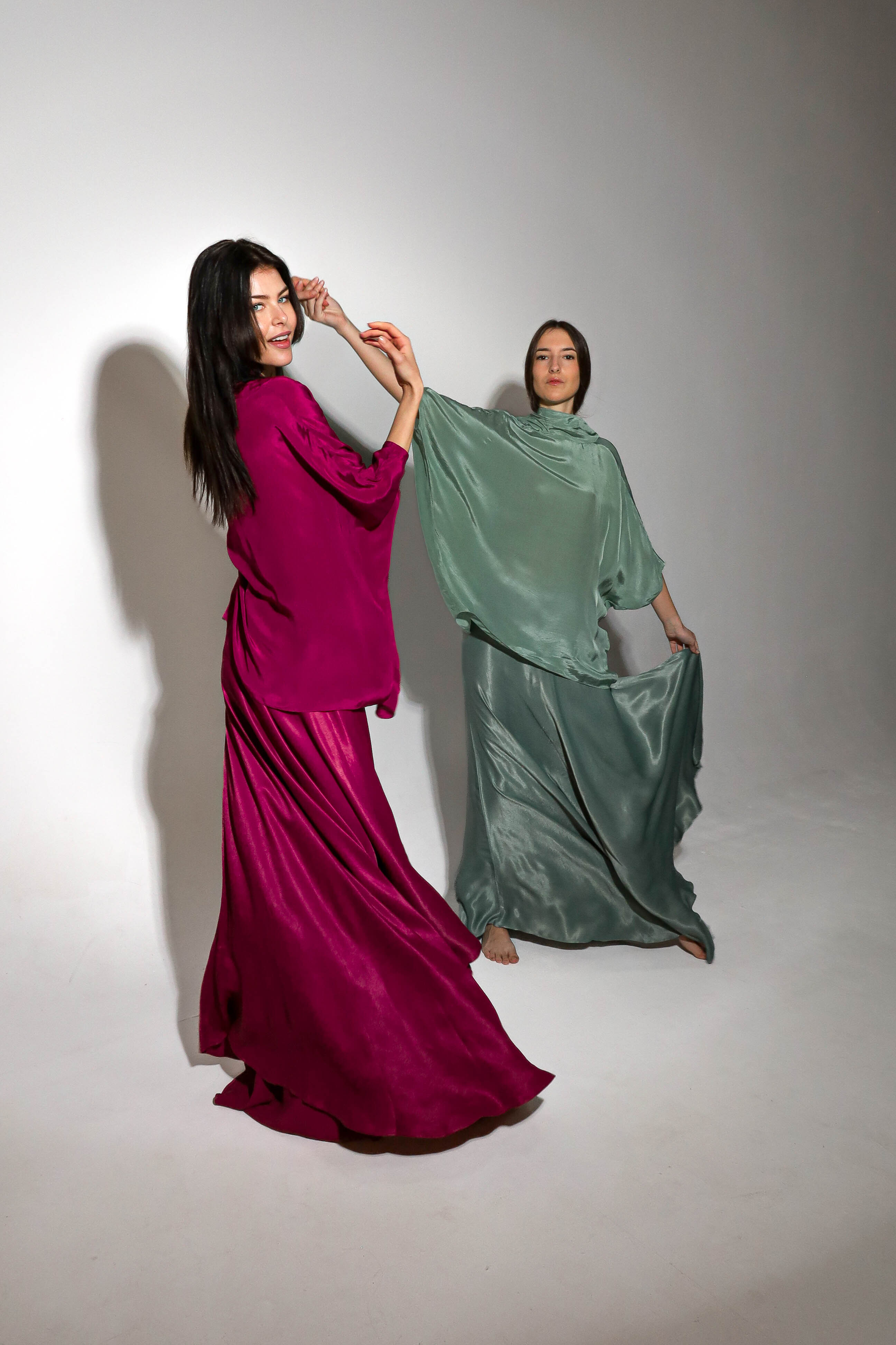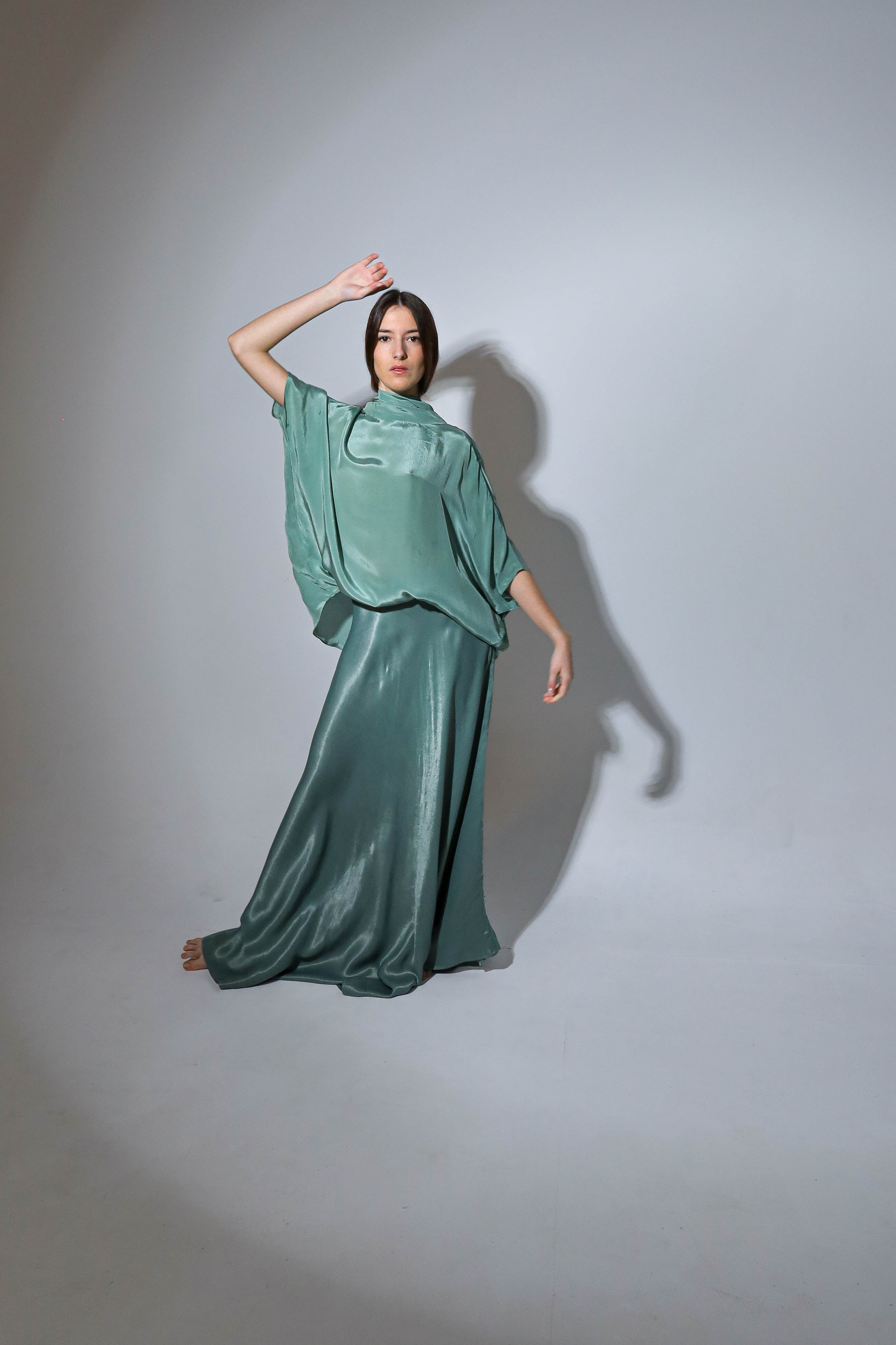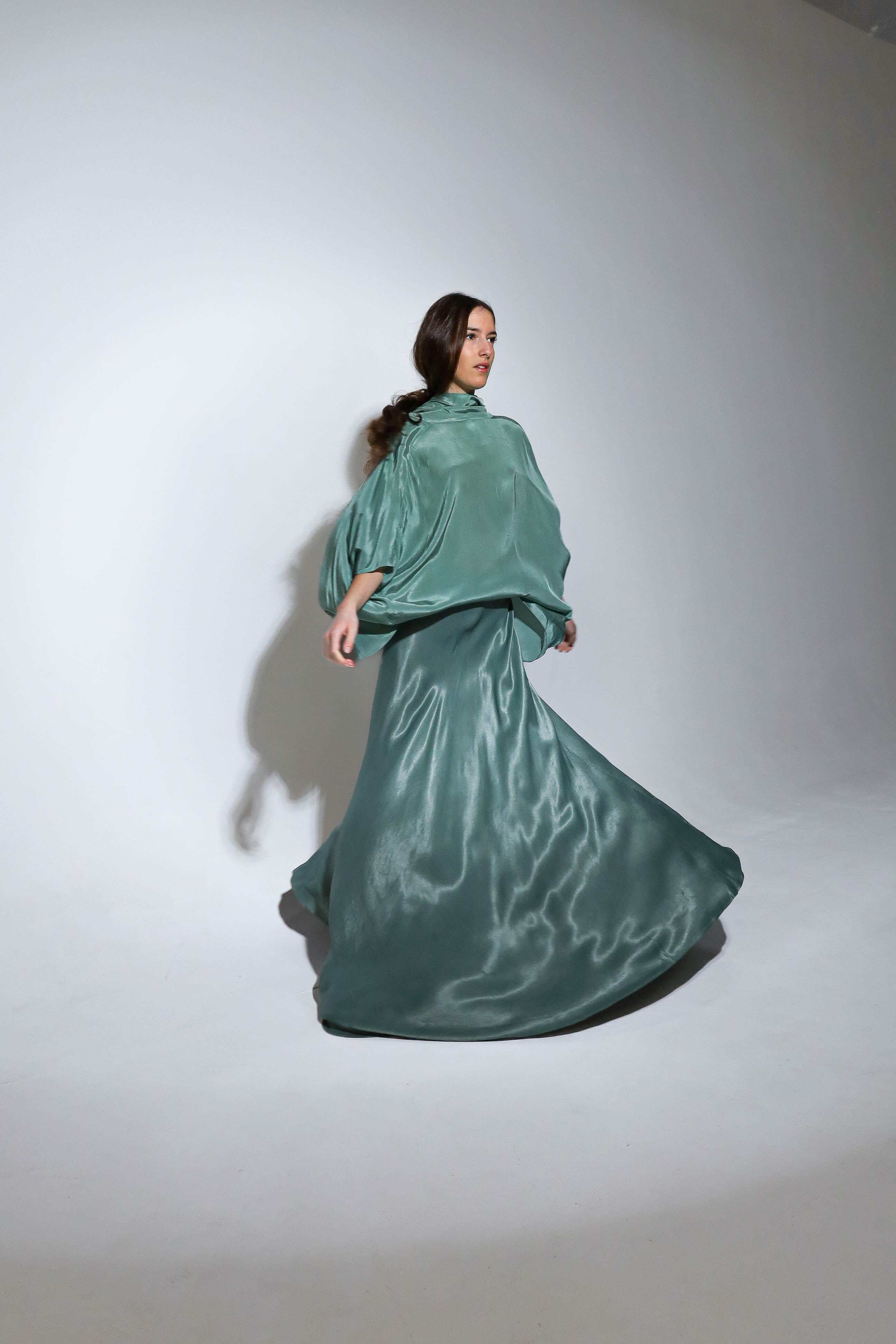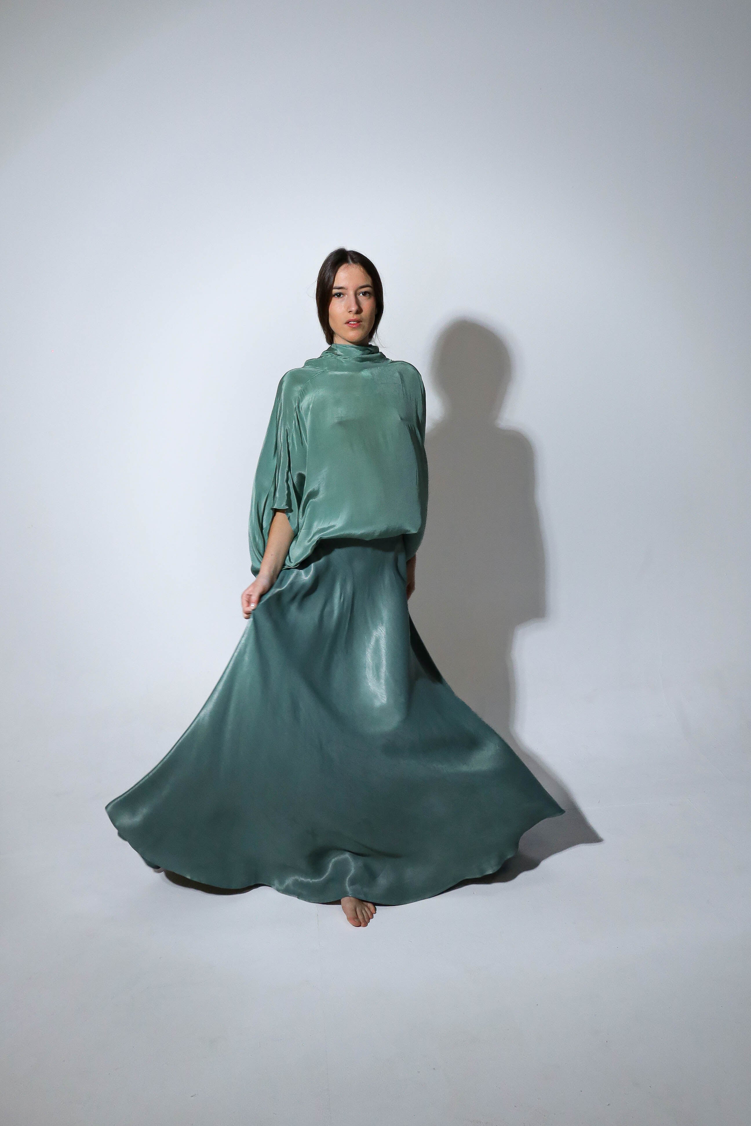 Falda larga satinada de patrón evasé y cortada al bies. De cintura alta, cierre con cremallera invisible y mucho vuelo.