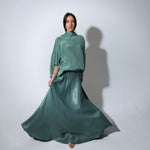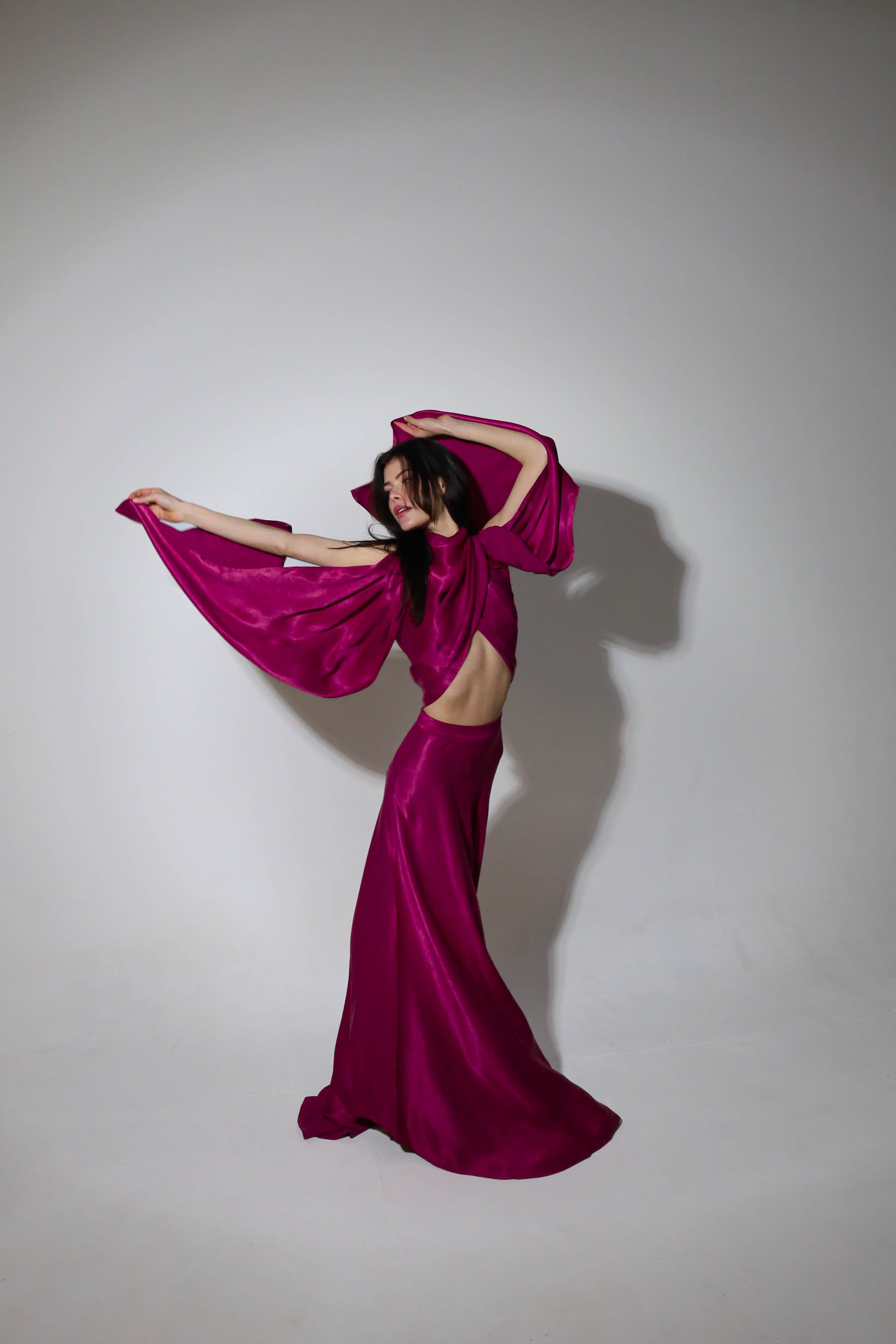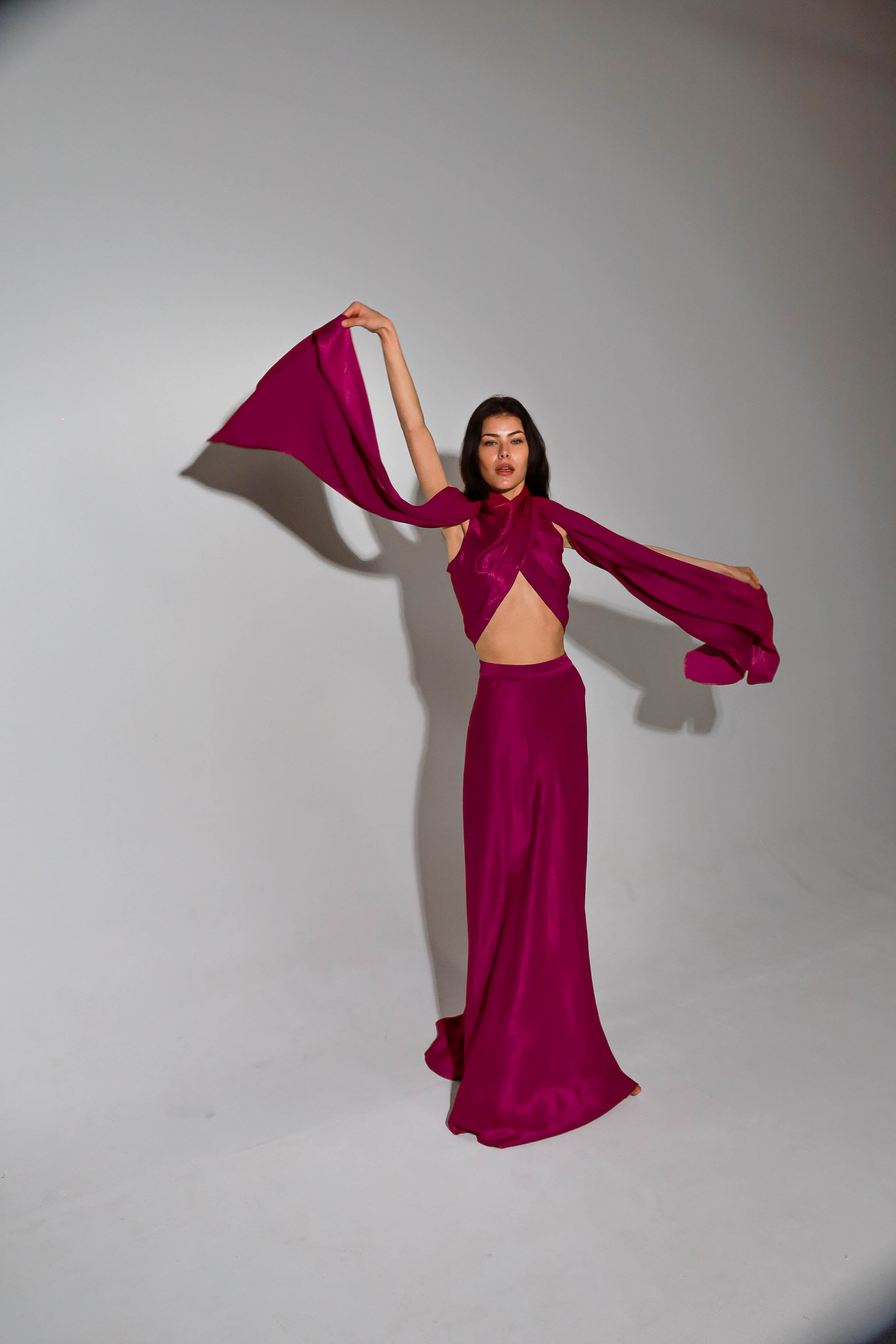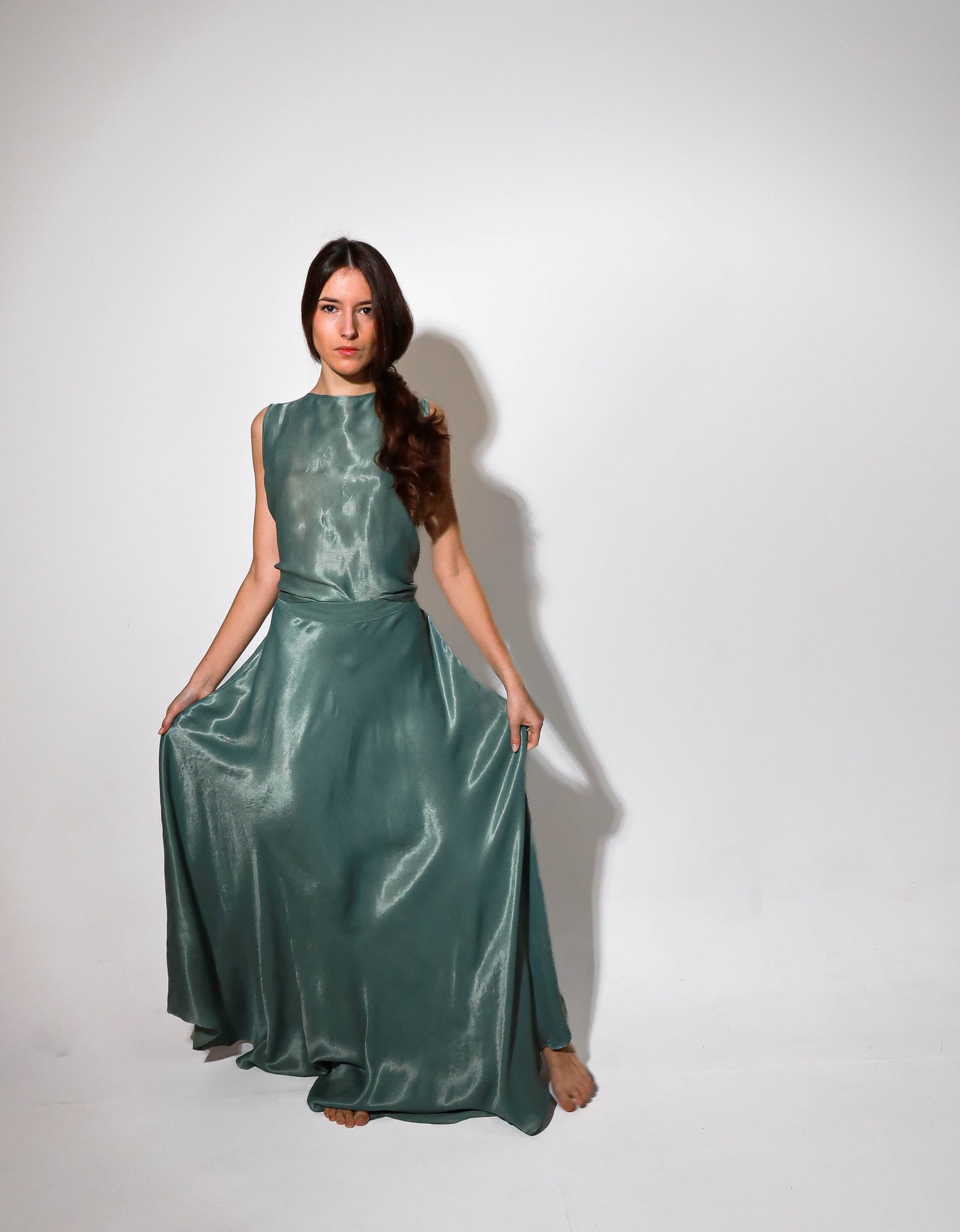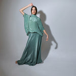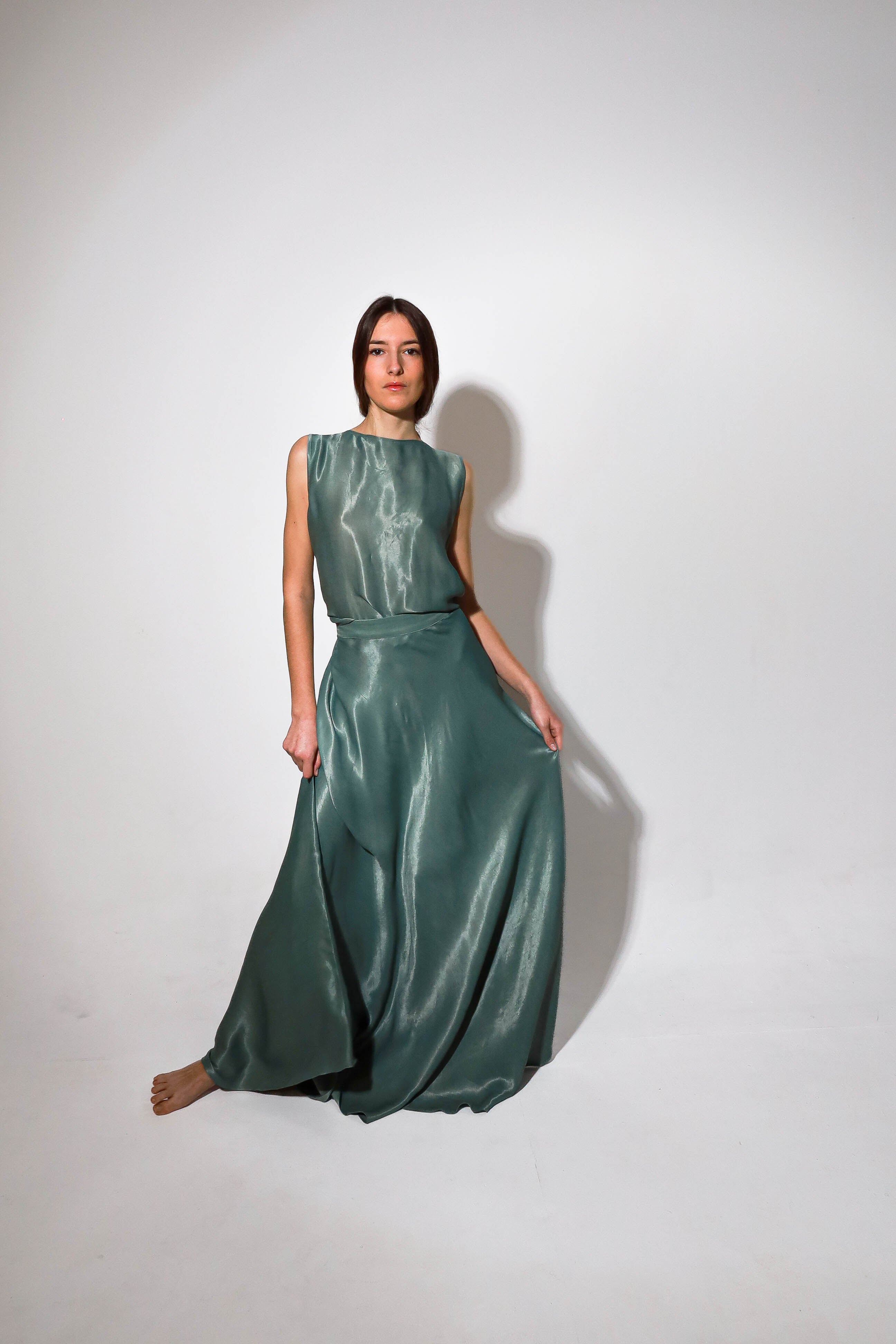 Falda larga satinada de patrón evasé y cortada al bies. De cintura alta, cierre con cremallera invisible y mucho vuelo.
