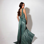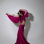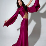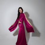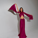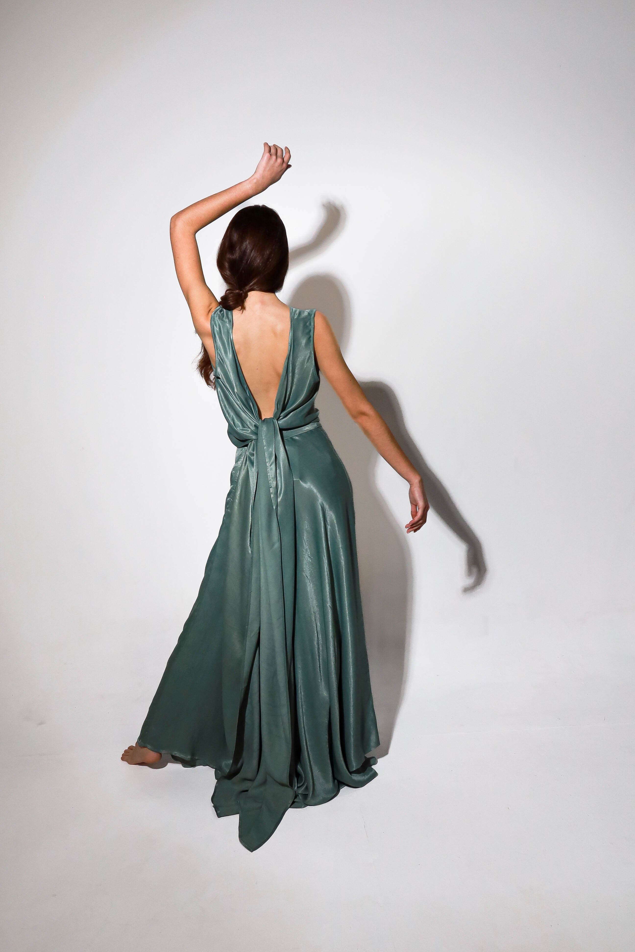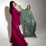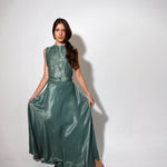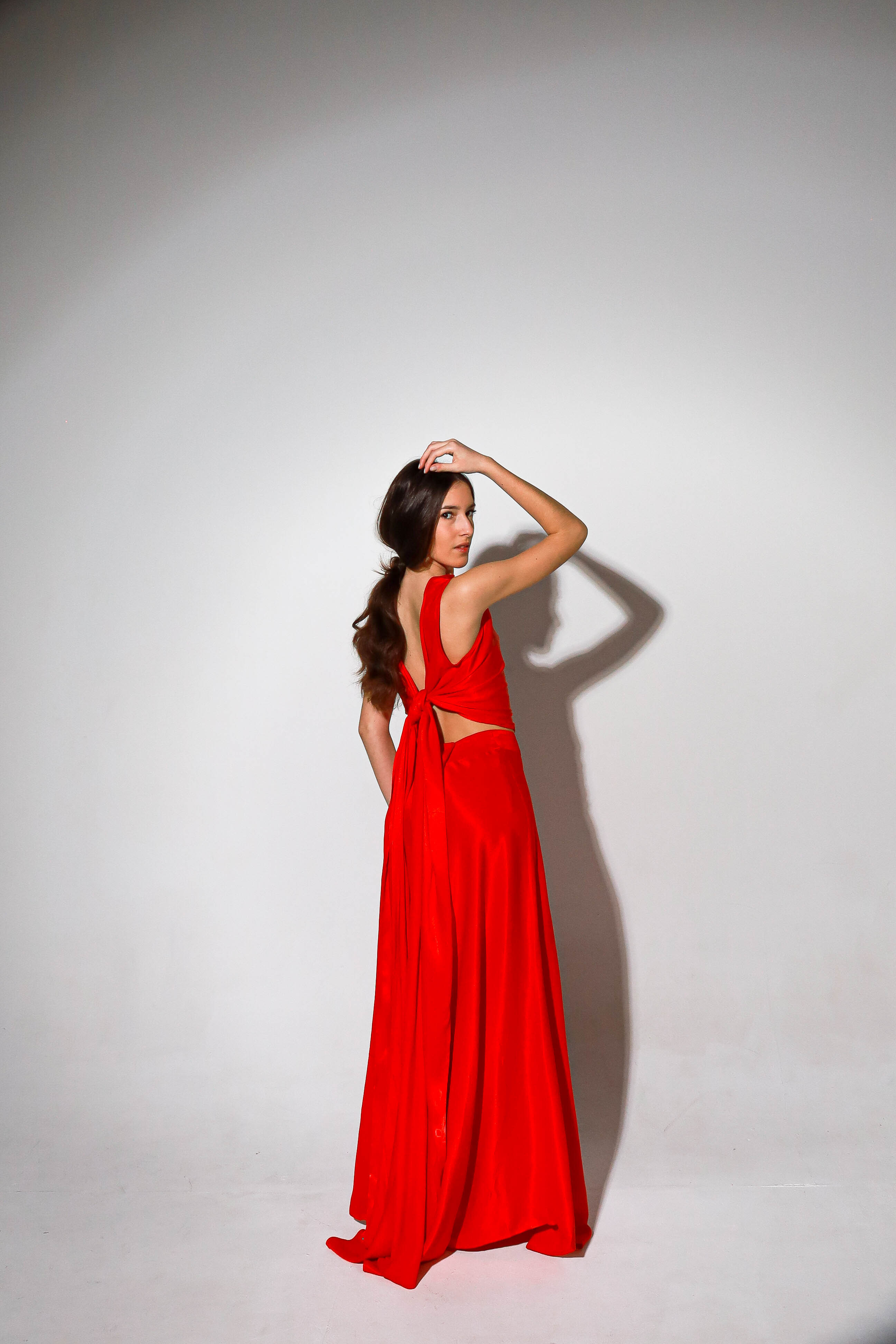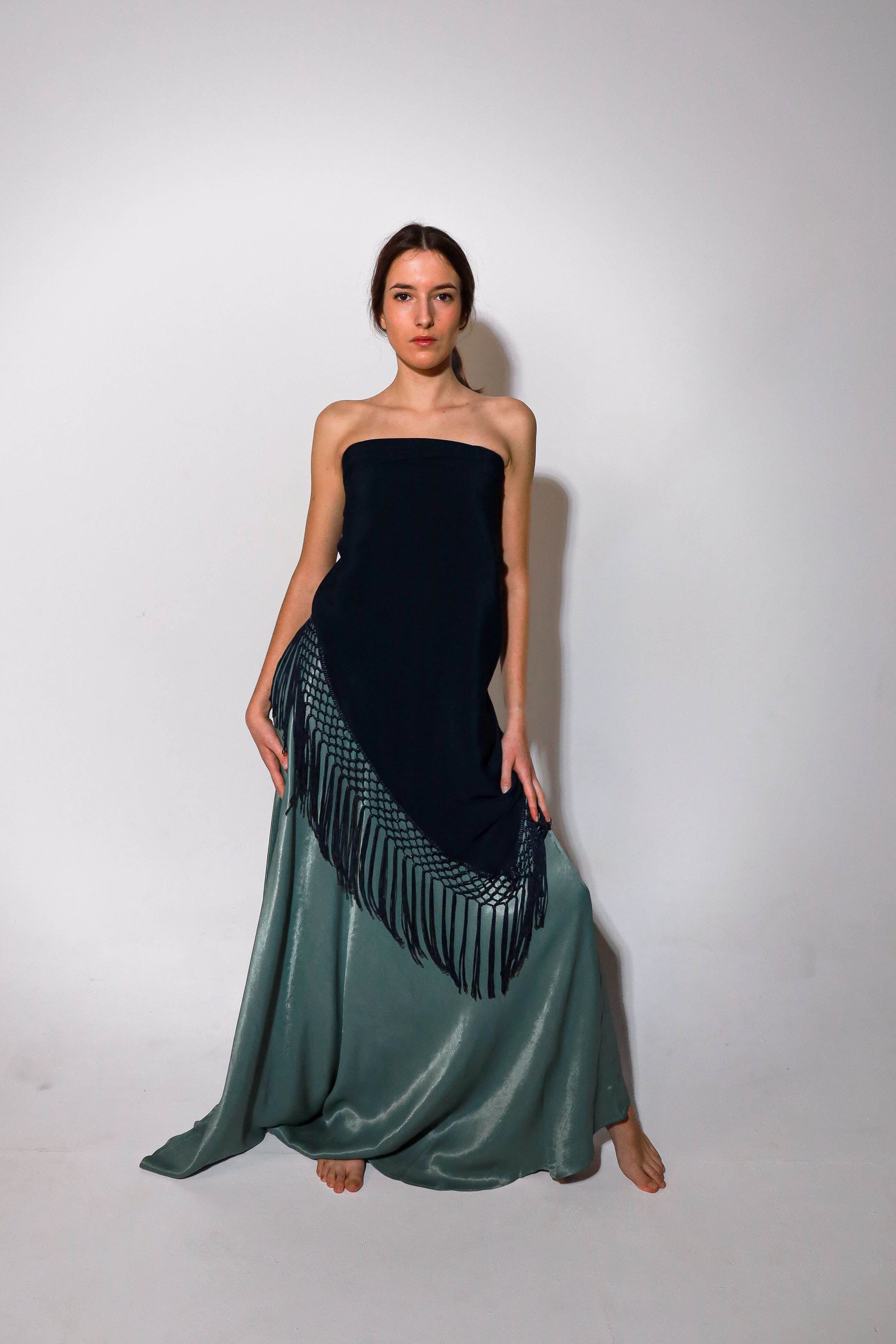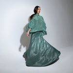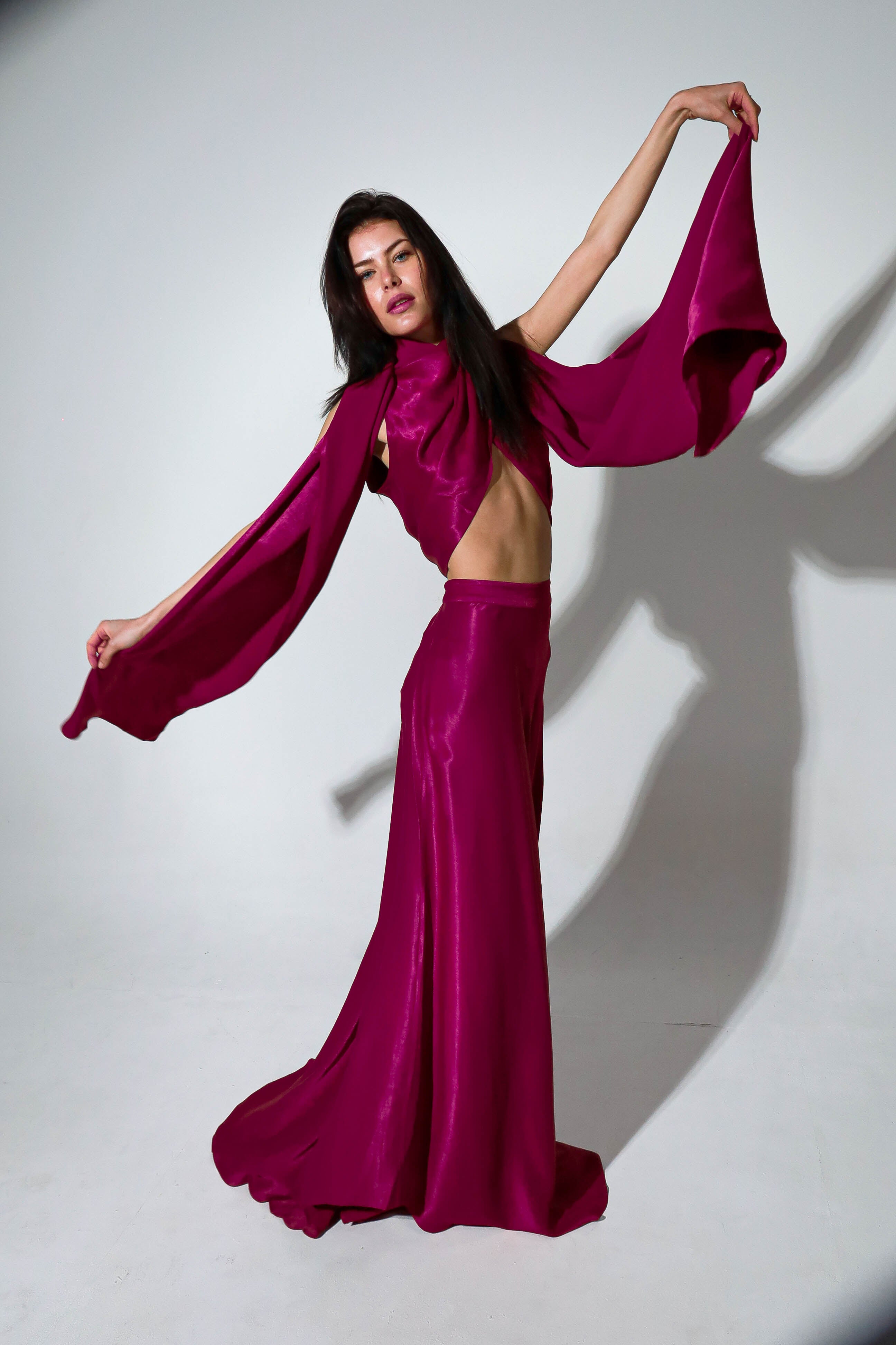 Falda larga satinada de patrón evasé y cortada al bies. De cintura alta, cierre con cremallera invisible y mucho vuelo.