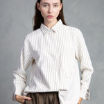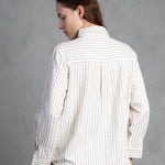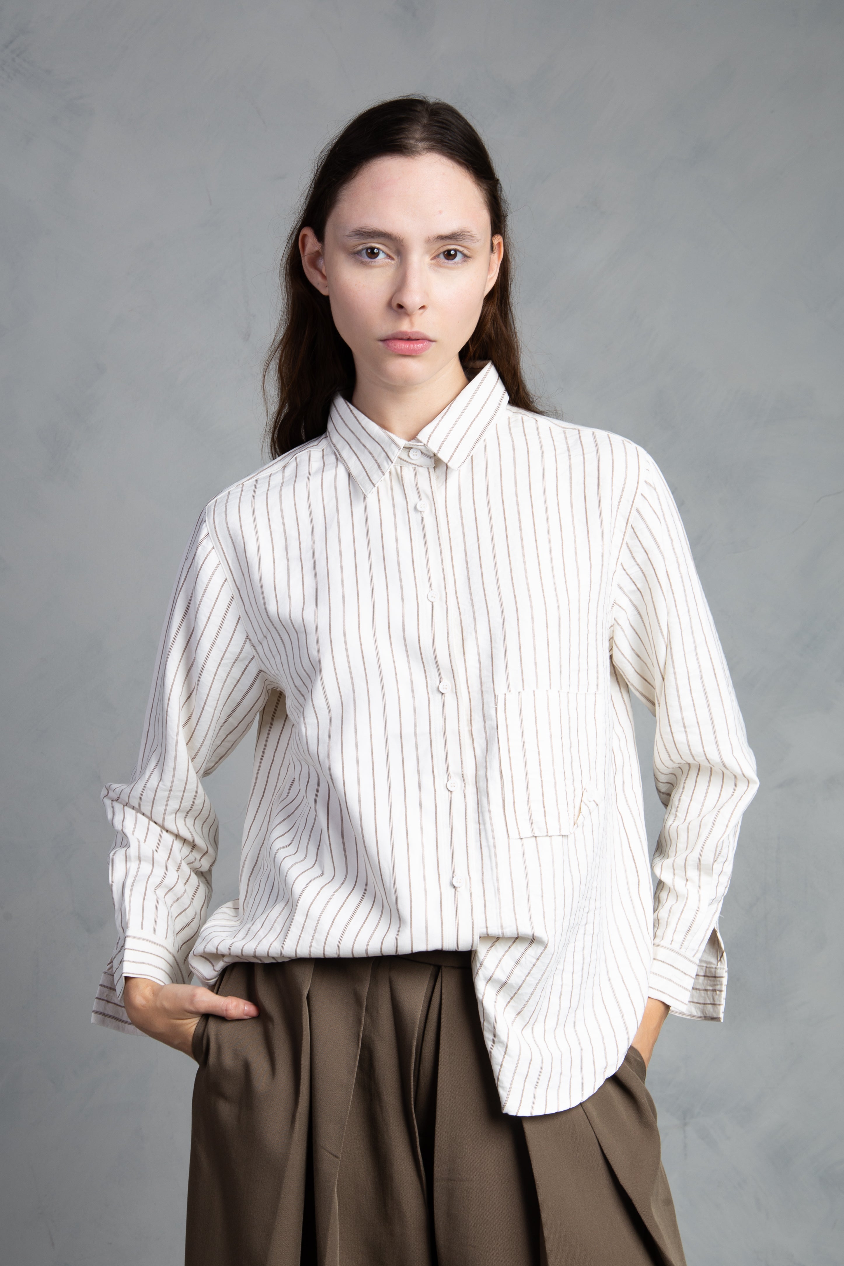 Camisa de rayas, cuello camisero y manga larga. Cierre frontal con botones y bolsillo frontal.