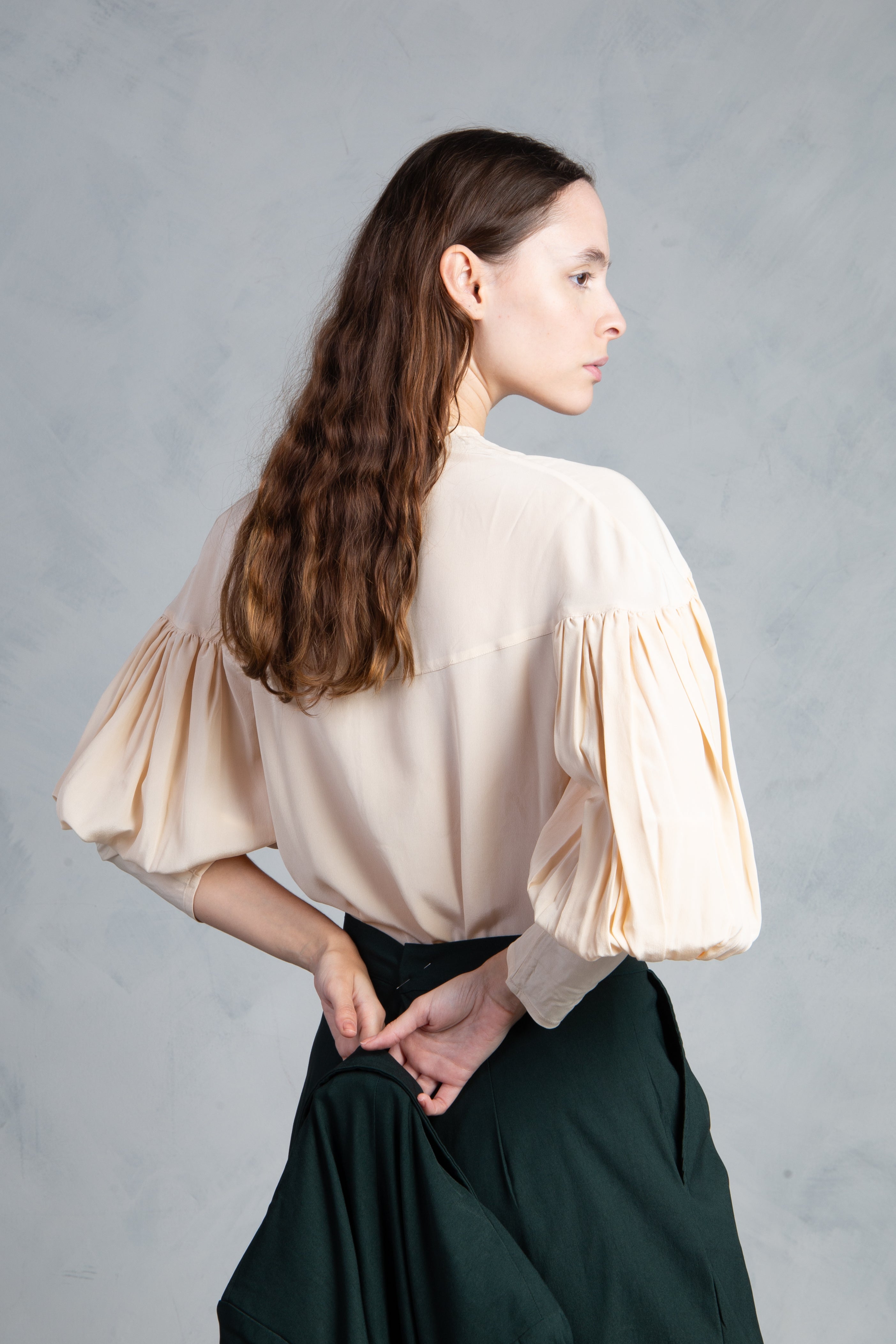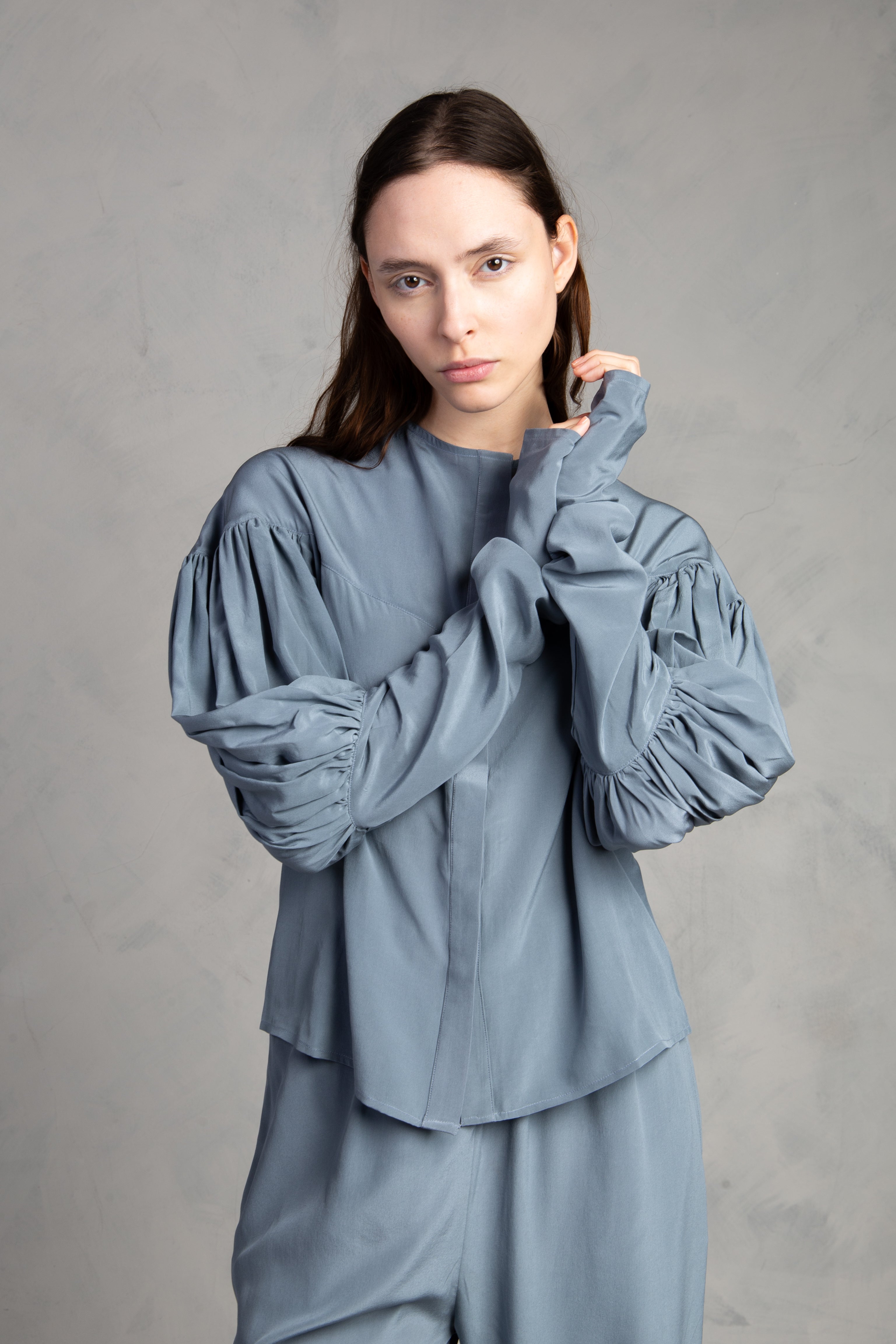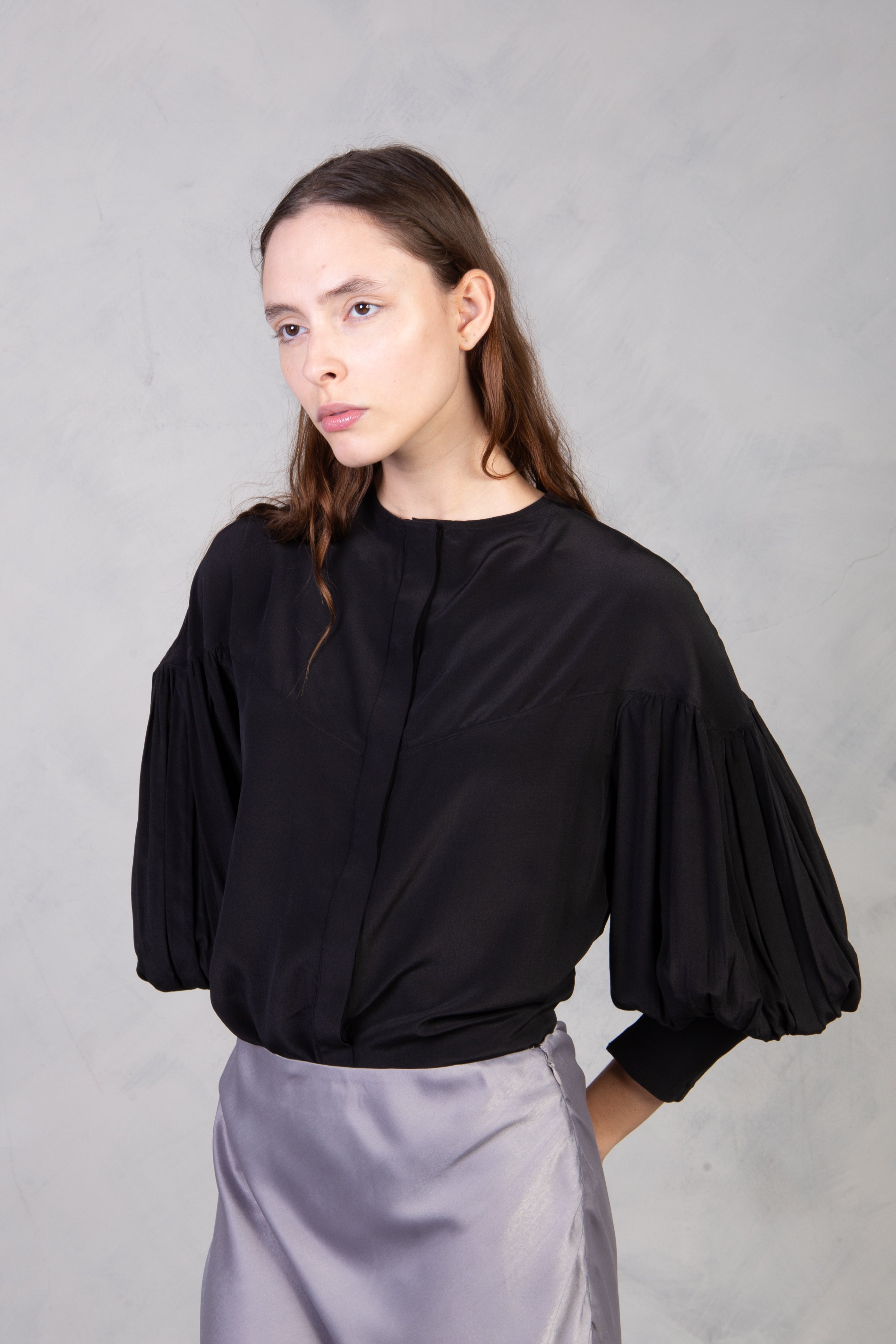 Camisa fluida con cuello redondo, manga bombacha plisada con acabado inferior con puño ajustado y cierre mediante botonadura frontal invisible.