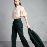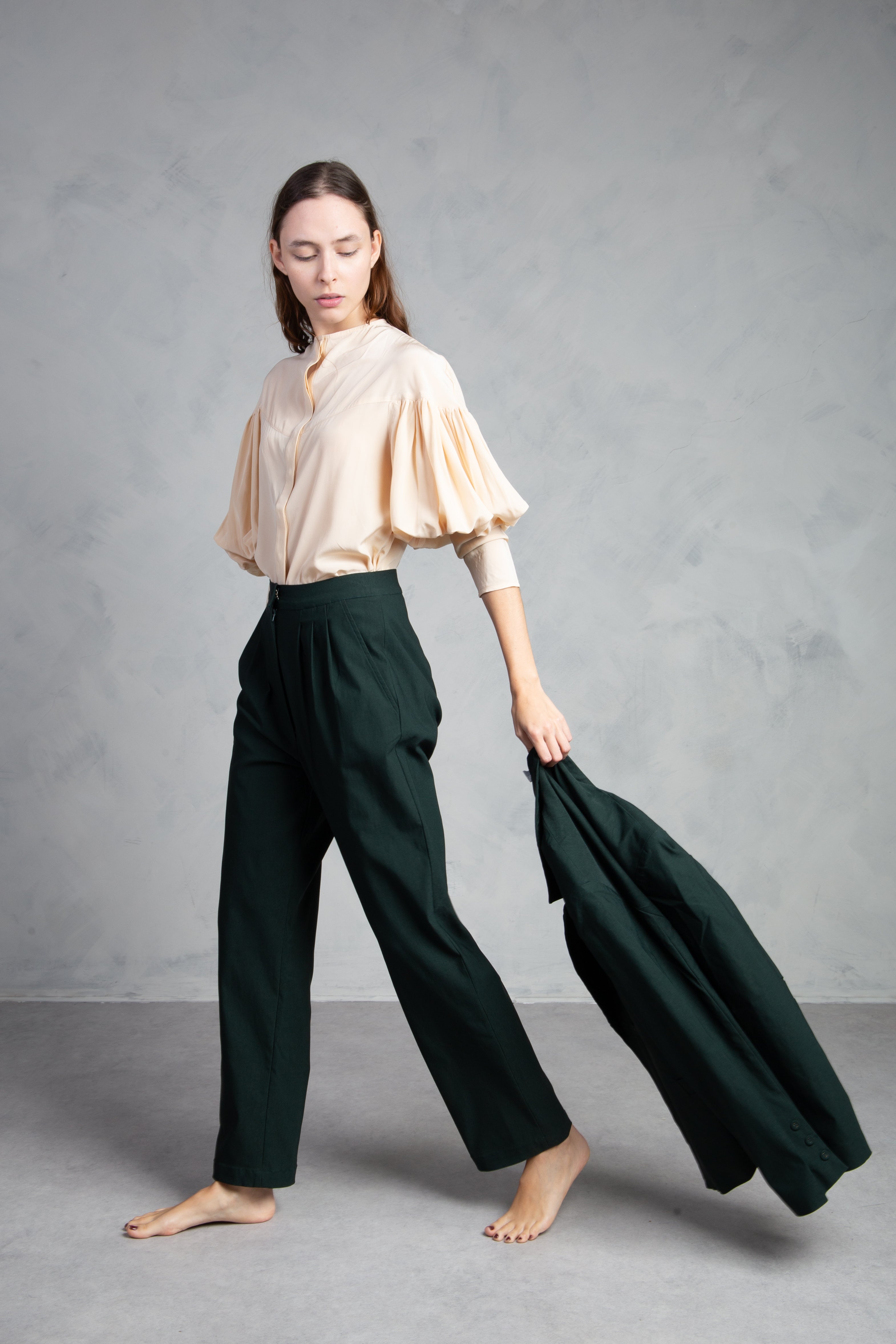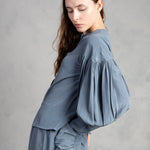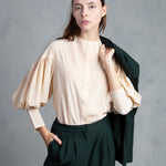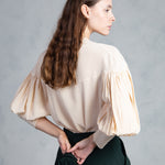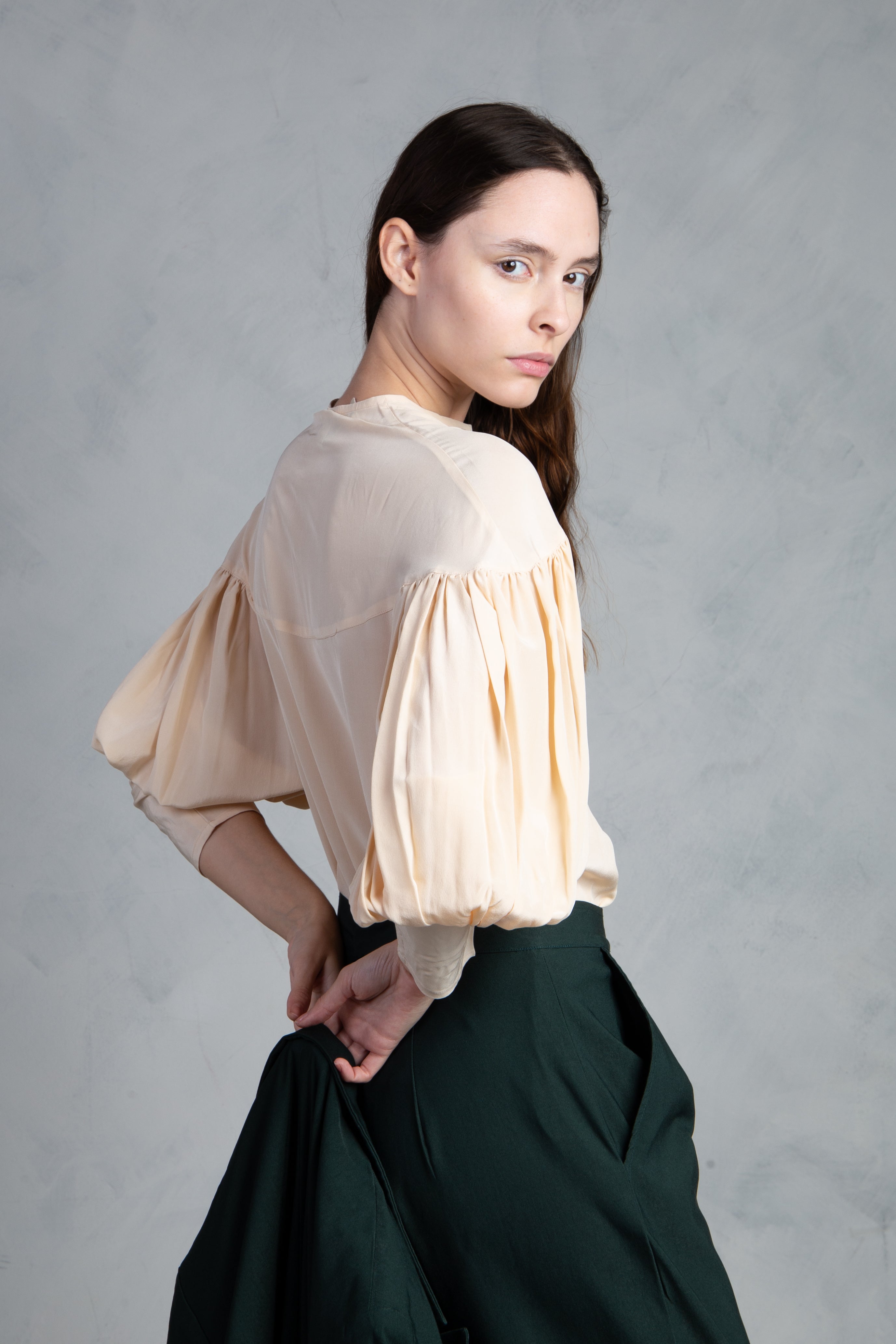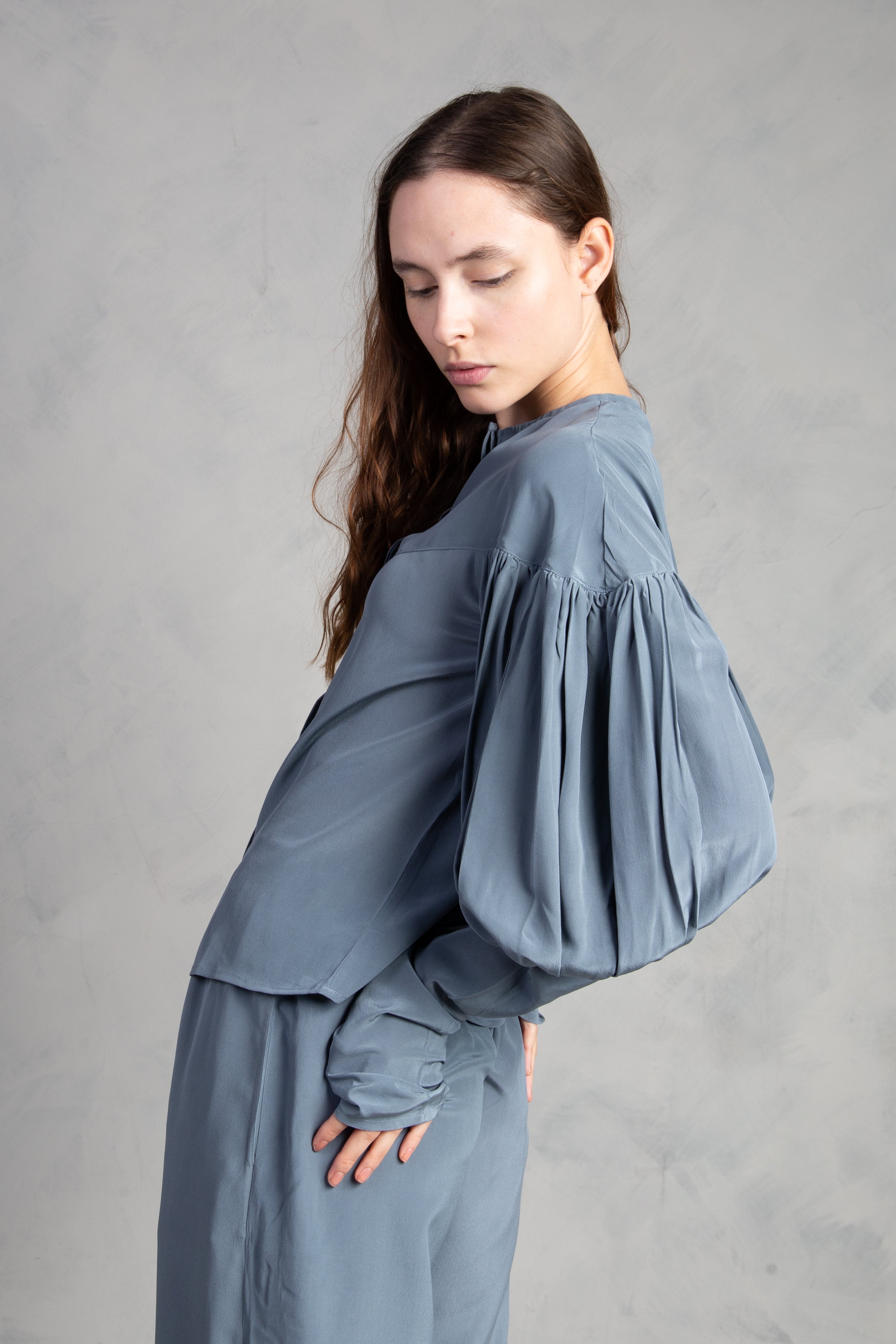 Camisa fluida con cuello redondo, manga bombacha plisada con acabado inferior con puño ajustado y cierre mediante botonadura frontal invisible.
