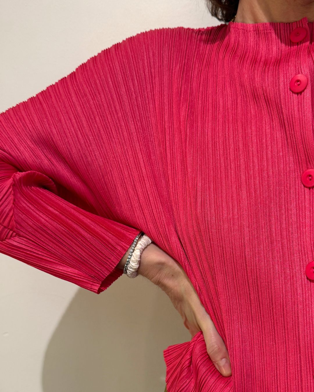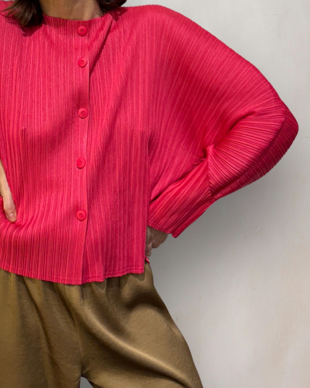 Top plisado de cuello redondo y manga larga. Diseño con cierre de botonadura frontal revestida a tono y silueta arquitectónica con corte en la manga que aporta movimiento.