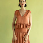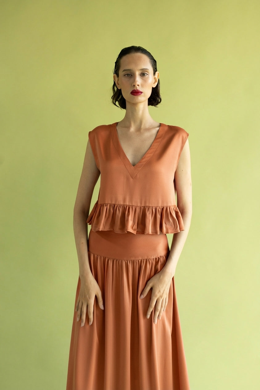 Top de crep satén que destaca por su feminidad y movimiento gracias a los volantes en cascada que recorren el bajo del diseño. Presenta un elegante cuello que estiliza la zona del escote, aportando una sofisticación clásica que contrasta con el brillo moderno del tejido. Una pieza llena de texturas visuales, ideal para quienes buscan un diseño con volumen y un acabado luminoso y pulido.