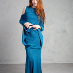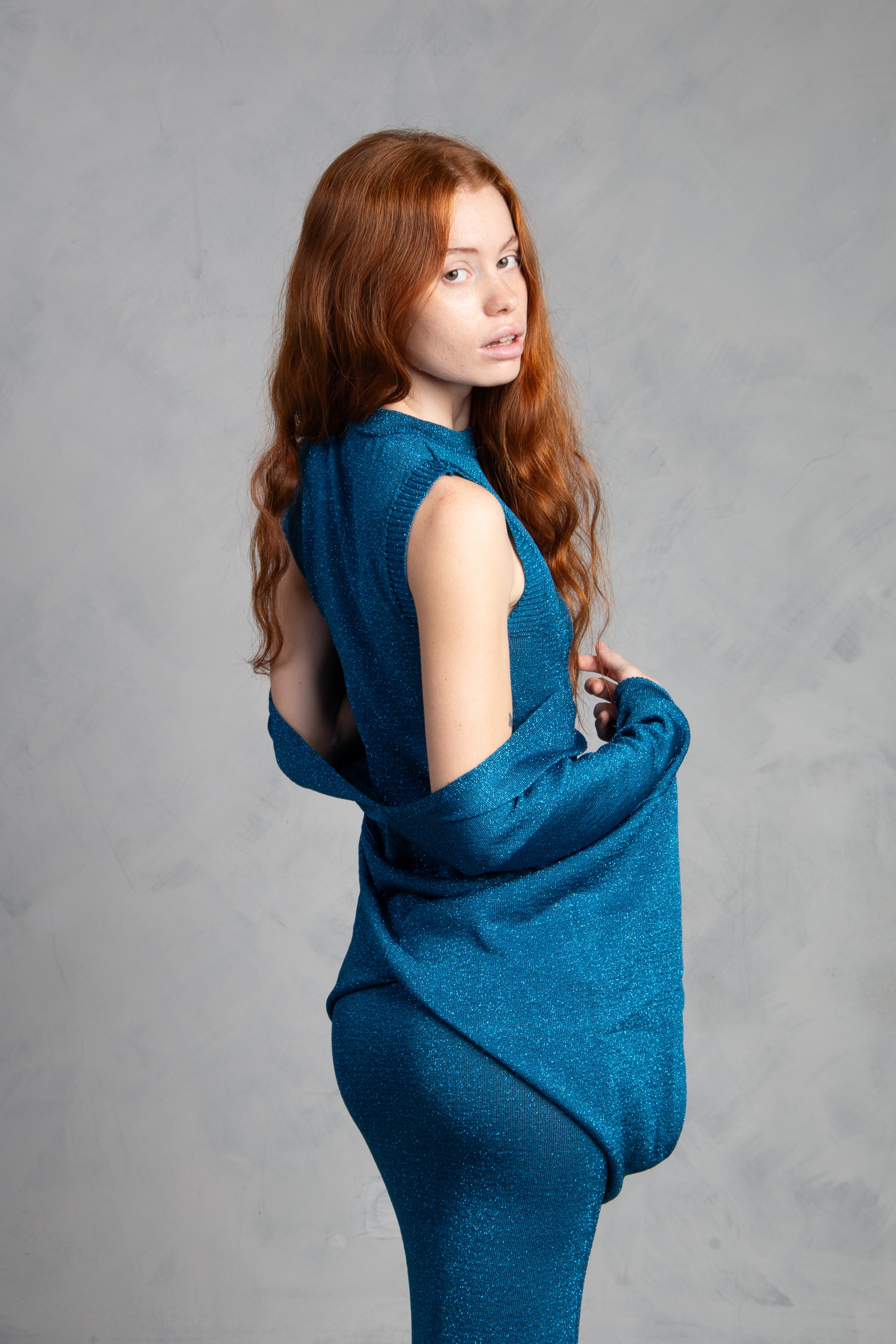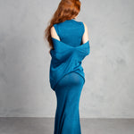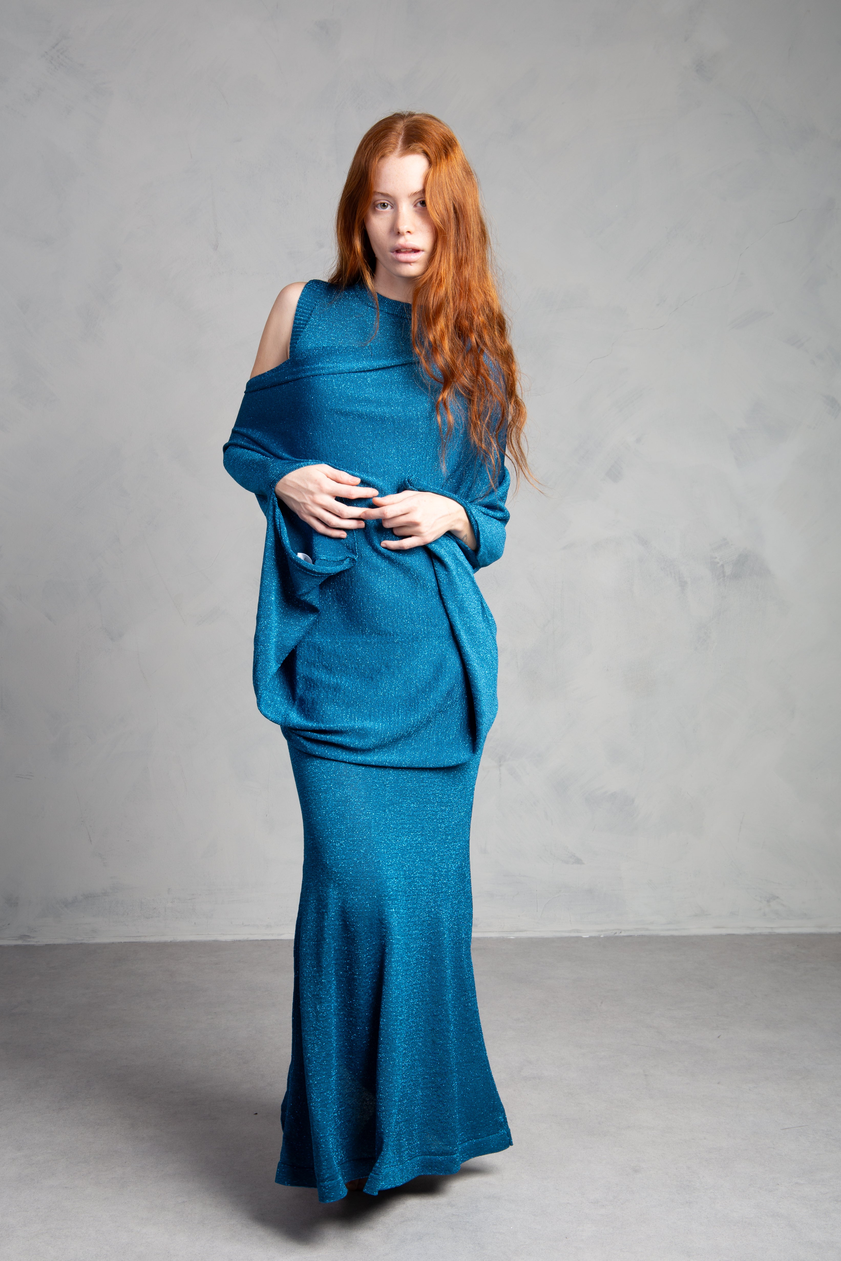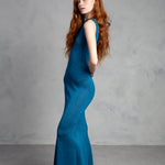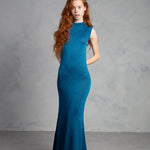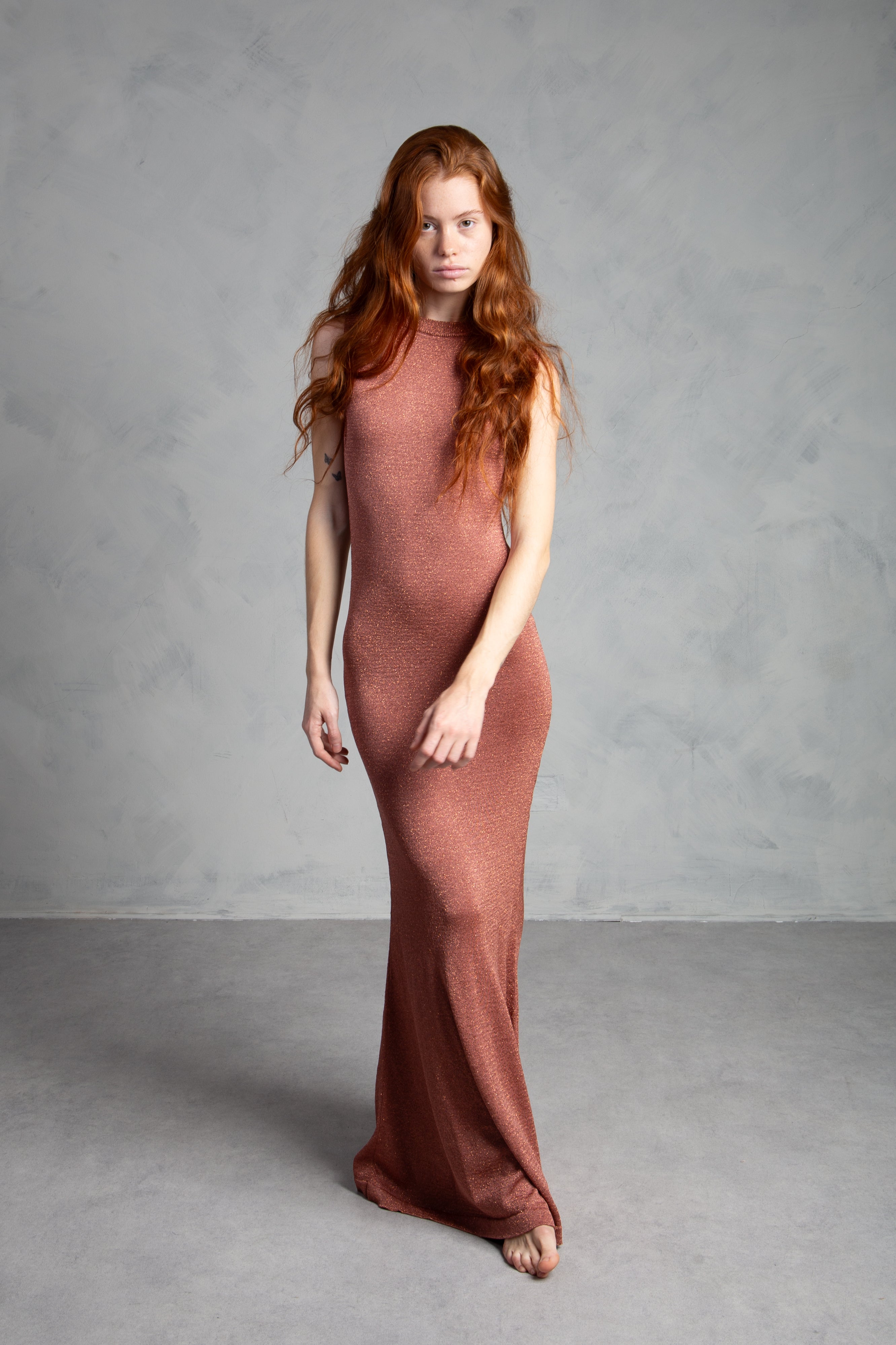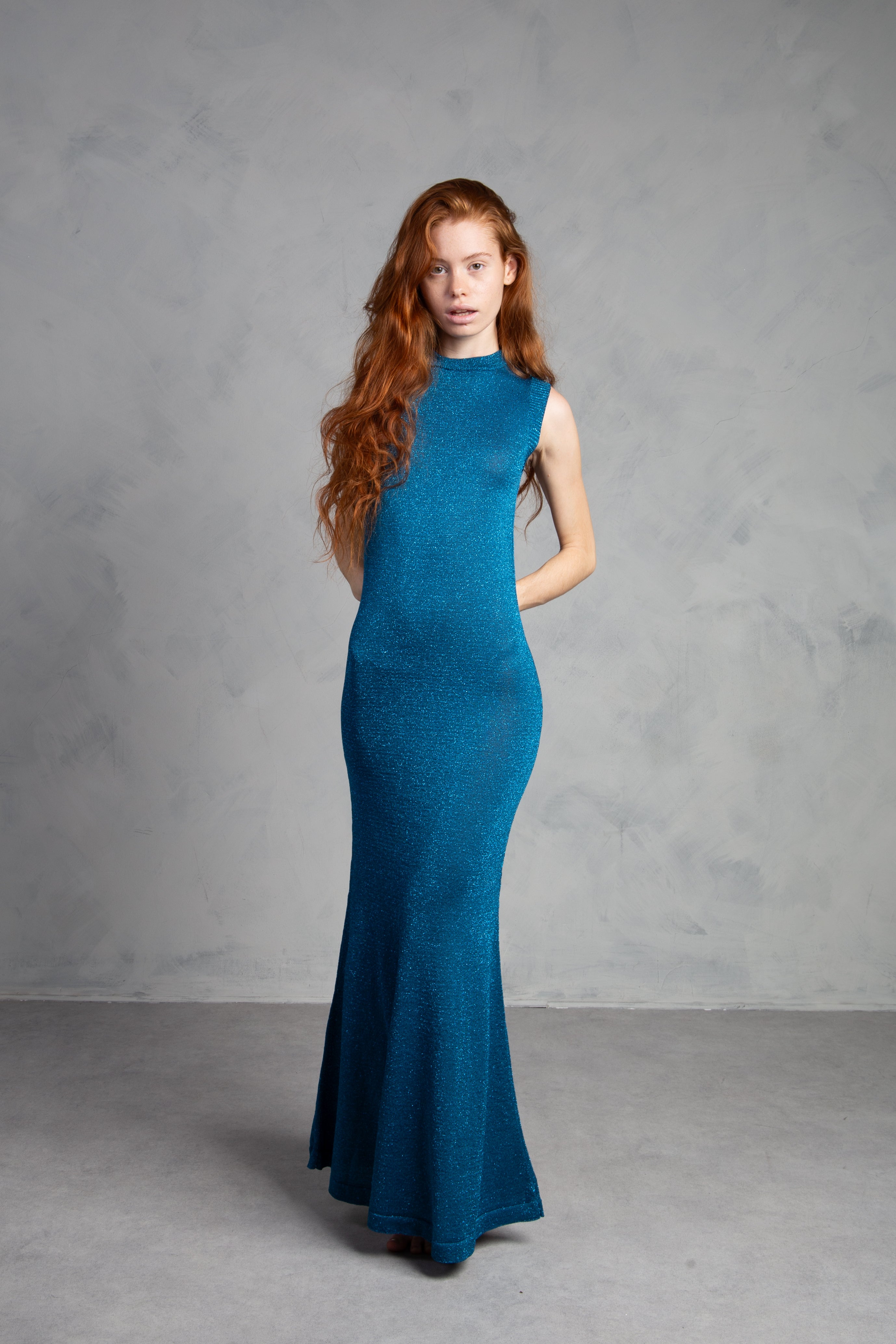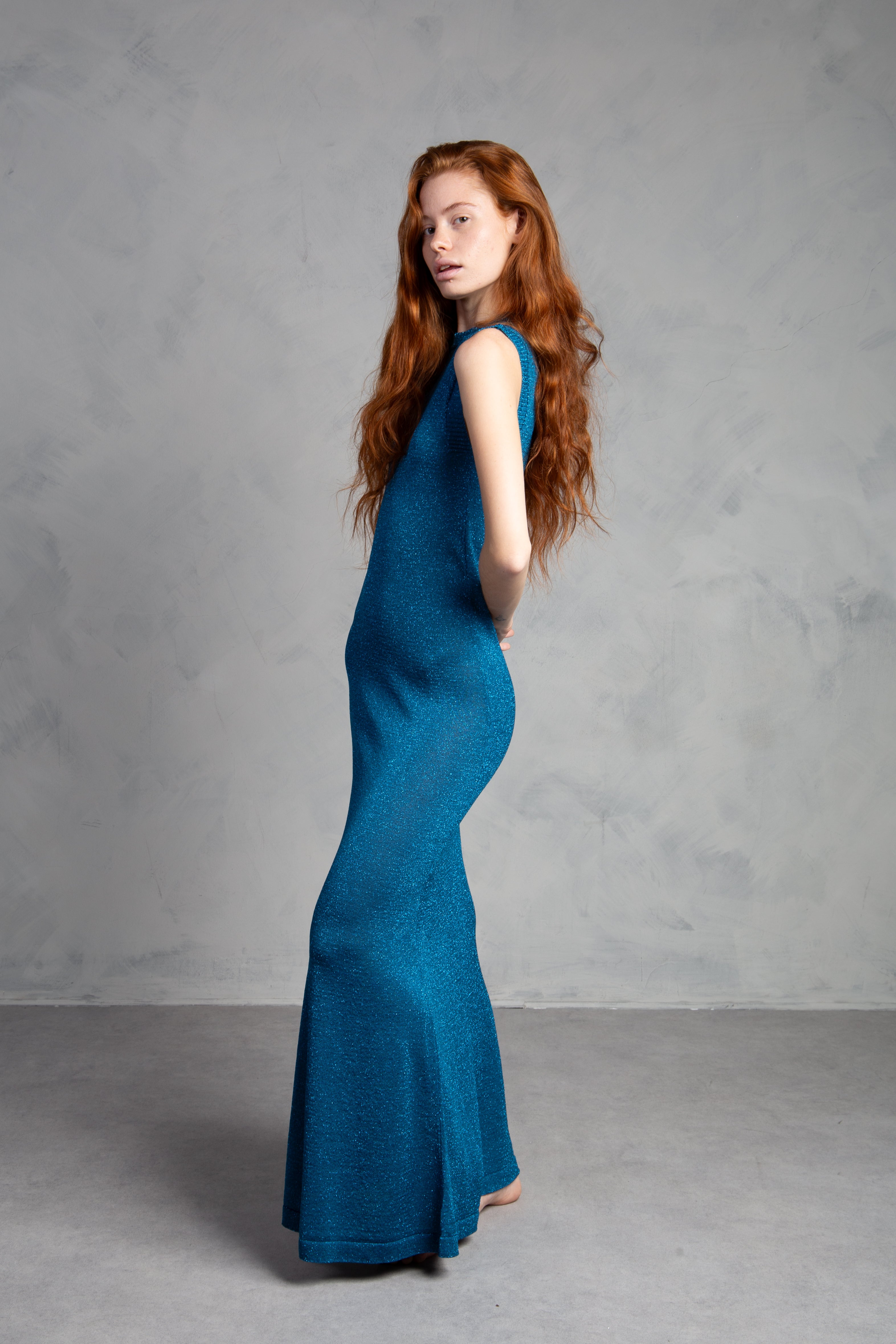 Vestido largo fluido con brillo, cuello redondo y manga sisa. Detalle en cuello y mangas.