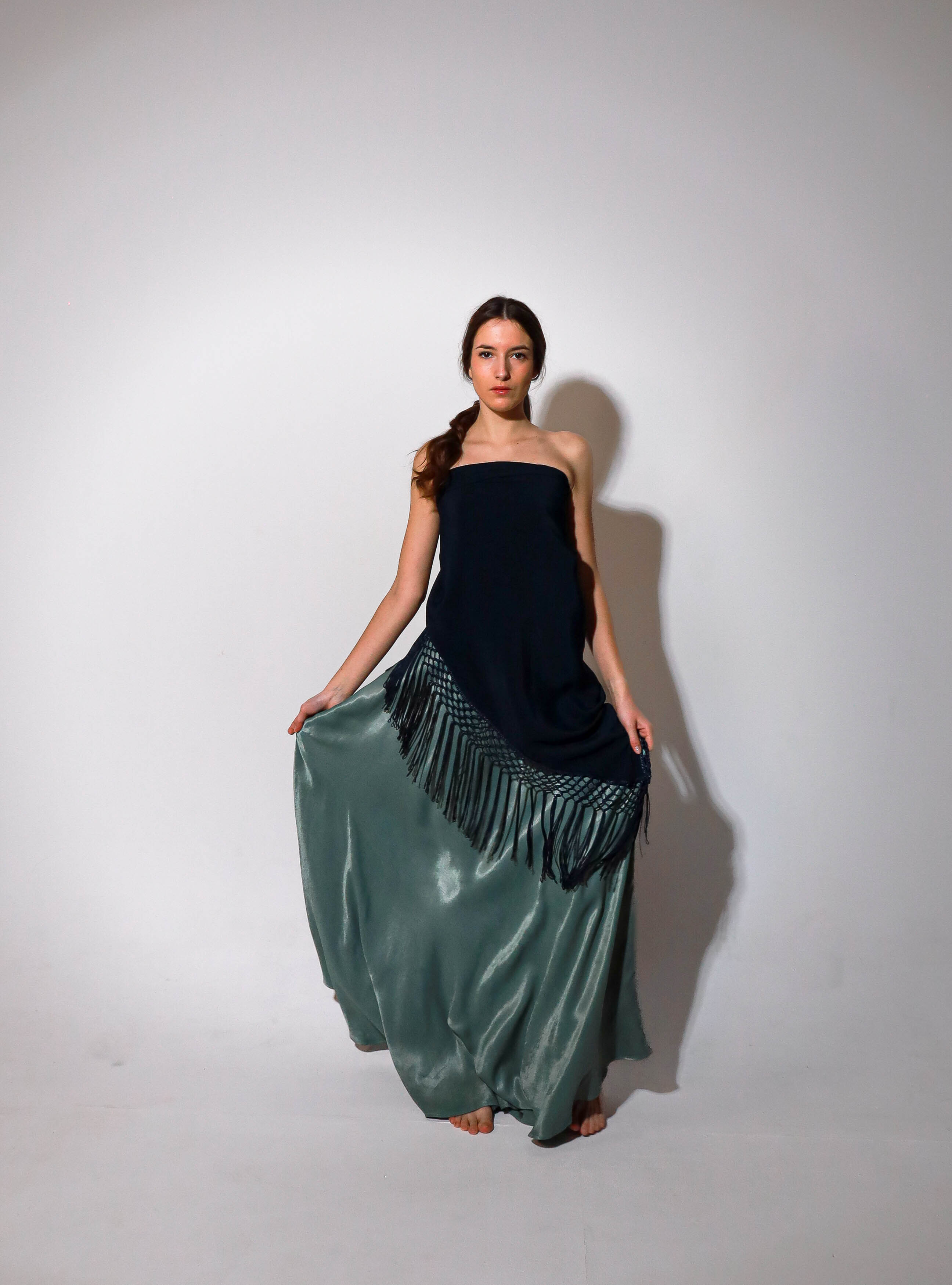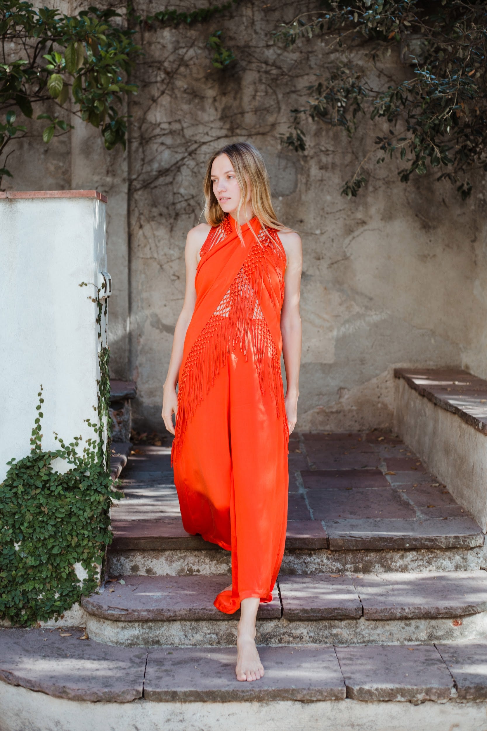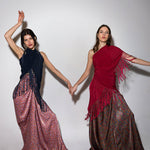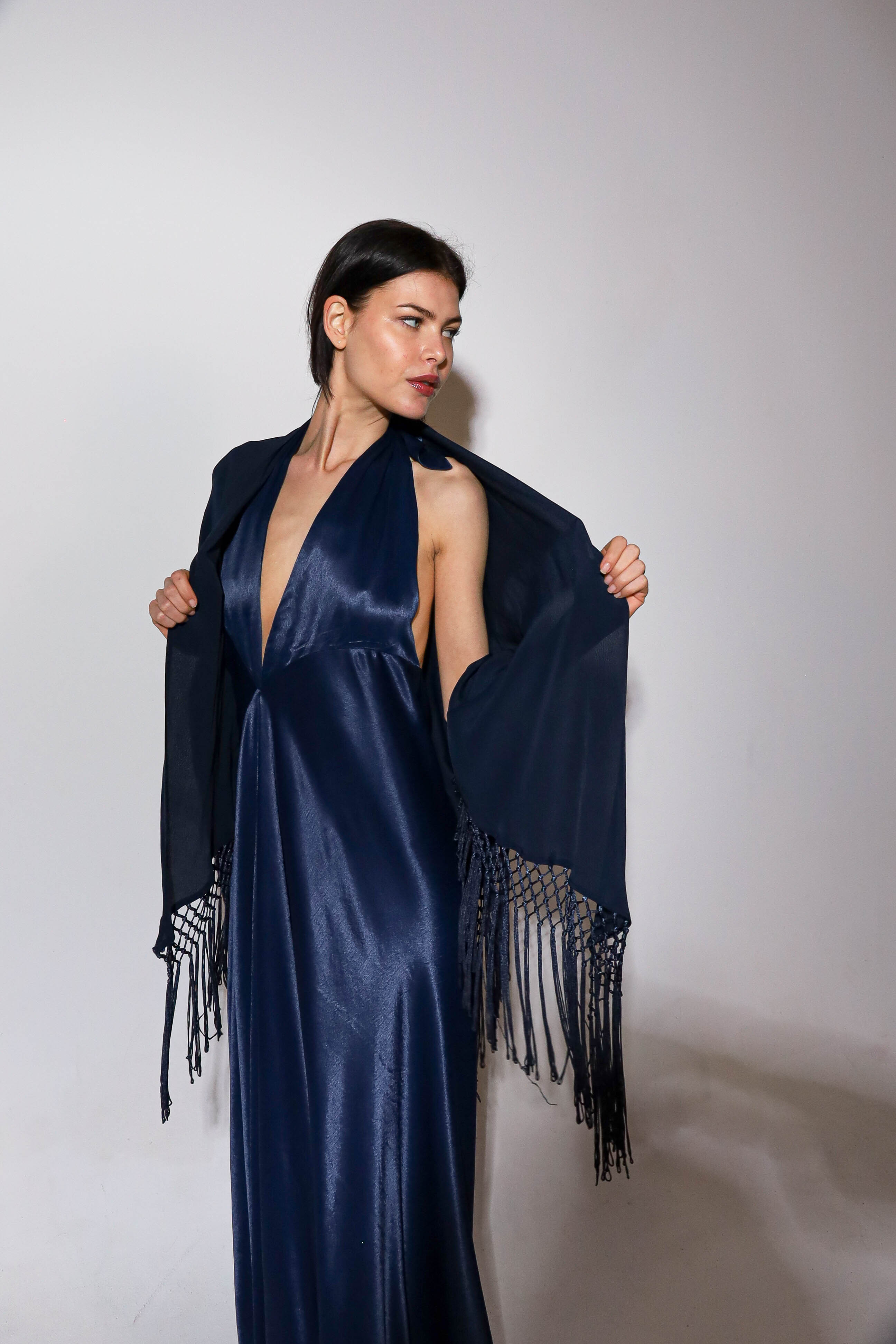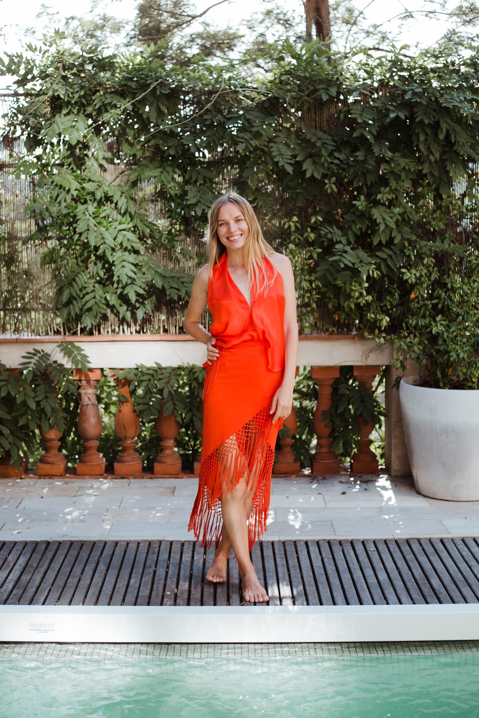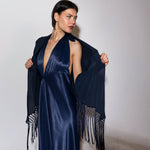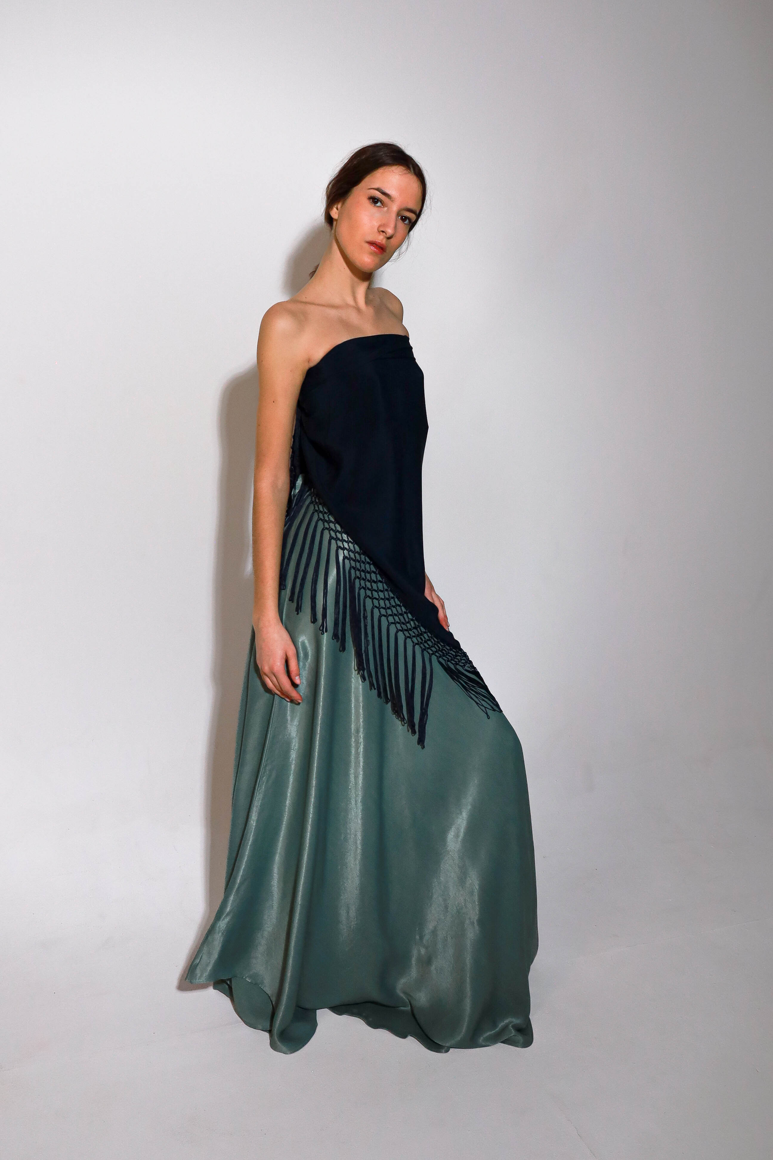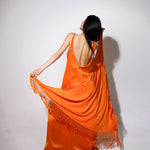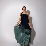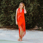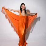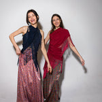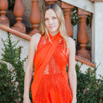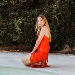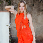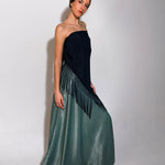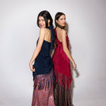 Top en forma de triángulo multiposición y con flecos en los bordes. Al ser un triángulo, tiene varias formas de colocación, tipo top halter, palabra de honor, asimétrico. Infinitas posiciones hasta donde llegue tu imaginación. También se puede usar como falda.