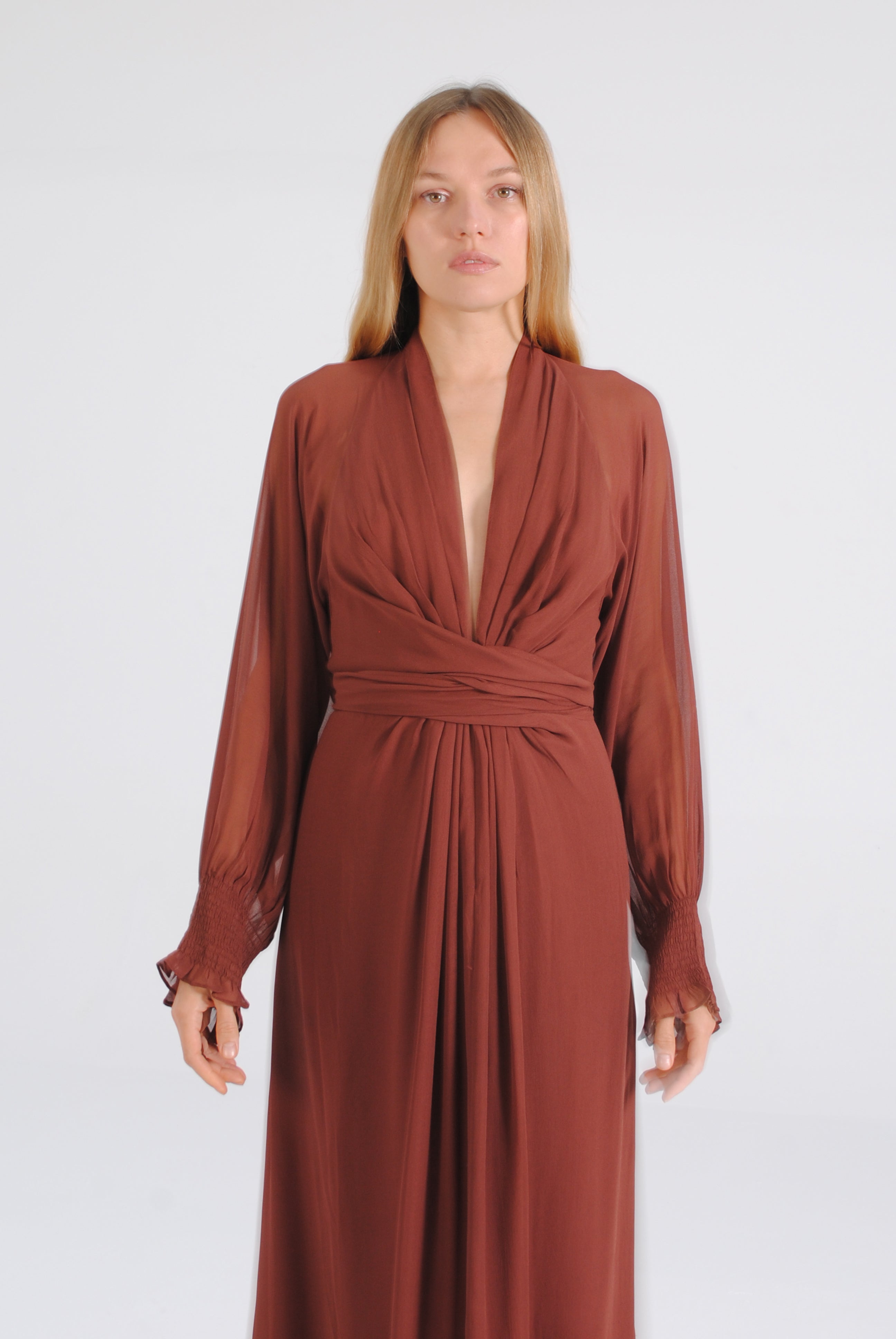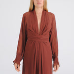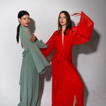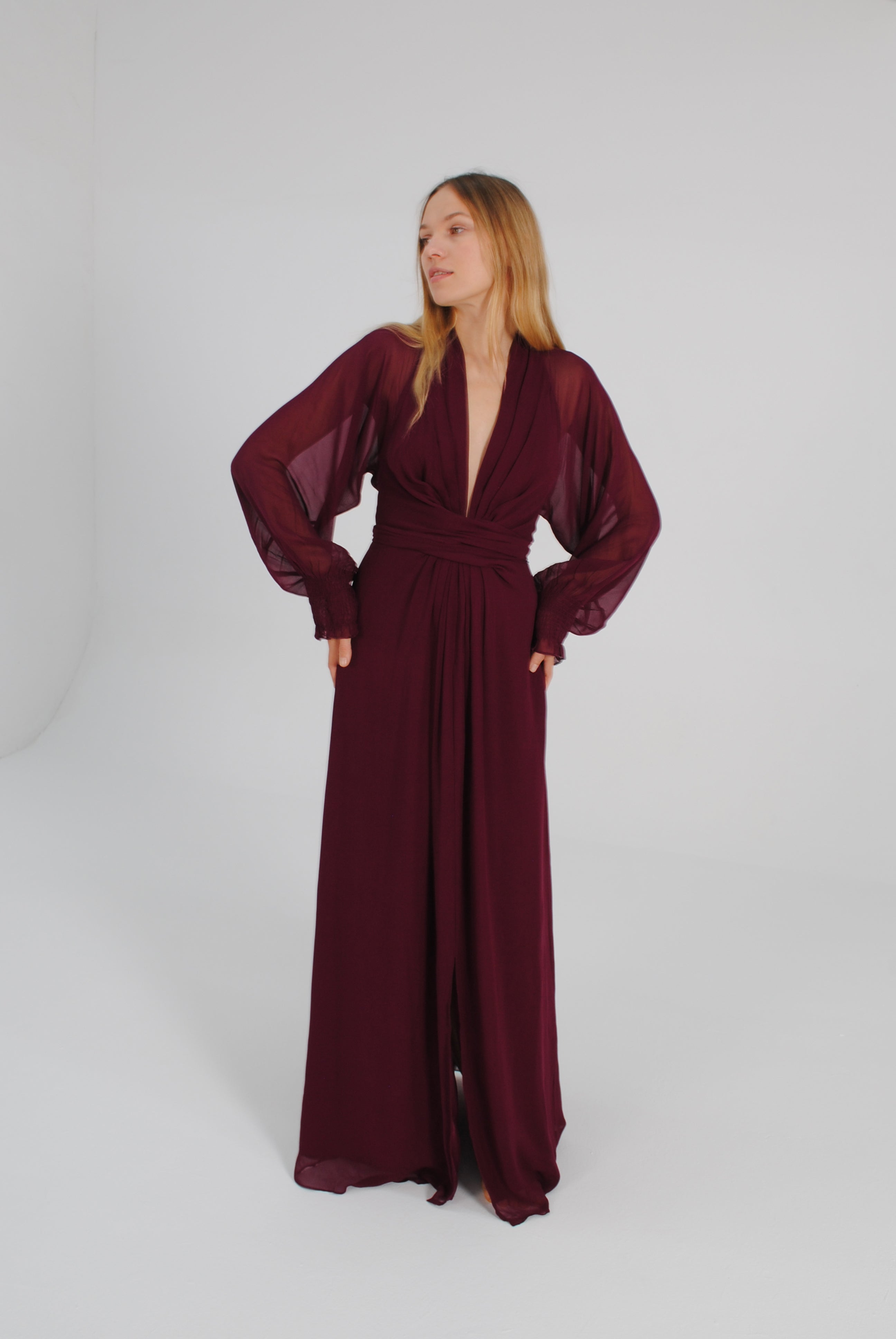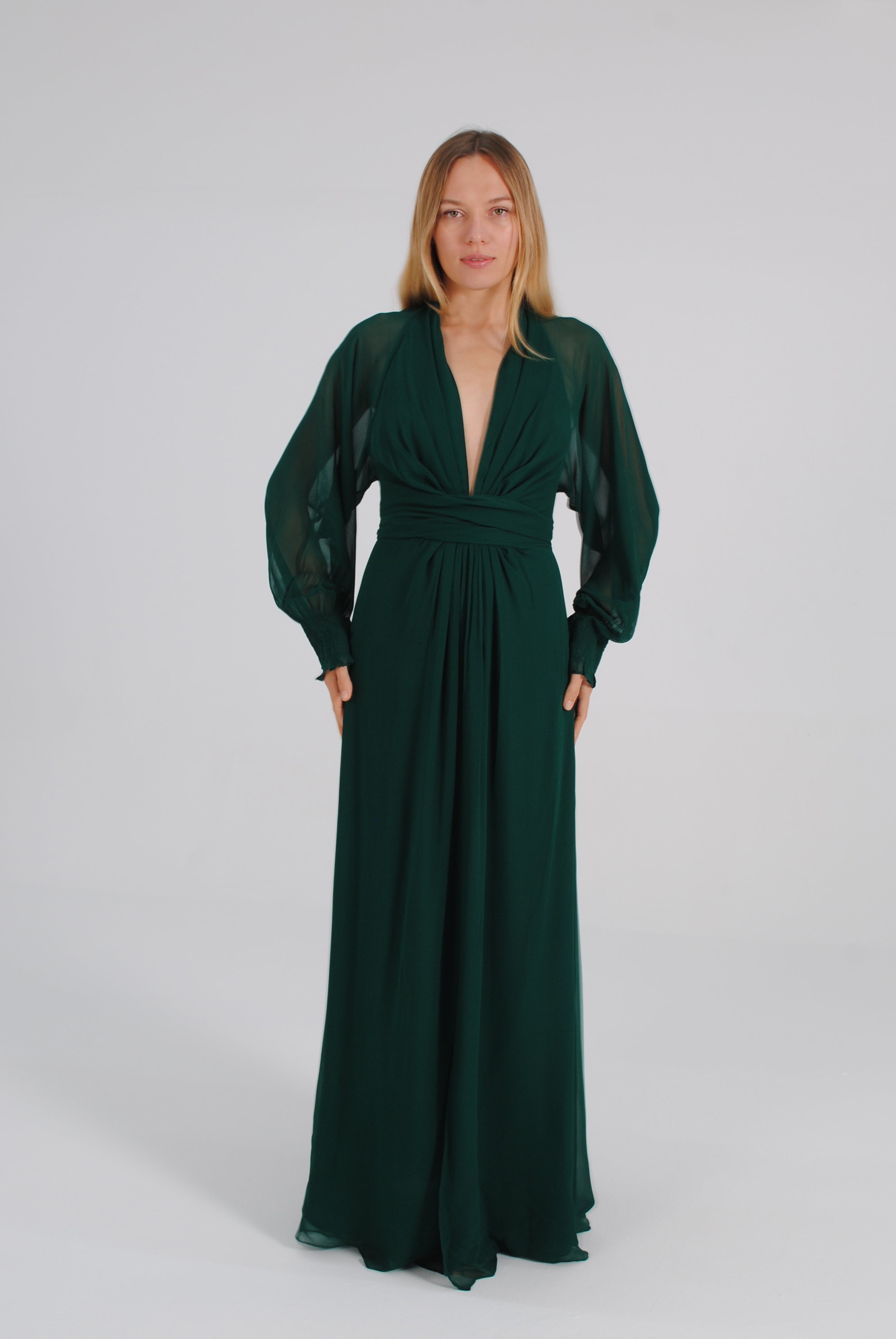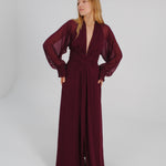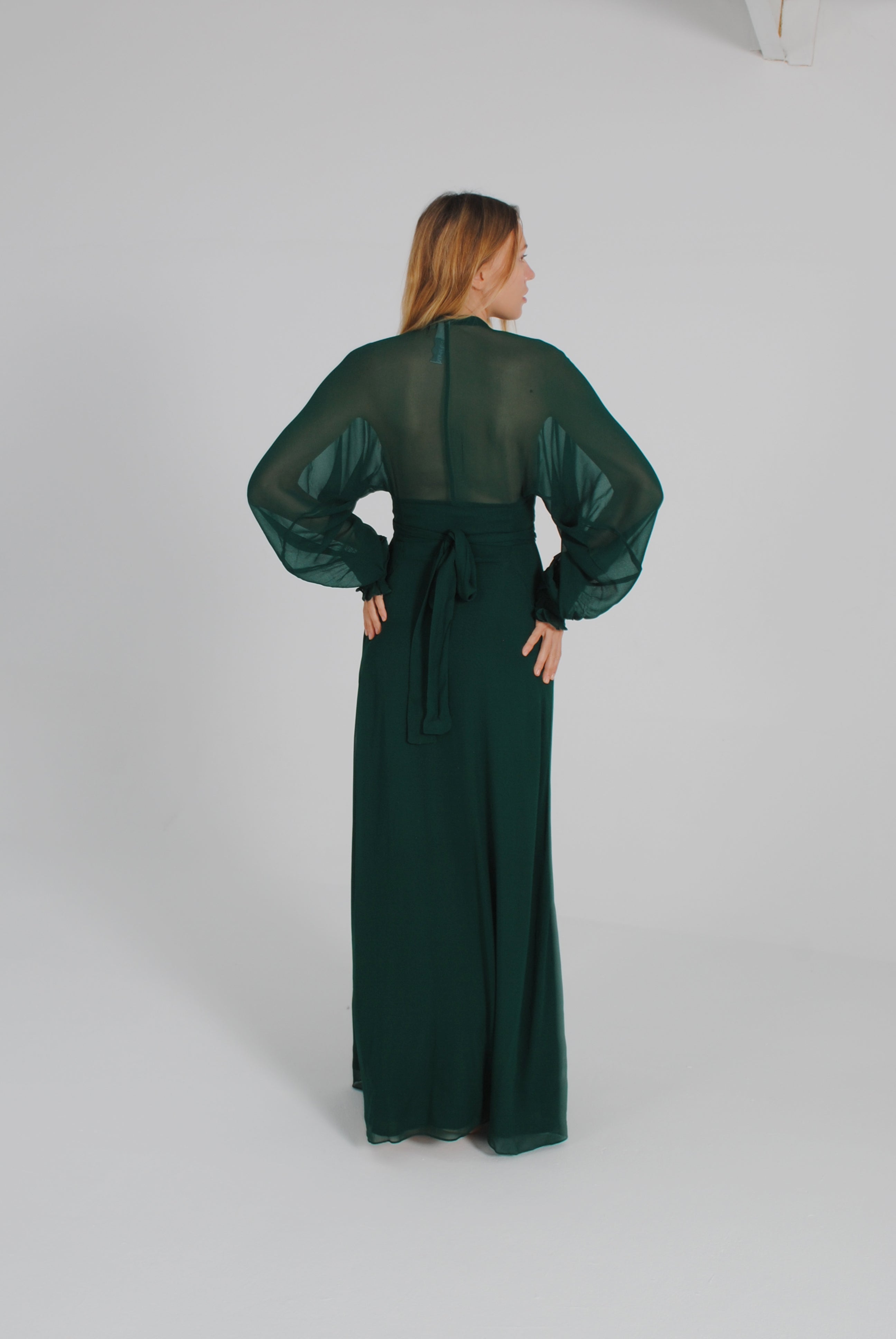 Vestido largo de manga media con escote pronunciado. Manga japonesa. Cintura marcada y gran lazada en la espalda. Por su tejido semitransparente de la parte superior trasera de la prenda, la espalda queda a la vista. El cierre de la prenda es una cremallera invisible que queda tapada con la lazada.