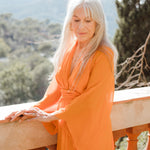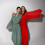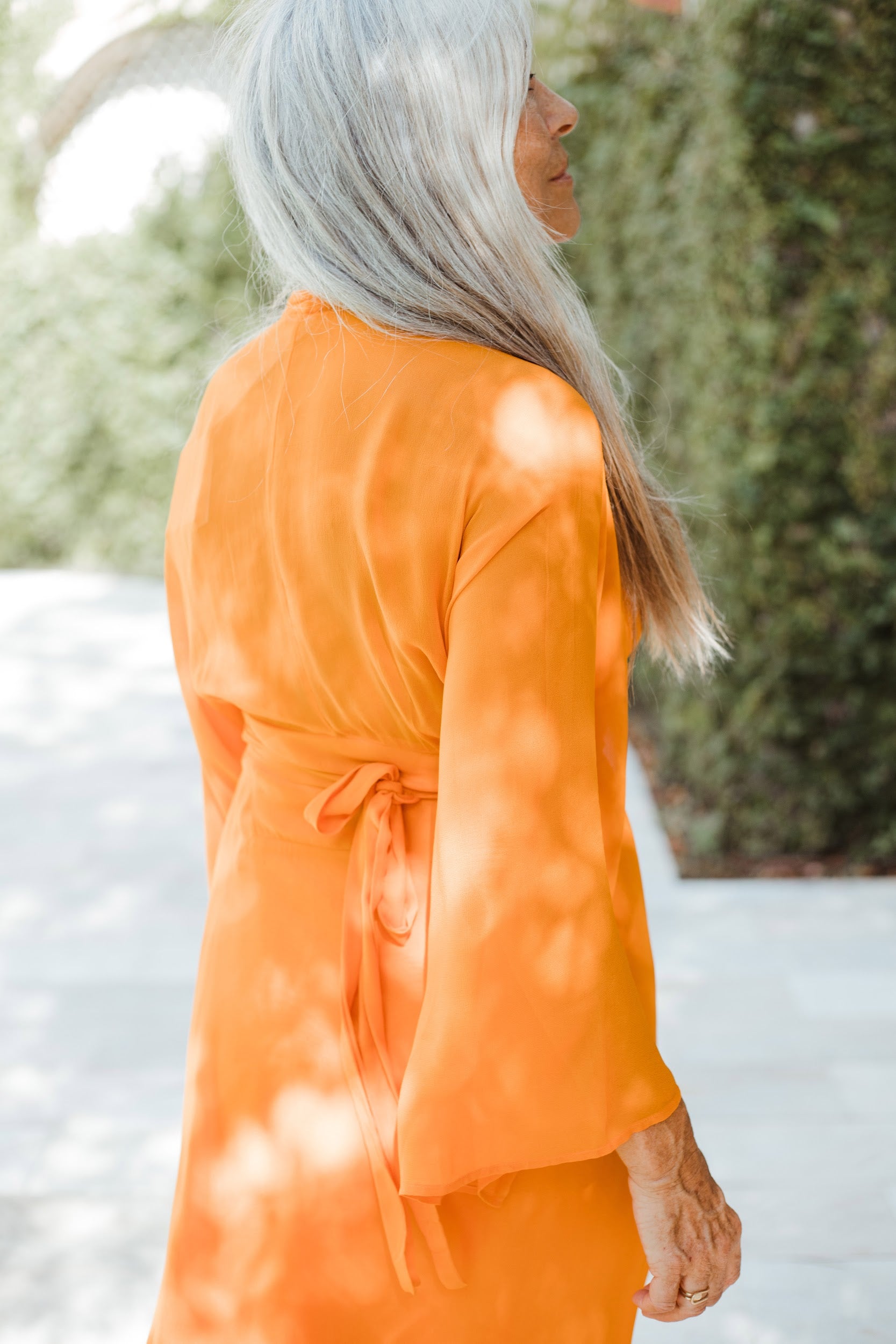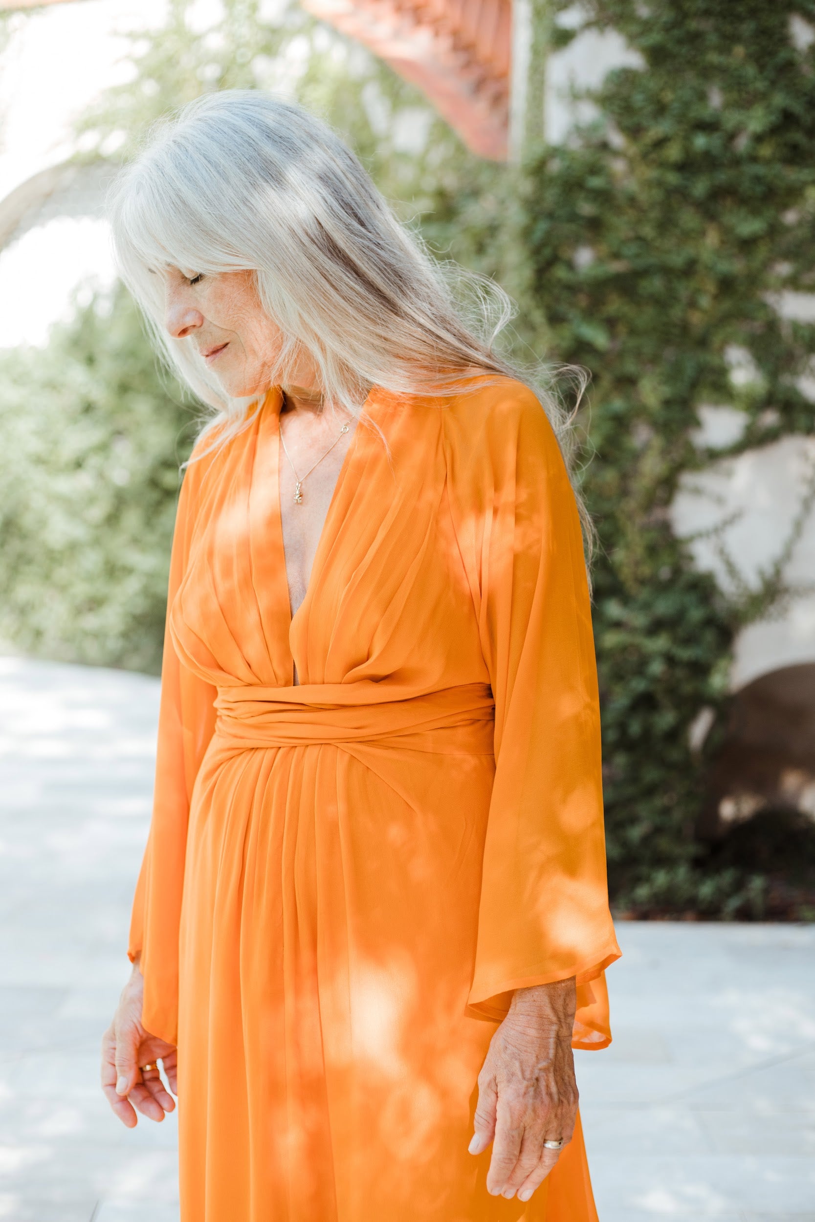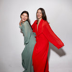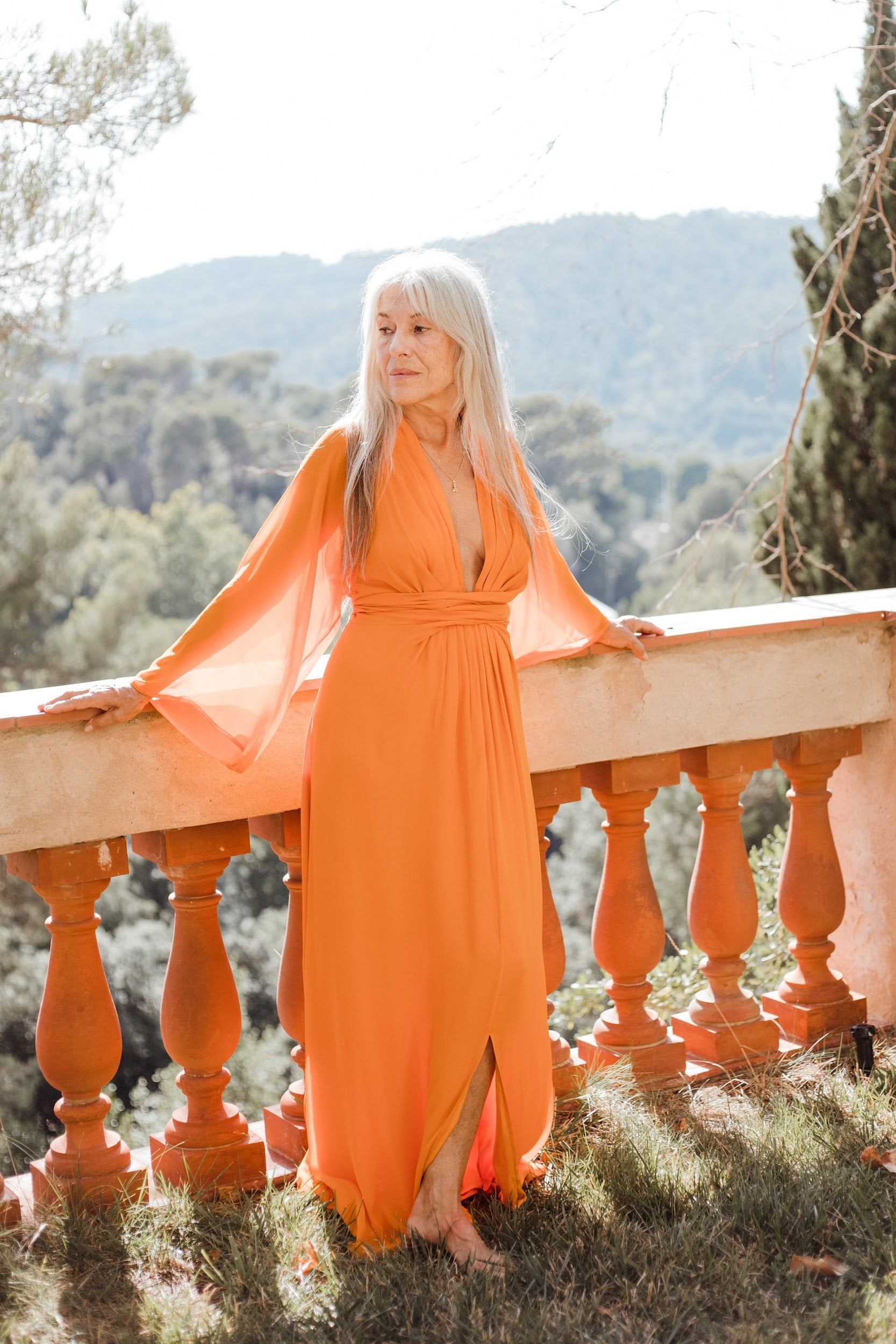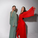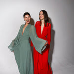Vestido largo de manga media con escote pronunciado. Manga japonesa. Cintura marcada y gran lazada en la espalda. Por su tejido semitransparente de la parte superior trasera de la prenda, la espalda queda a la vista. El cierre de la prenda es una cremallera invisible que queda tapada con la lazada.