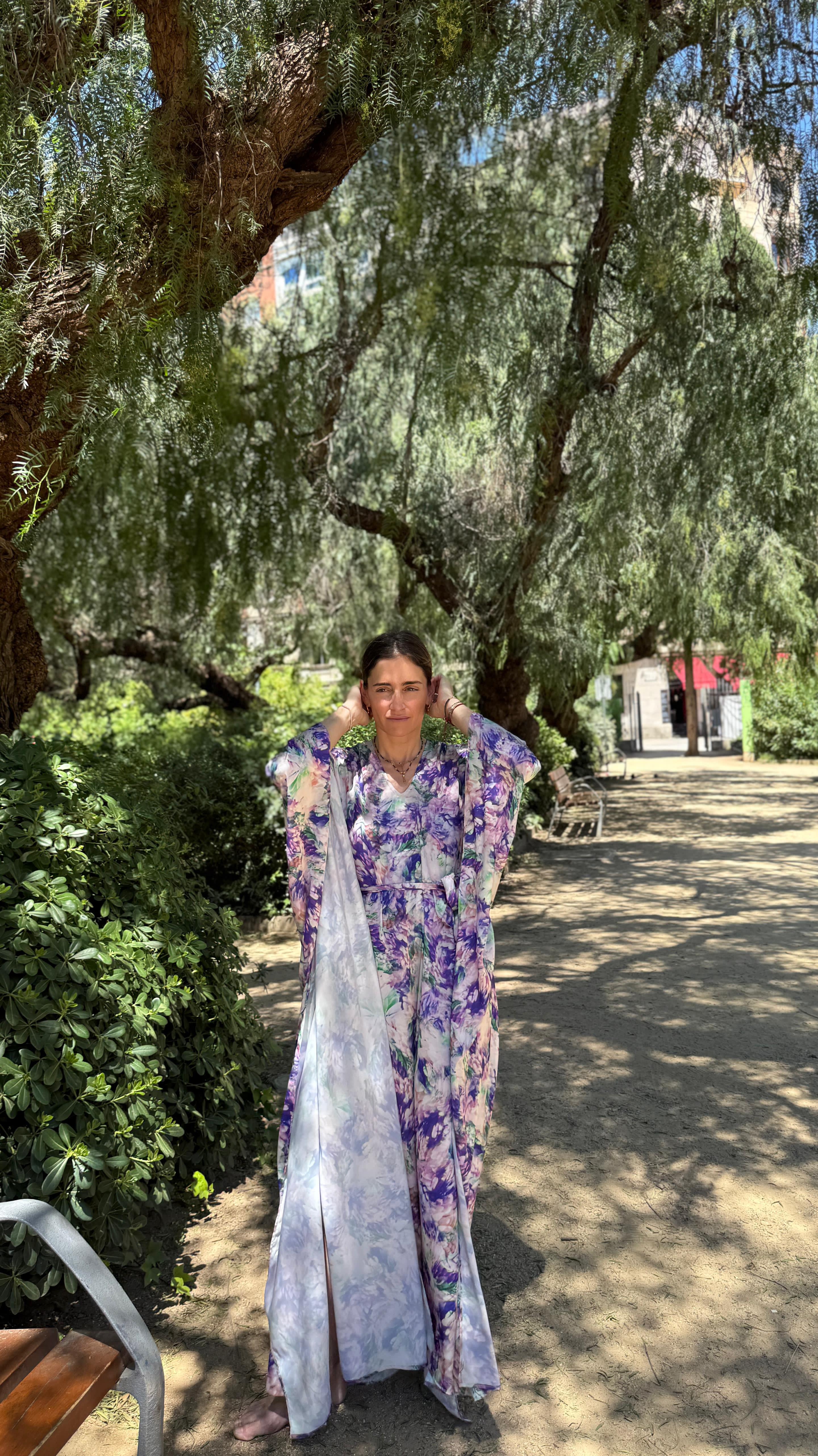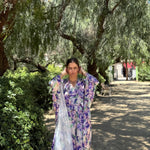 Vestido largo estampado con cuello V tipo kaftan con cinturón.