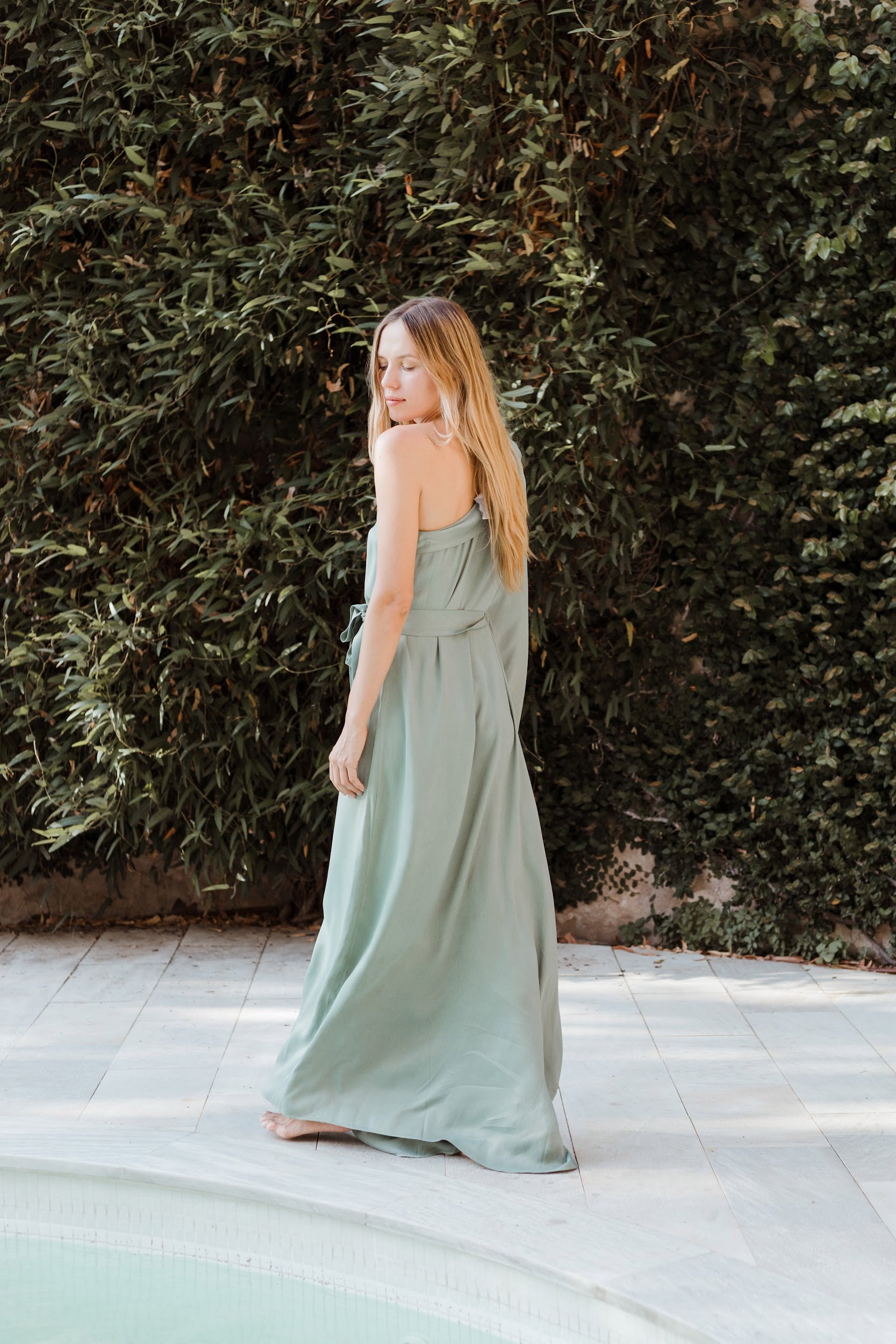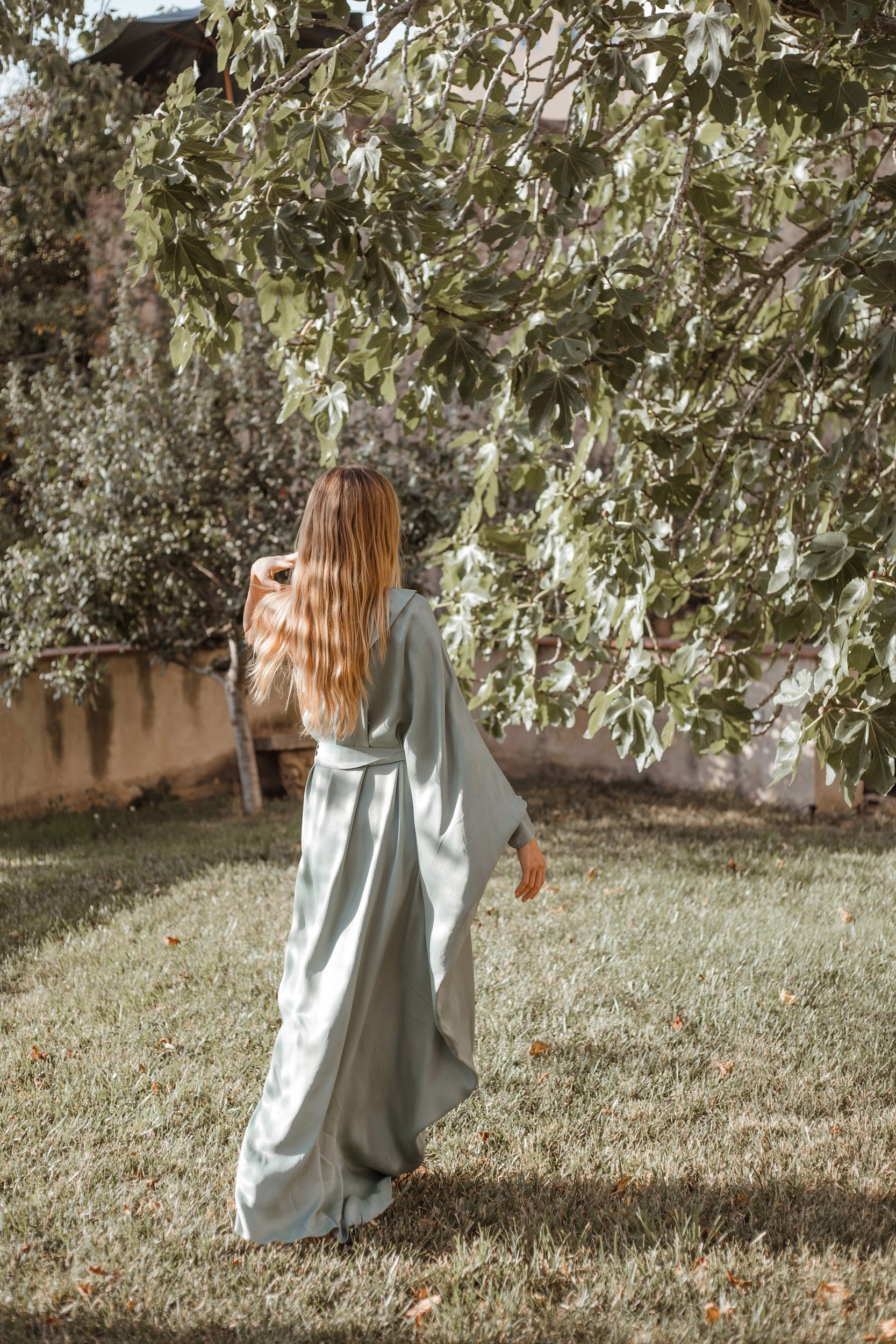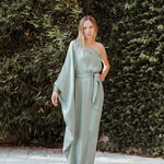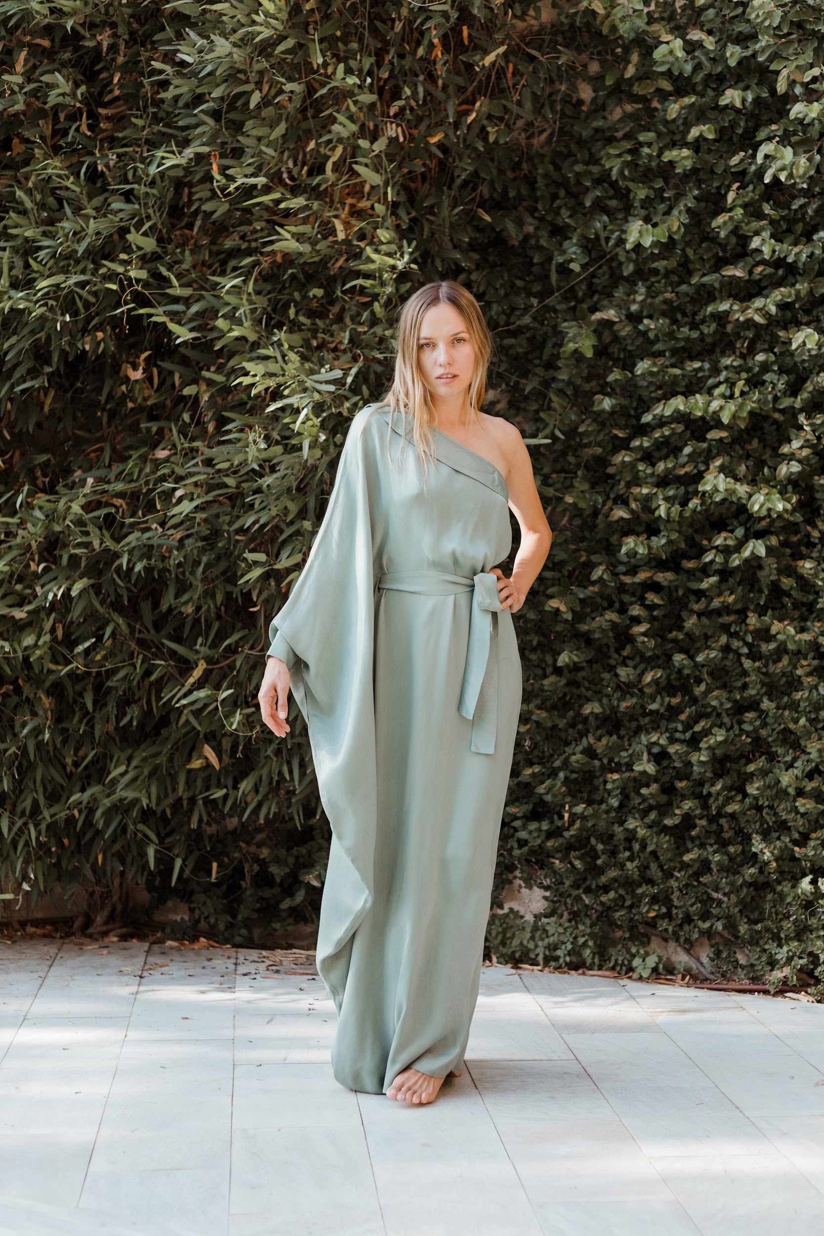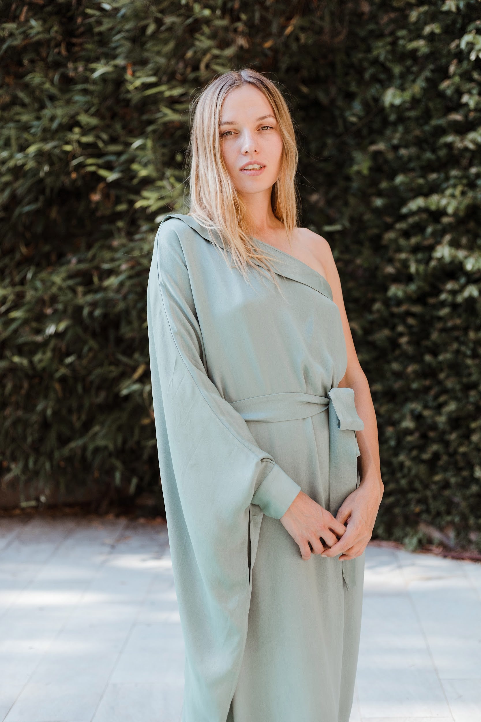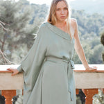 Vestido asimétrico de igual forma por delante que por detrás. Cuenta con un lazo para estrechar en cintura. Manga tipo kimono y puño. Talla única: abarca desde una 34 hasta la talla 42.