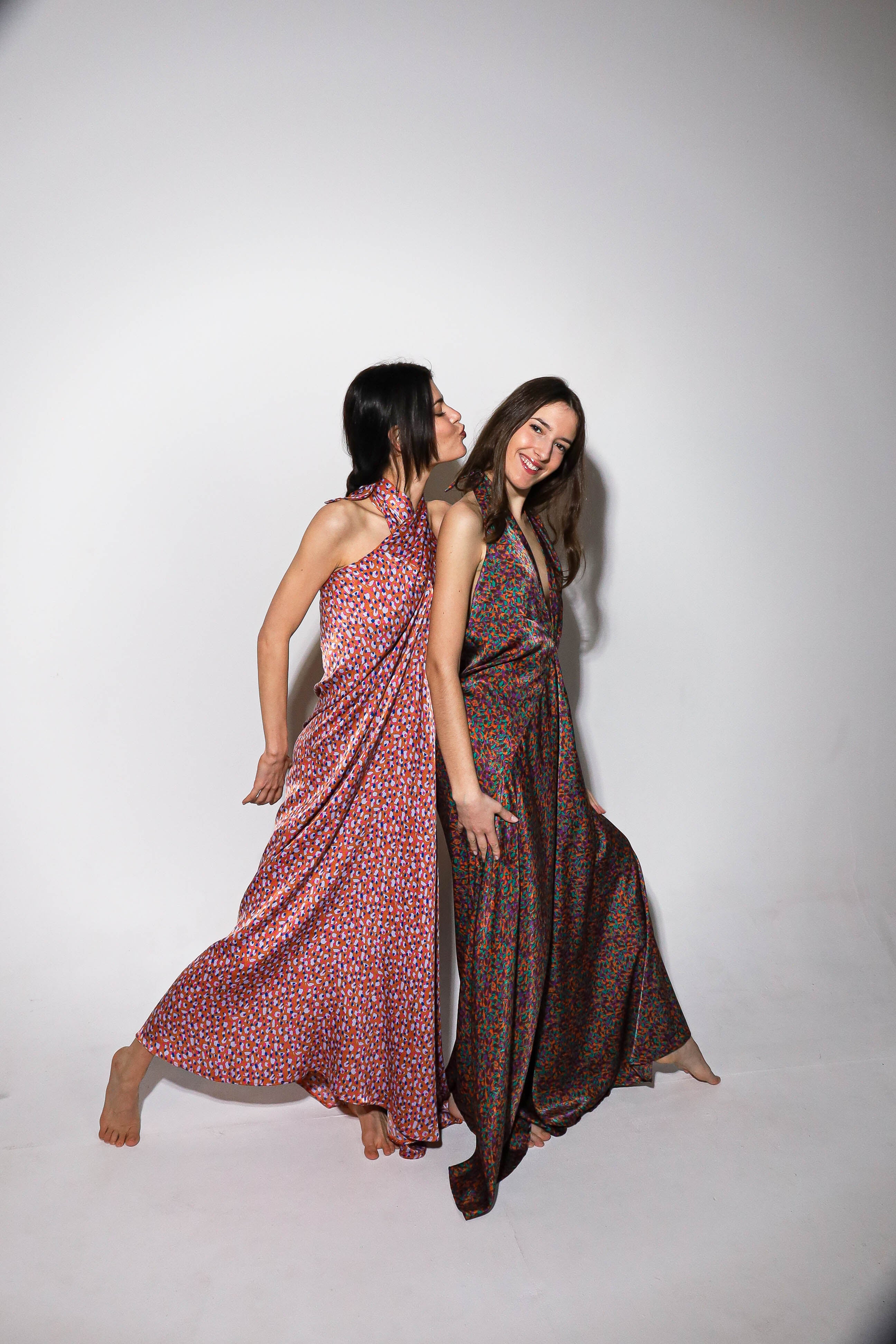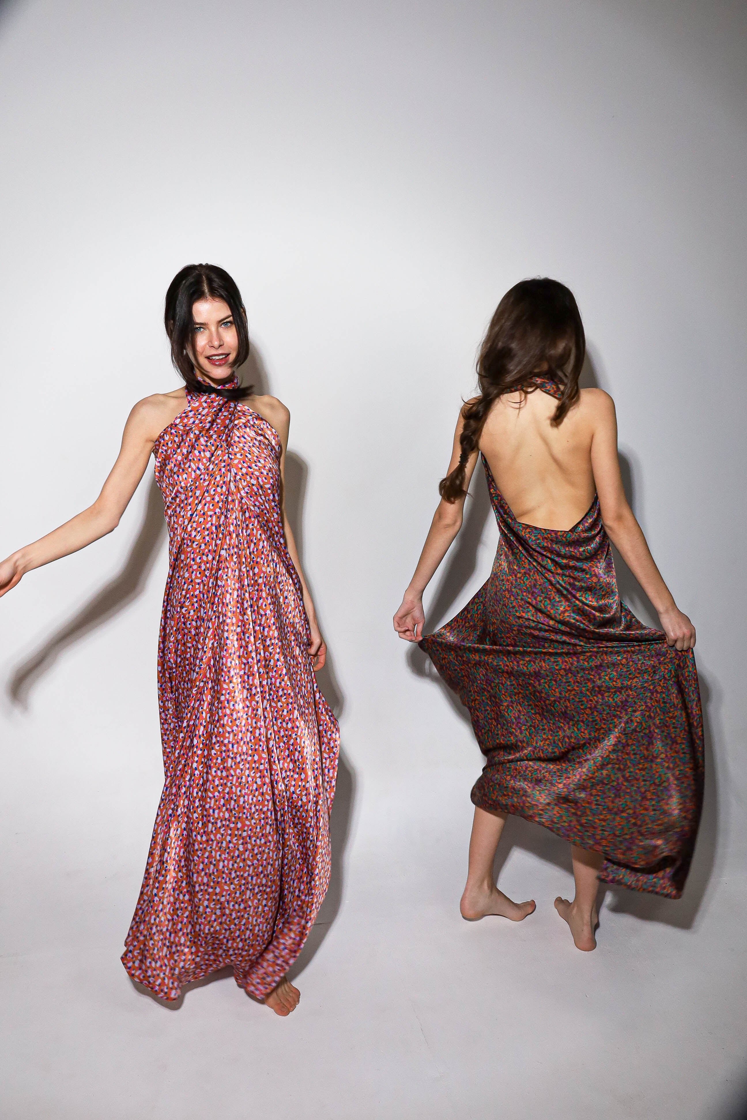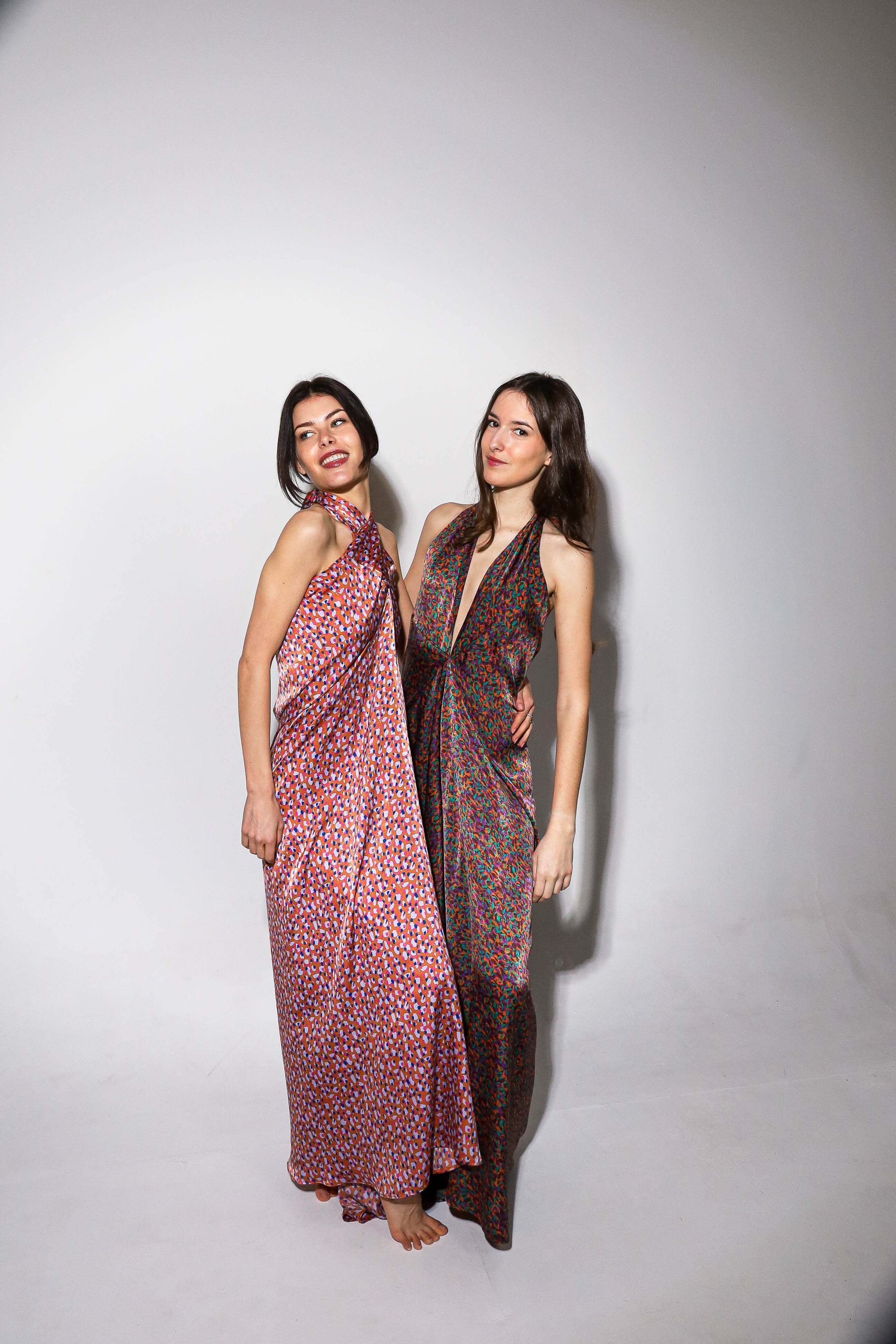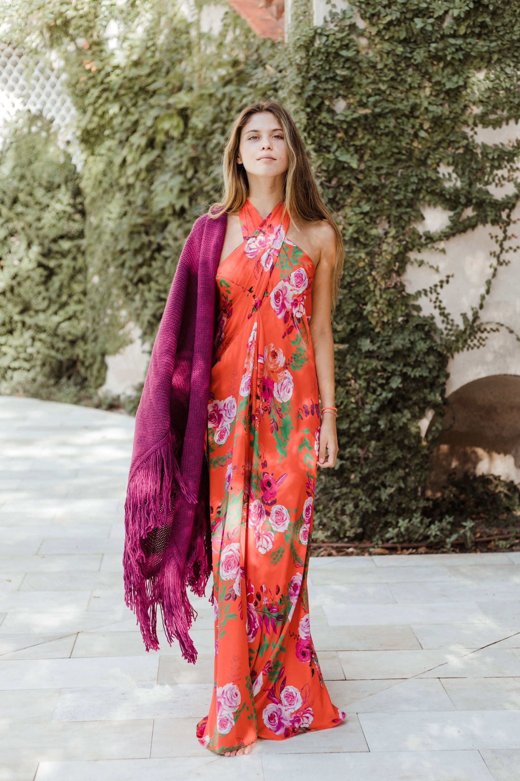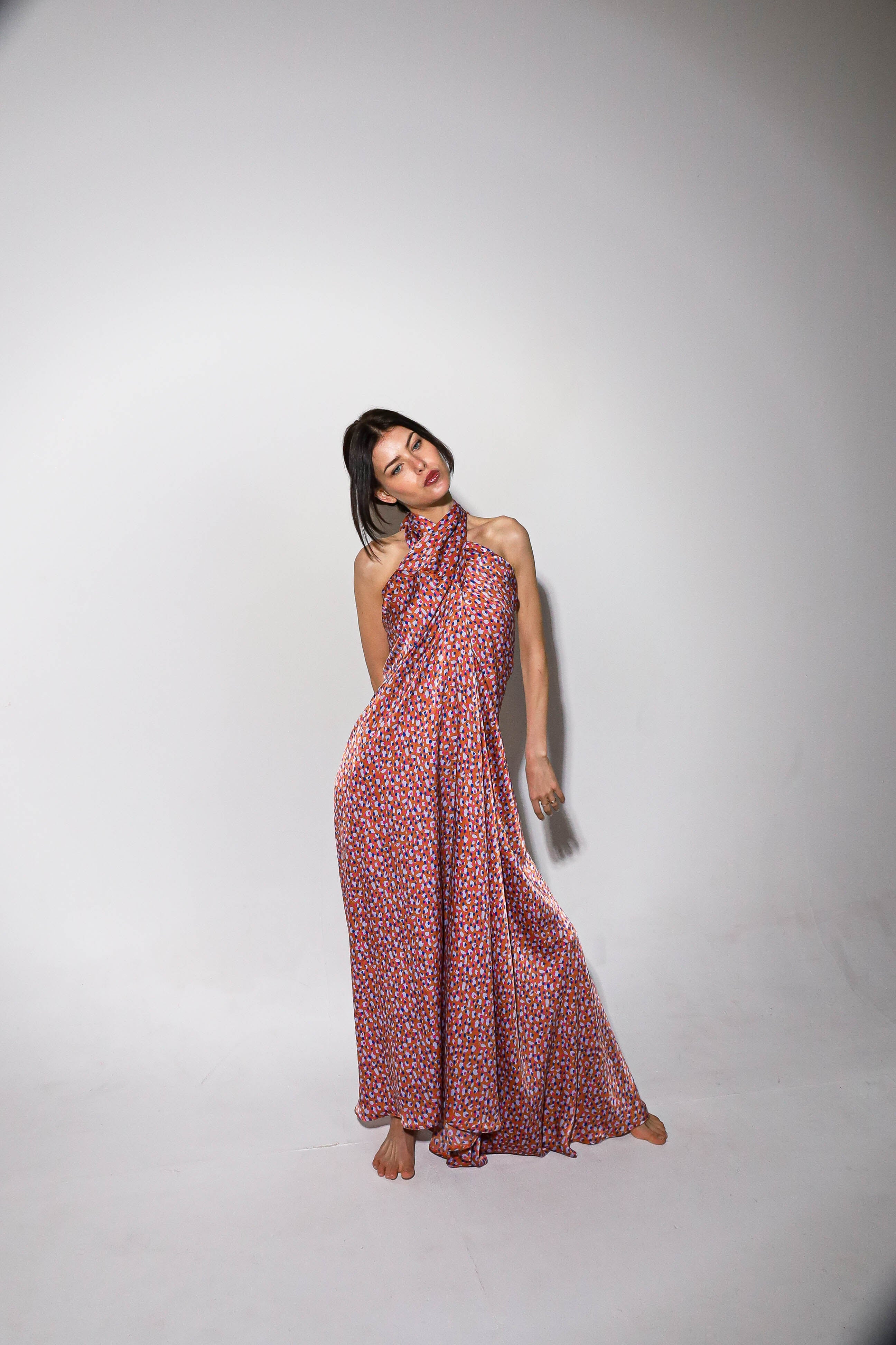 Vestido largo multiposición. Hay varias formas de ponerlo; La primera es asimétrico anudando sobre un hombro, la segunda es cuello halter y la tercera es palabra de honor. Vestido cortado al bies con gran caída. Talla única: abarca desde una 34 hasta la talla 42.