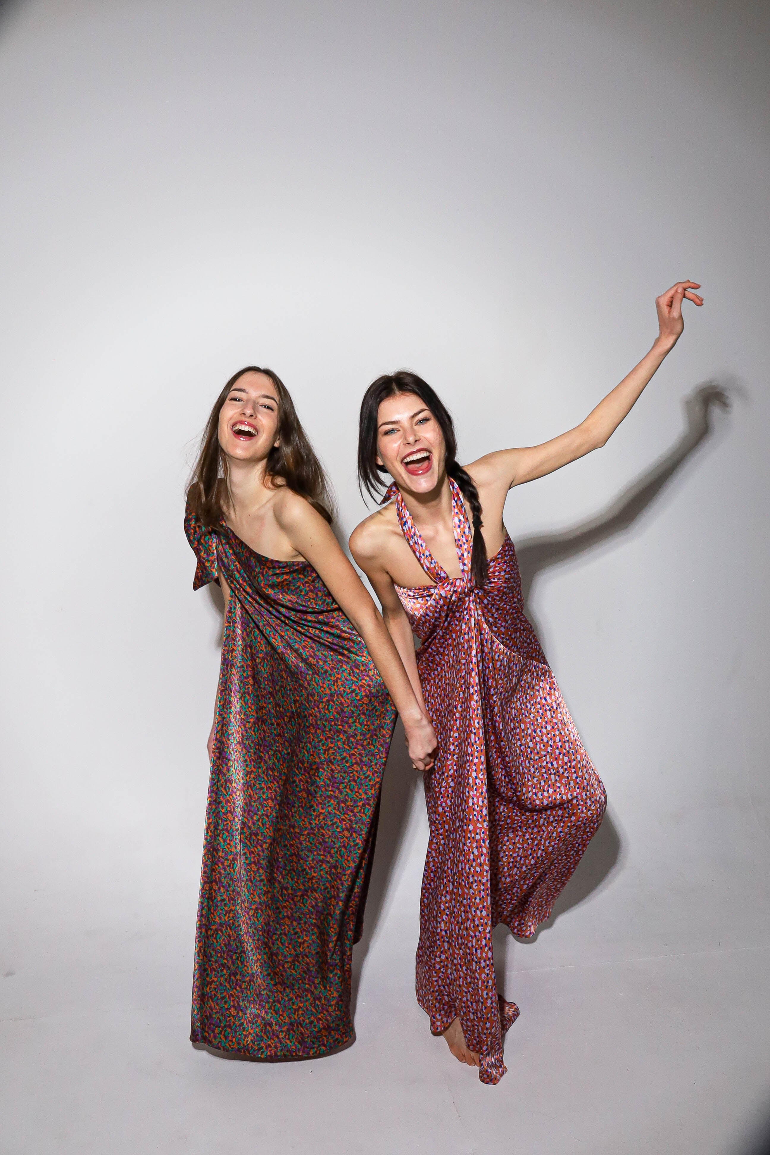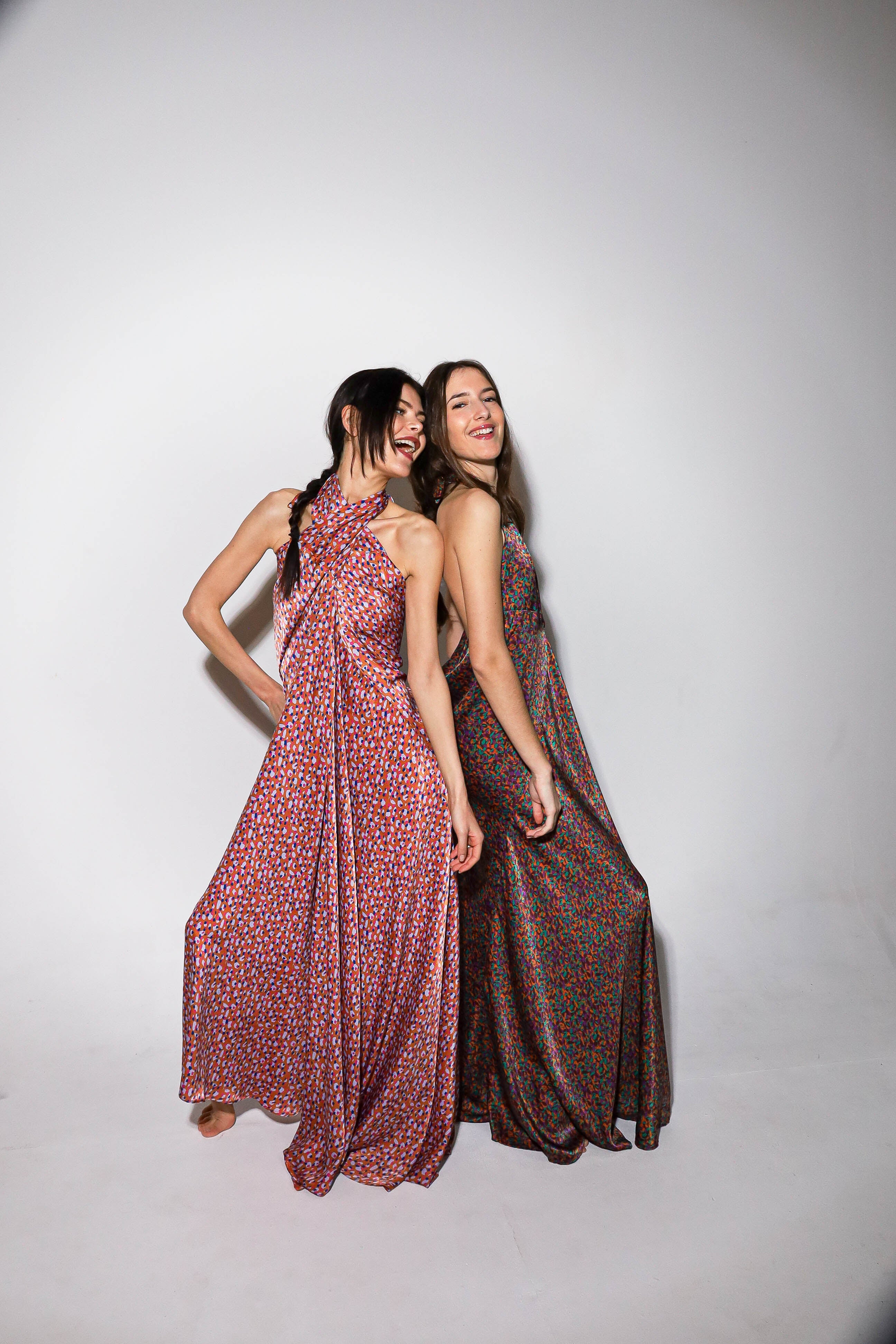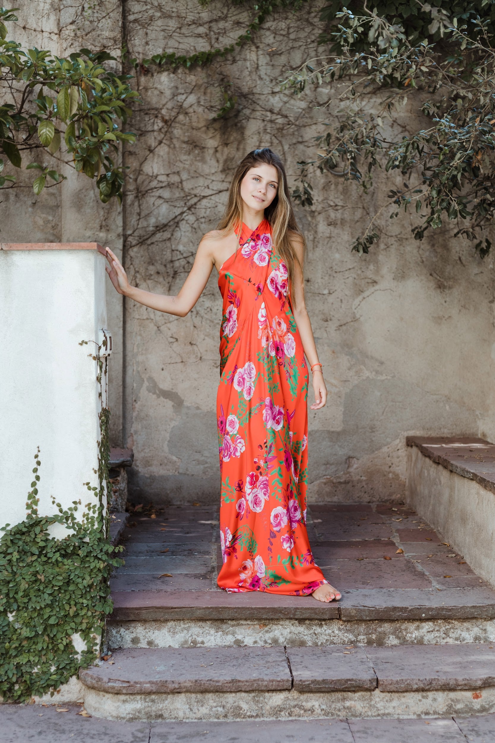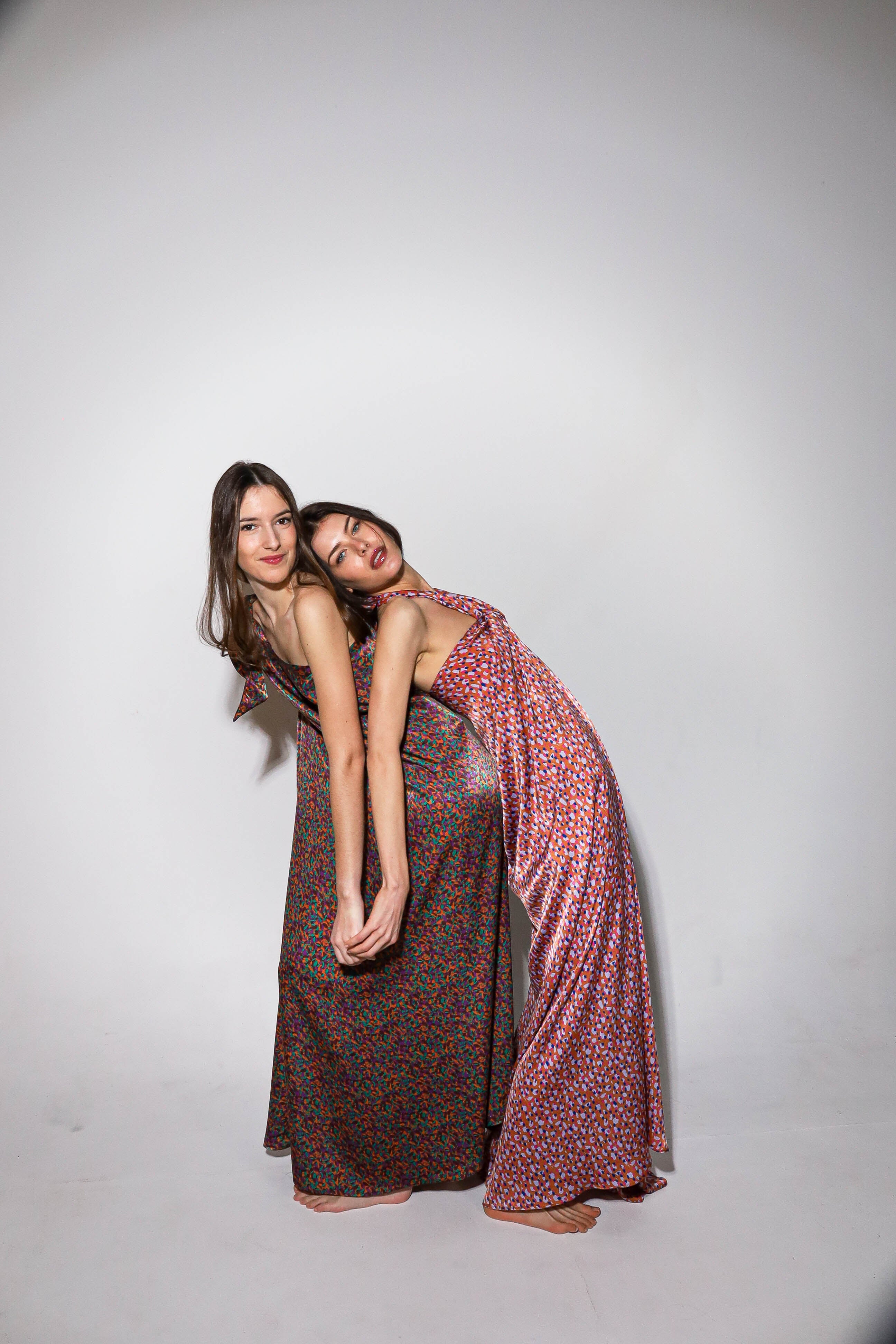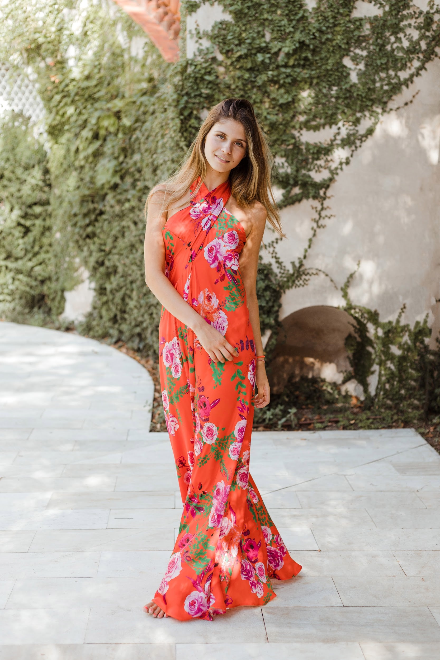 Vestido largo multiposición. Hay varias formas de ponerlo; La primera es asimétrico anudando sobre un hombro, la segunda es cuello halter y la tercera es palabra de honor. Vestido cortado al bies con gran caída. Talla única: abarca desde una 34 hasta la talla 42.