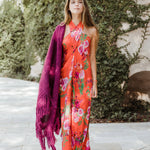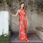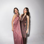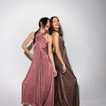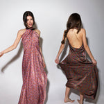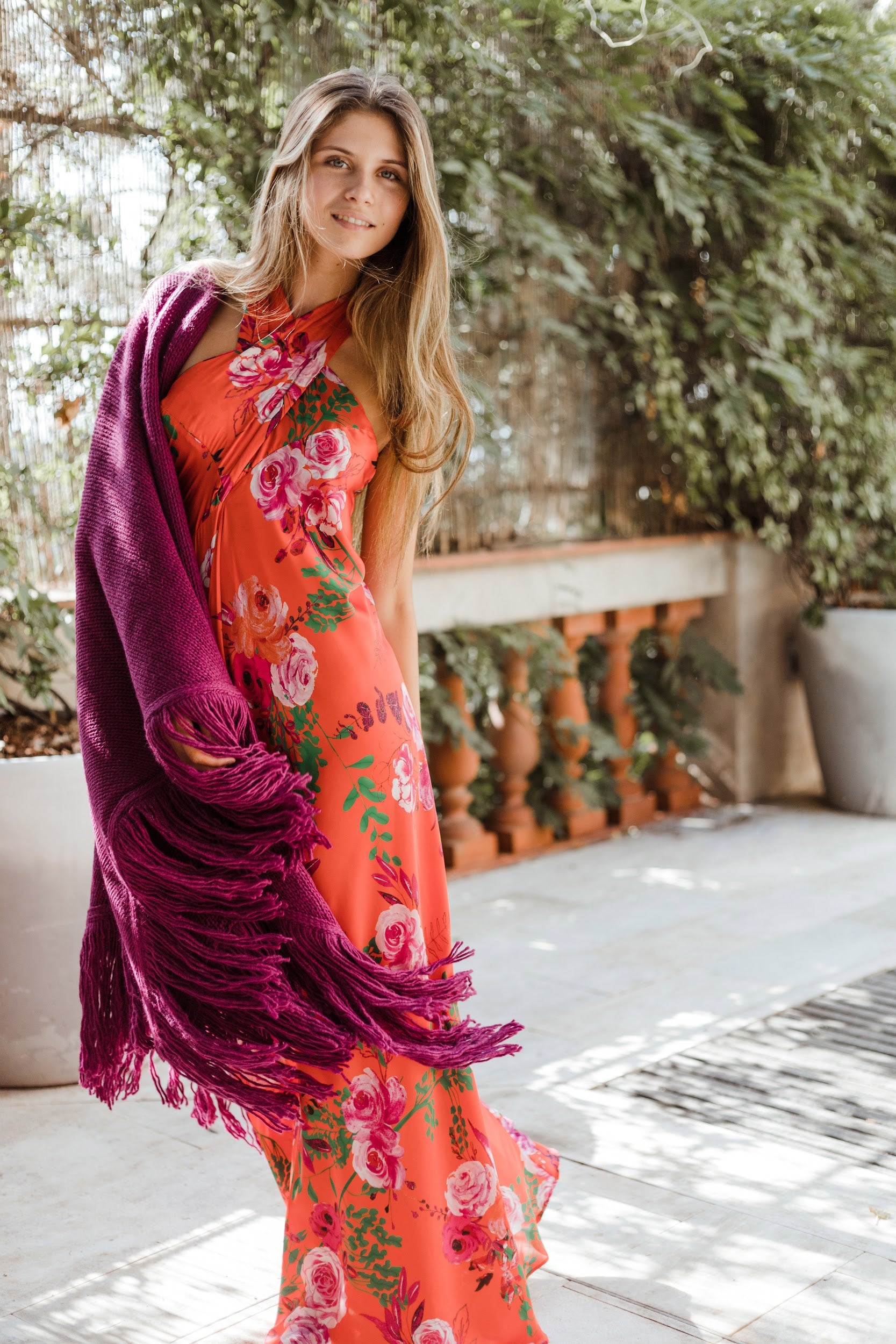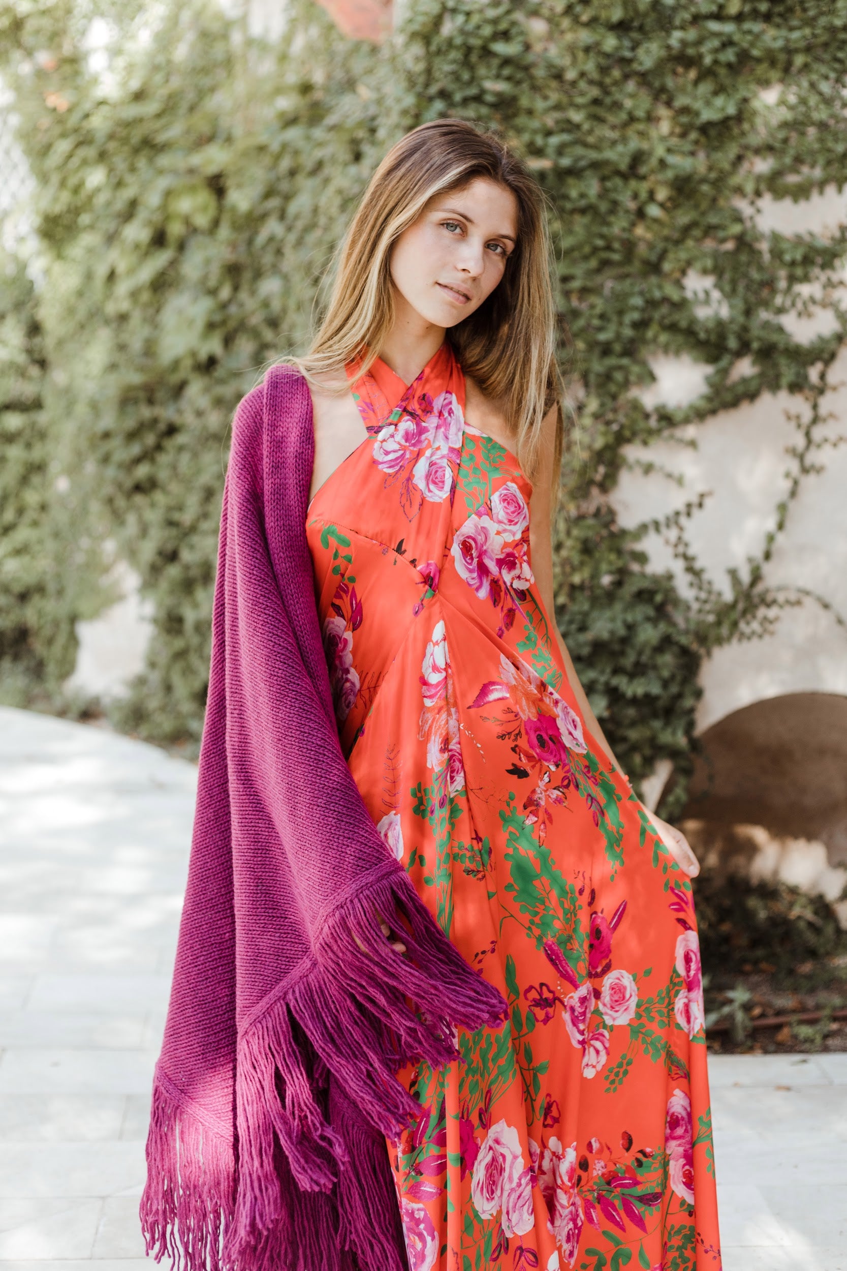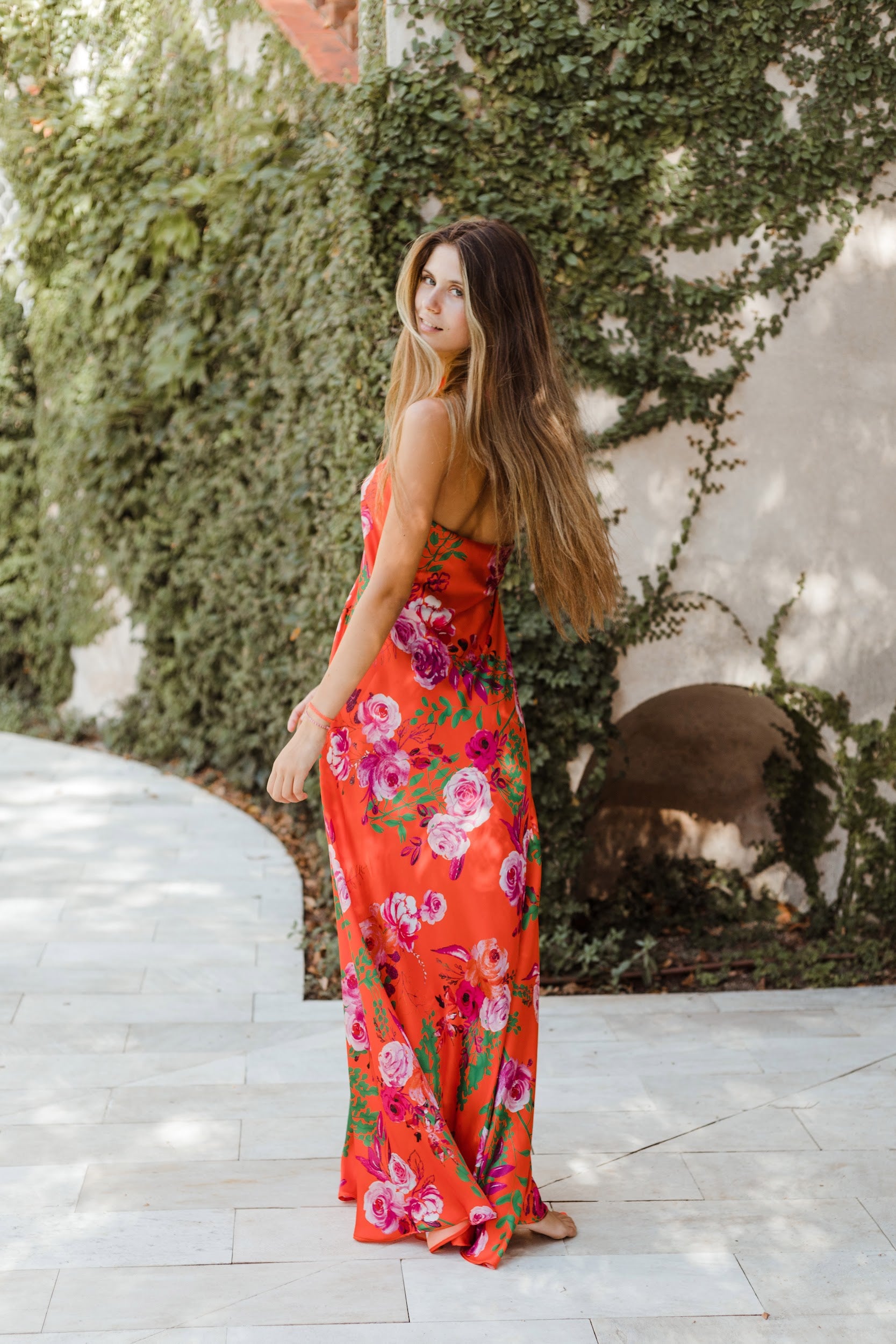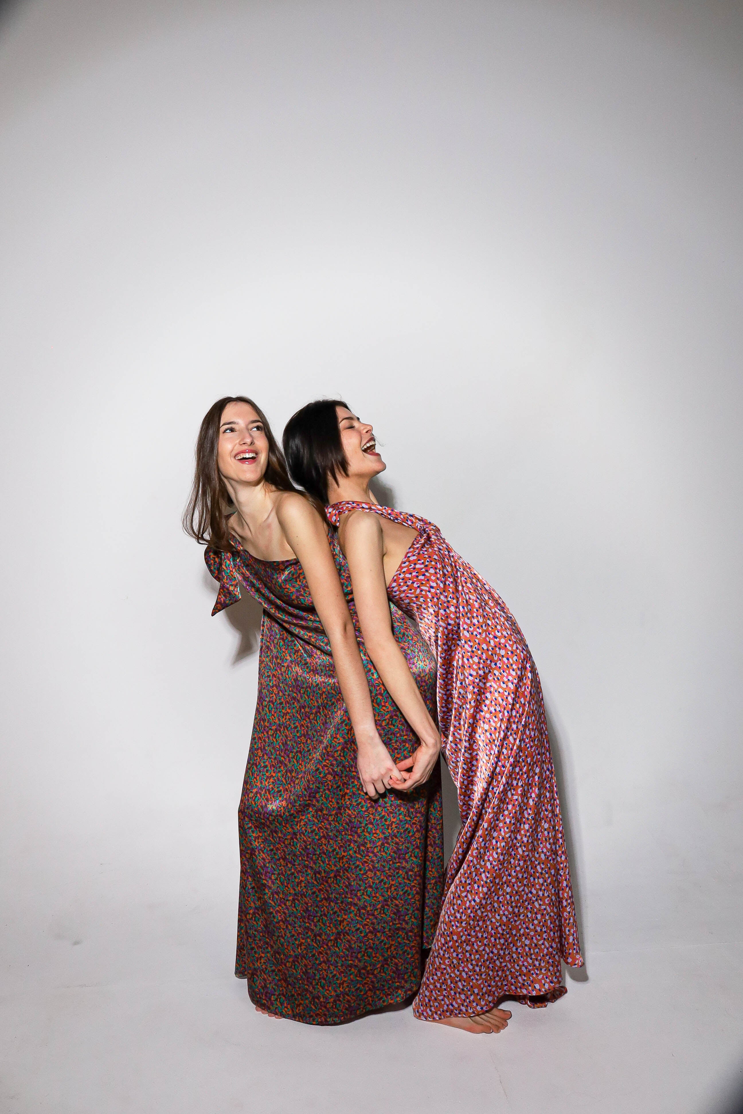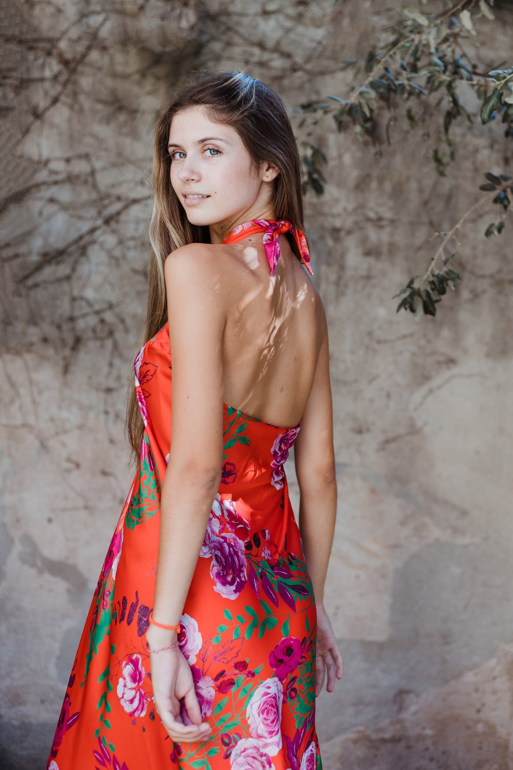 Vestido largo multiposición. Hay varias formas de ponerlo; La primera es asimétrico anudando sobre un hombro, la segunda es cuello halter y la tercera es palabra de honor. Vestido cortado al bies con gran caída. Talla única: abarca desde una 34 hasta la talla 42.