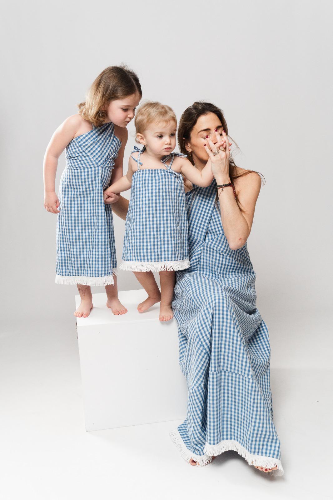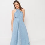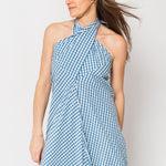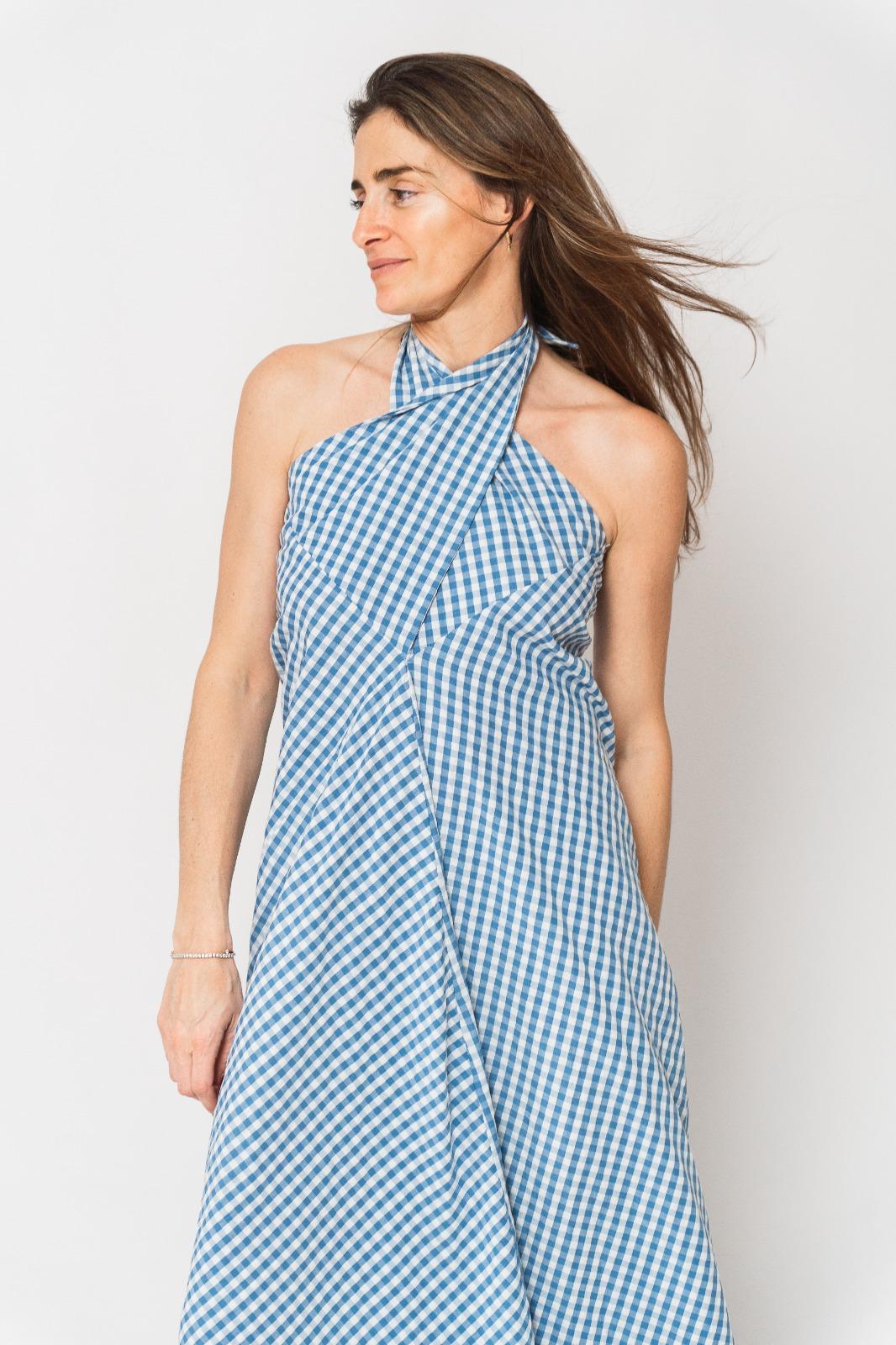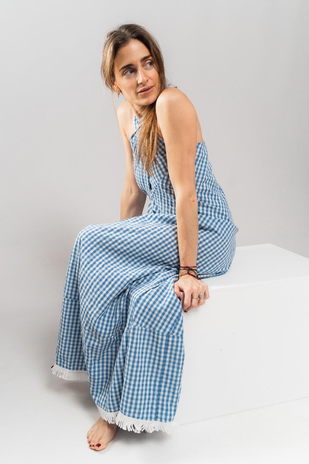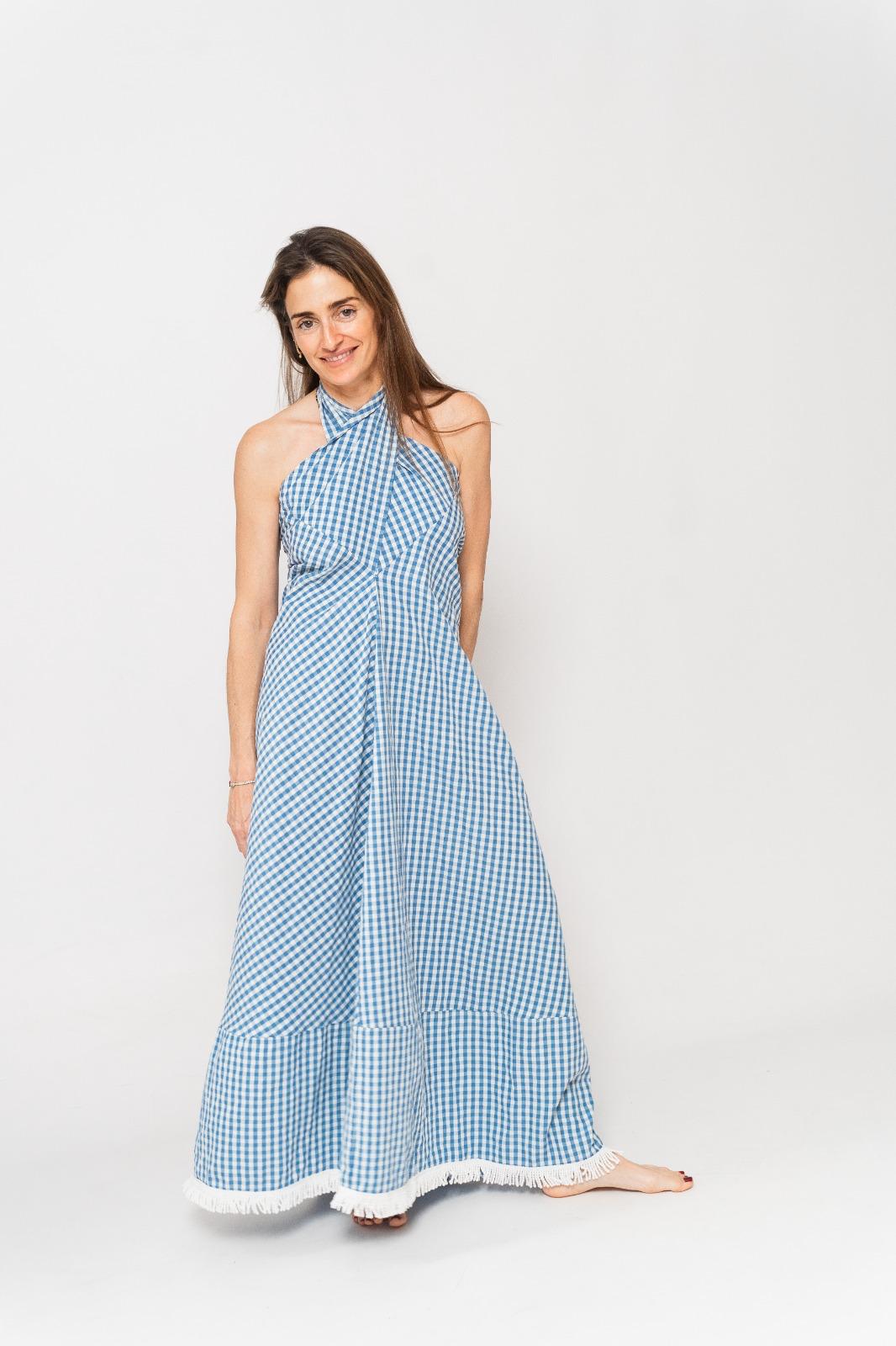 Vestido halter de cuadros vichy, combinado con ribete de flecos blanco crudo en el bajo. El tejido es 100% algodón.