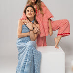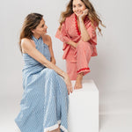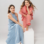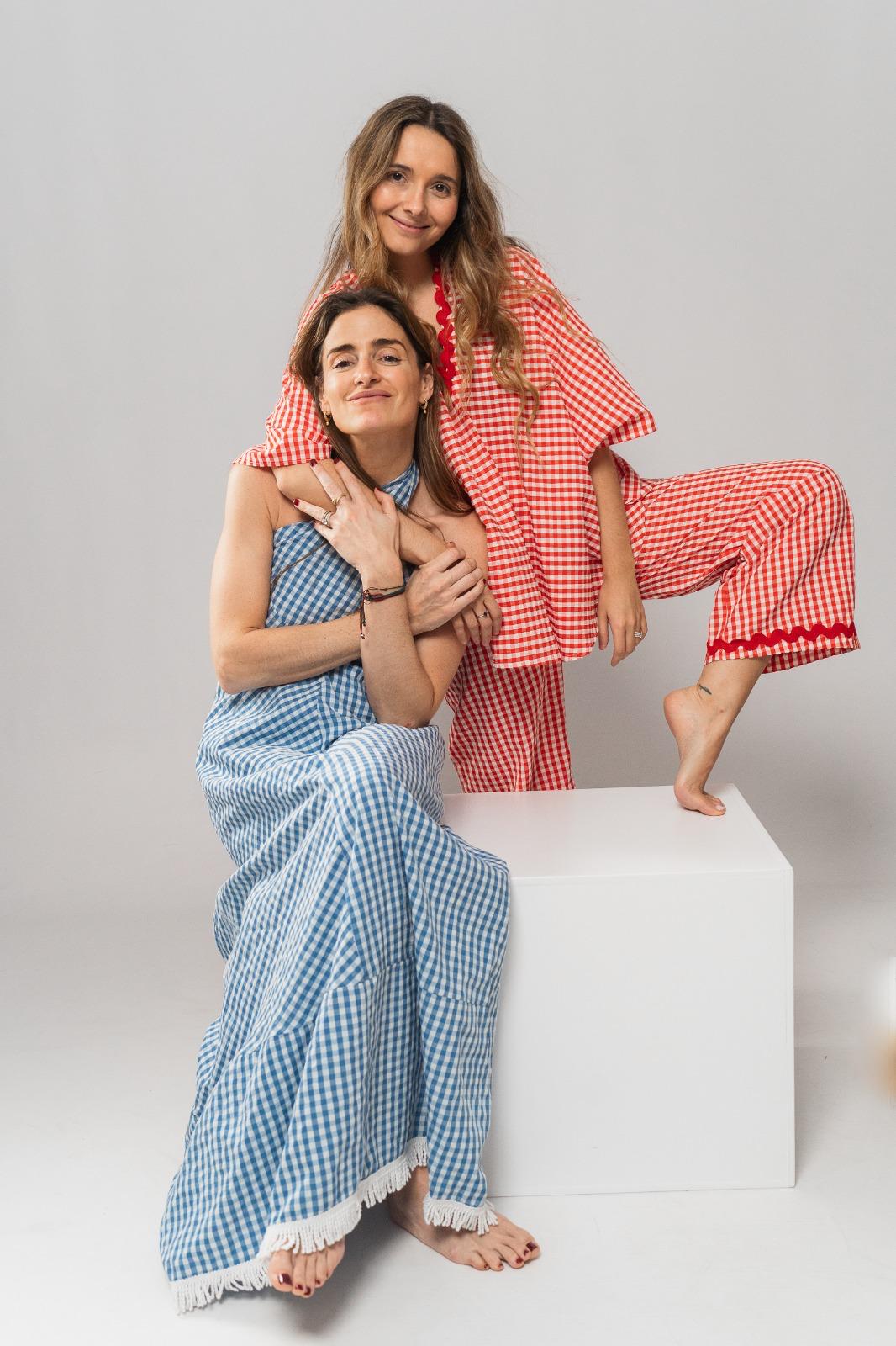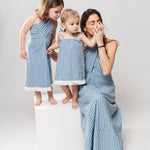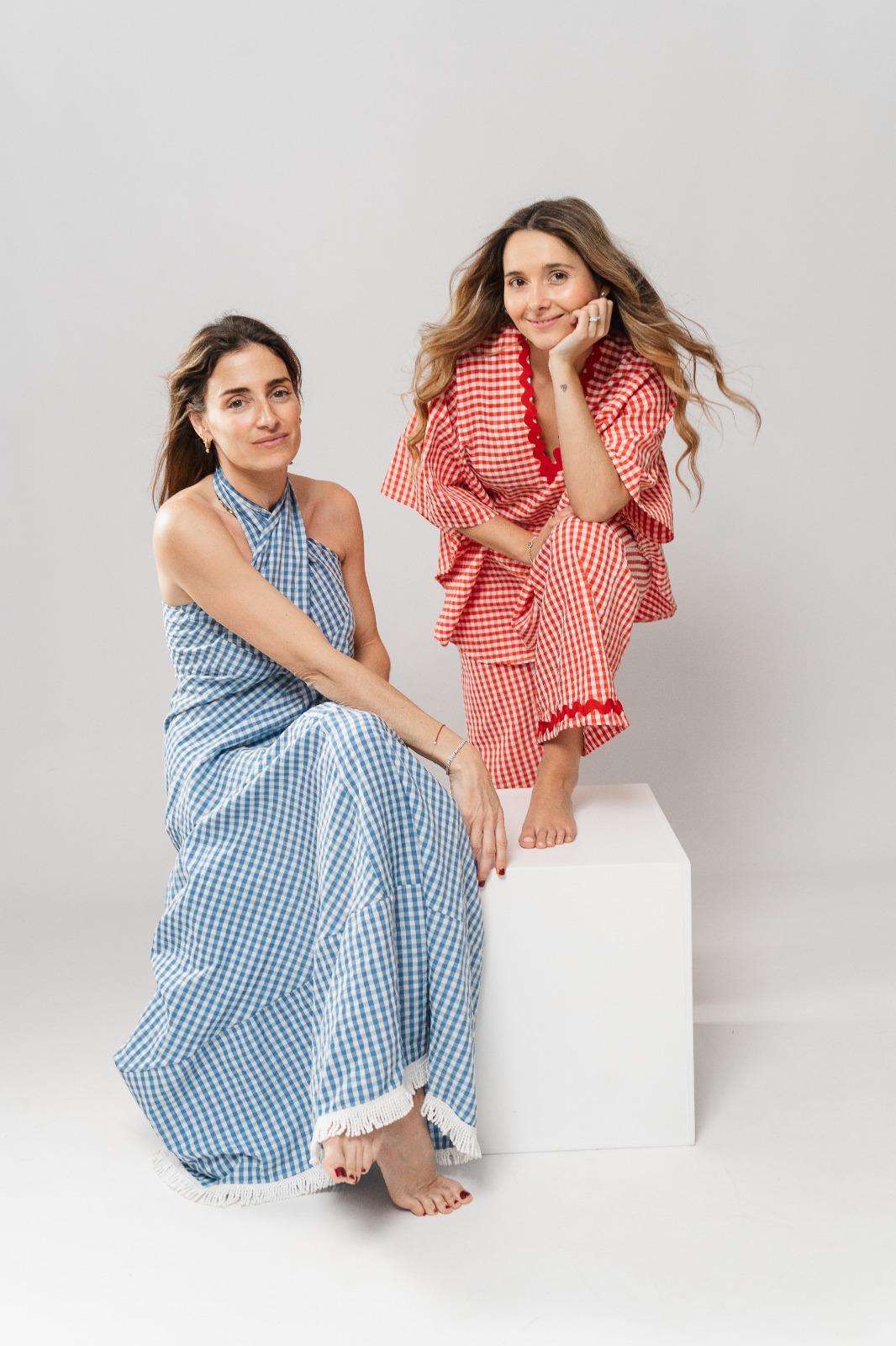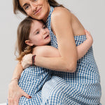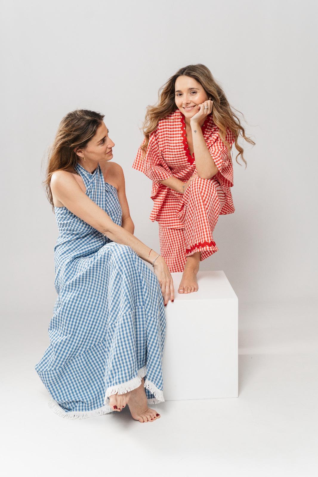 Vestido halter de cuadros vichy, combinado con ribete de flecos blanco crudo en el bajo. El tejido es 100% algodón.