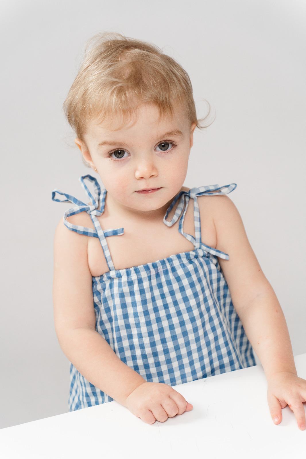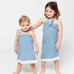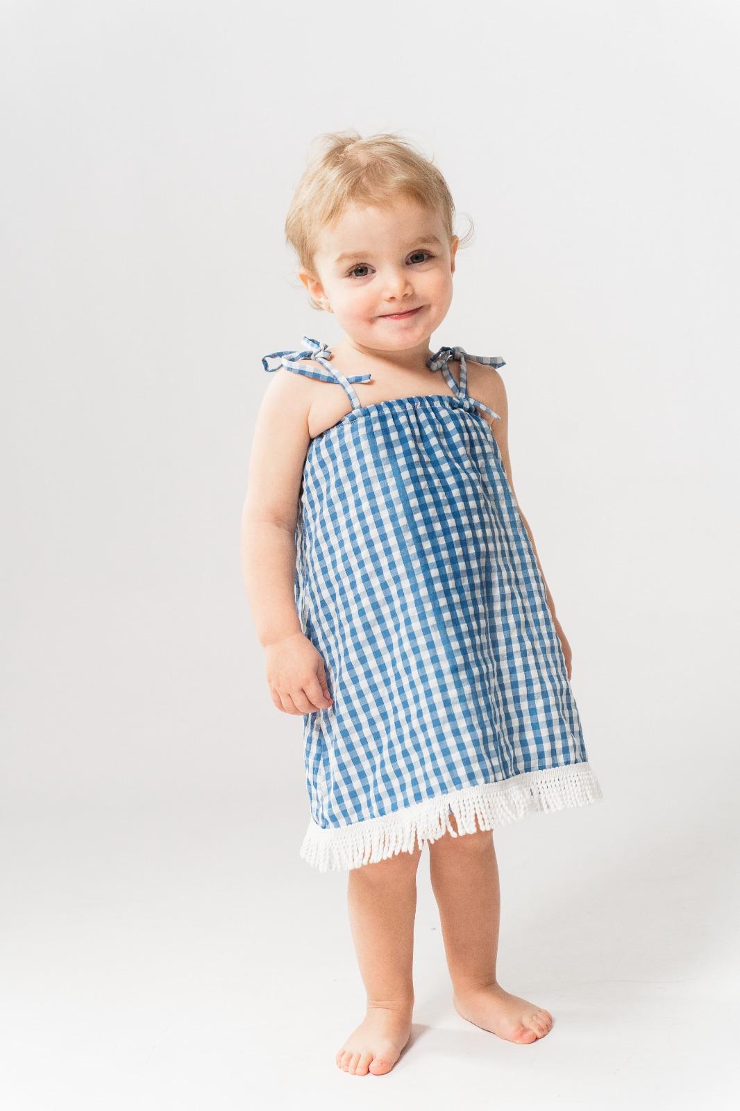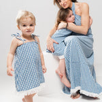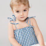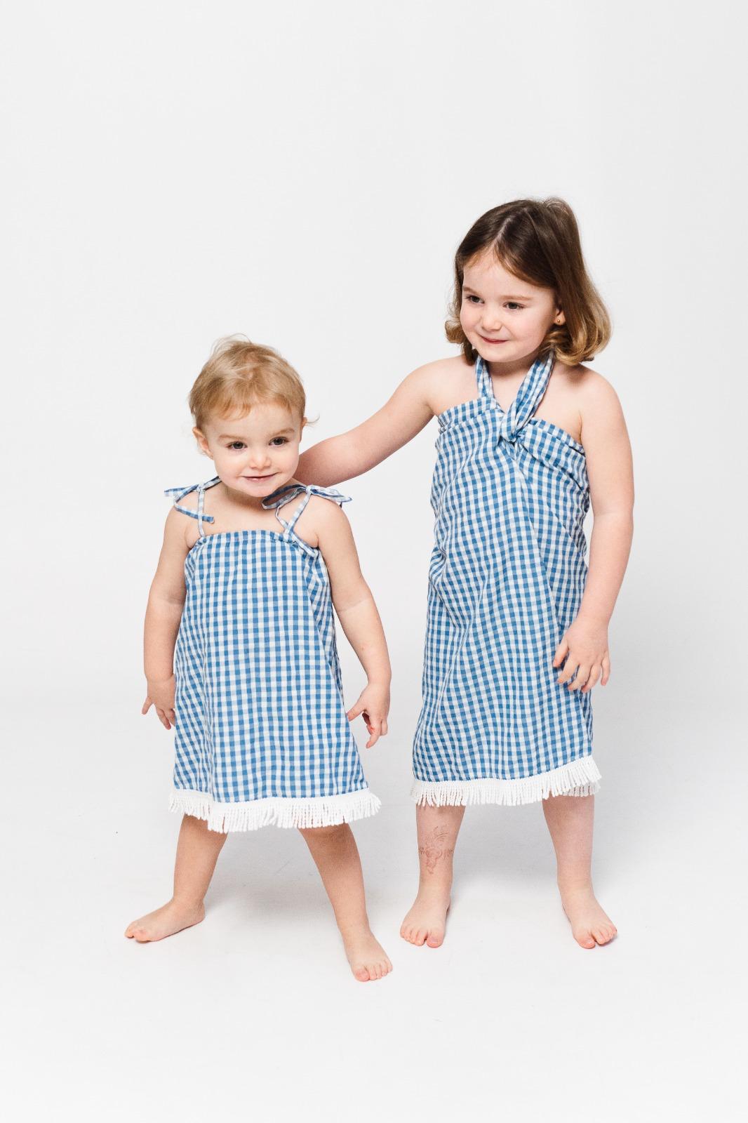 Vestido de tirantes de cuadros vichy, combinado con ribete de flecos blanco crudo en el bajo. El tejido es 100% algodón.