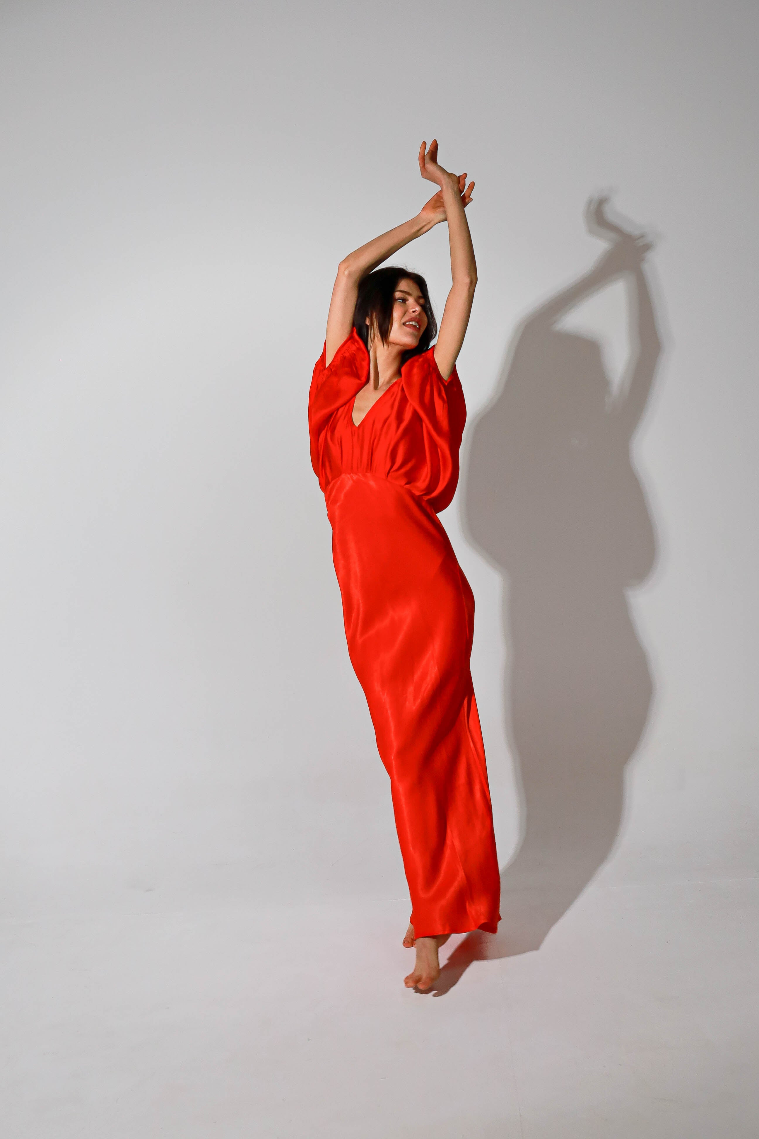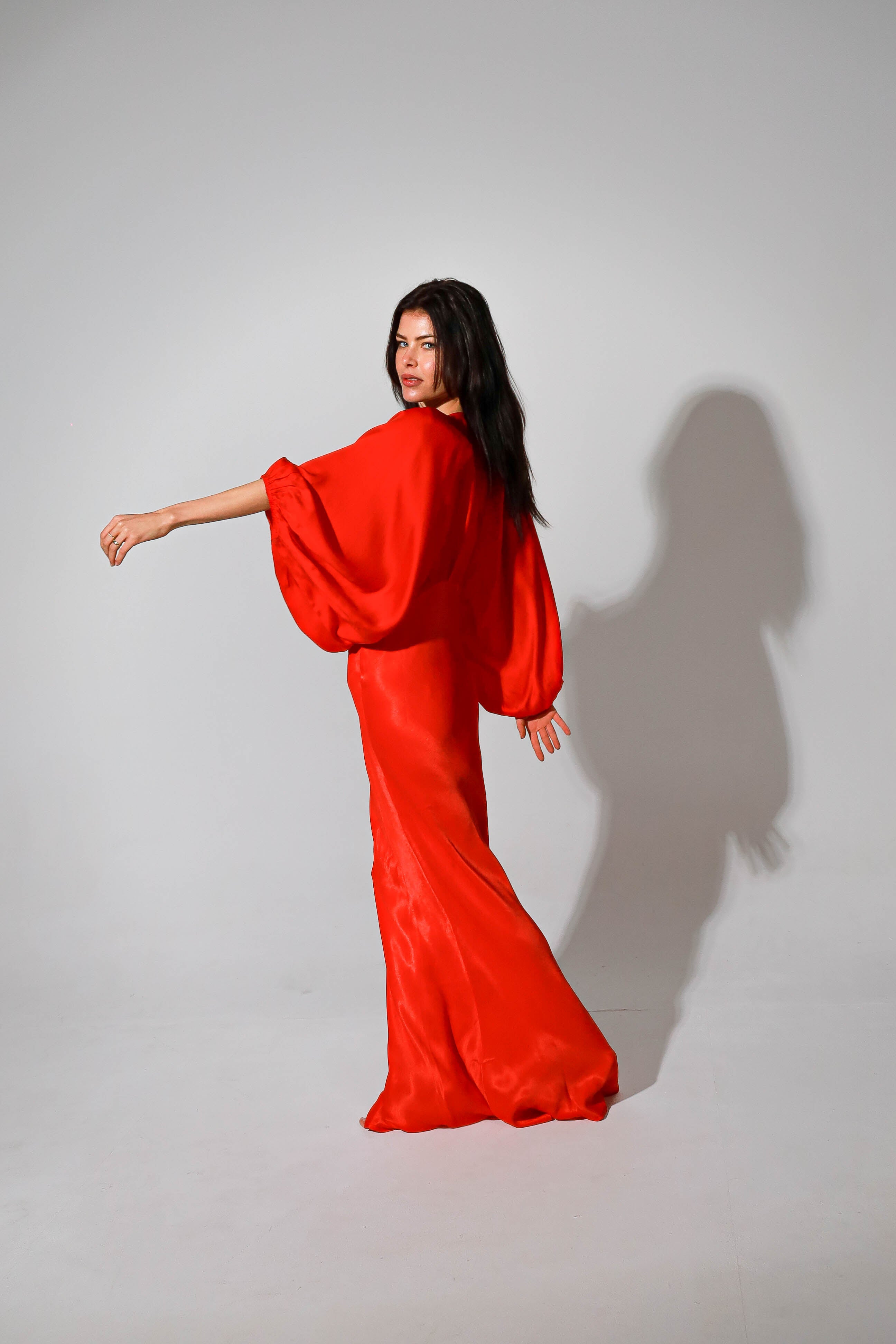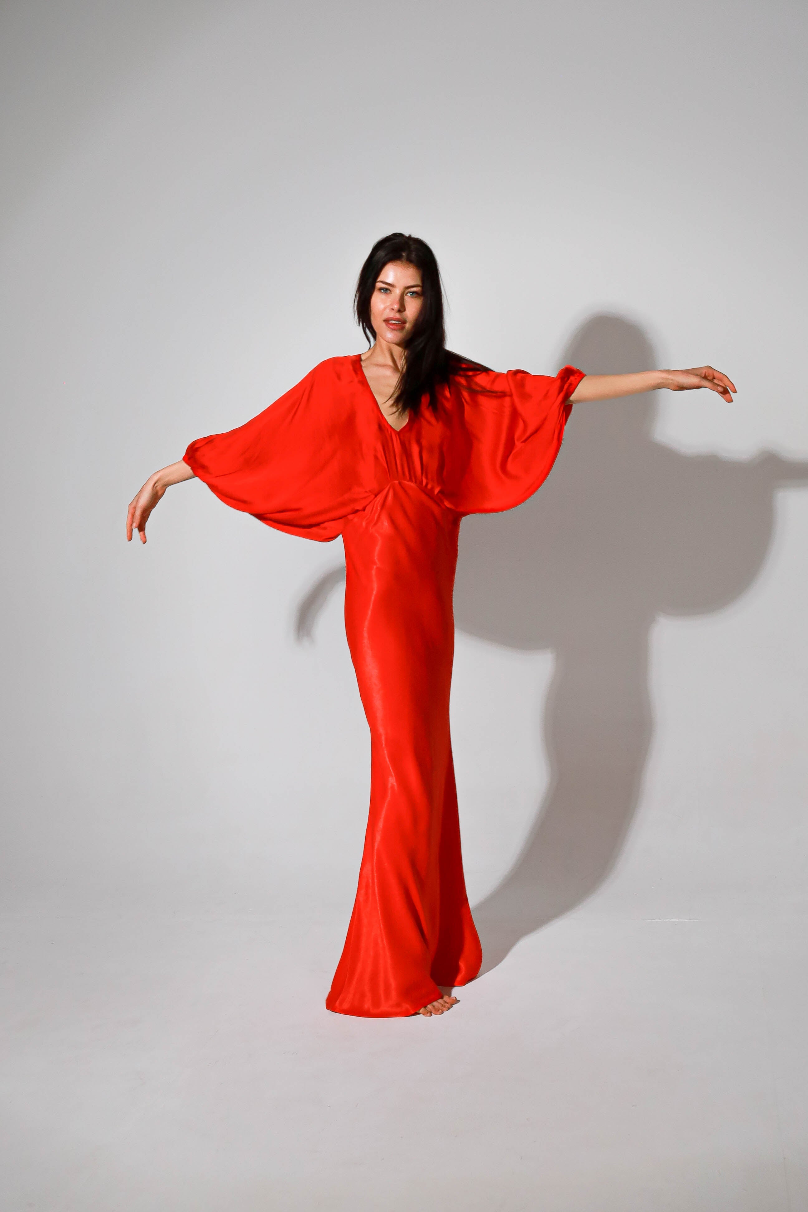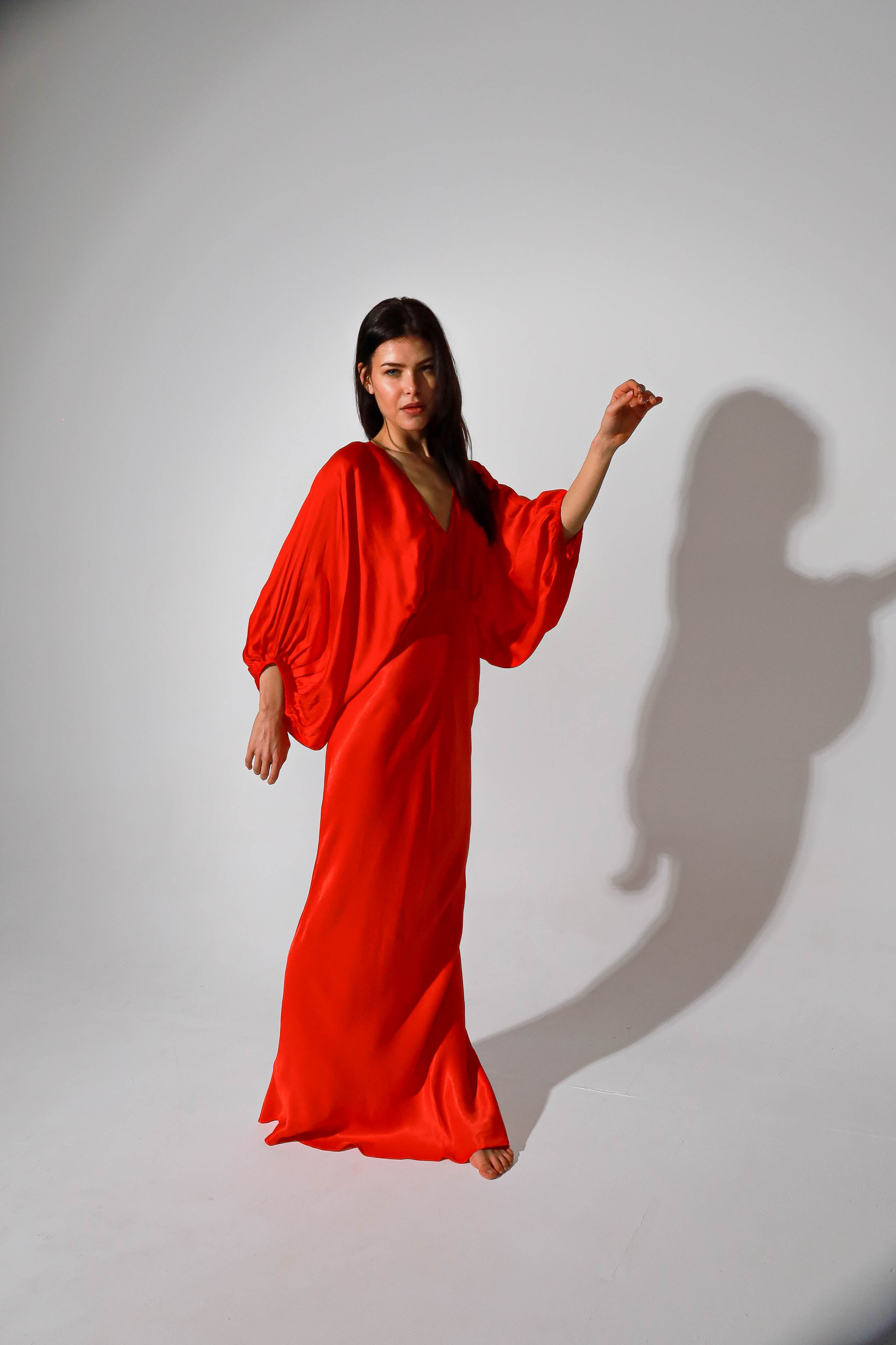 Vestido largo al bies, forma de cuerpo sirena. Escote en V y manga con detalle de goma fruncida.