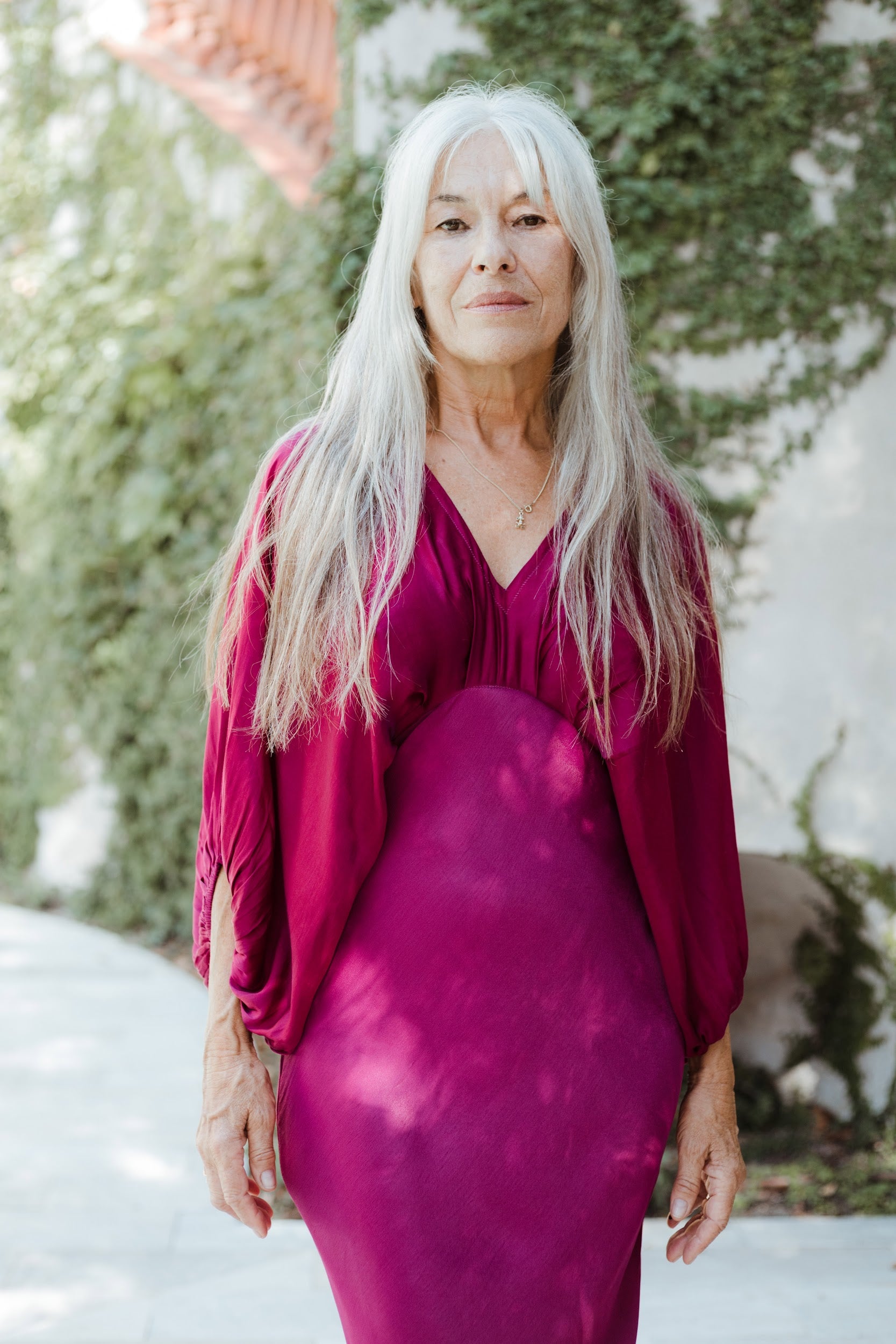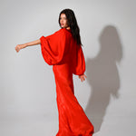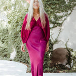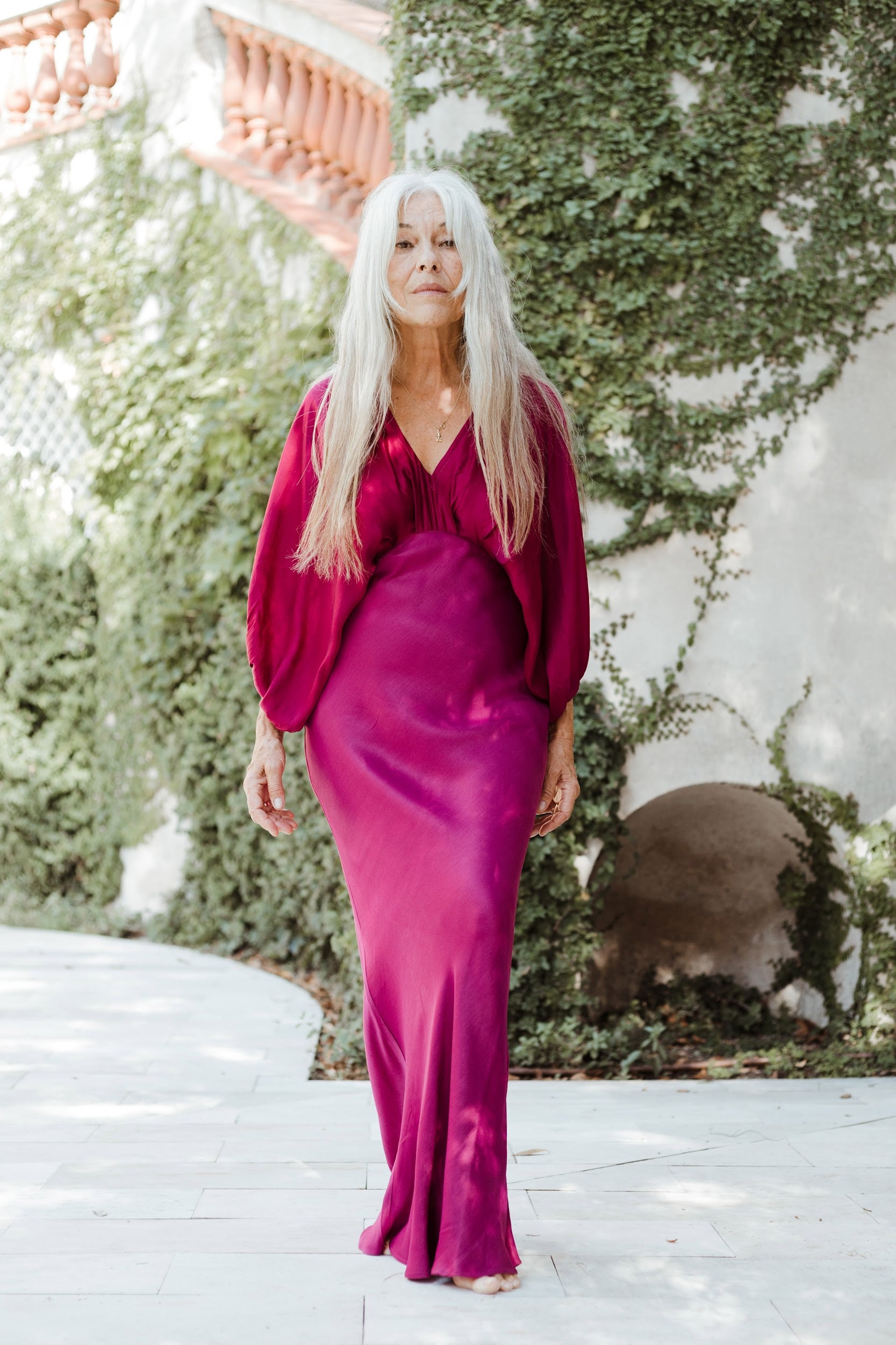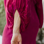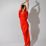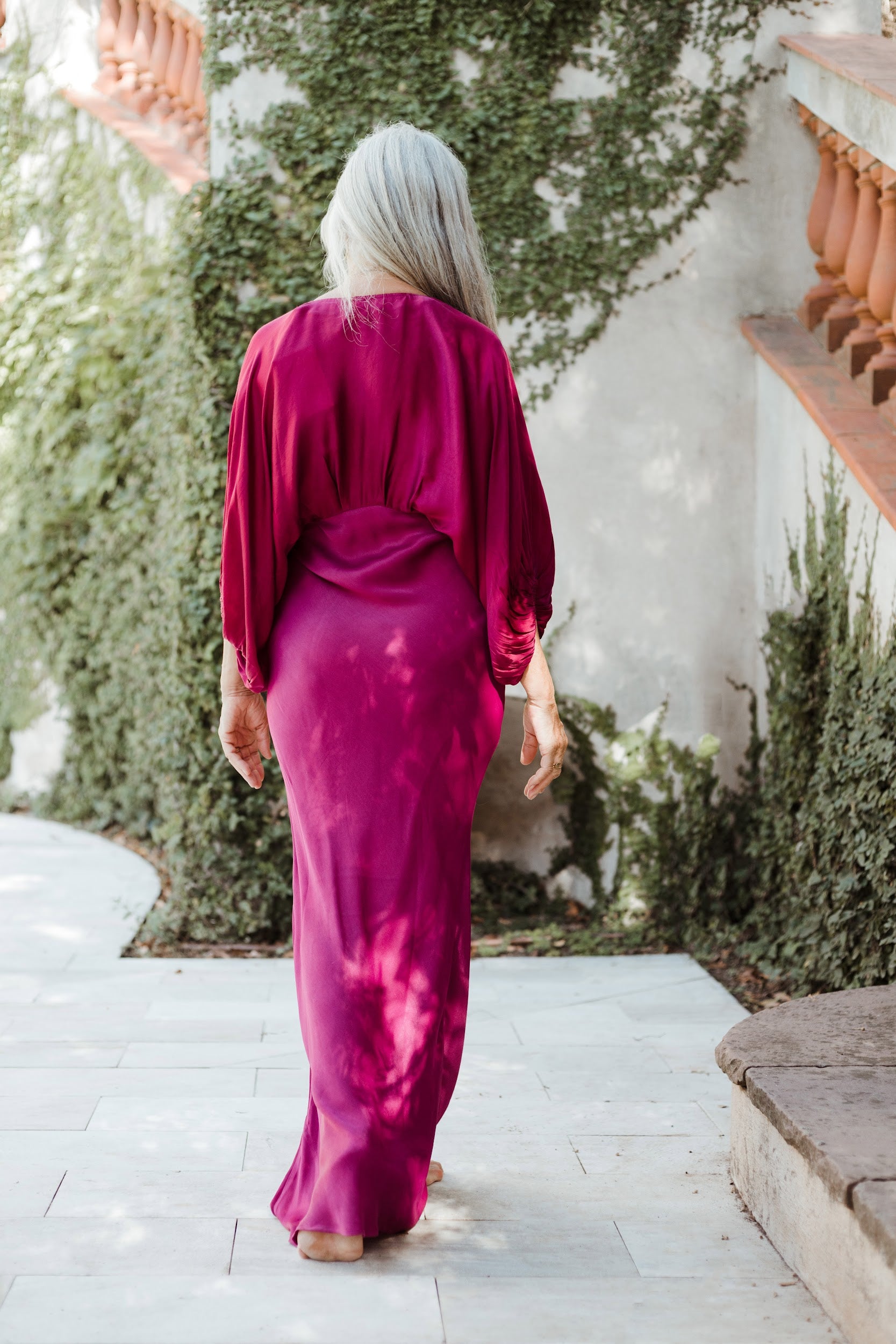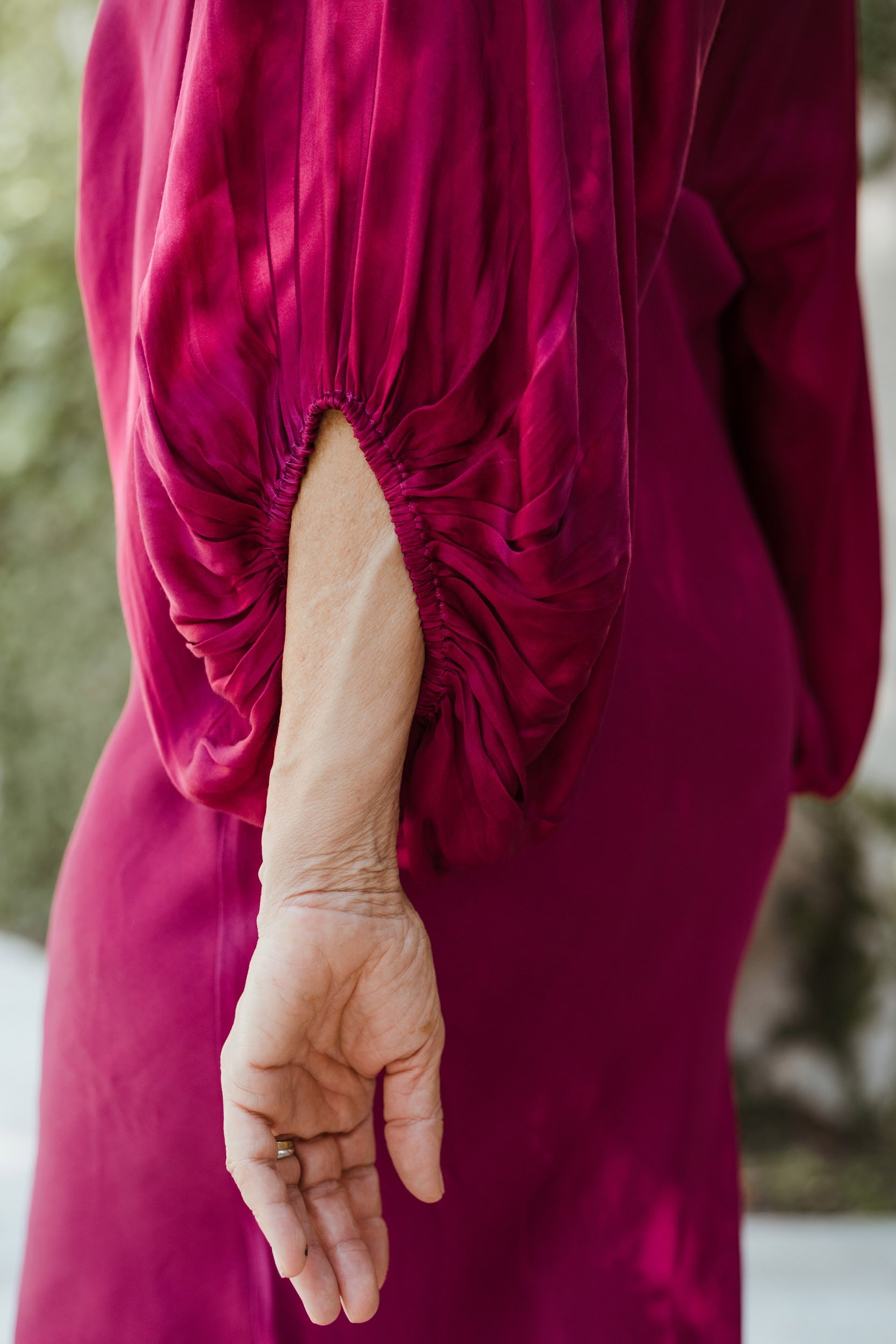 Vestido largo al bies, forma de cuerpo sirena. Escote en V y manga con detalle de goma fruncida.