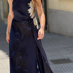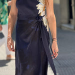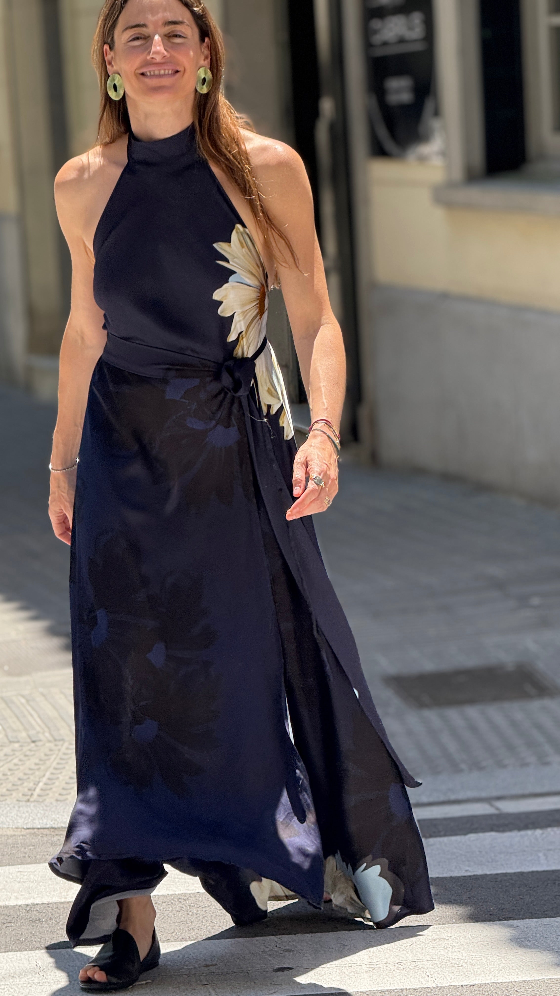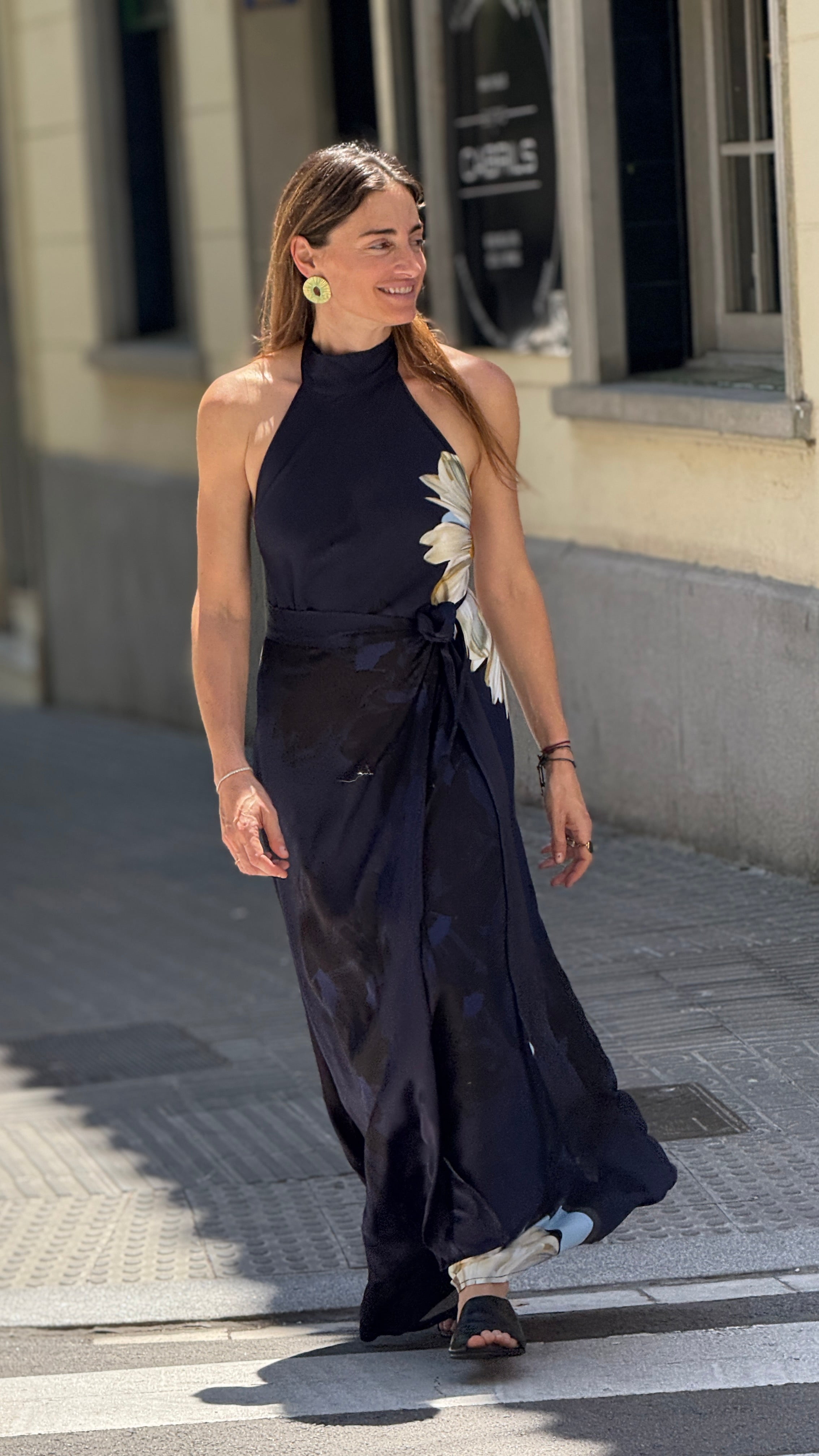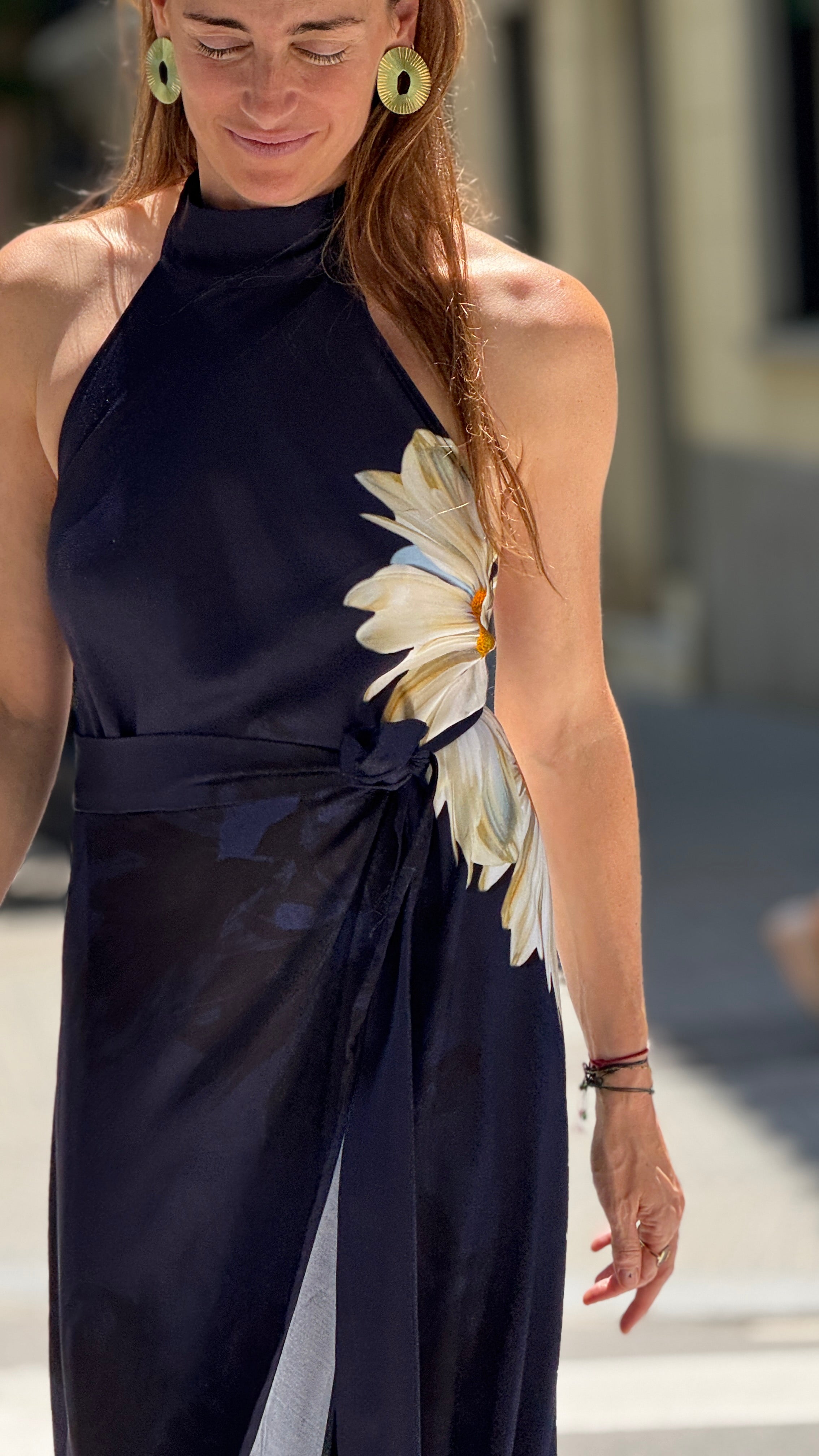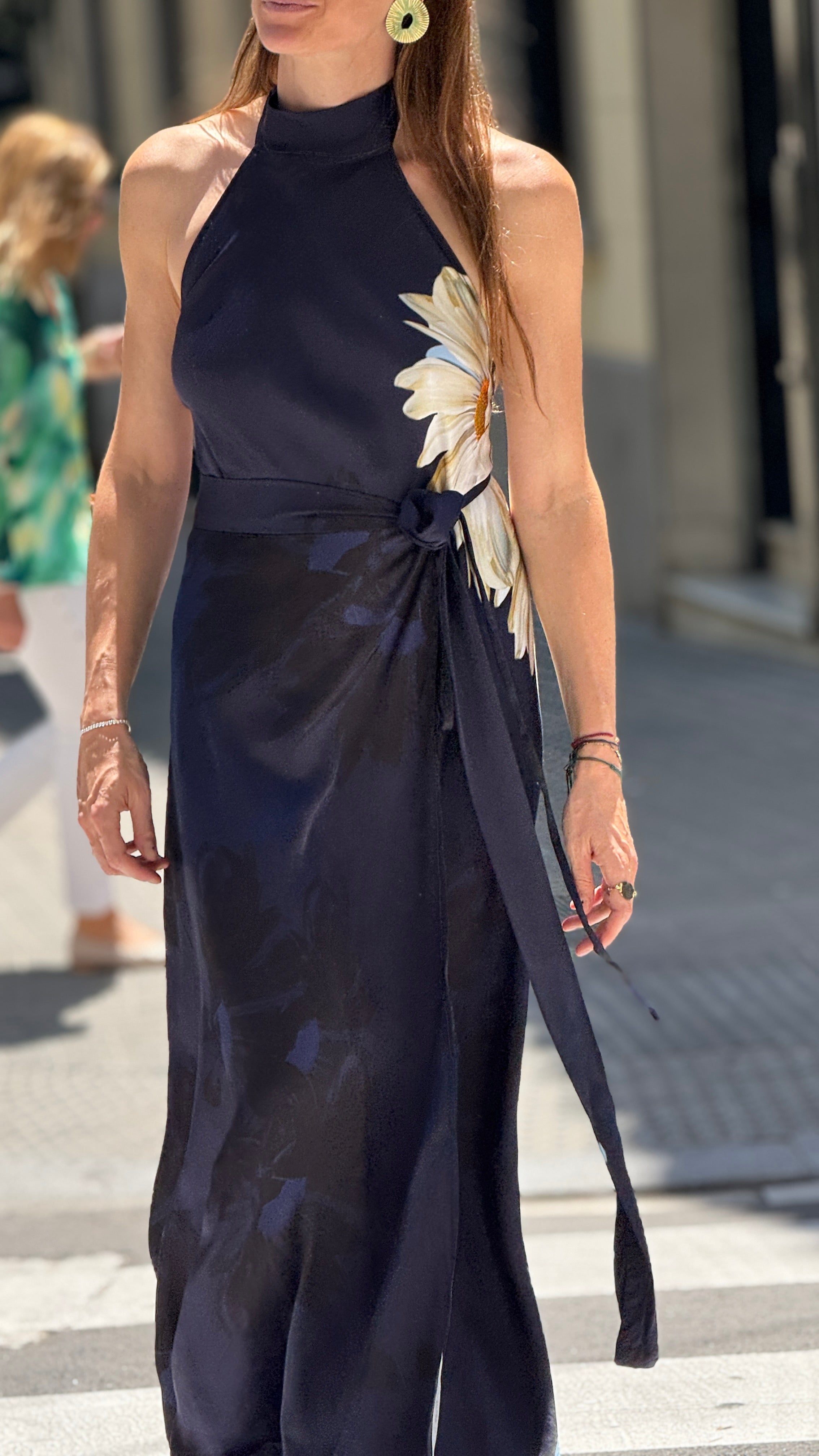 Vestido largo de cuello halter oscuro con detalle de estampado margarita. Abarca una talla S hasta una L.