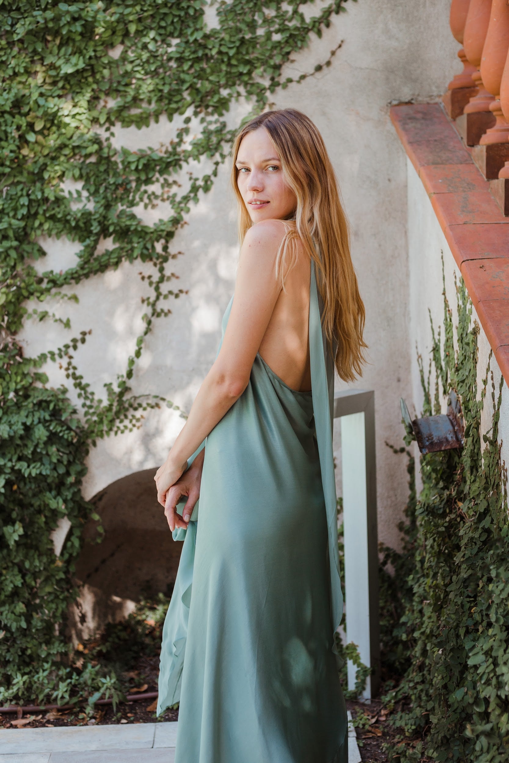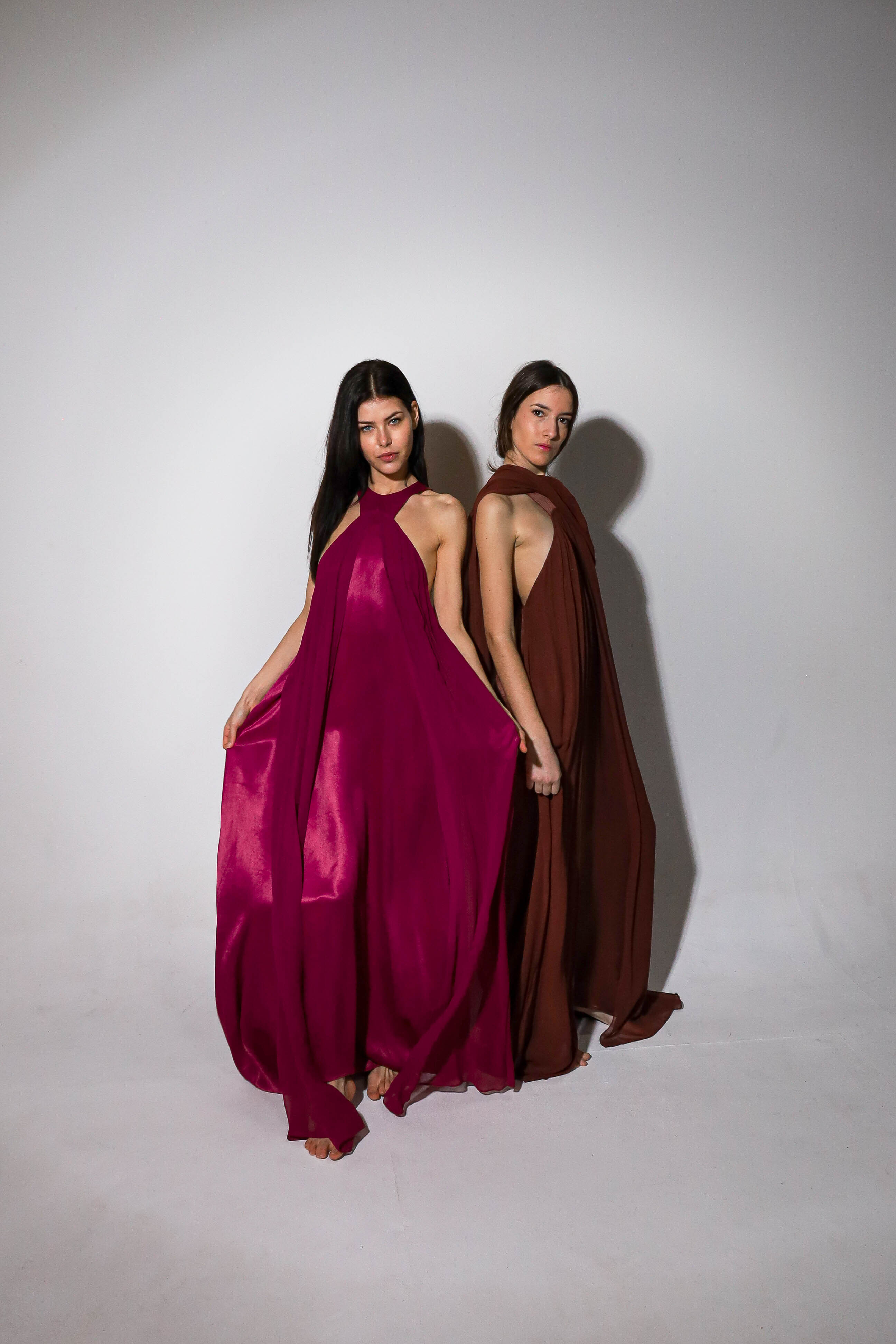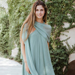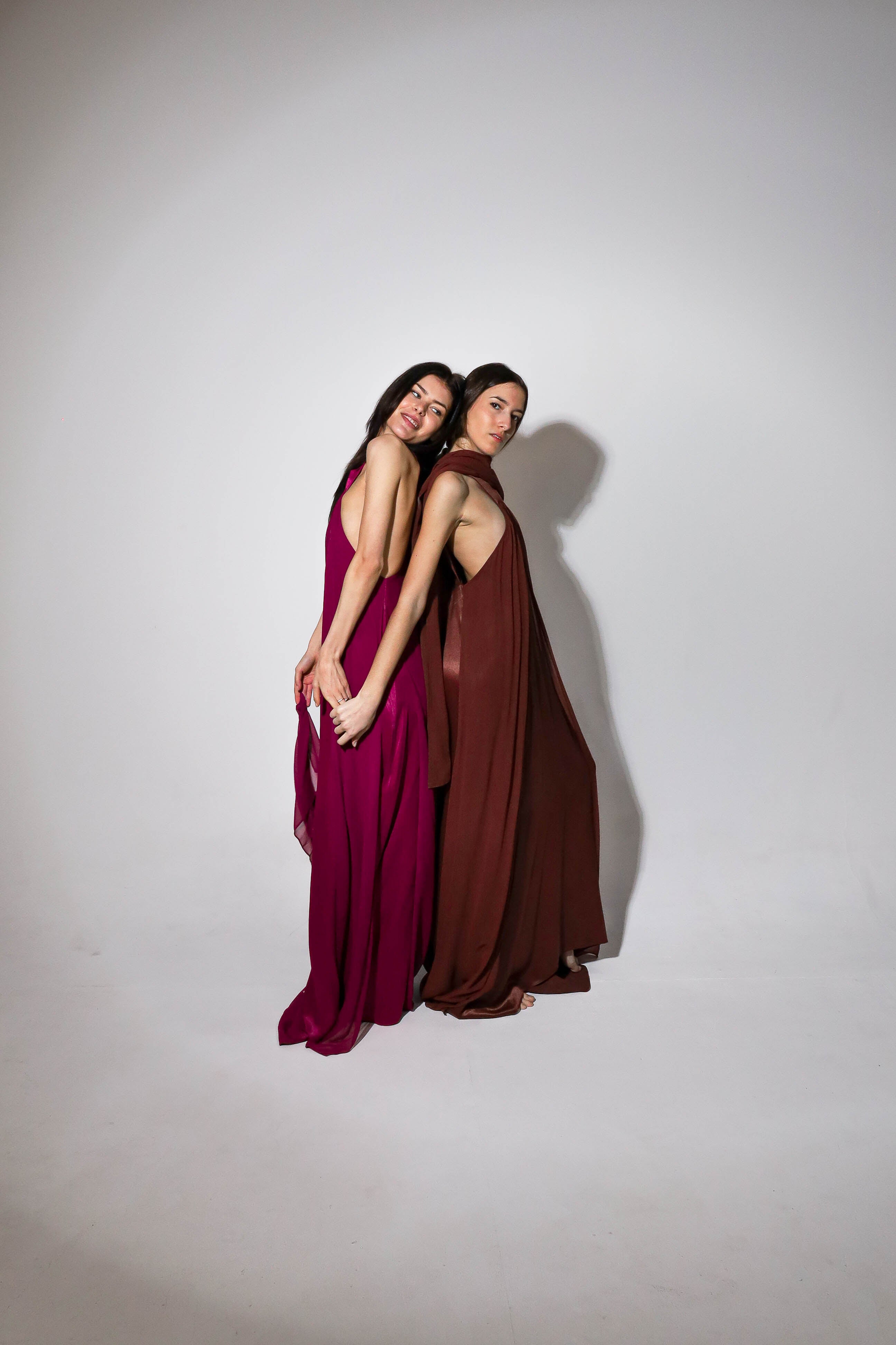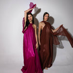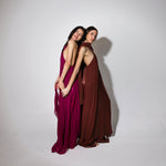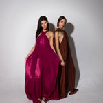 Vestido largo de cuello halter y espalda escotada. Cuenta con dos gasas incorporadas en el vestido para cubrir hombros o anudar a la cintura. Talla única: abarca desde una 34 hasta la talla 42.