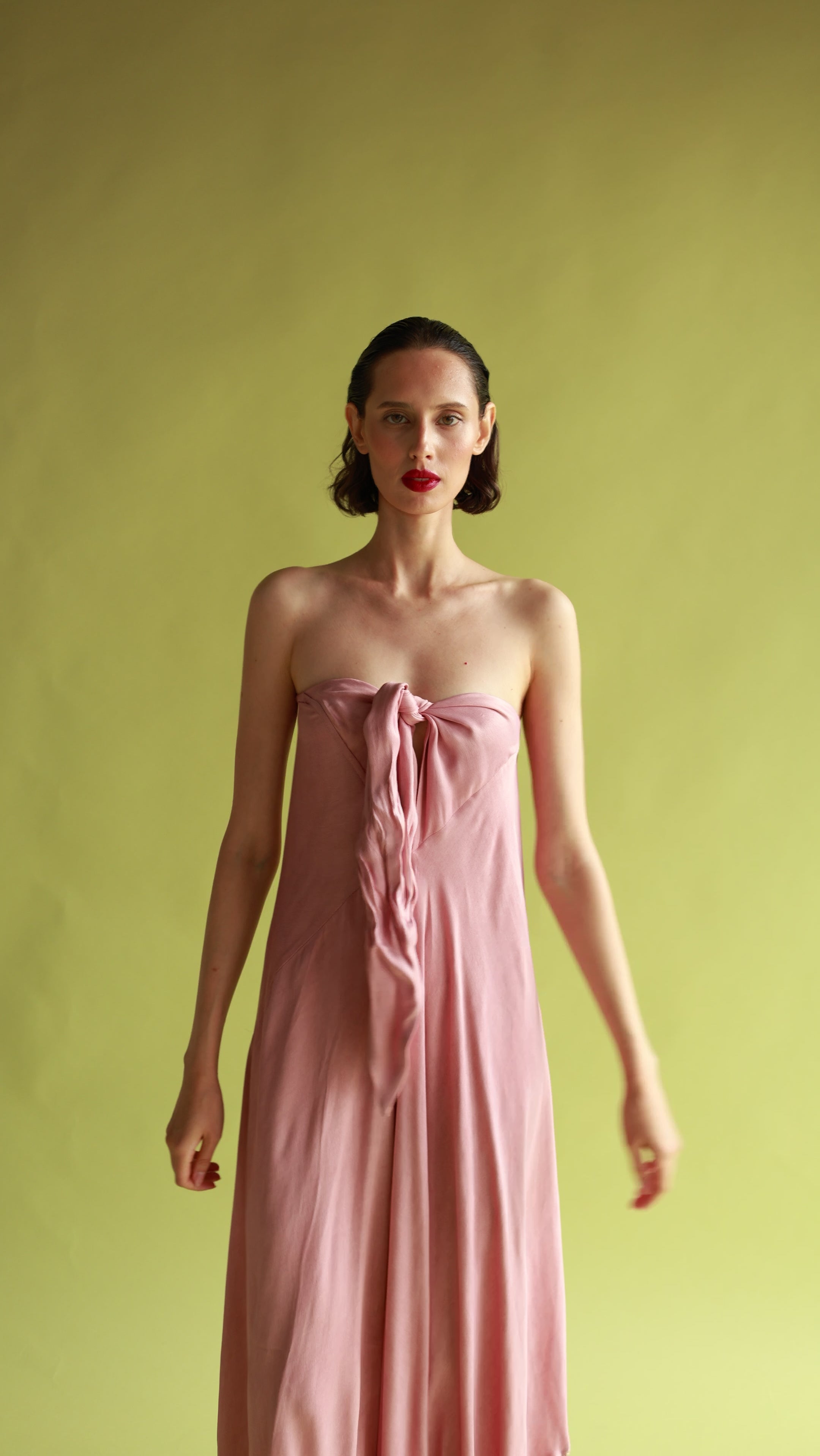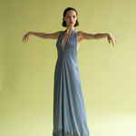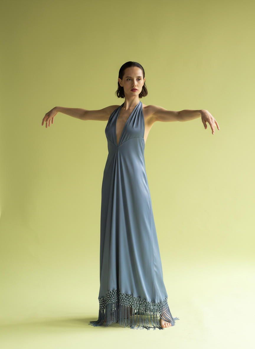 Uno de los cortes icono de MariaRoch, confeccionado en crep de viscosa. Este diseño destaca por la versatilidad de sus tiras, que pueden usarse de forma tradicional o cruzadas para transformar el escote y la espalda. Su silueta envolvente se remata con el detalle de flecos en el bajo, que acentúan el movimiento rítmico de este patrón clásico de la firma, combinando herencia e innovación en una sola pieza.