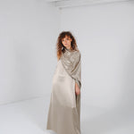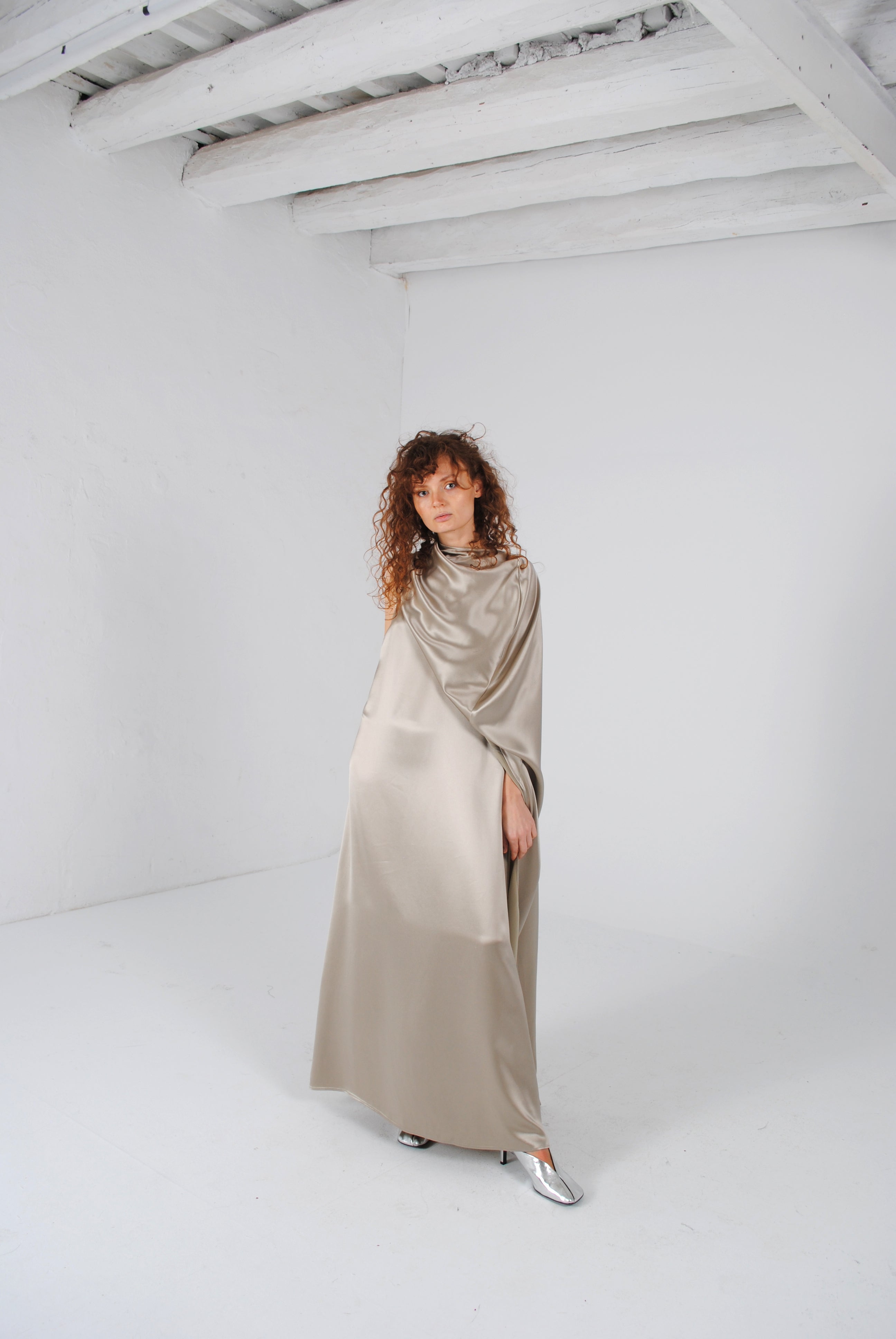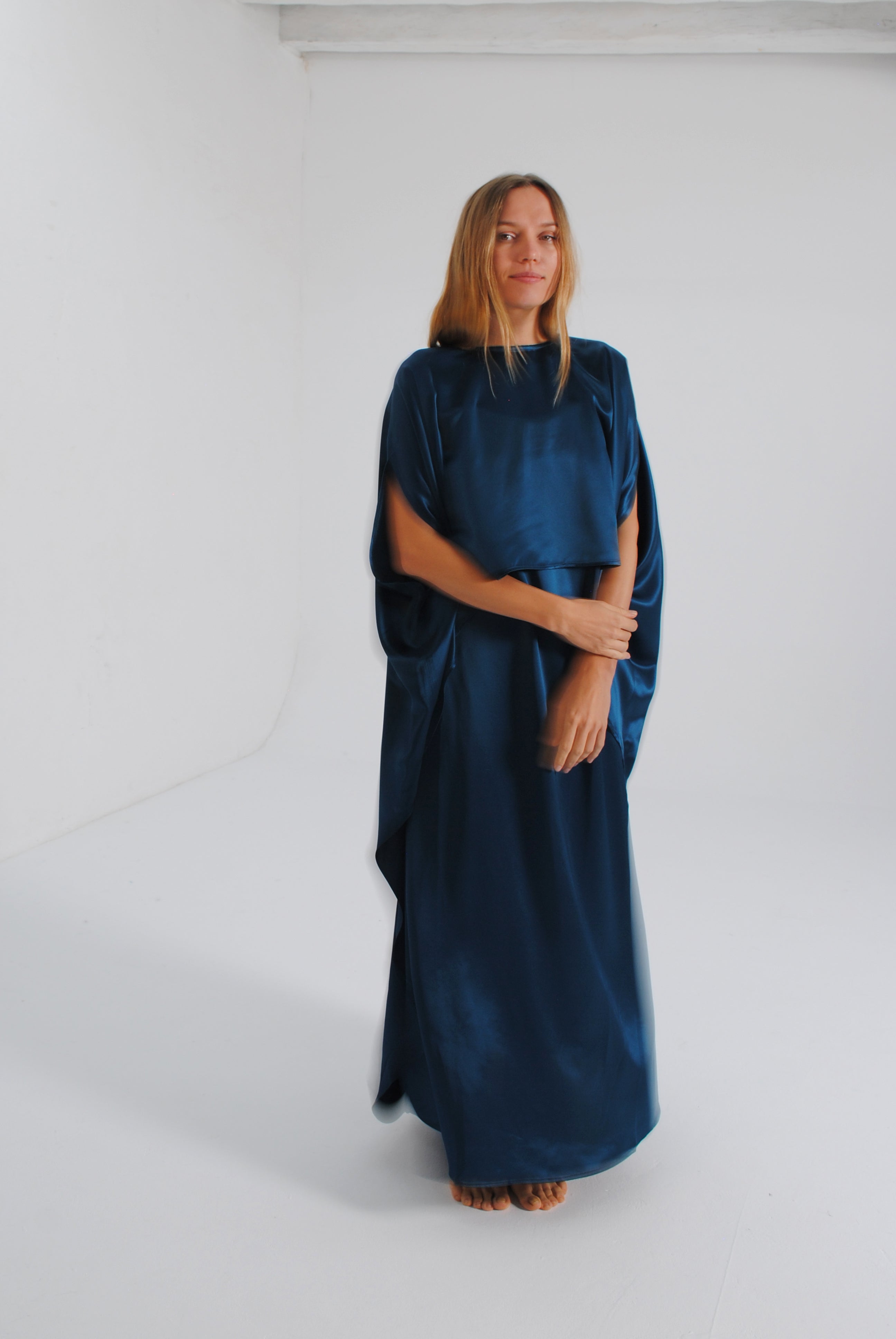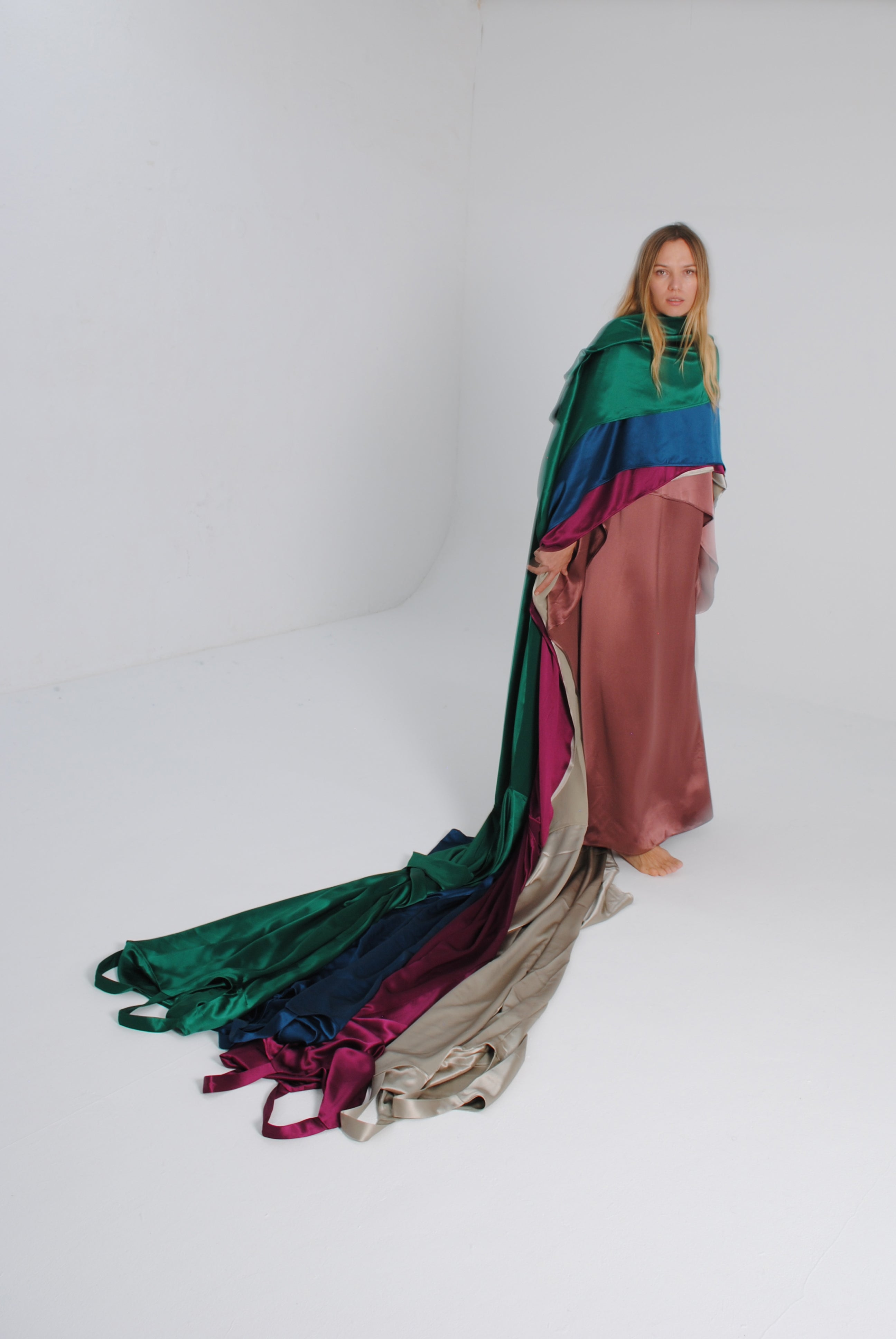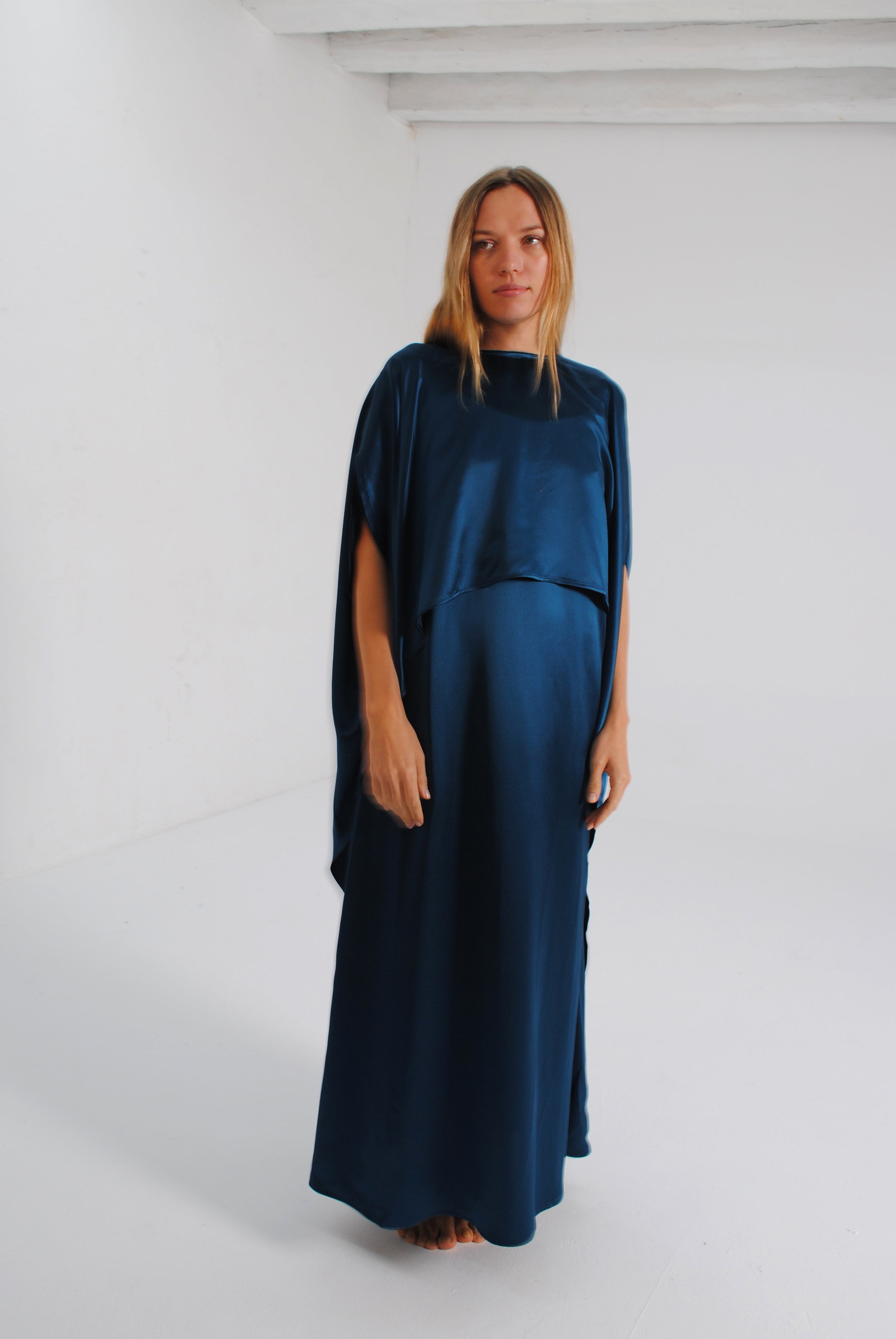 Vestido largo satinado. El cuerpo es un vestido lencero evasé con tirante ancho y cosido a él una maxi capa, del mismo tejido, que nos recuerda a una vela. Cuello redondeado y manga sisa que cubre los hombros. Un vestido ICON MariaRoch atemporal. La S/M abarca desde una 34 hasta la talla 38, la M/L abarca desde una 38 hasta la talla 42.