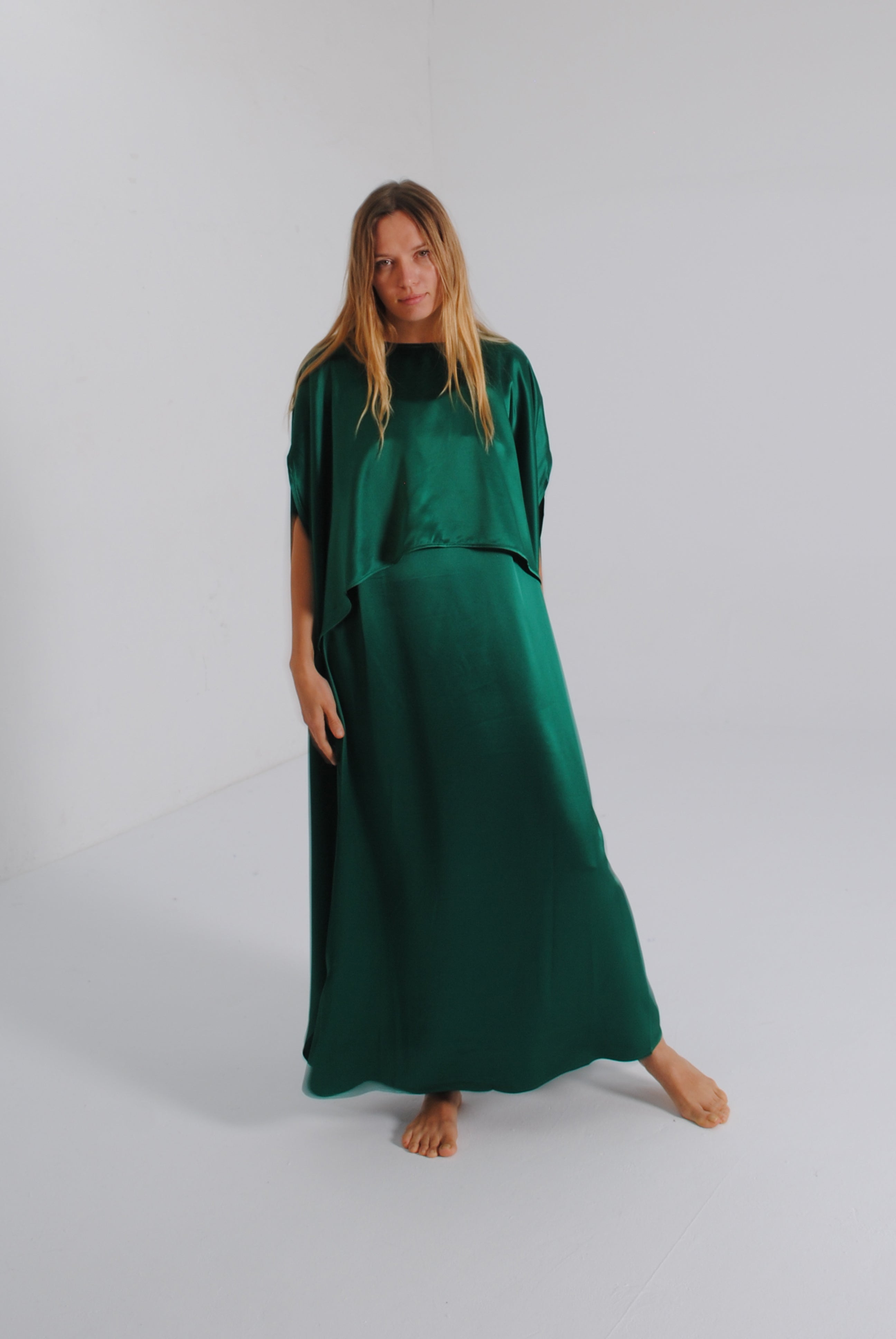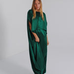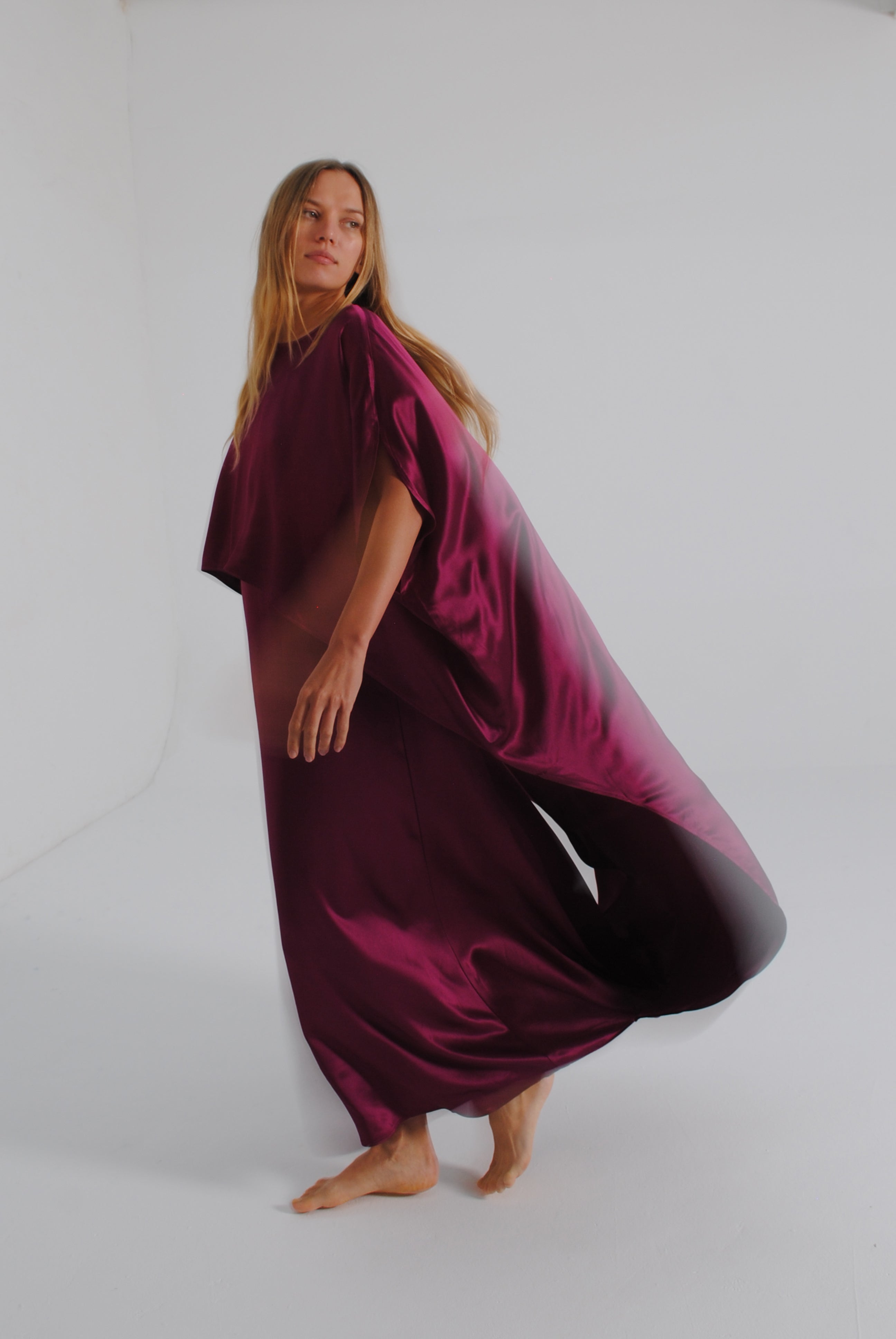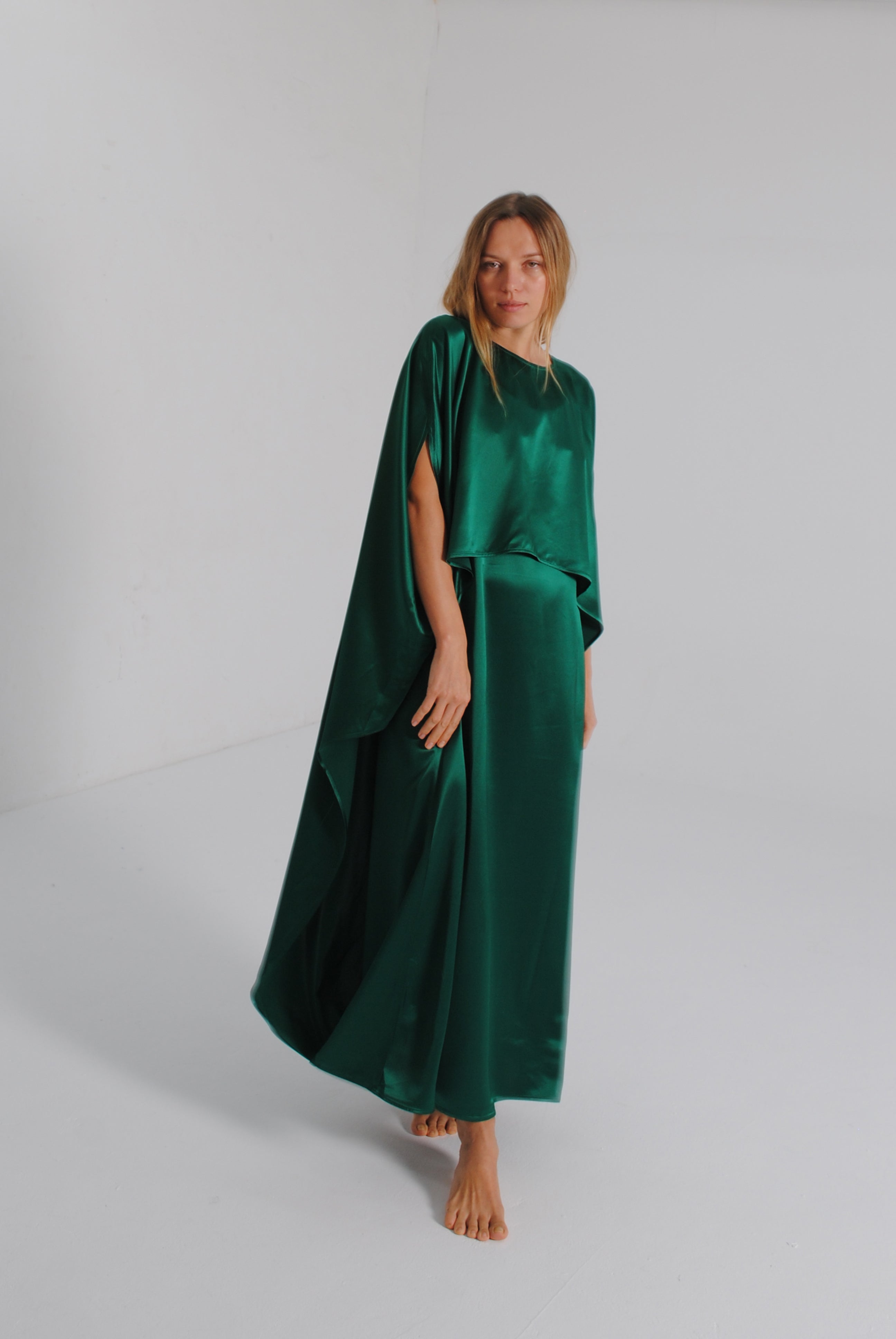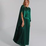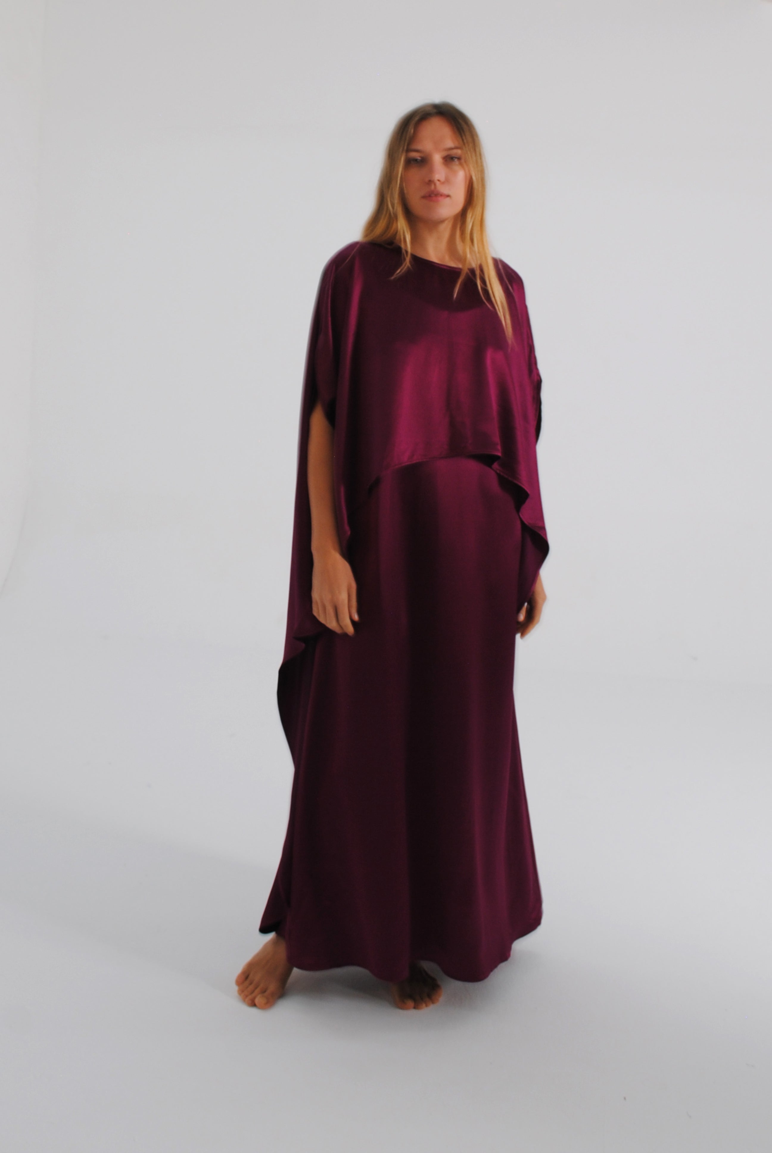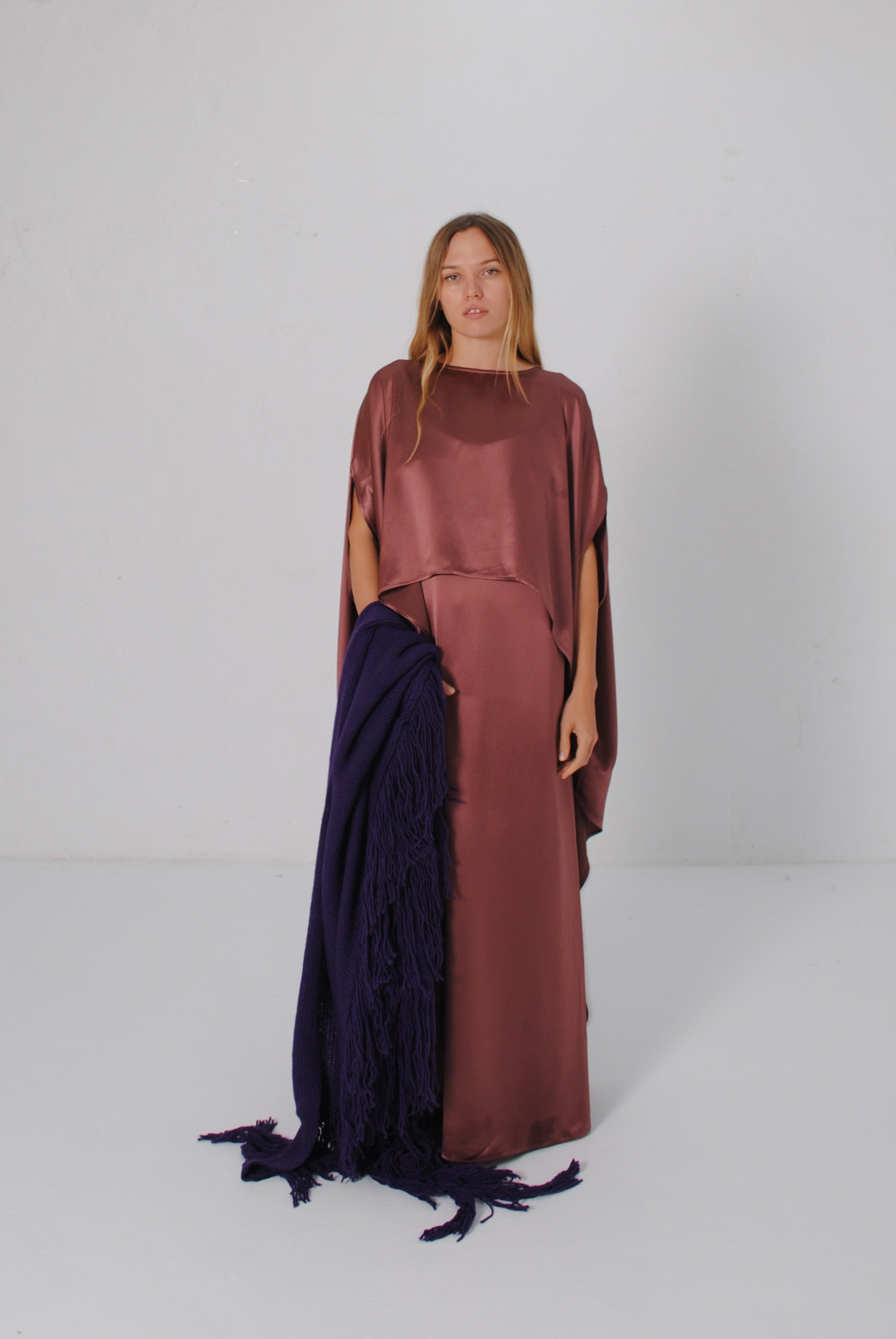 Vestido largo satinado. El cuerpo es un vestido lencero evasé con tirante ancho y cosido a él una maxi capa, del mismo tejido, que nos recuerda a una vela. Cuello redondeado y manga sisa que cubre los hombros. Un vestido ICON MariaRoch atemporal. La S/M abarca desde una 34 hasta la talla 38, la M/L abarca desde una 38 hasta la talla 42.