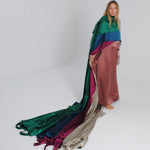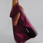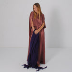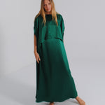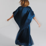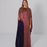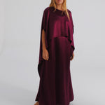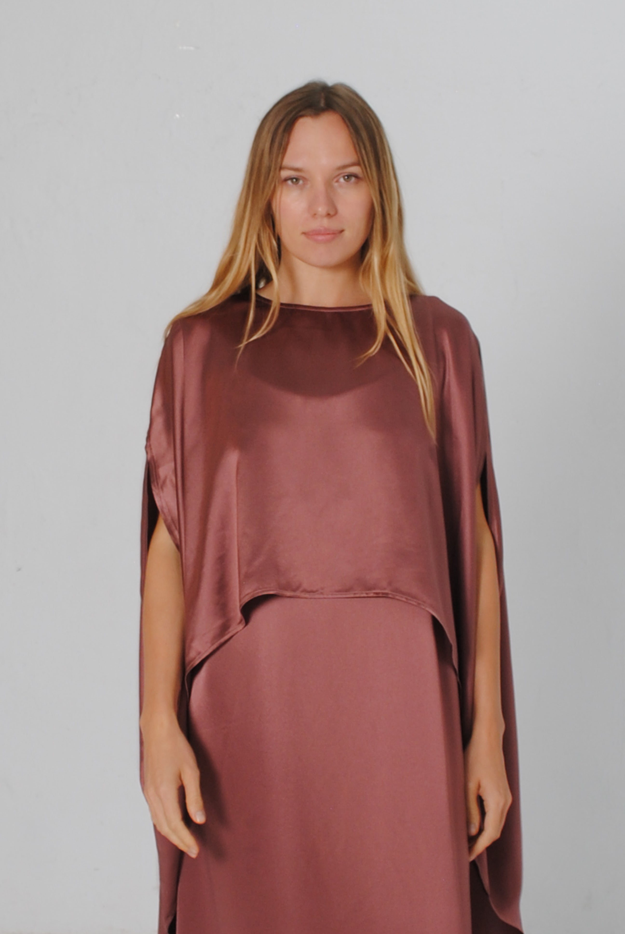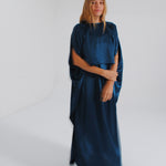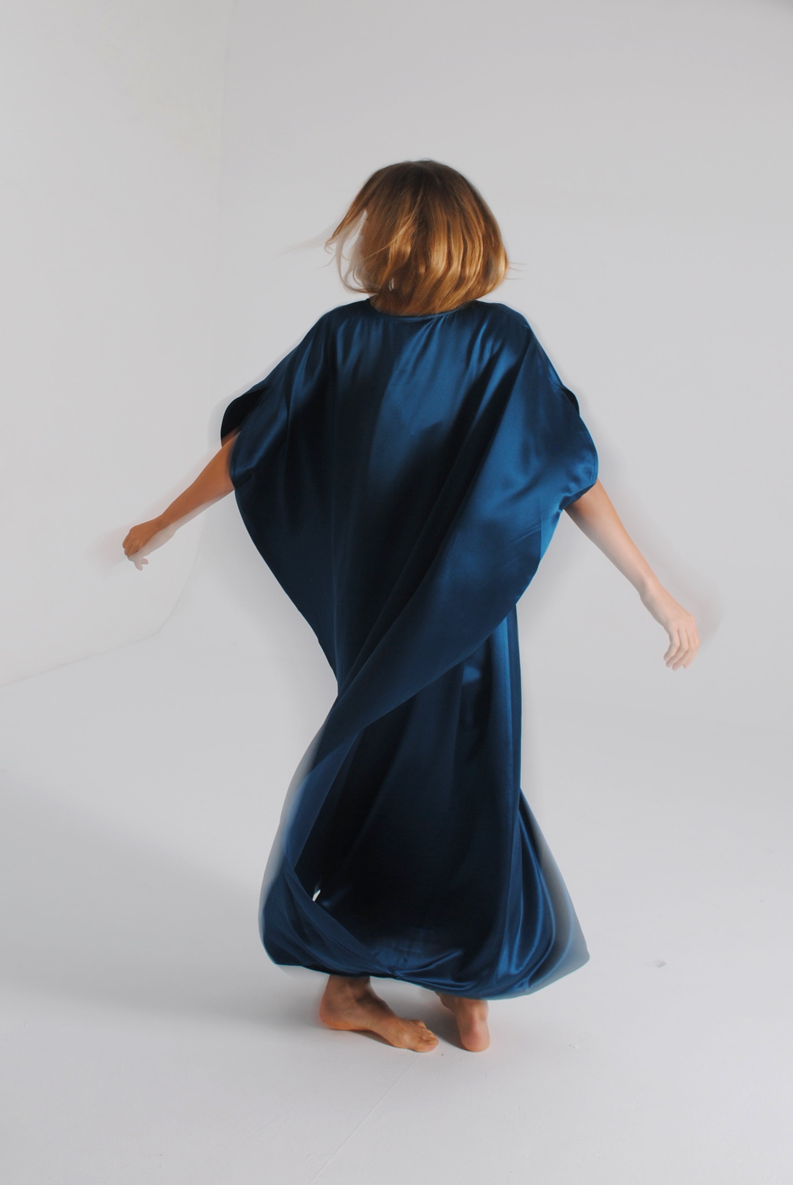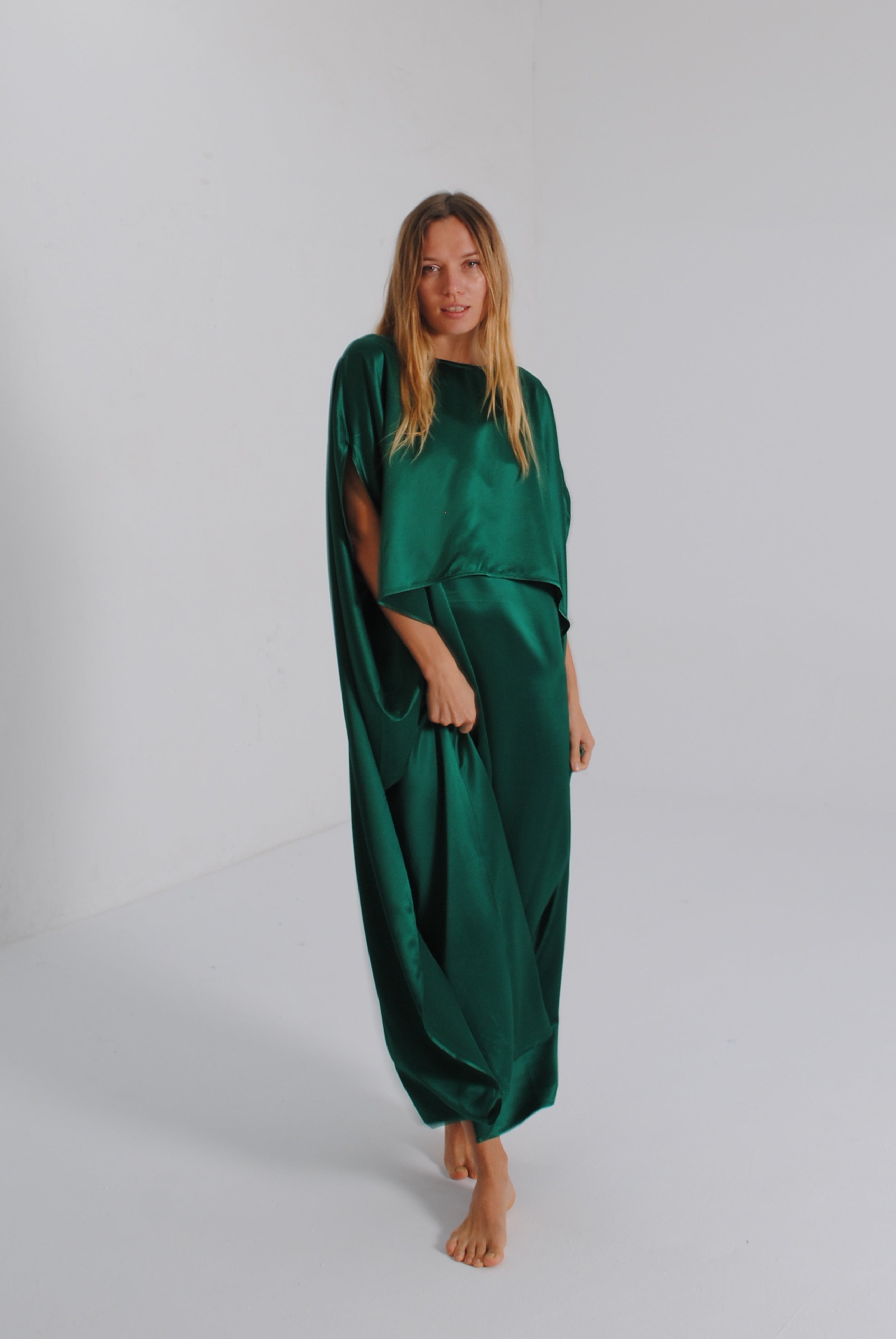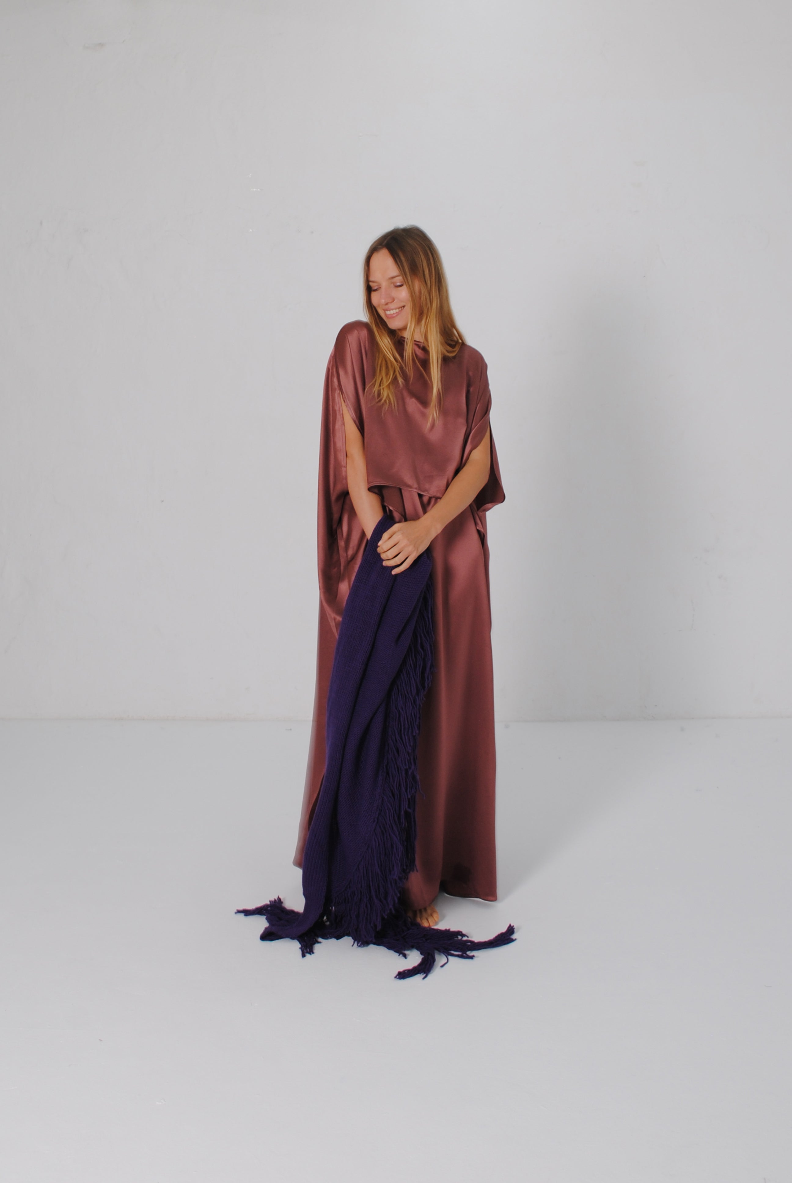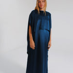 Vestido largo satinado. El cuerpo es un vestido lencero evasé con tirante ancho y cosido a él una maxi capa, del mismo tejido, que nos recuerda a una vela. Cuello redondeado y manga sisa que cubre los hombros. Un vestido ICON MariaRoch atemporal. La S/M abarca desde una 34 hasta la talla 38, la M/L abarca desde una 38 hasta la talla 42.