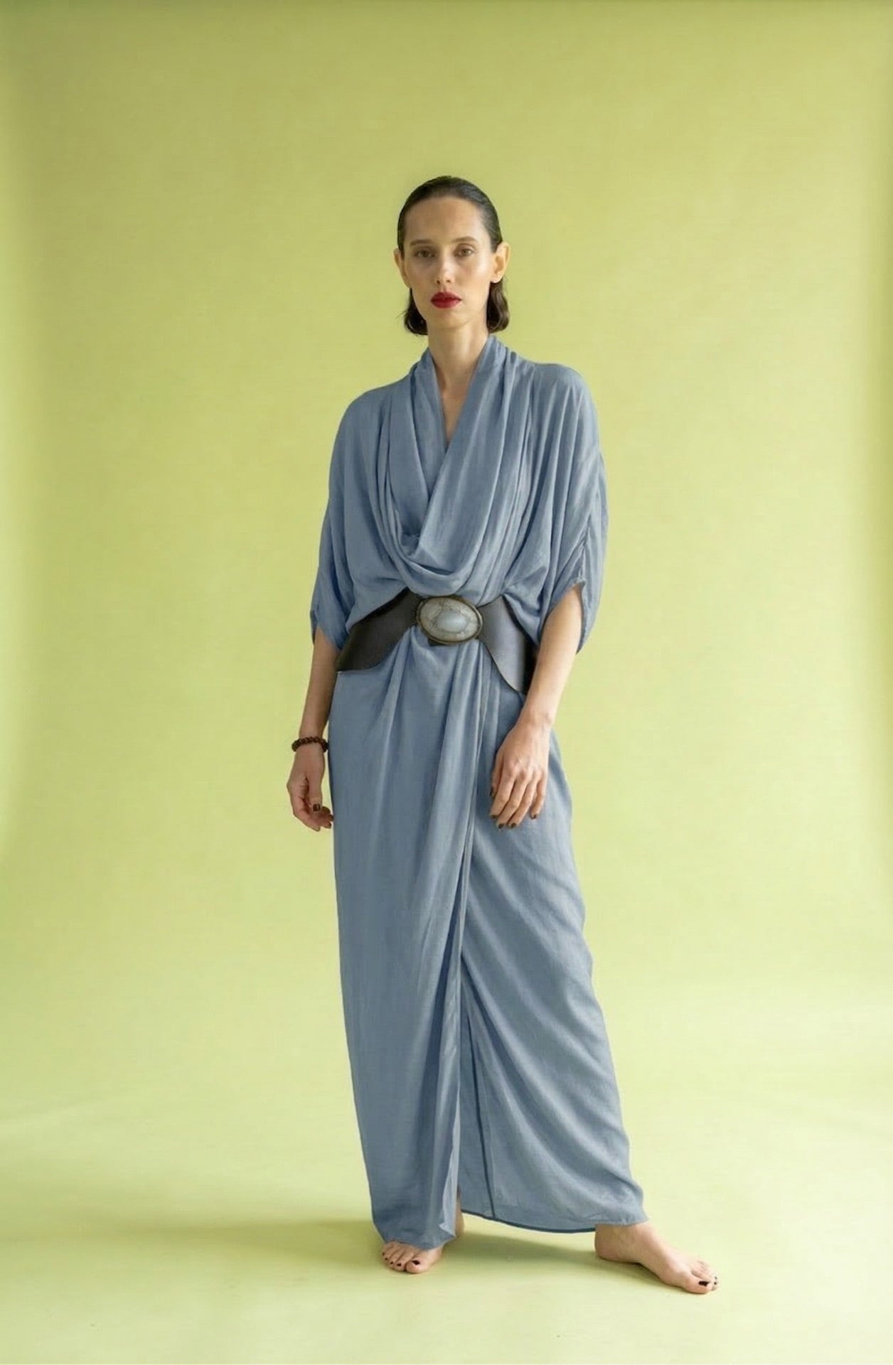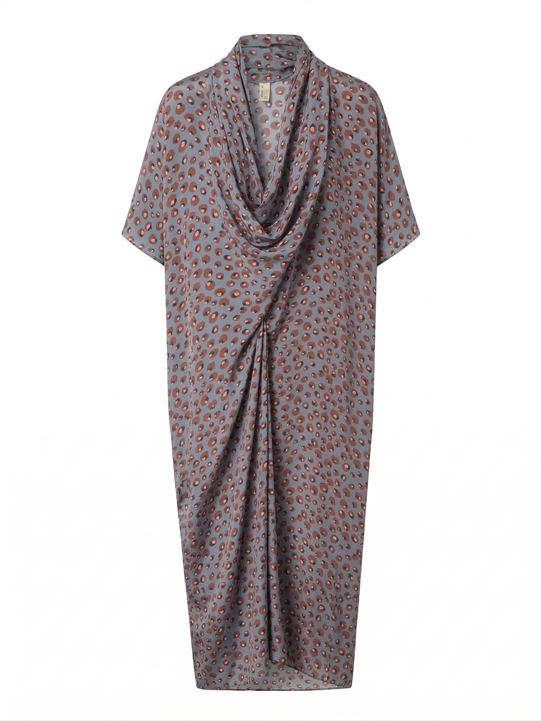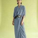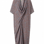 Este modelo de viscosa basa su diseño en un sofisticado sistema de pliegues en el cuello que estructuran el escote y la caída del pecho, aportando riqueza visual y volumen que se ajusta a la cintura, creando una silueta femenina y cómoda.