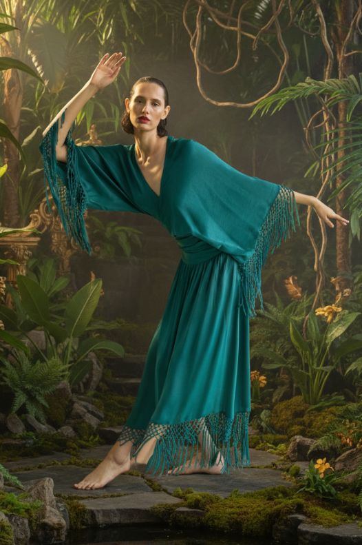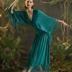 Pieza de diseño de carácter singular confeccionada en crep satén. Este top destaca por sus extremos inferiores prolongados, diseñados para cruzarse y anudarse en una lazada que ciñe la silueta. El remate de flecos sus mangas aporta un movimiento rítmico y sofisticado, que contrasta con el brillo sutil del tejido. Una propuesta elegante que equilibra a la perfección movimiento y delicadeza.
